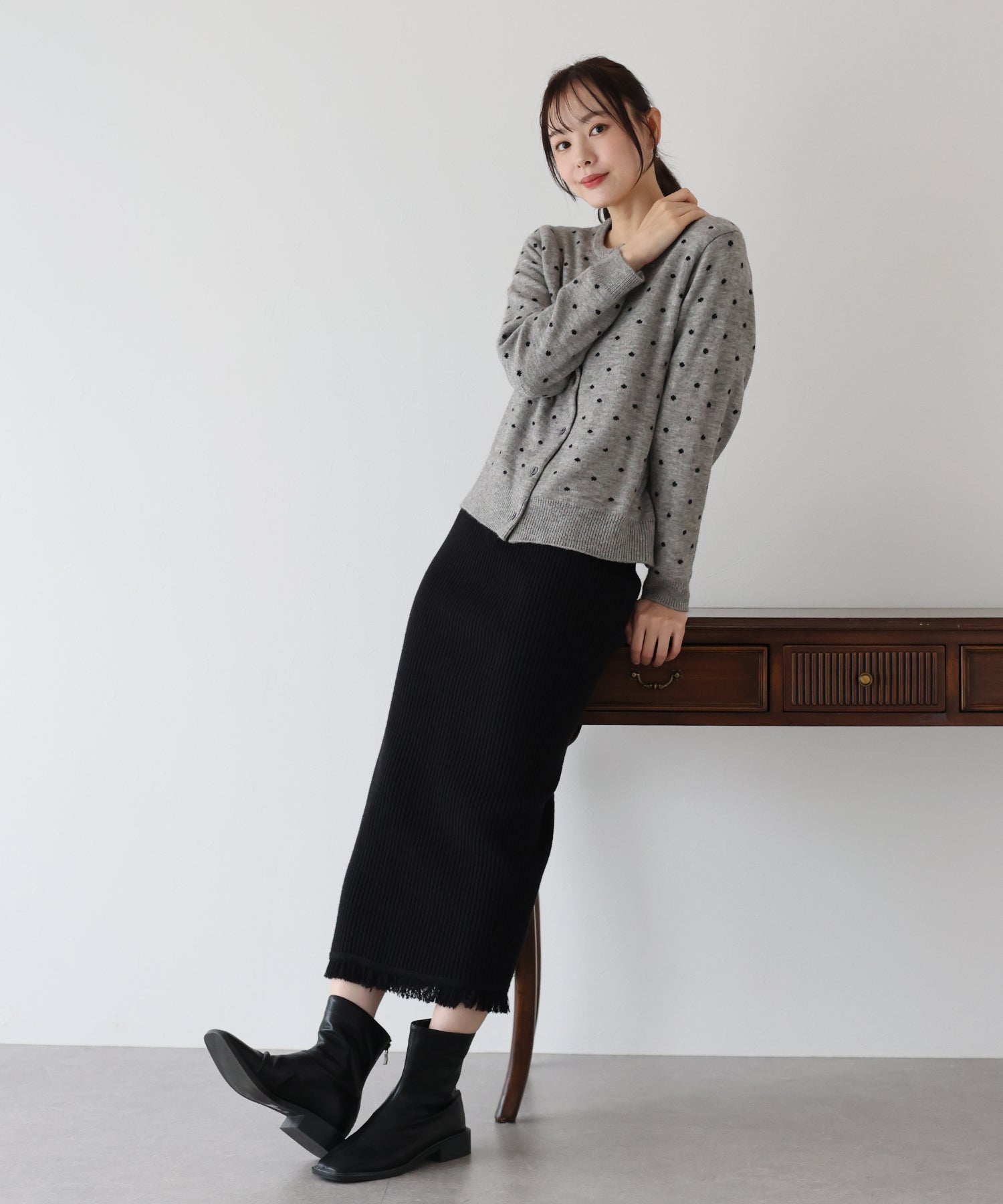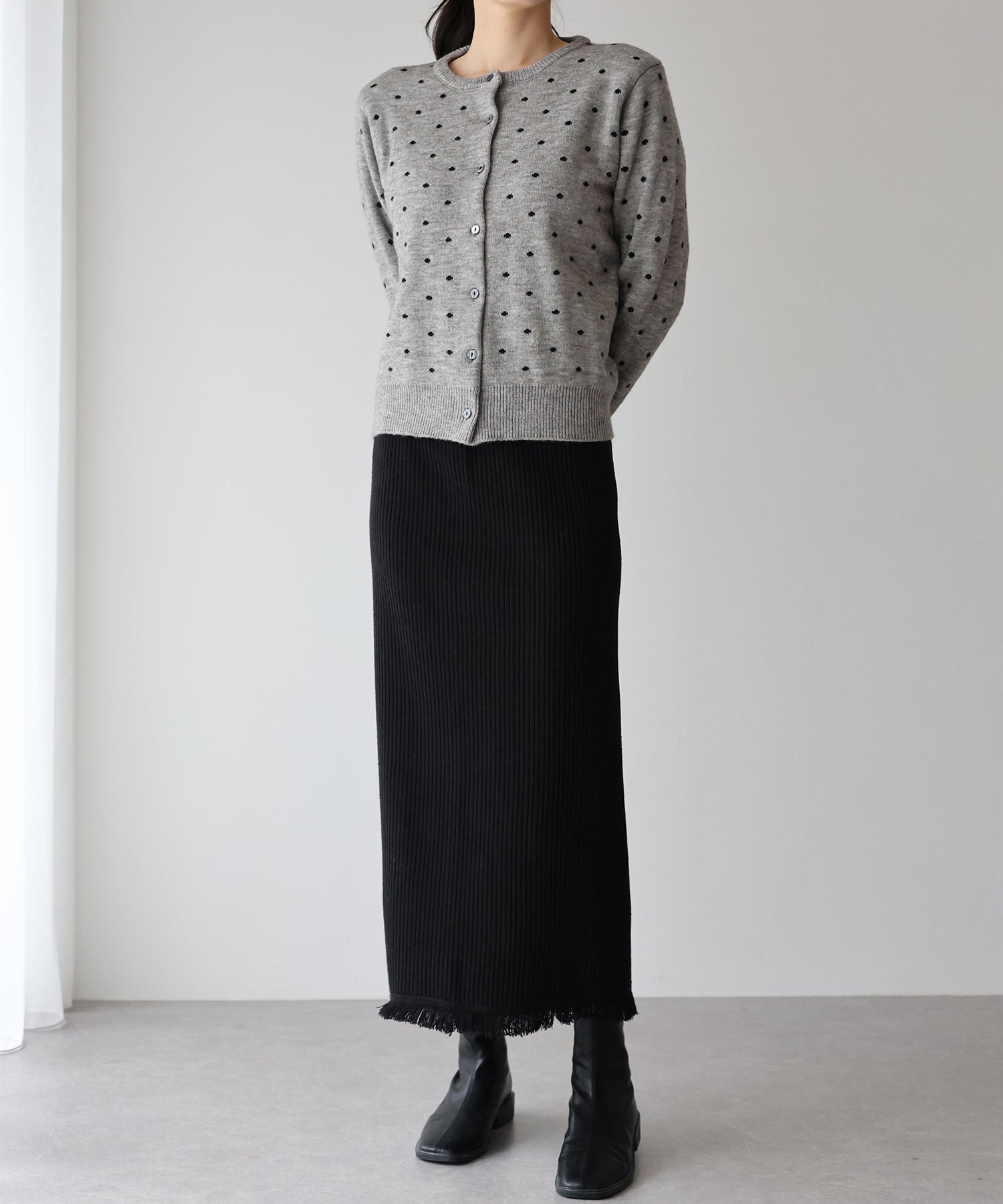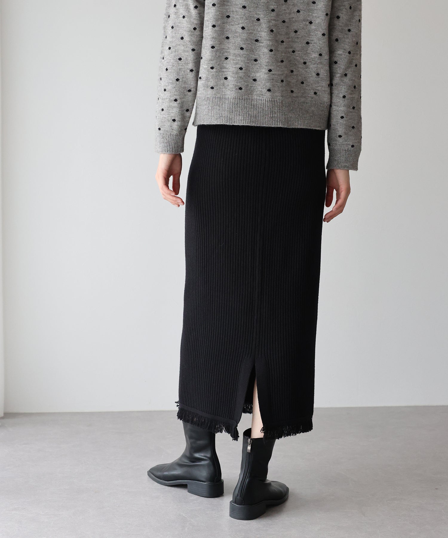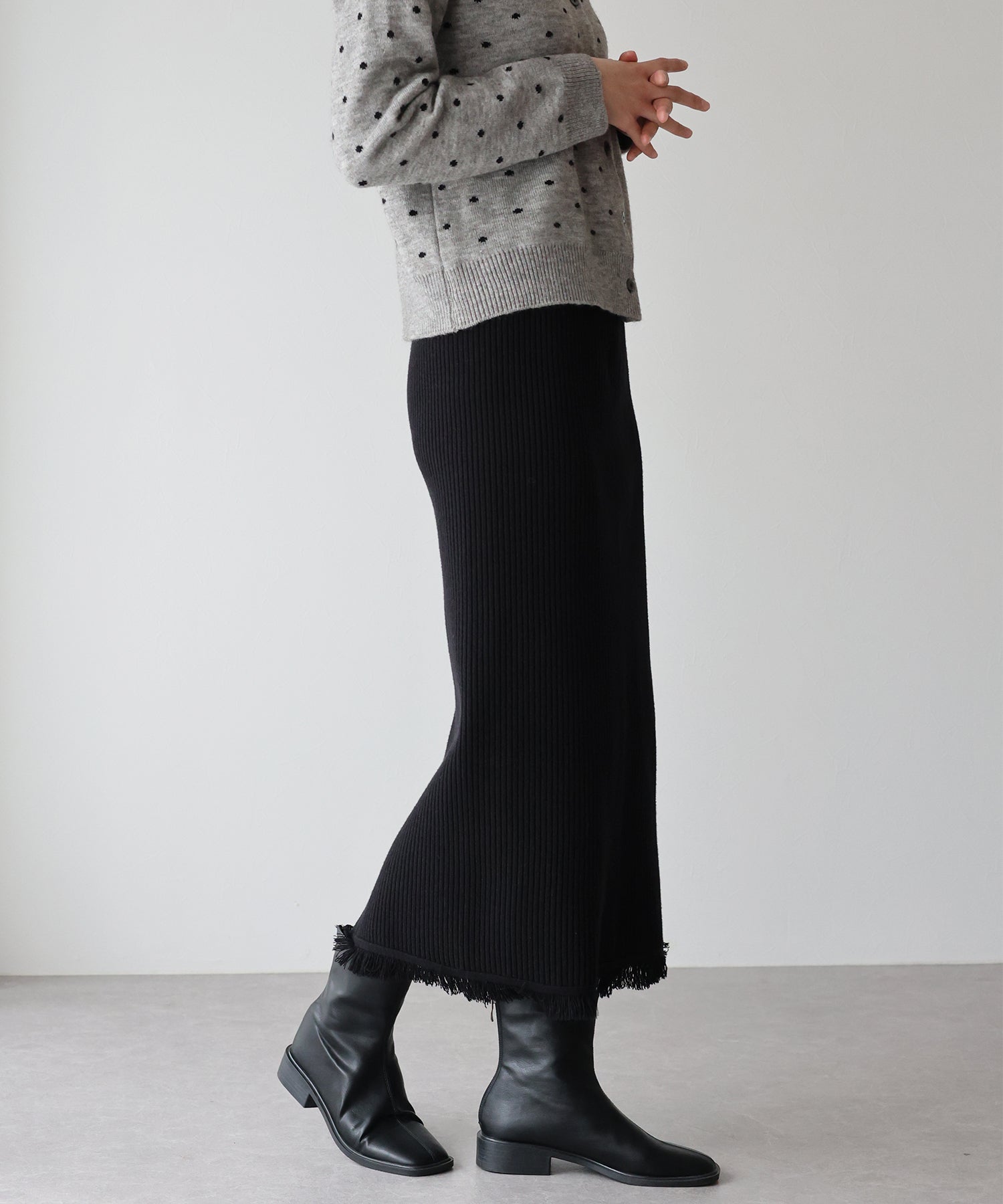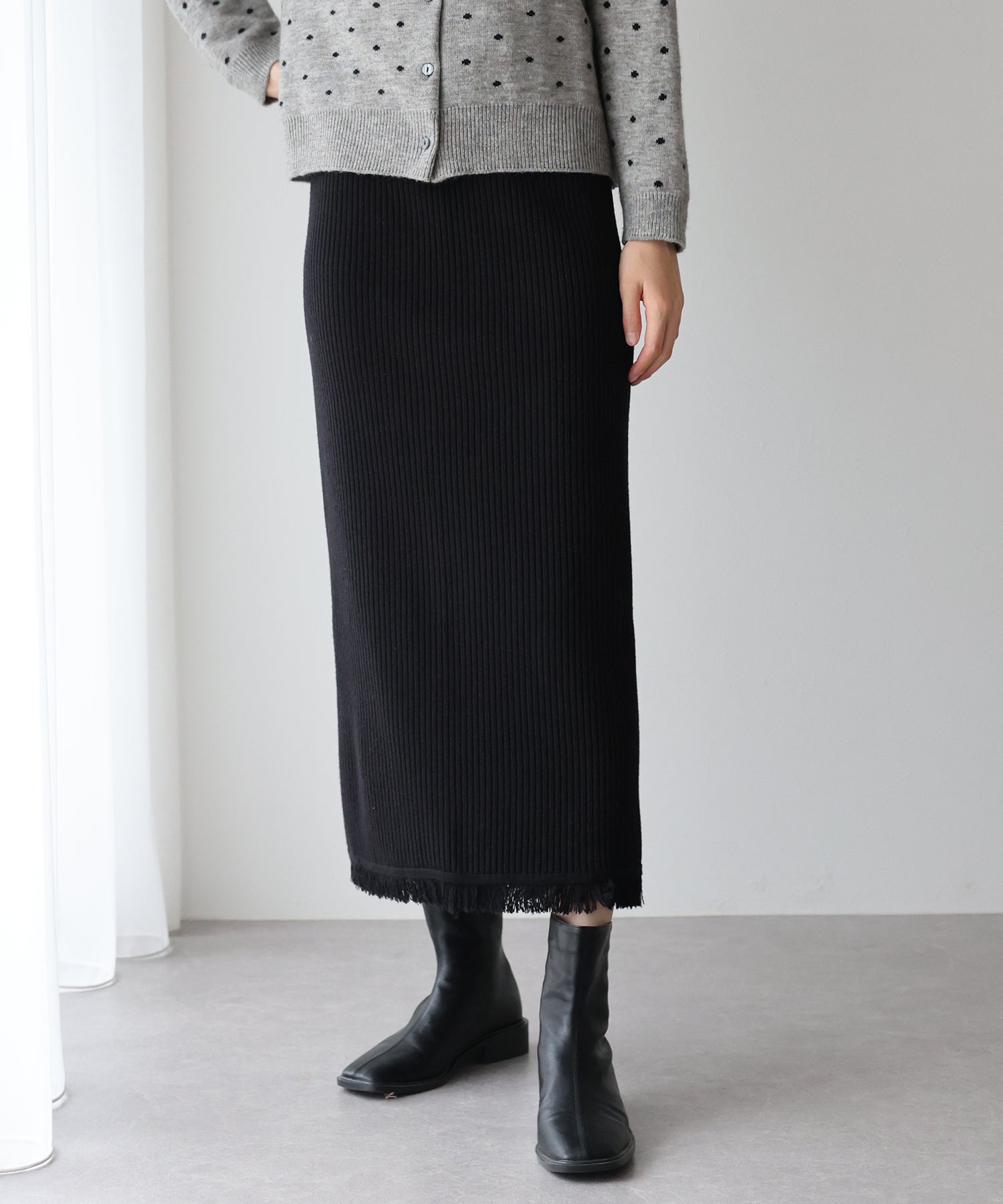 着回し力の高い、ワードローブに1枚あると重宝するきれいめニットスカート。