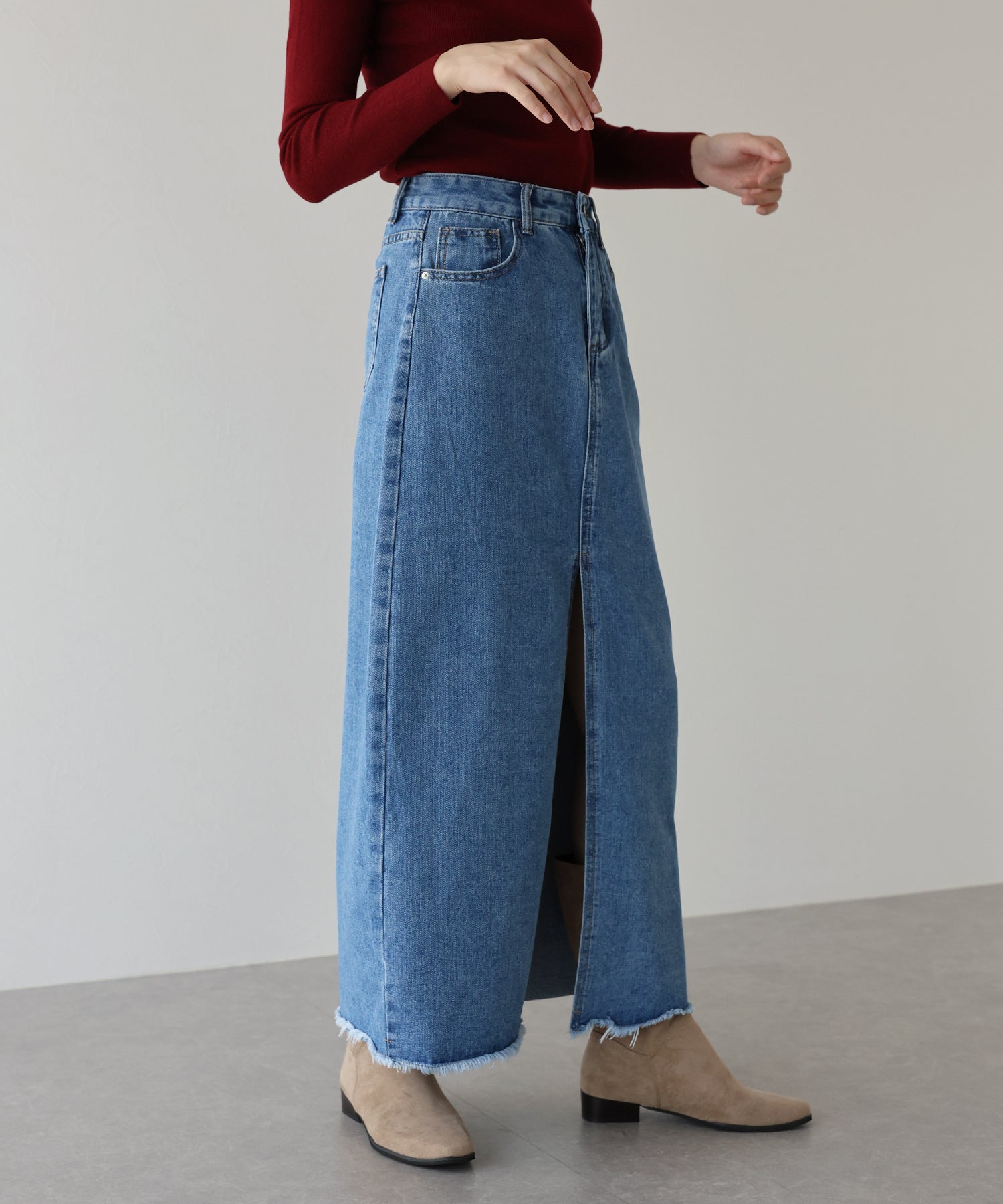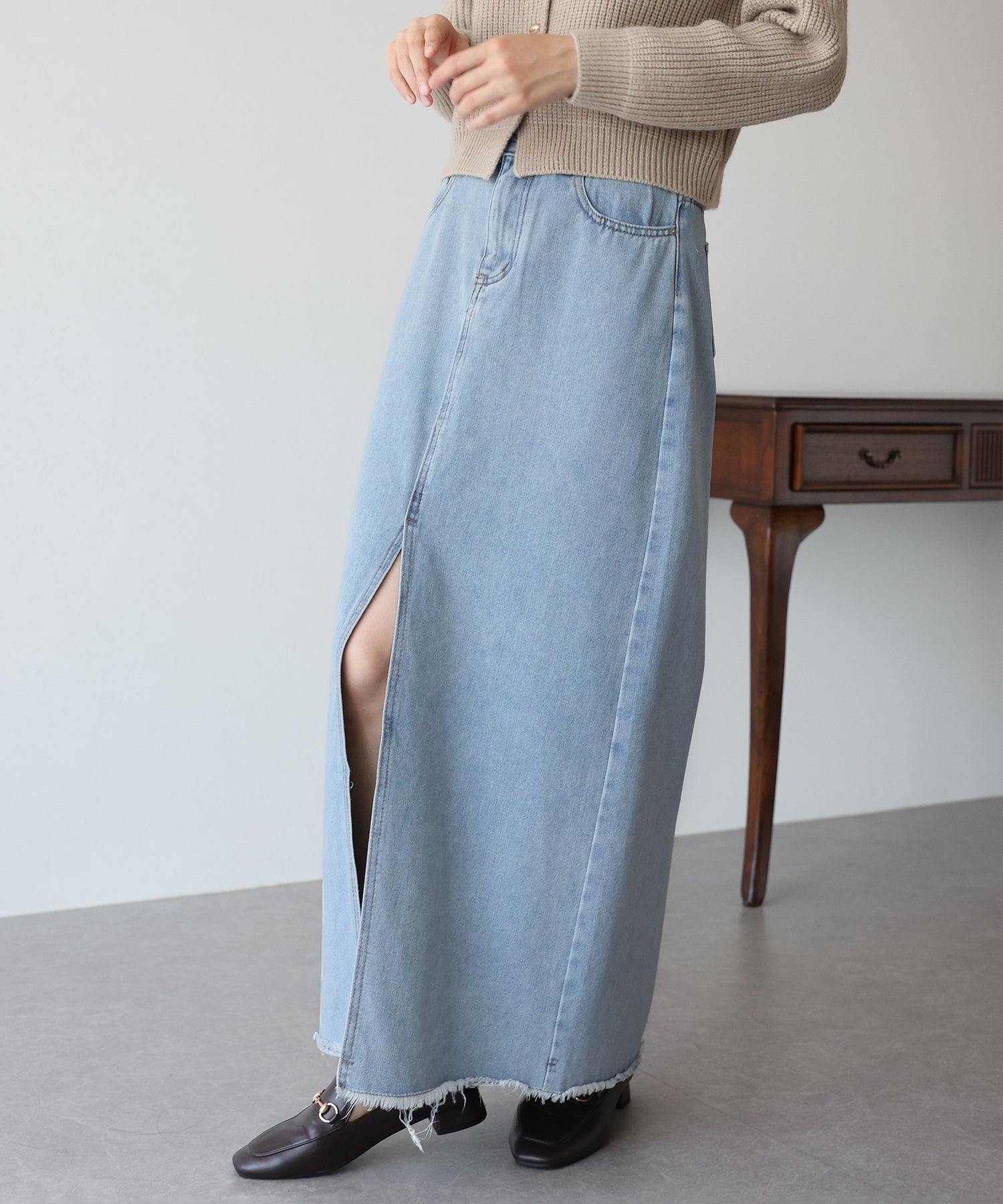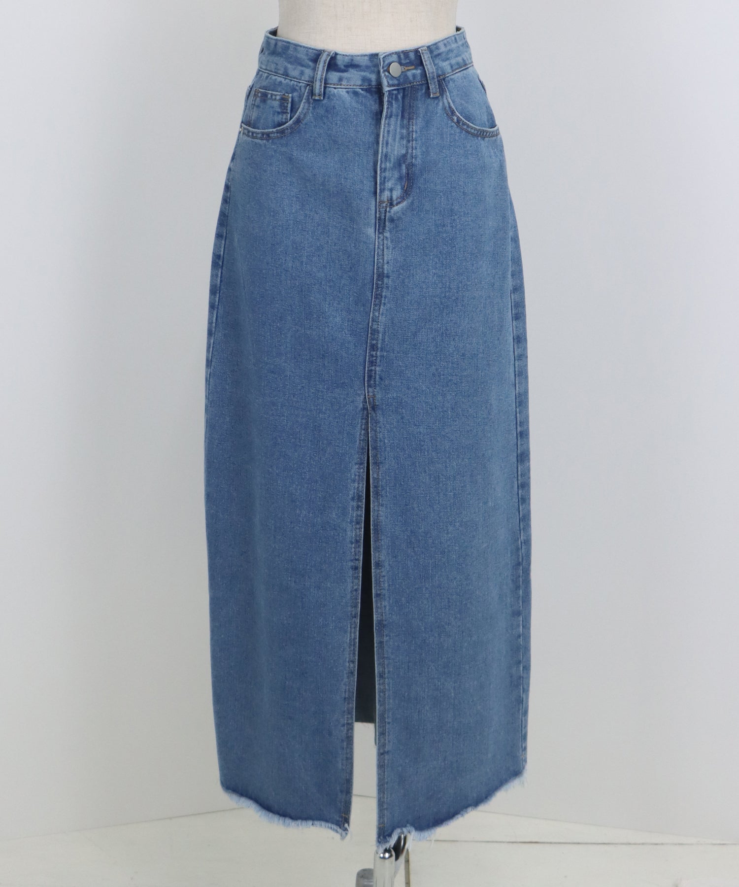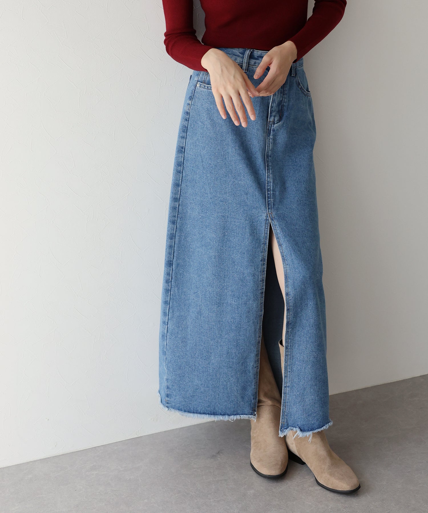 フロントスリットの入った、トレンド感を取り入れていただけるデニムスカート。