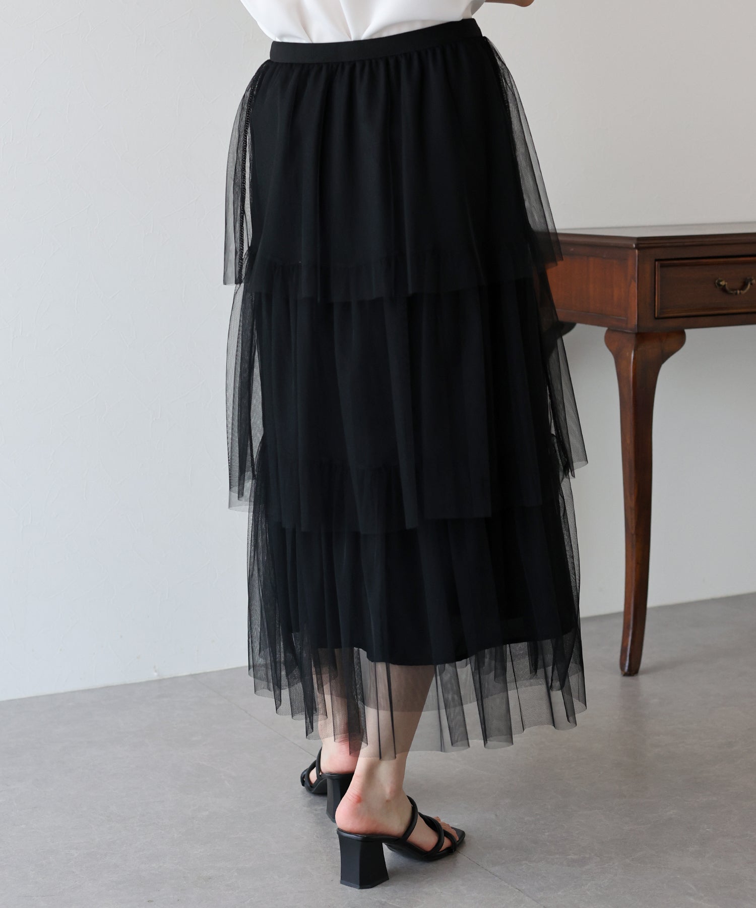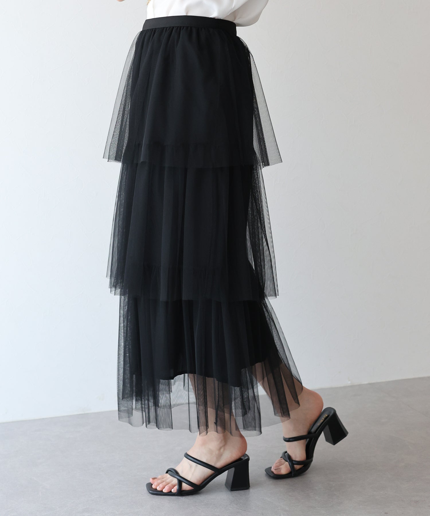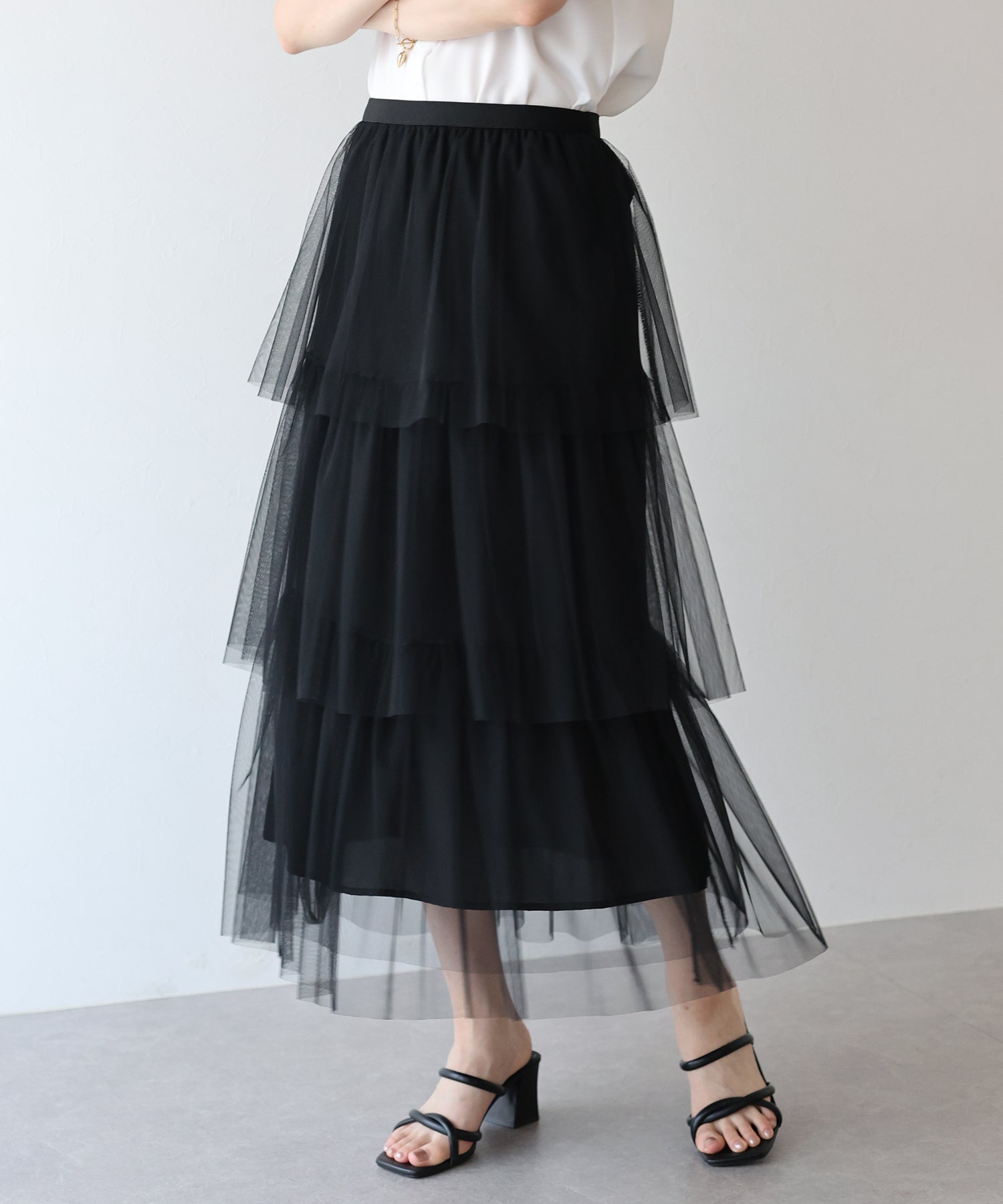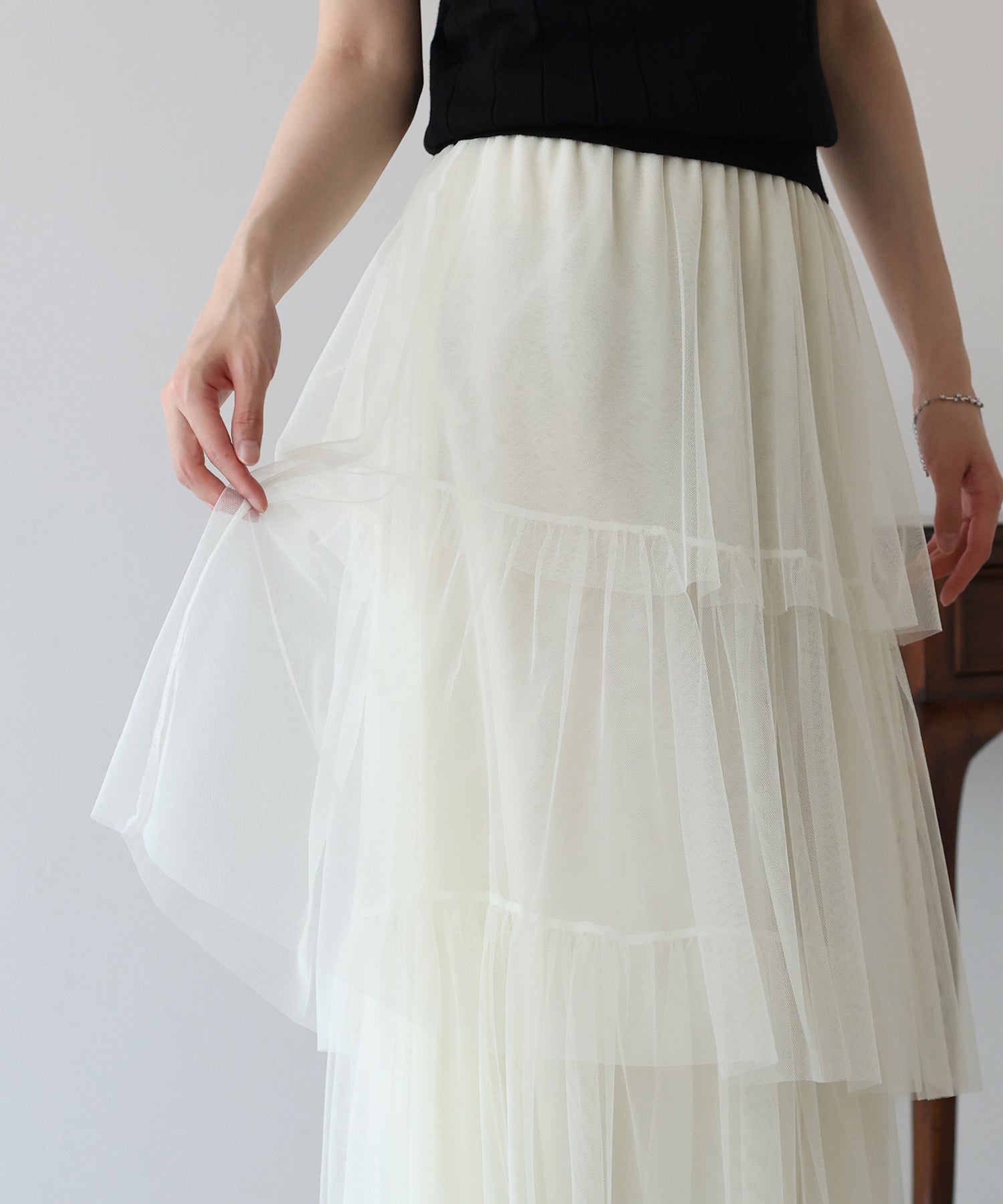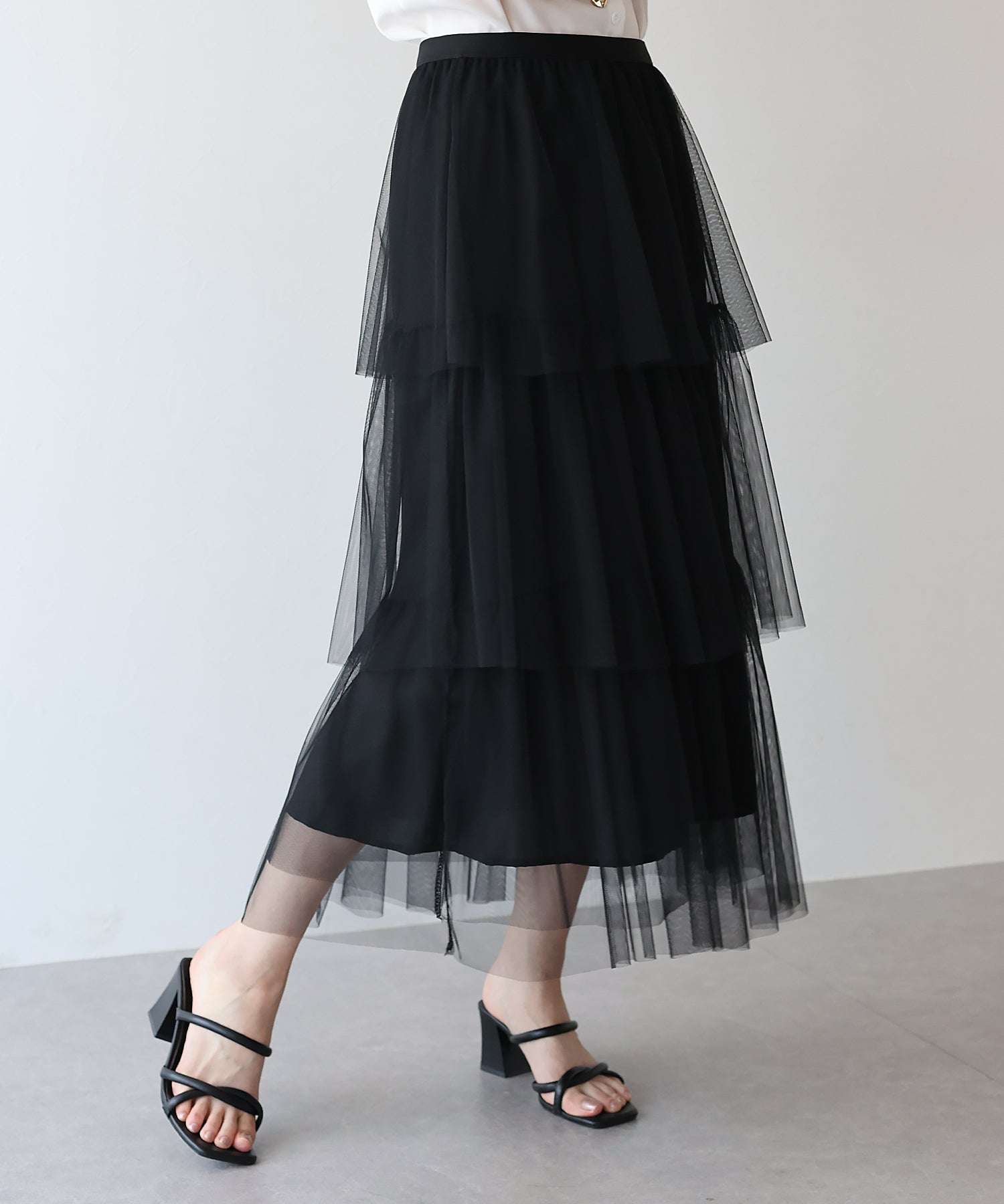 ふわっと透け感のあるチュール素材のロングスカート