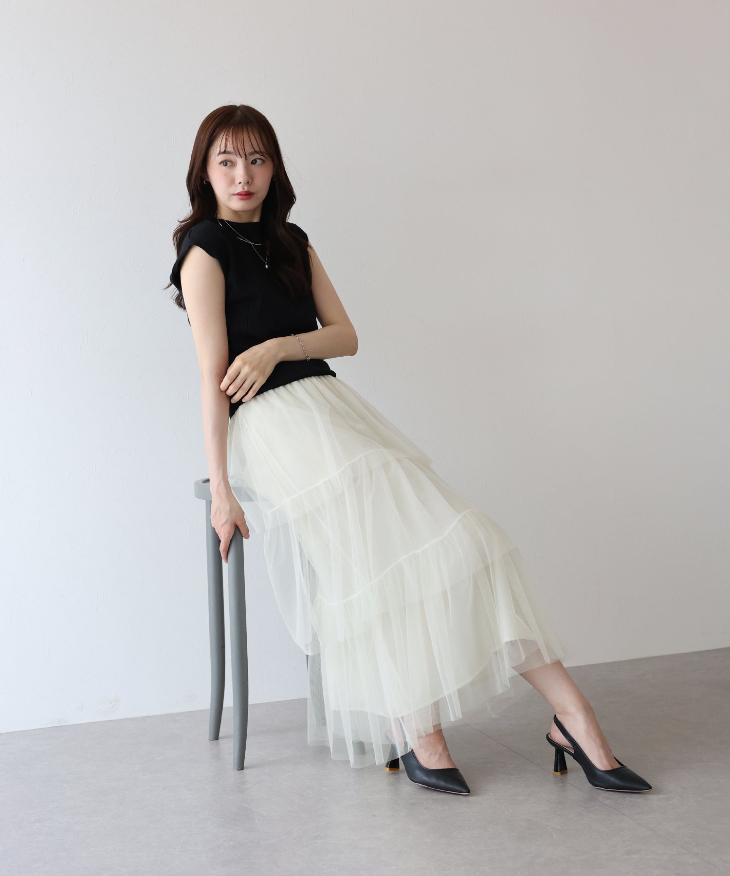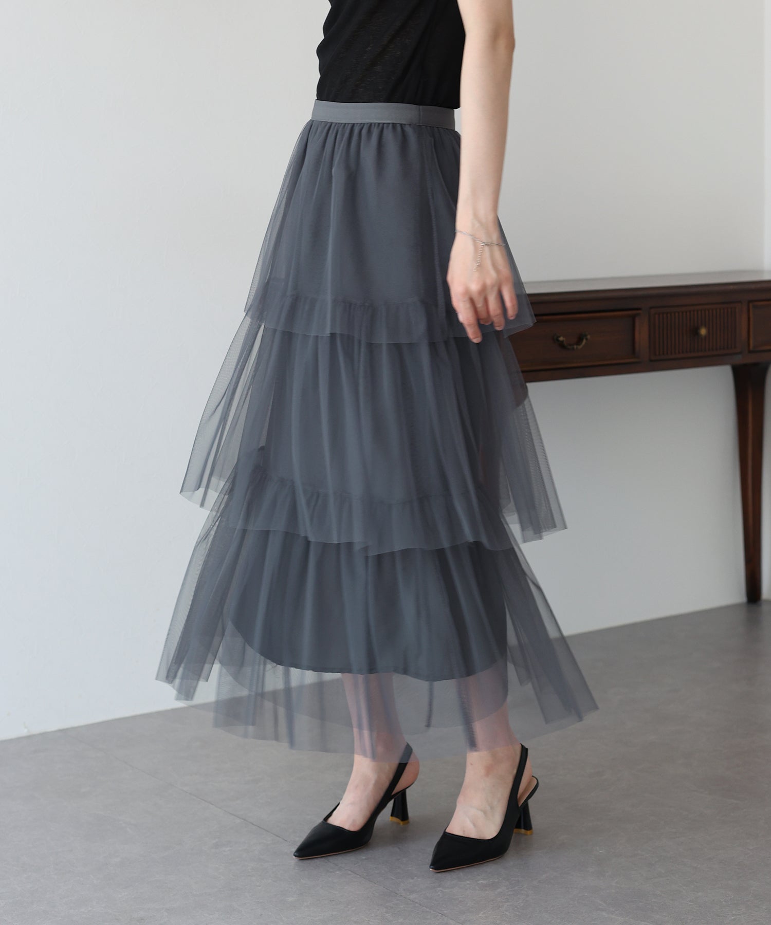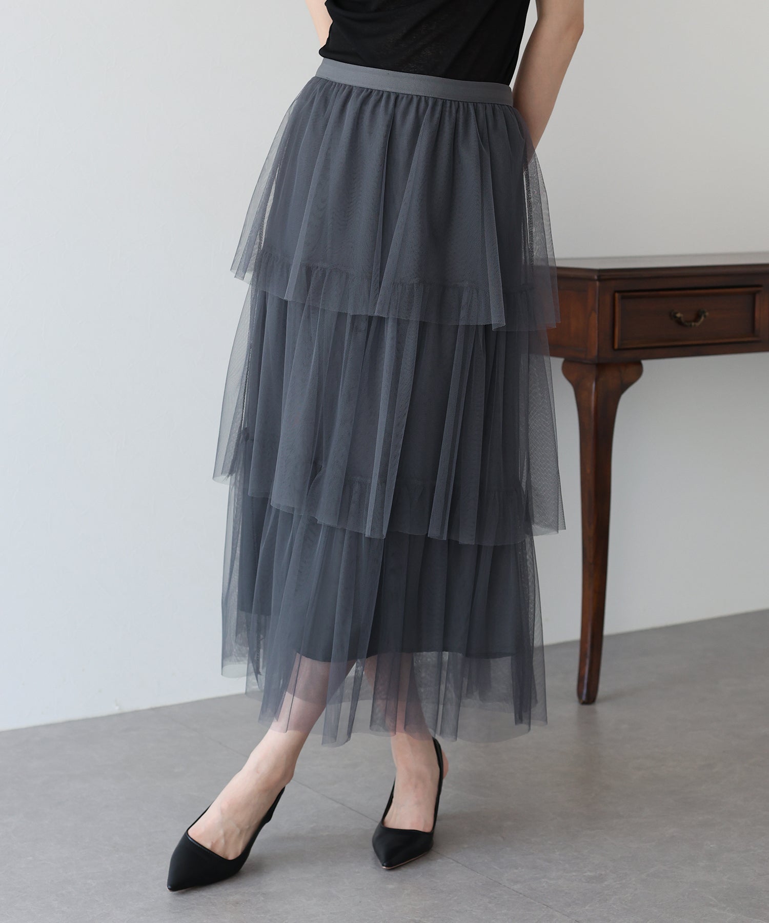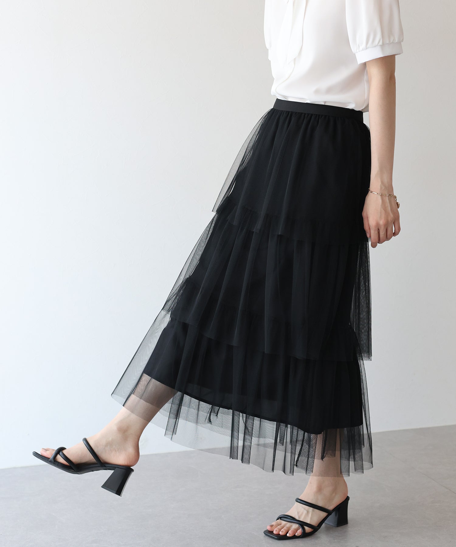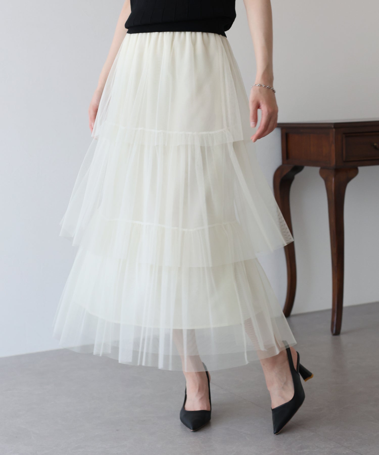 ふわっと透け感のあるチュール素材のロングスカート