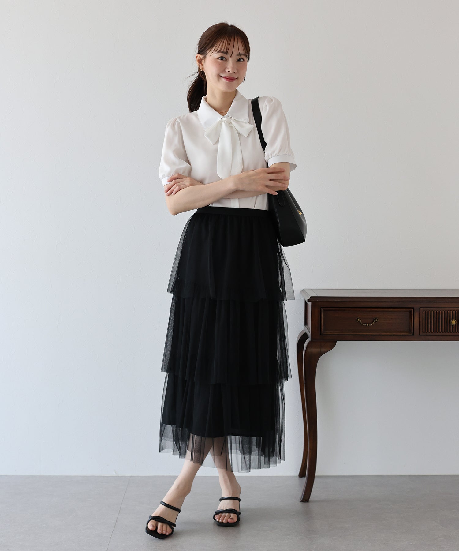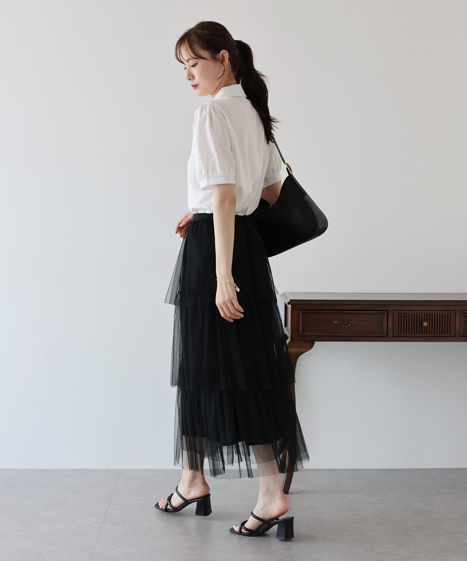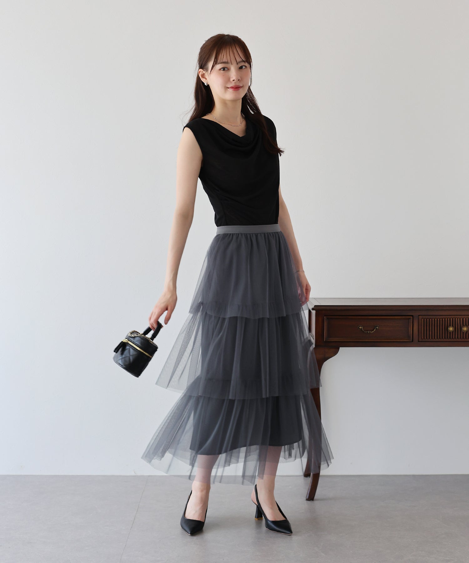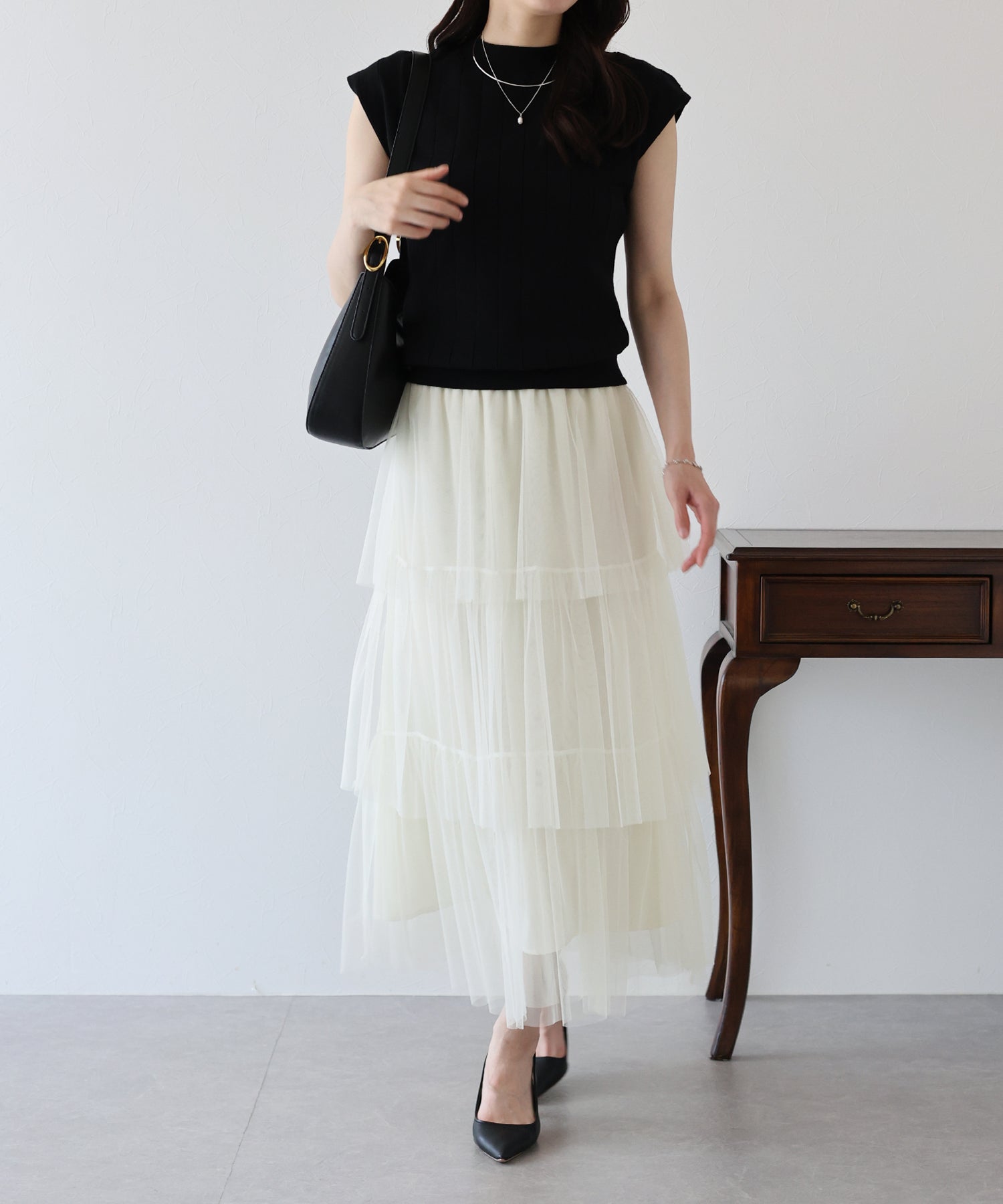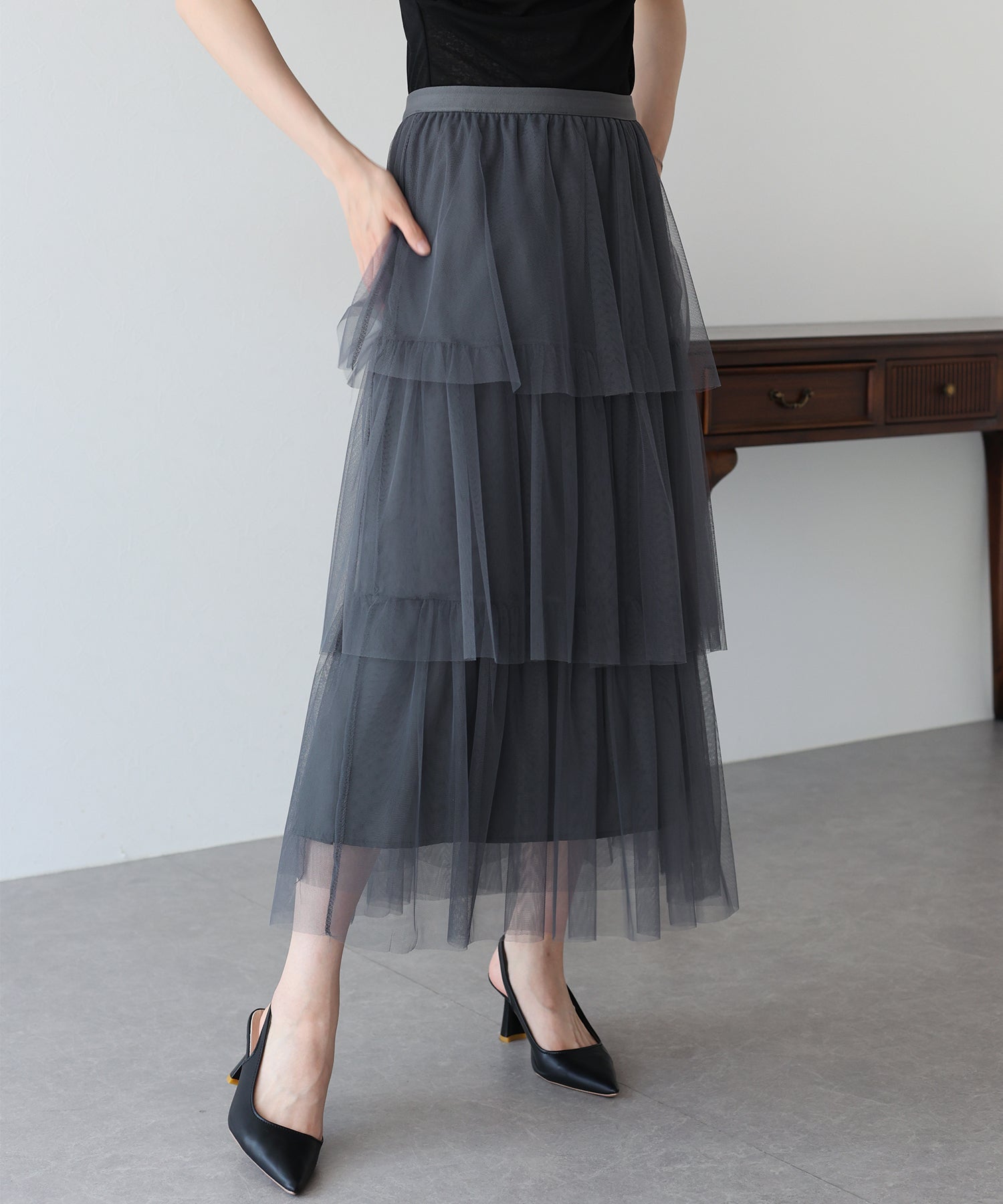 ふわっと透け感のあるチュール素材のロングスカート