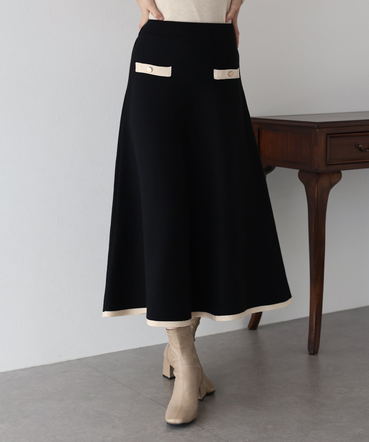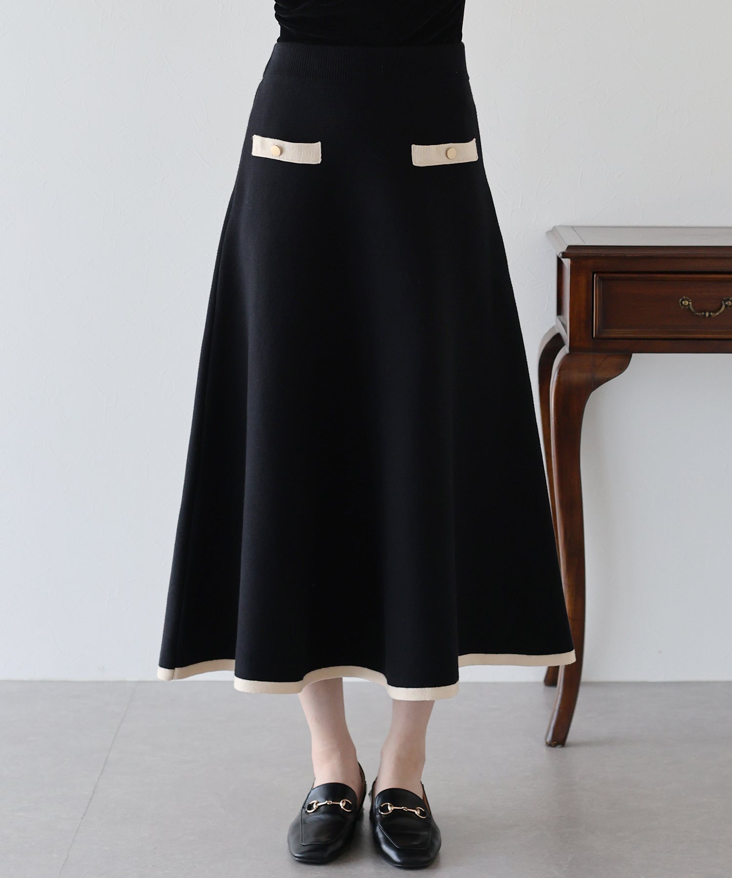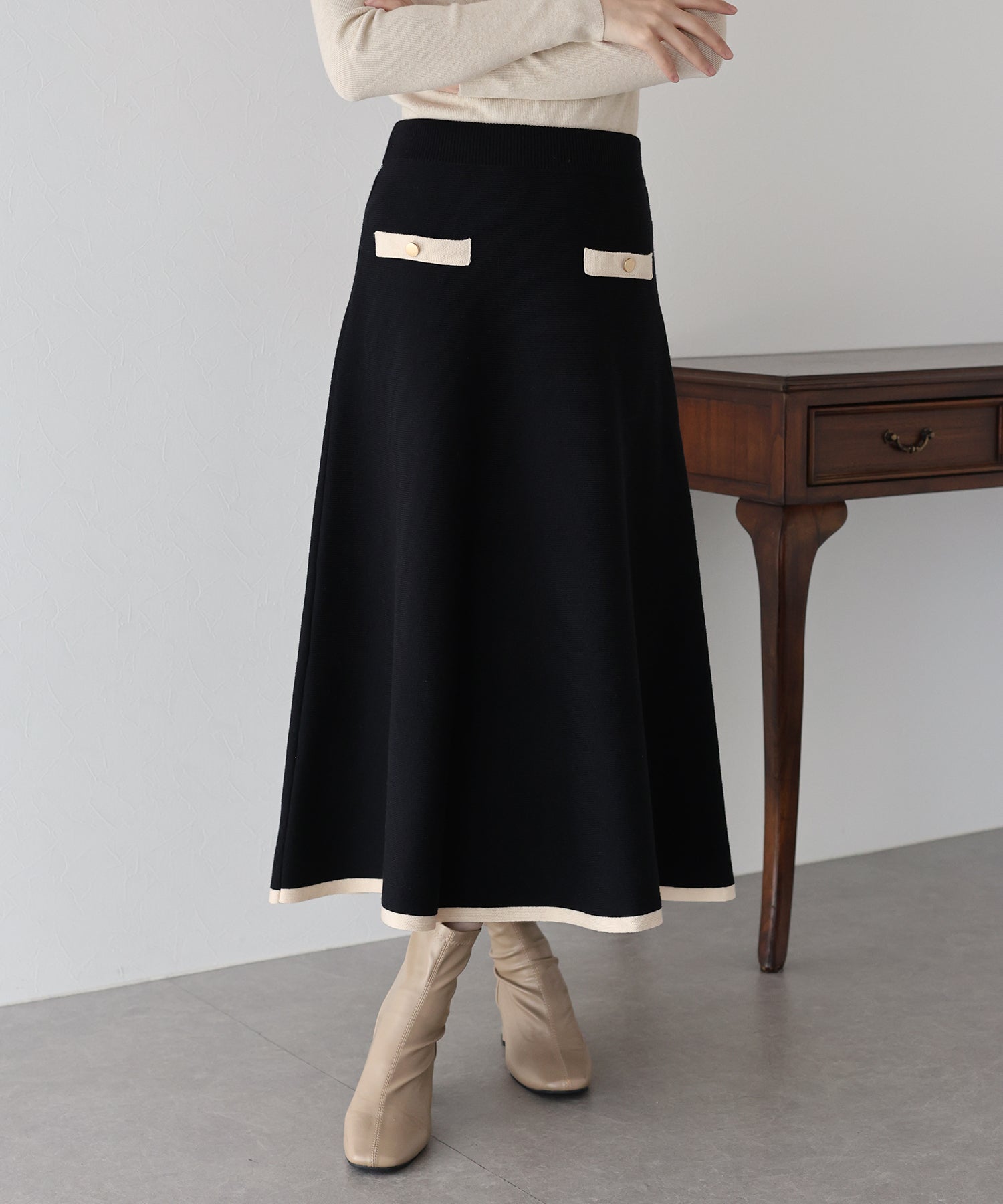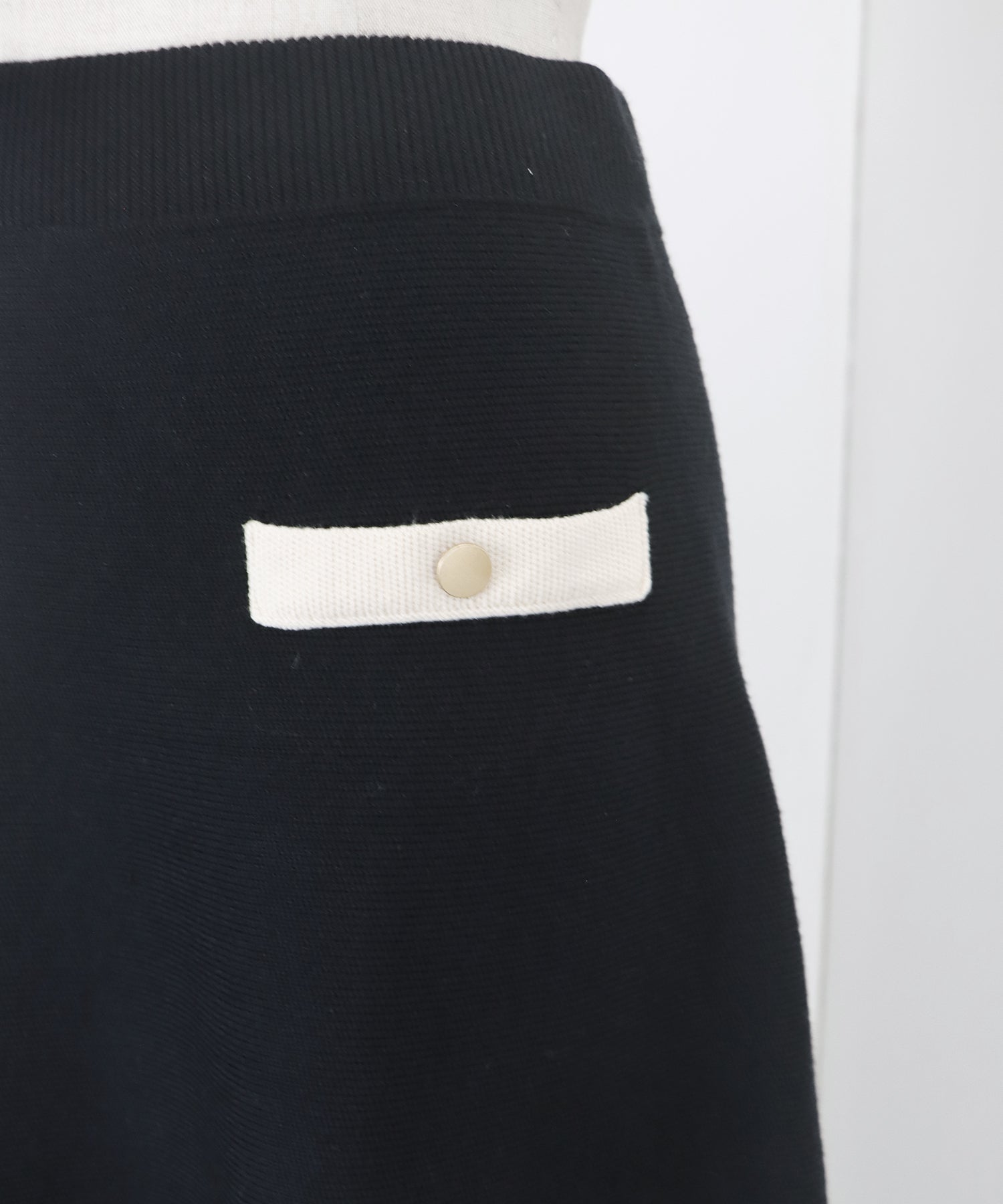 配色に金ボタンがアクセントになったニットスカート。