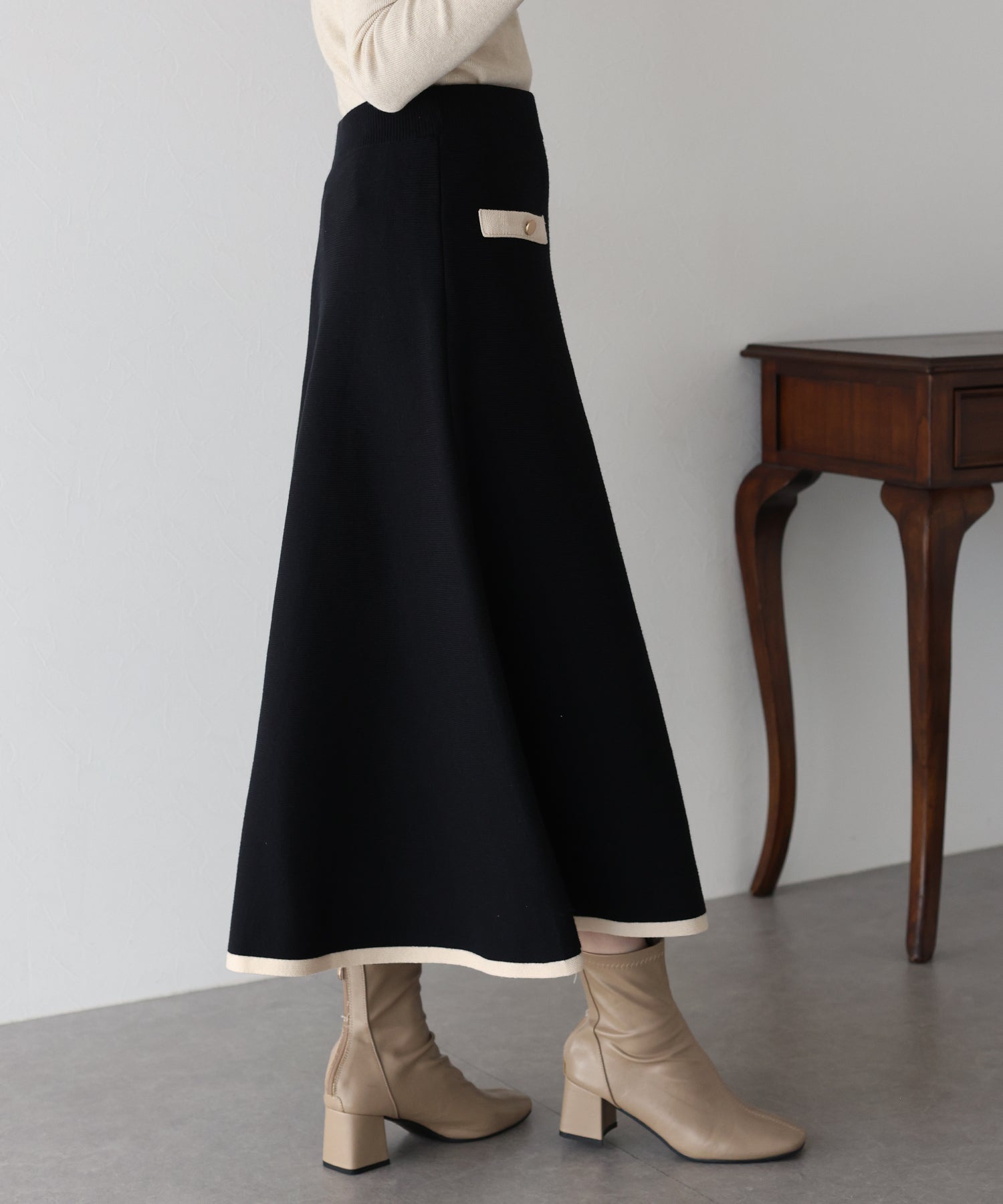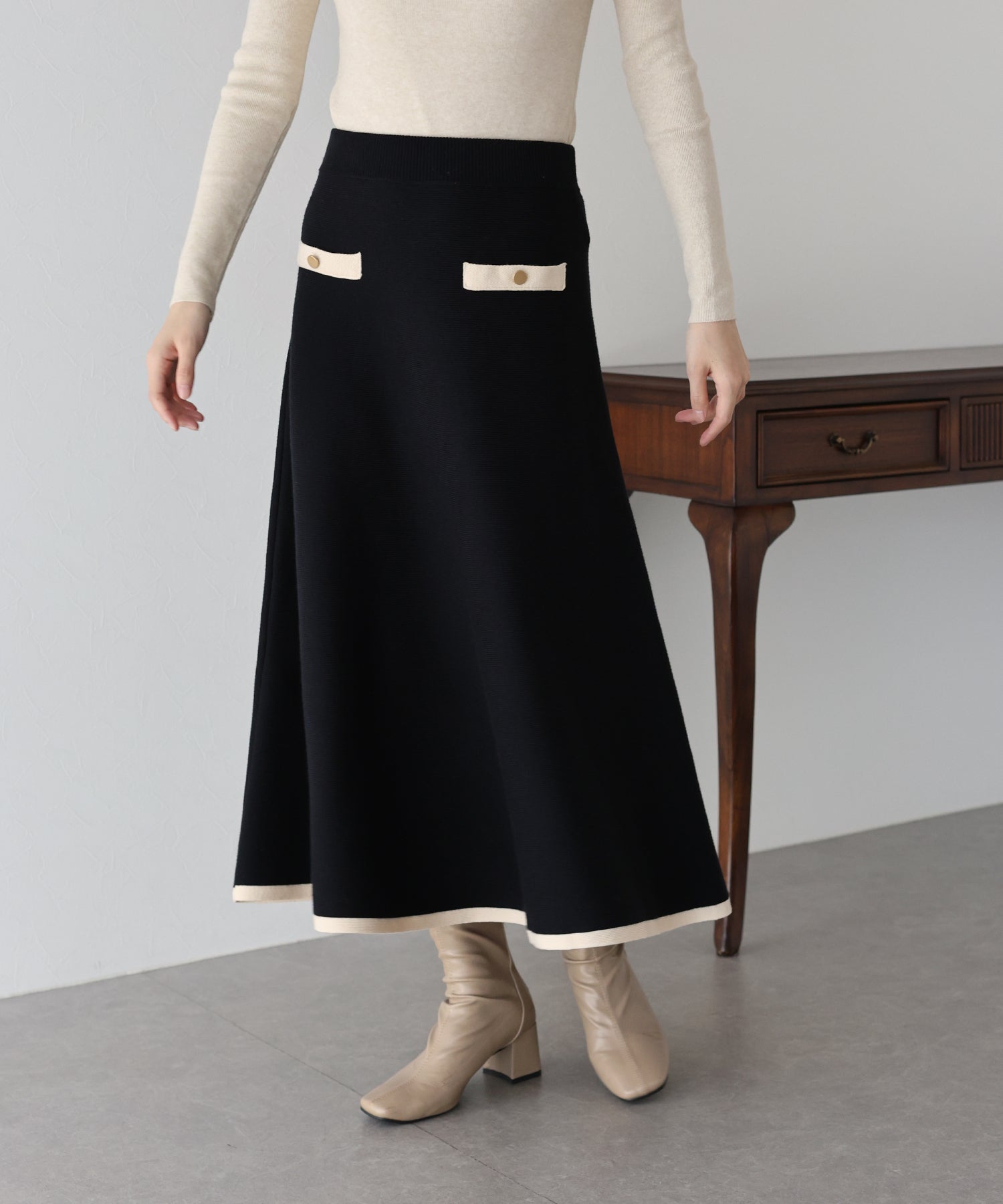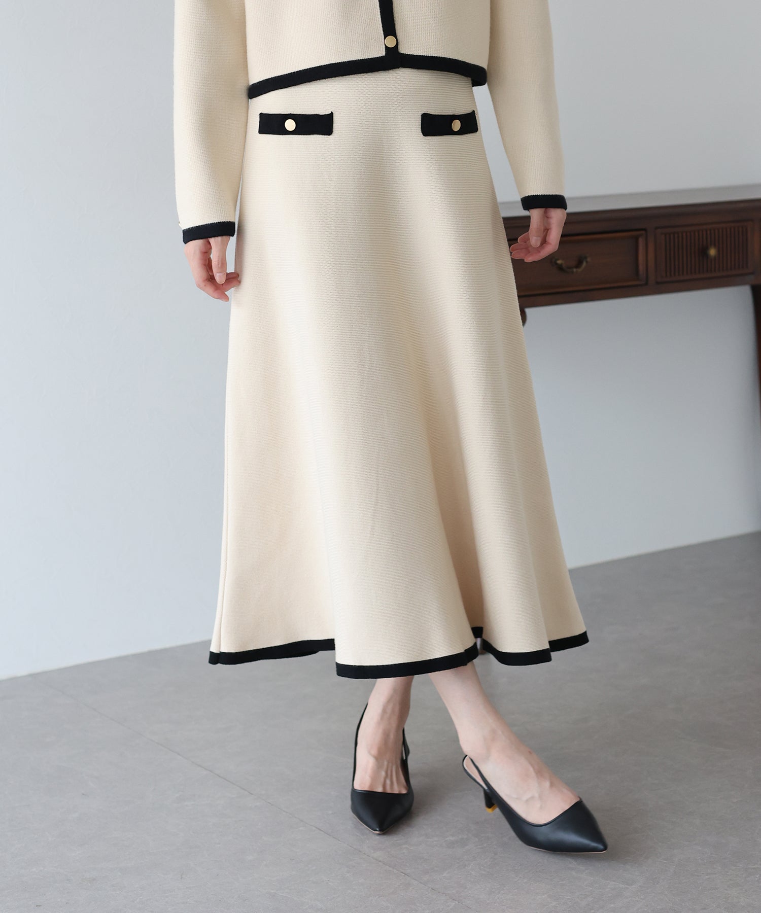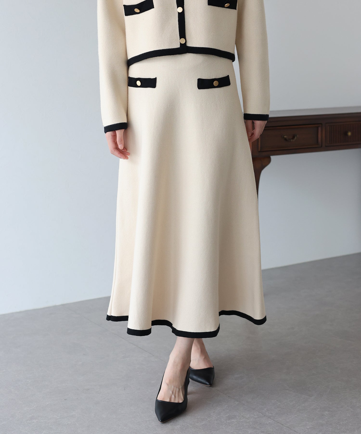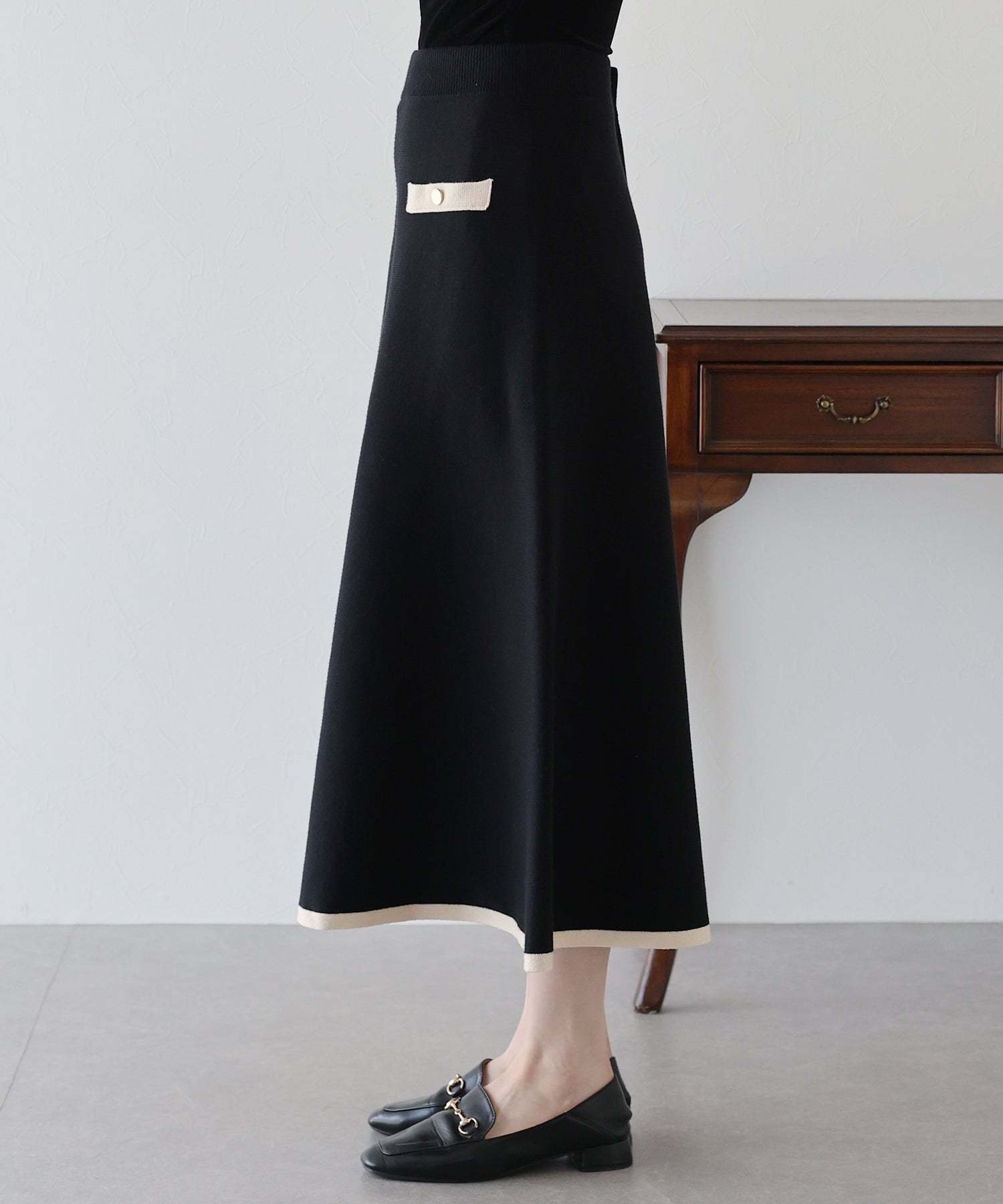 配色に金ボタンがアクセントになったニットスカート。