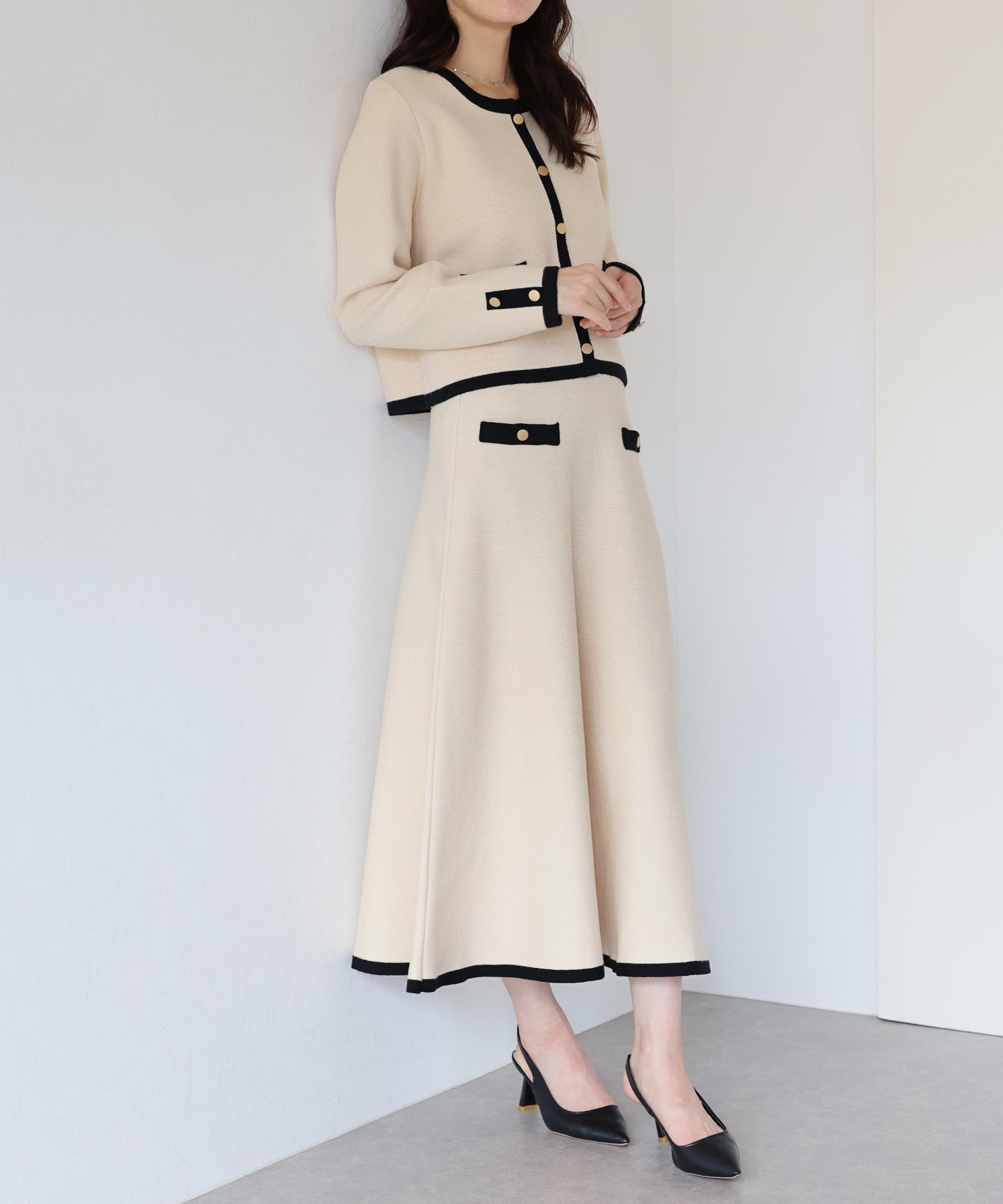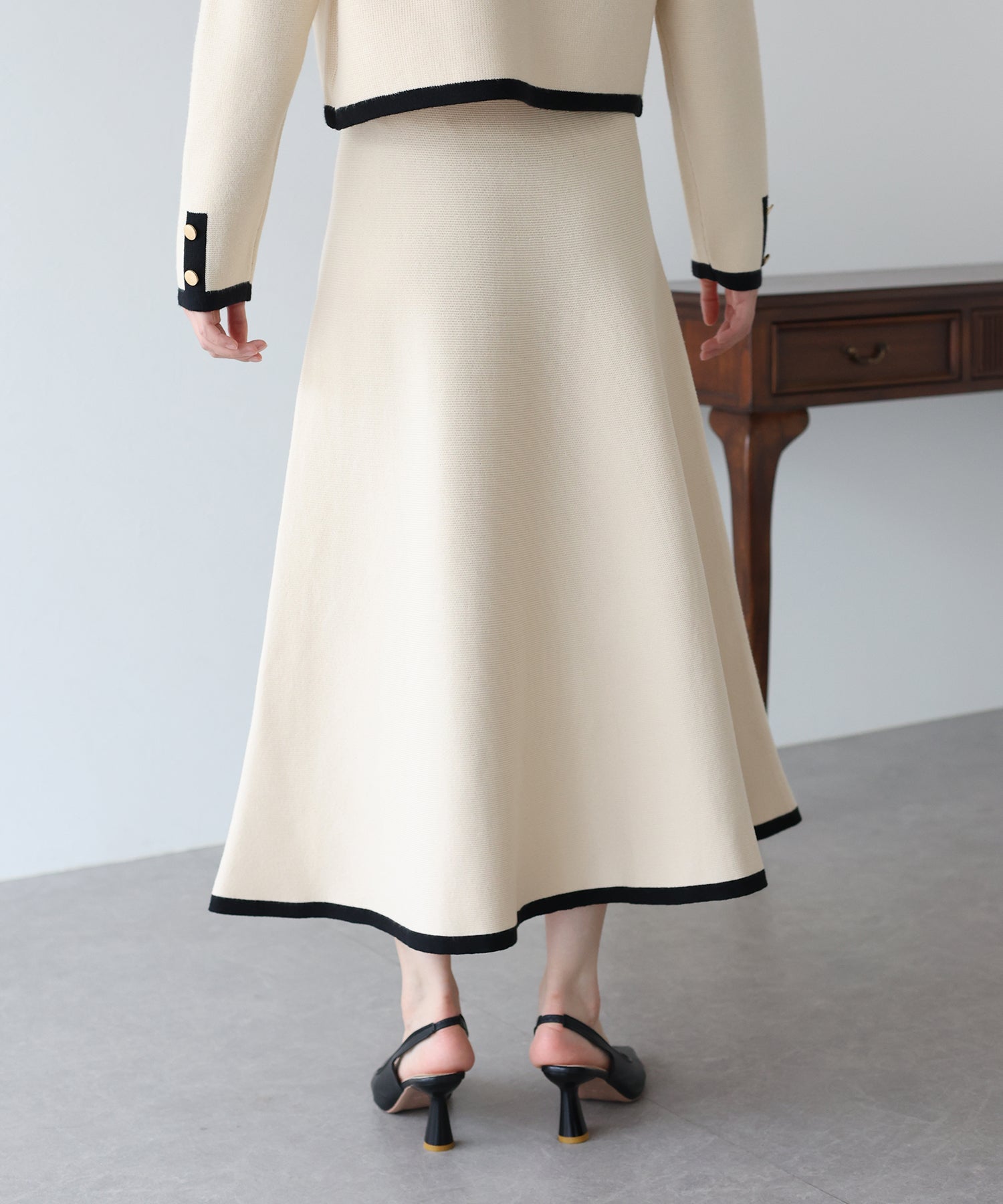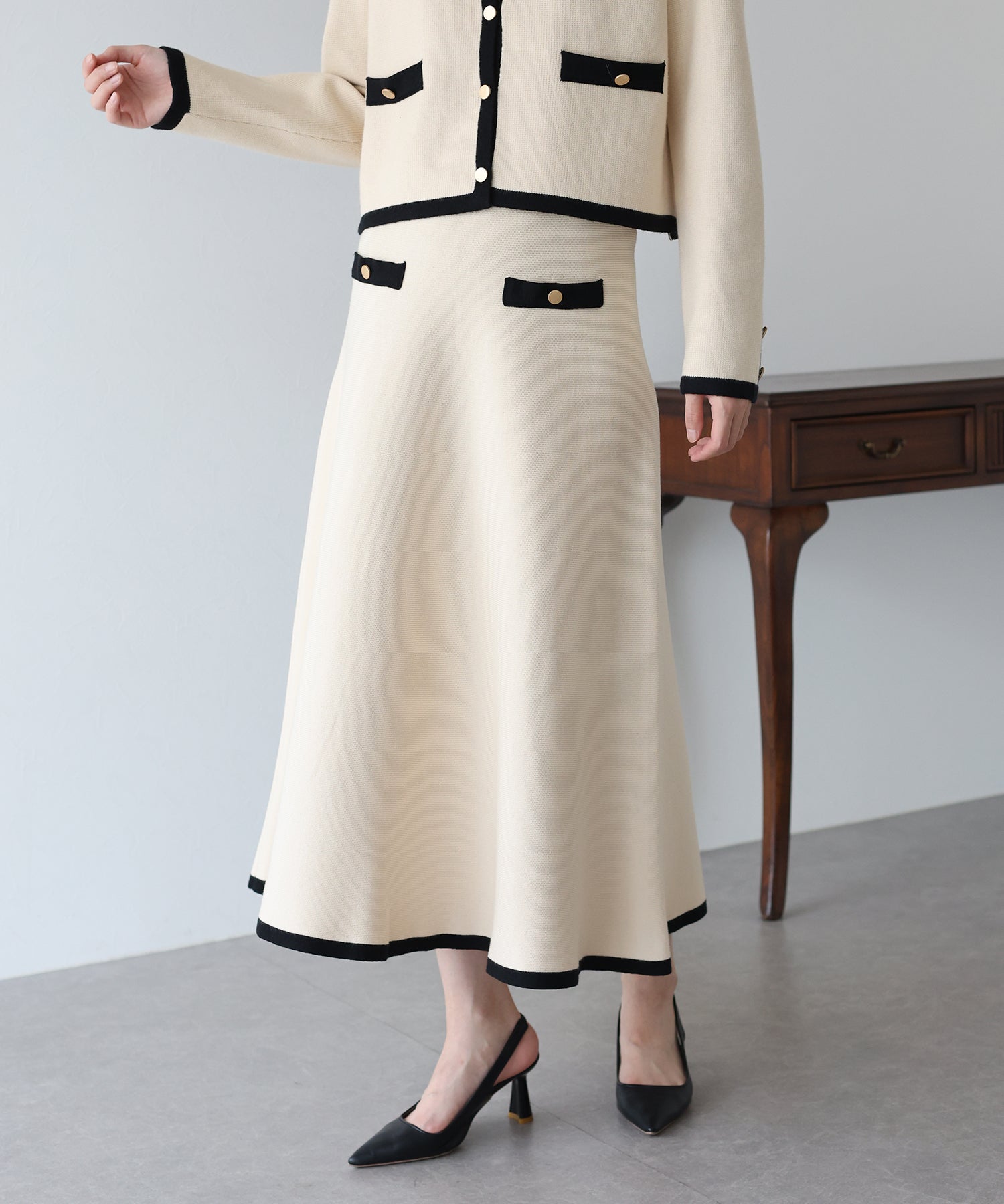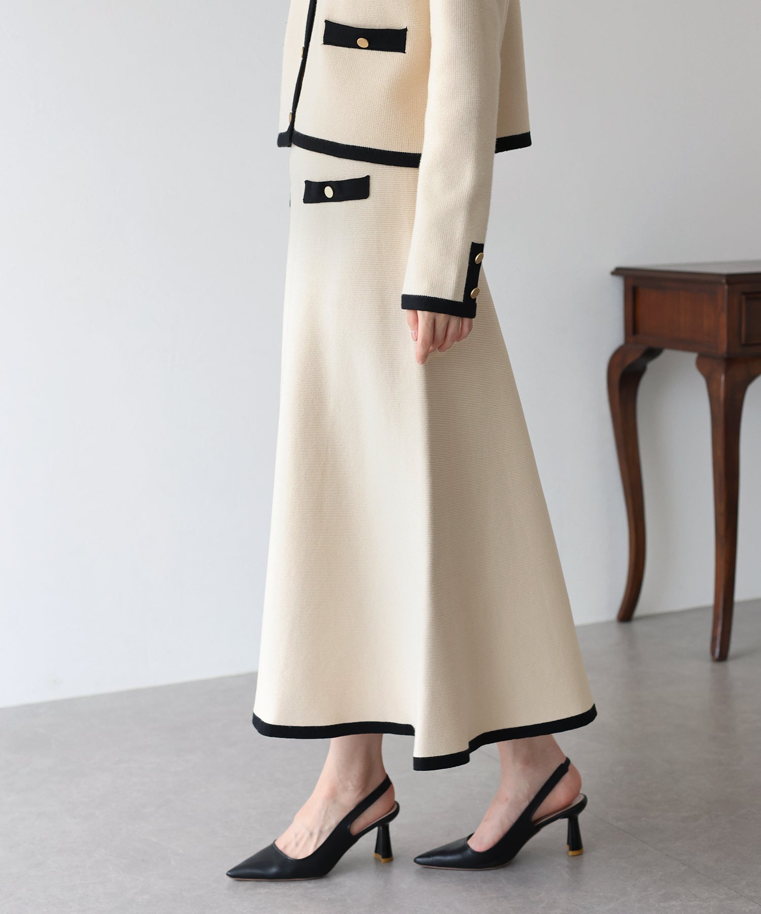 配色に金ボタンがアクセントになったニットスカート。
