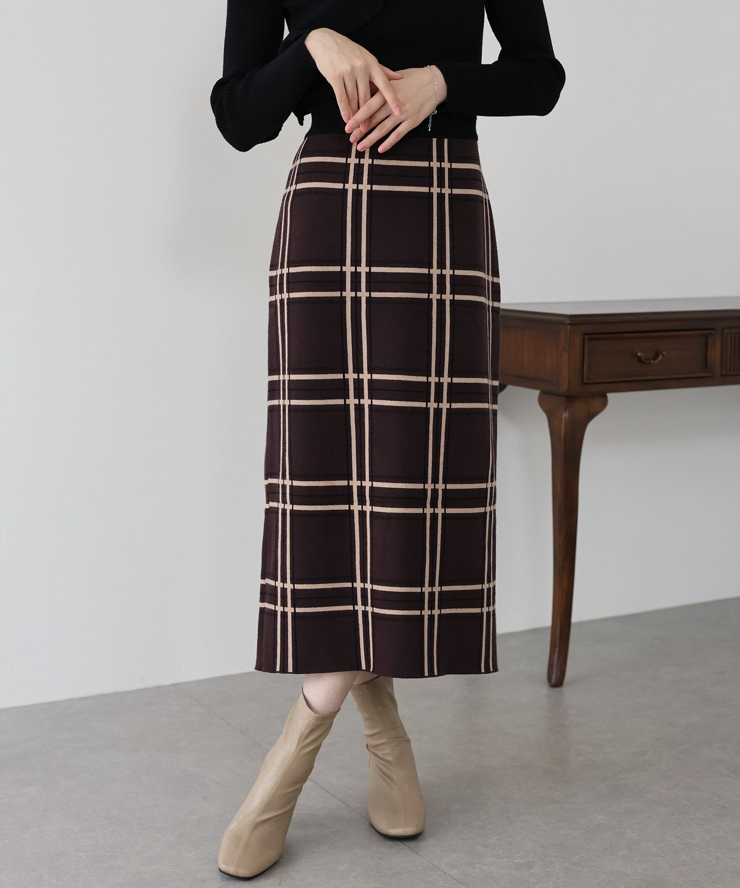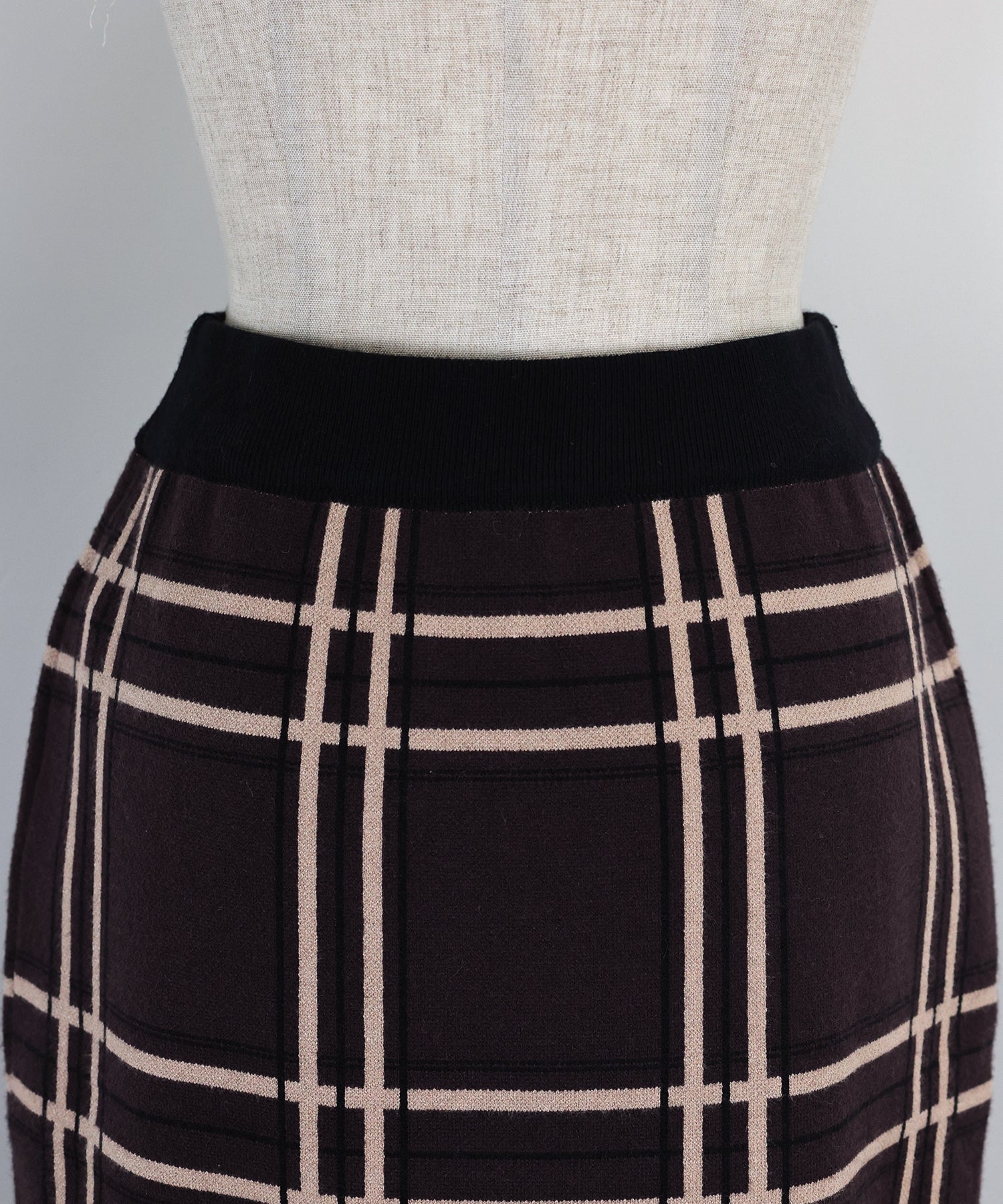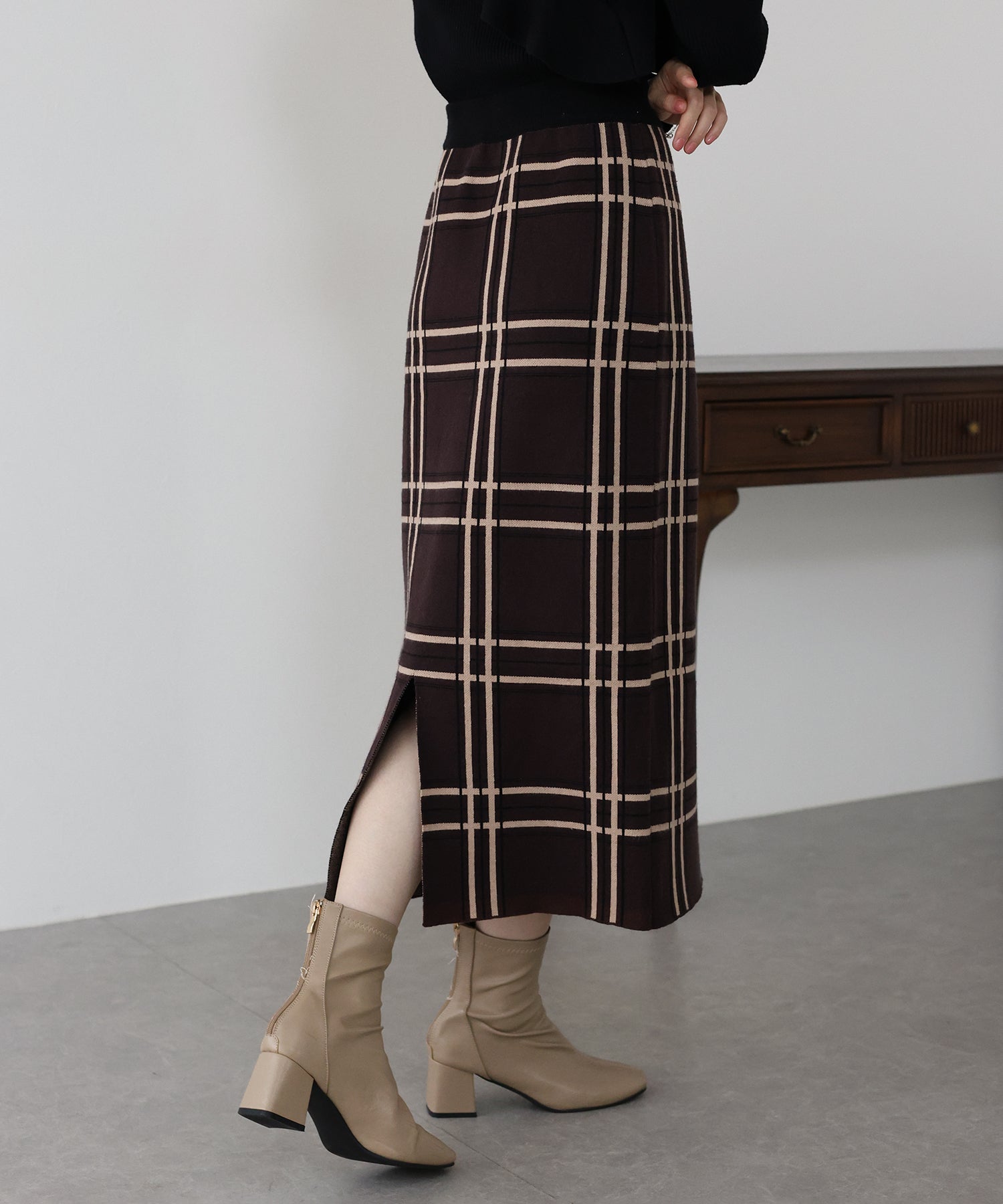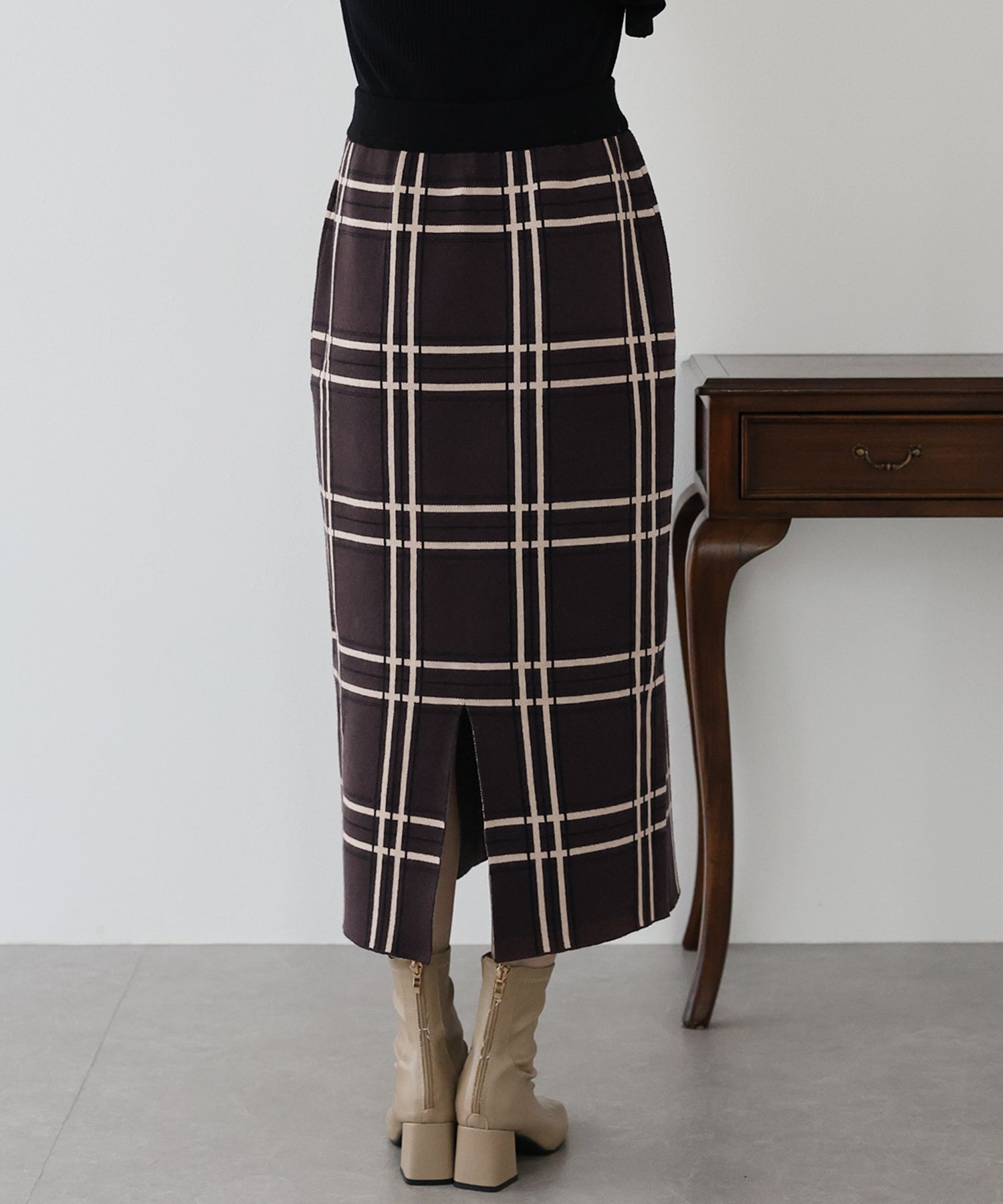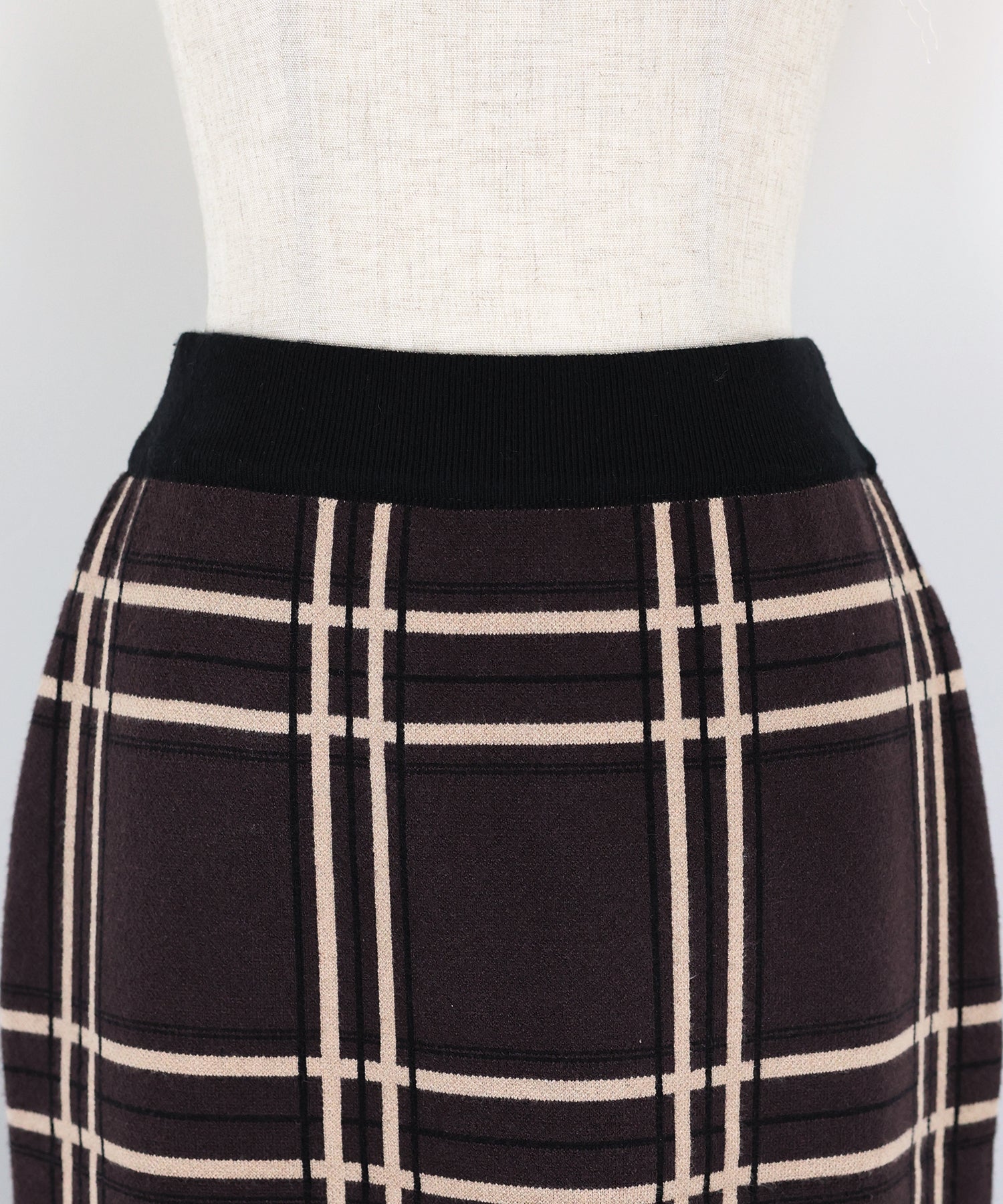秋冬を先取りできるチェック柄が目を引くニットタイトスカート。