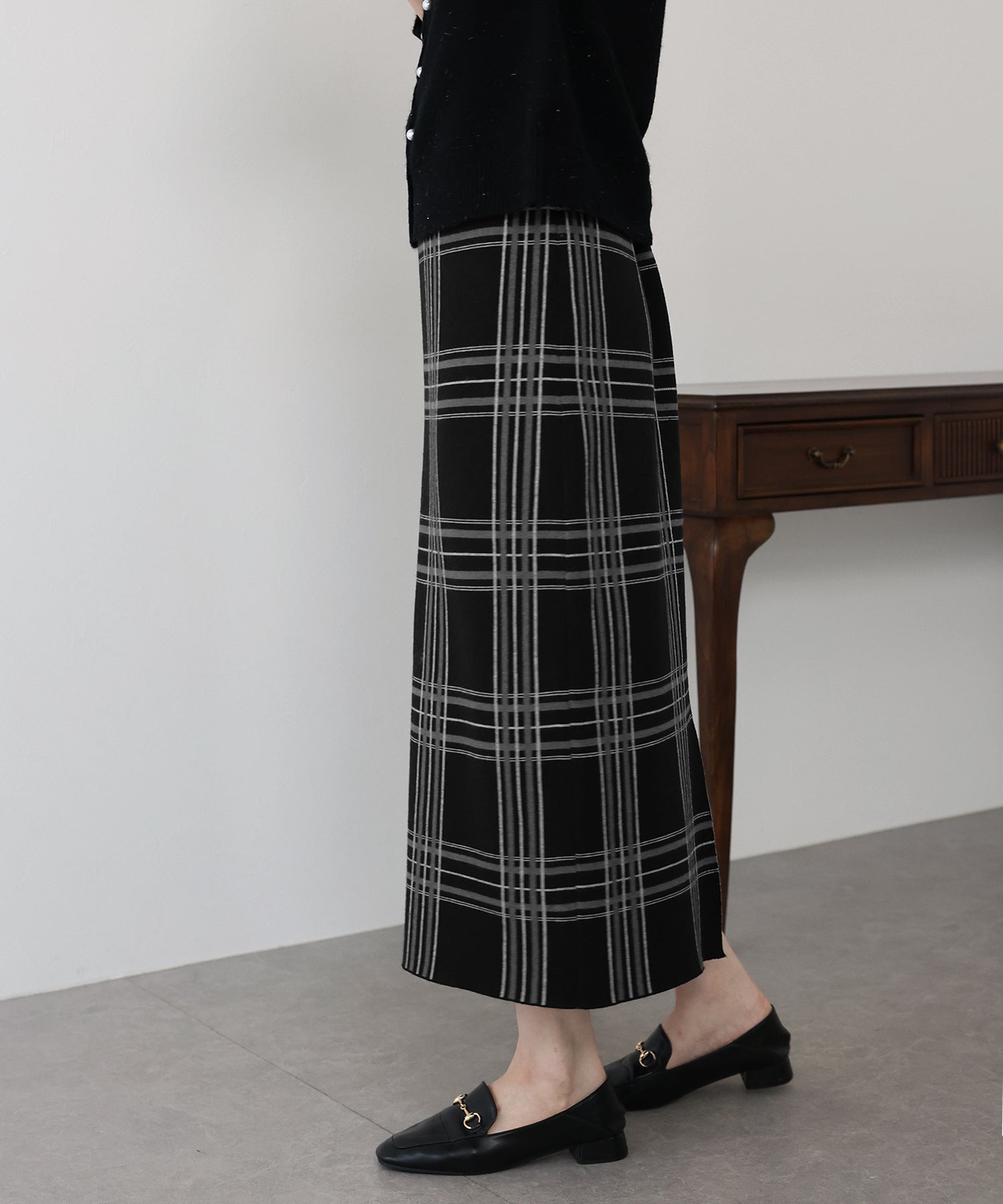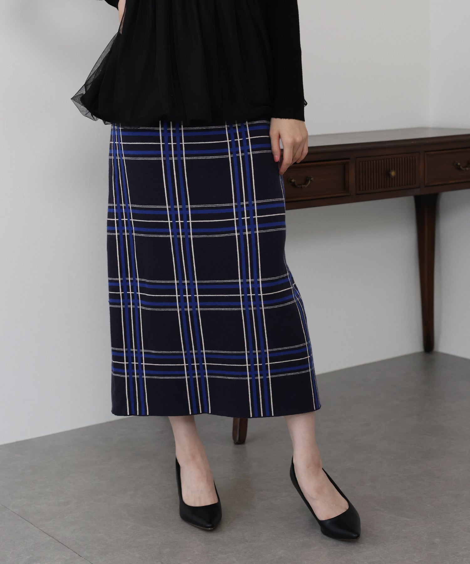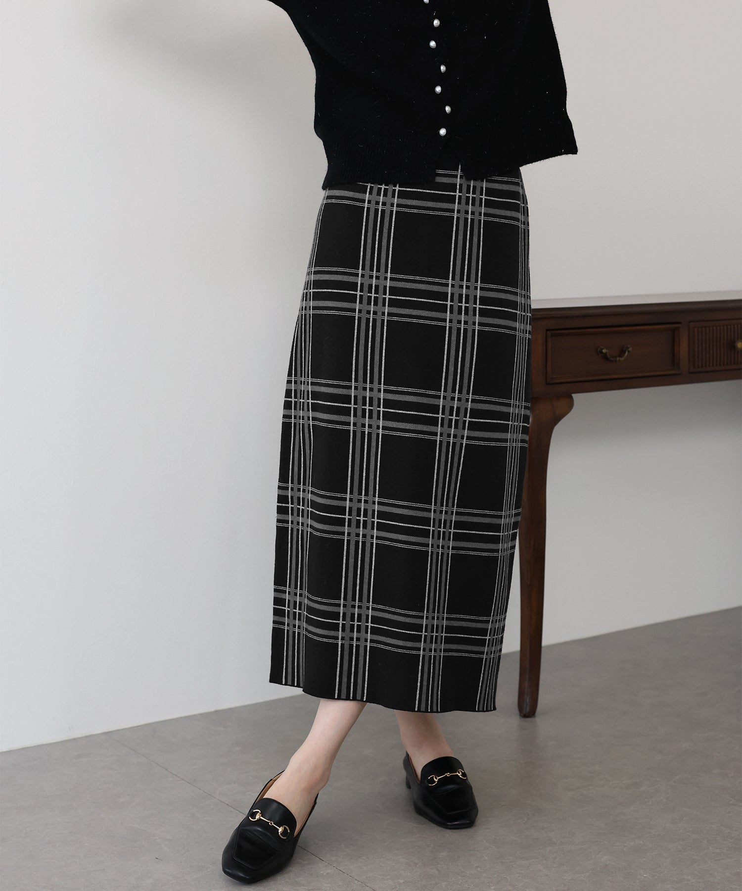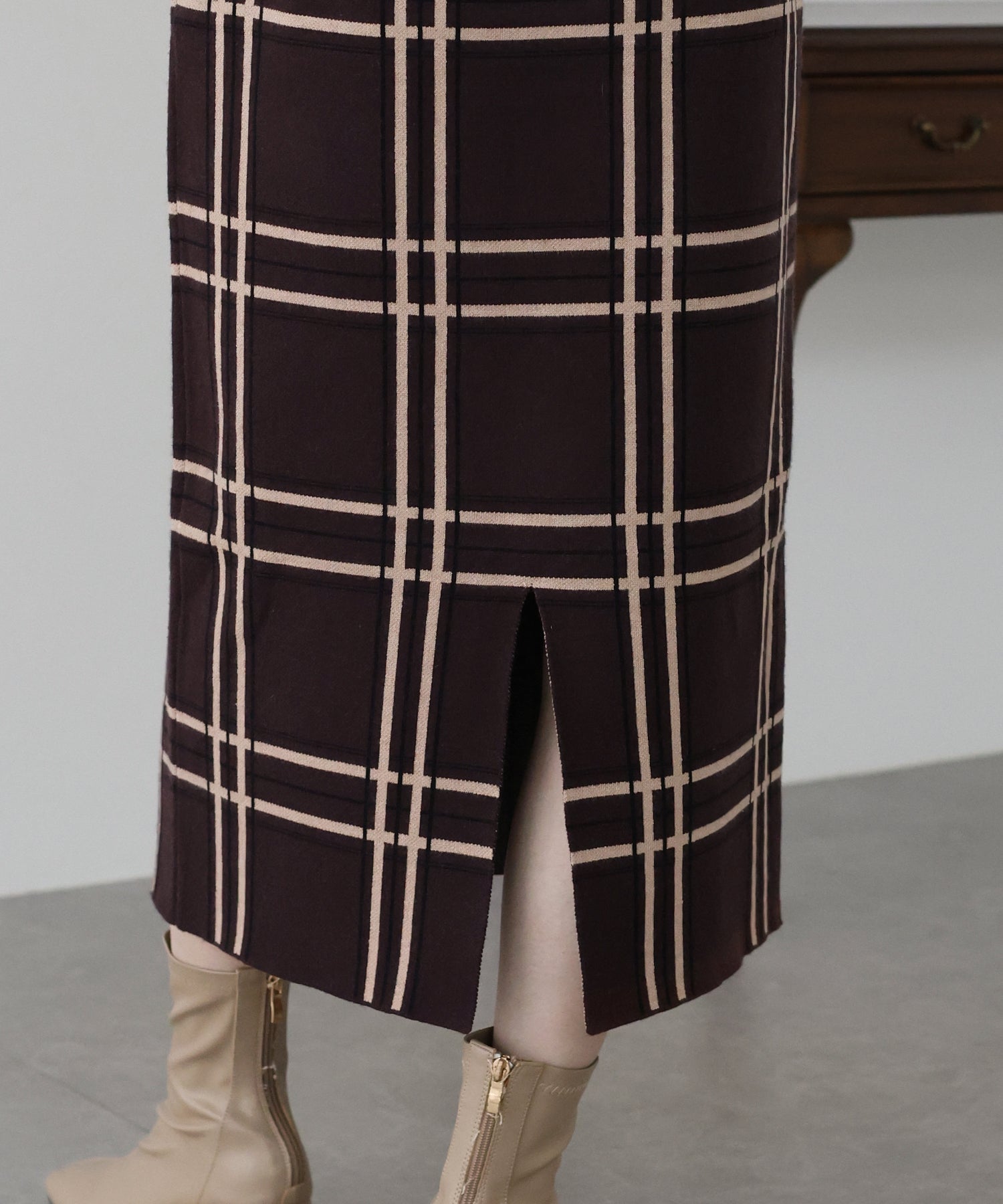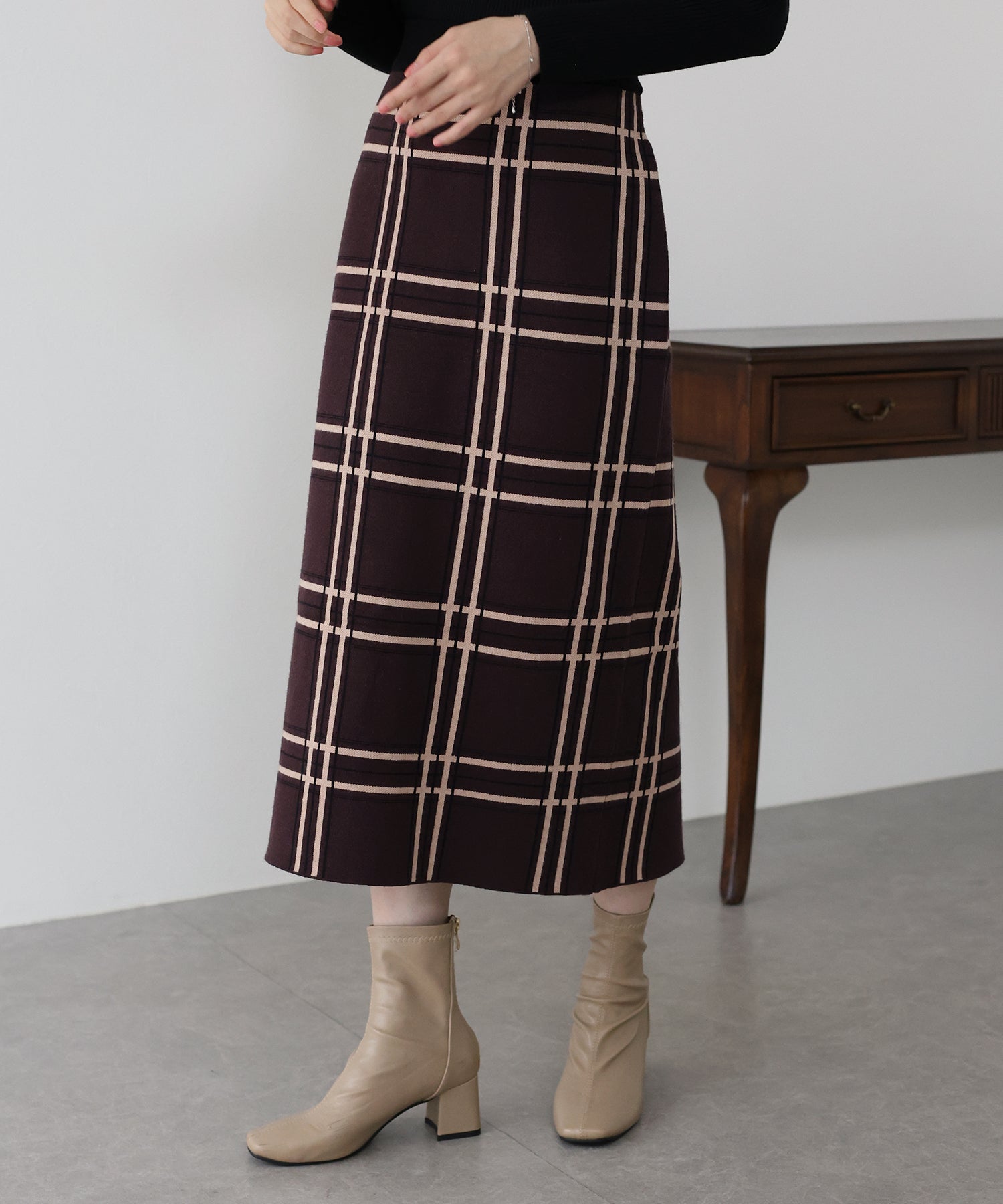 秋冬を先取りできるチェック柄が目を引くニットタイトスカート。