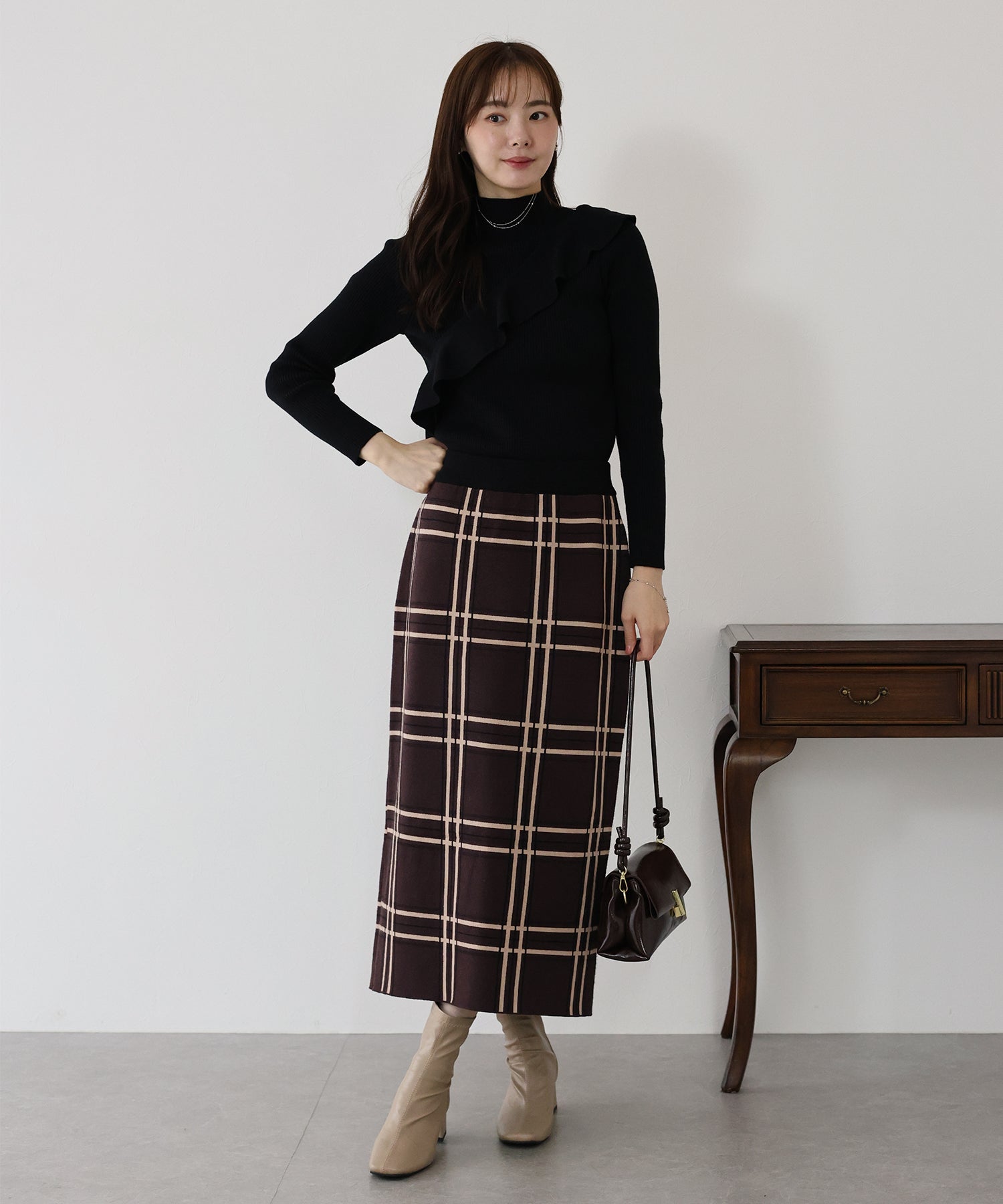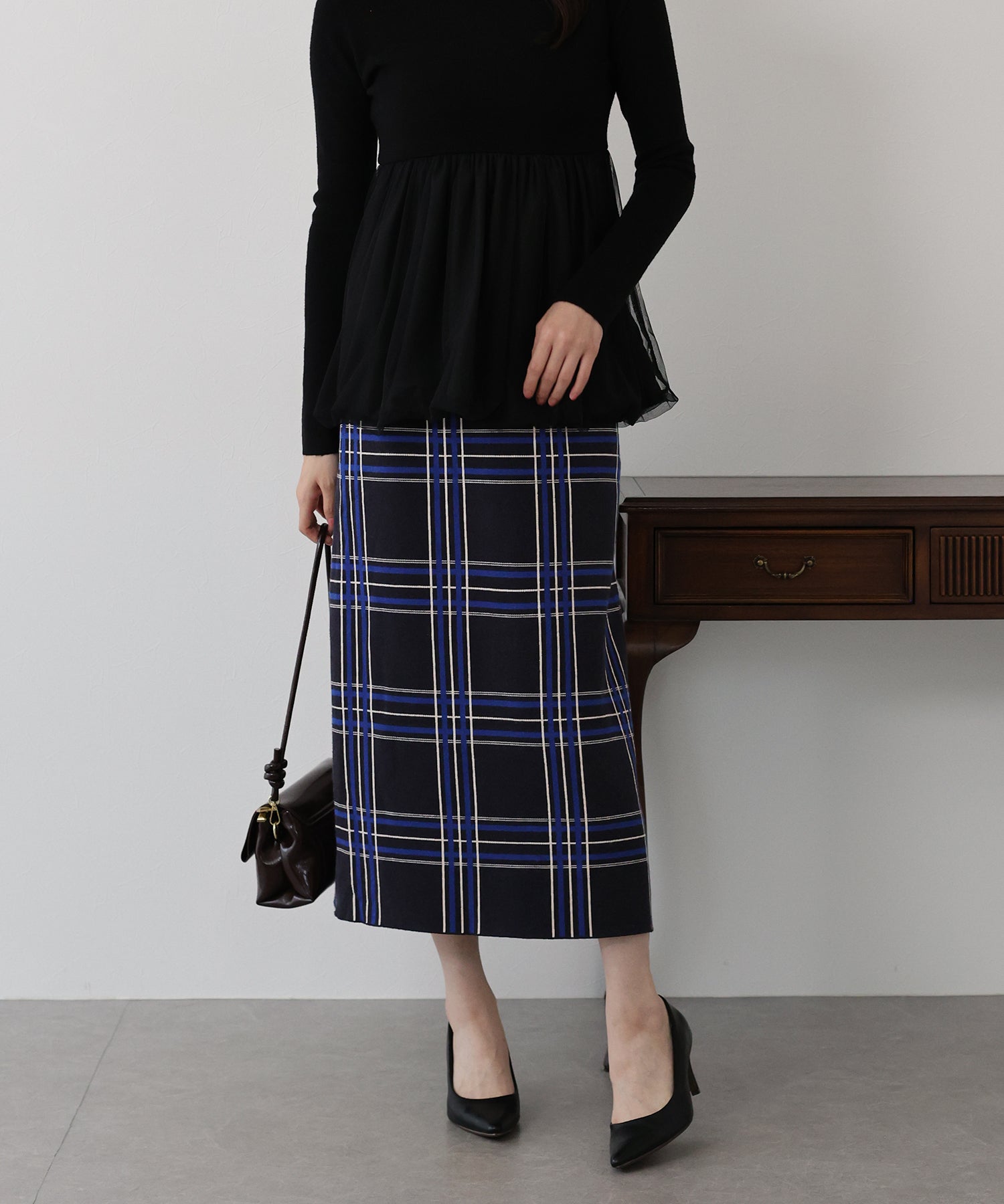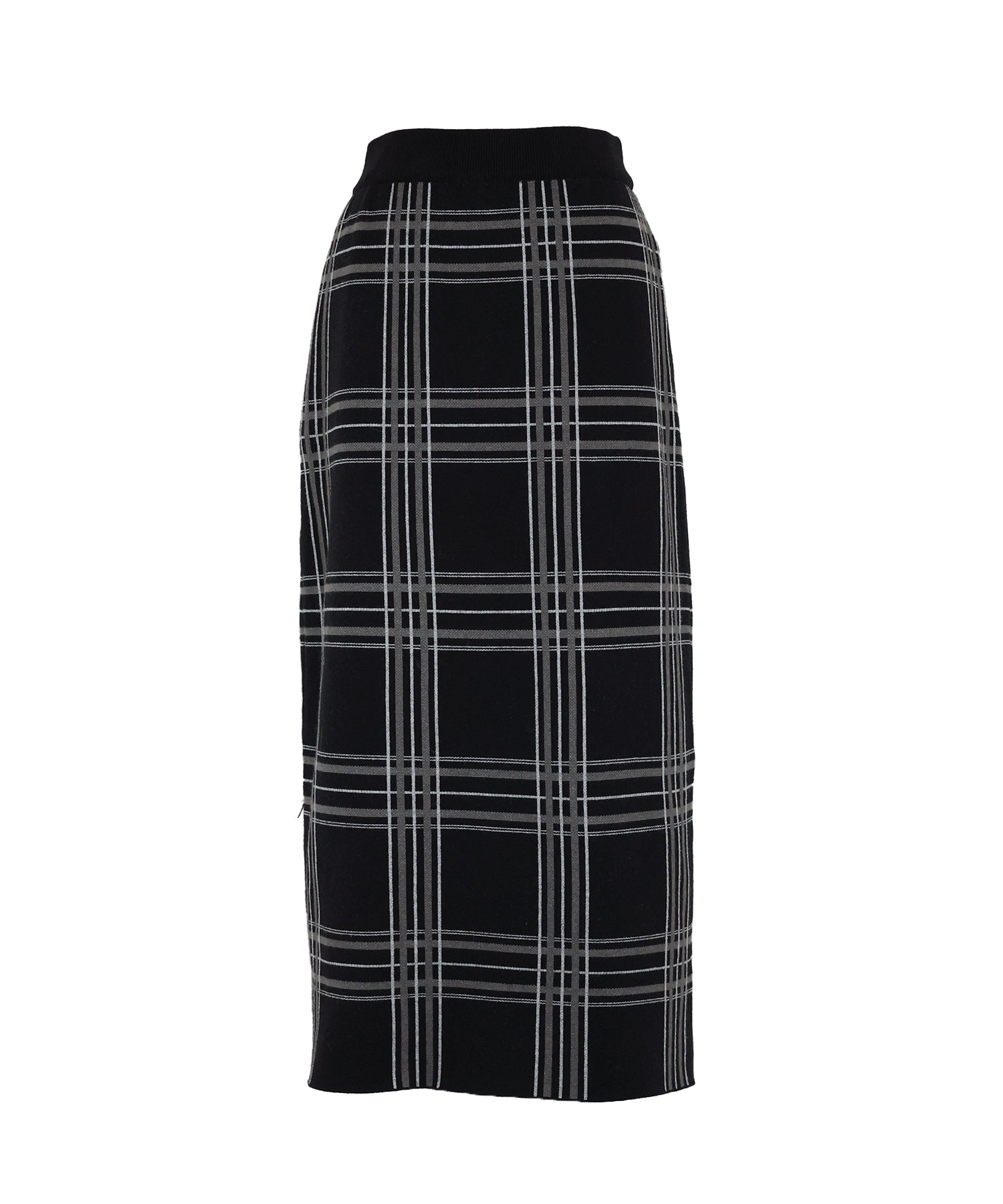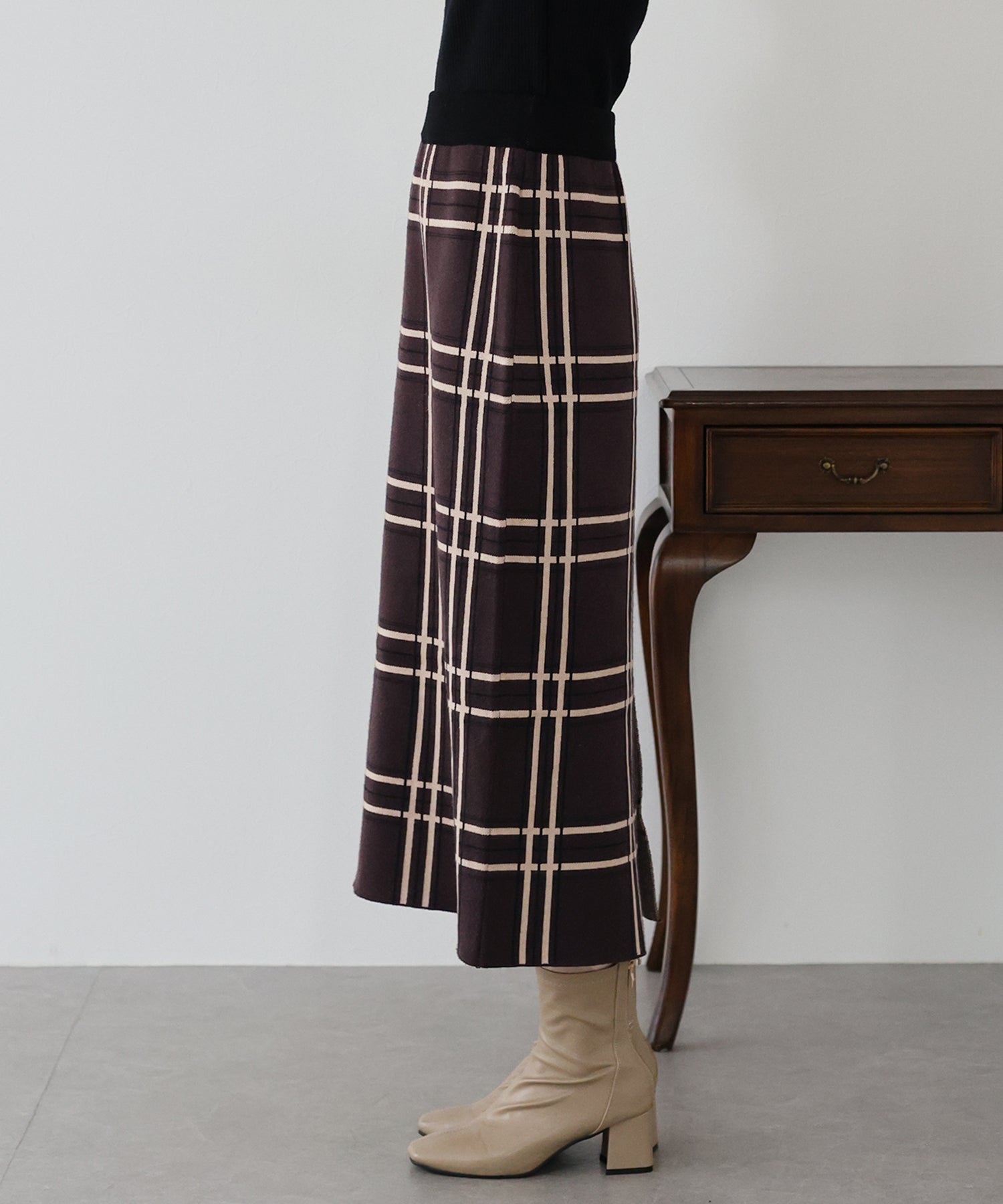 秋冬を先取りできるチェック柄が目を引くニットタイトスカート。