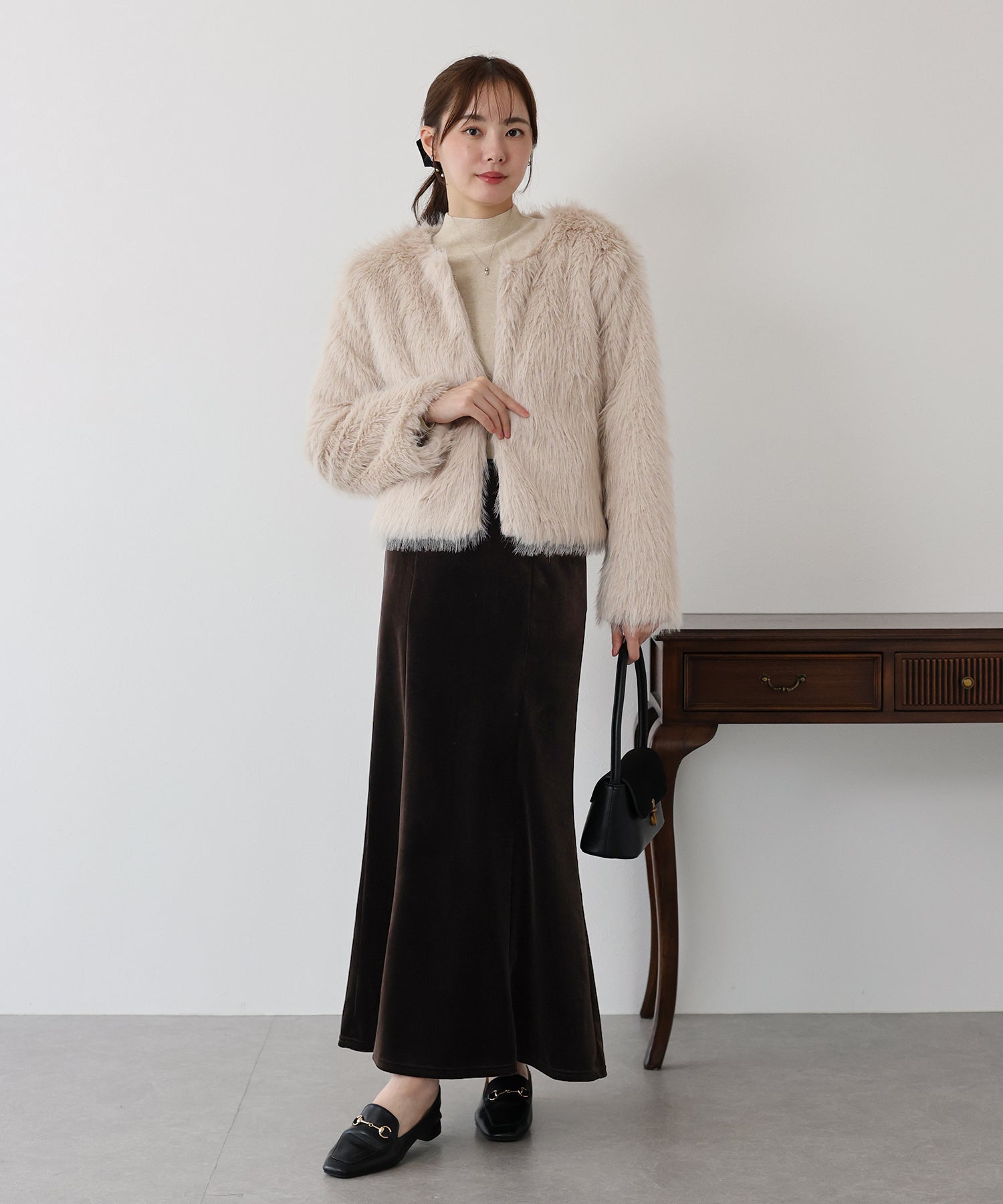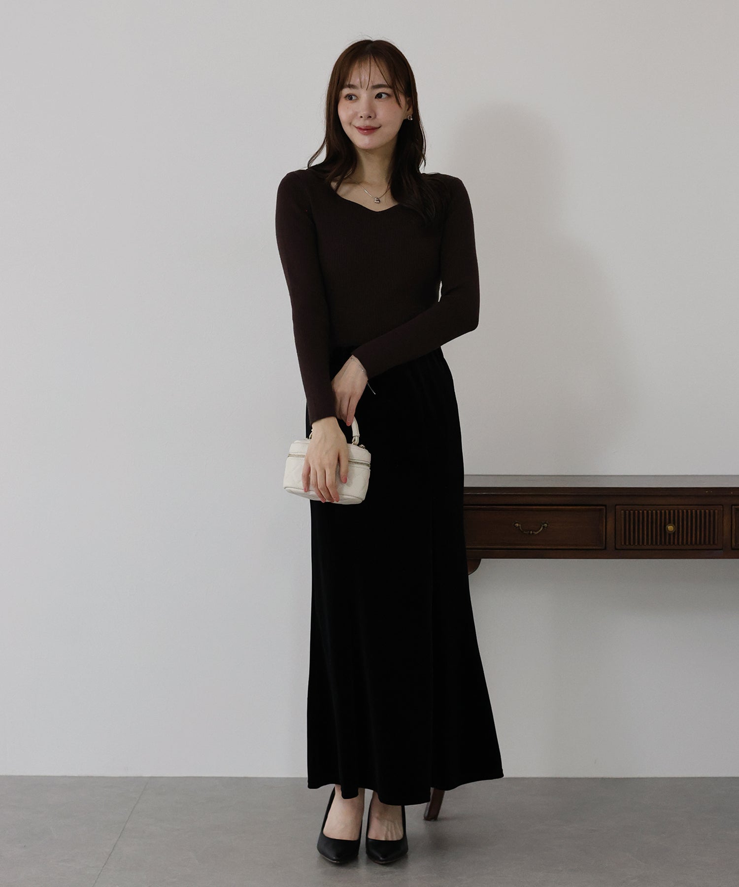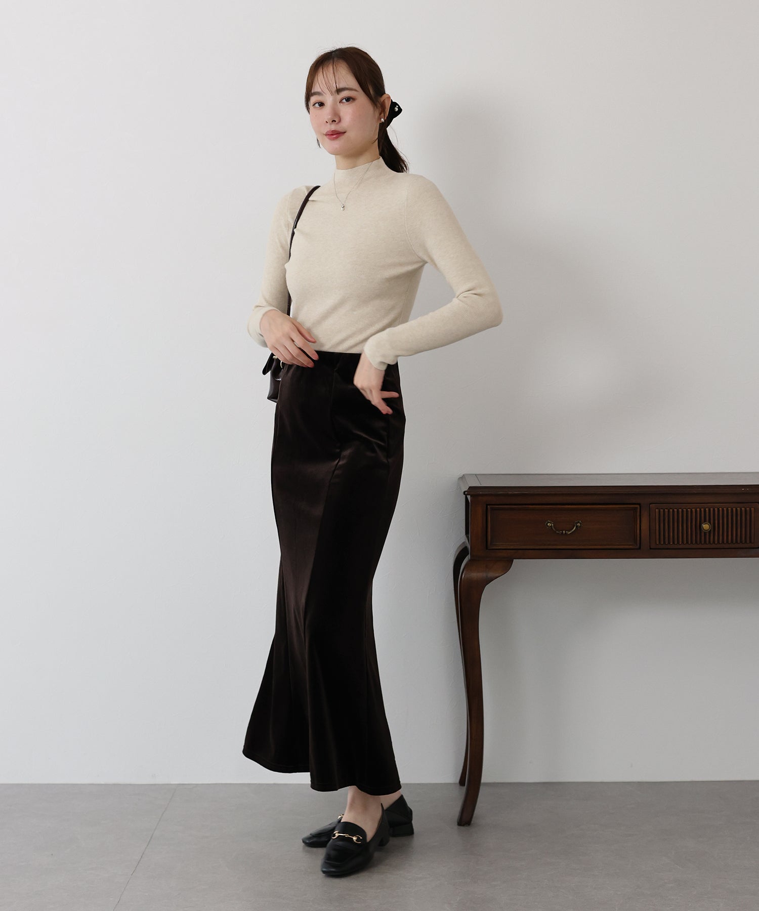 トレンドのベロア素材が秋冬のムードを高めるマーメイドラインのスカート。