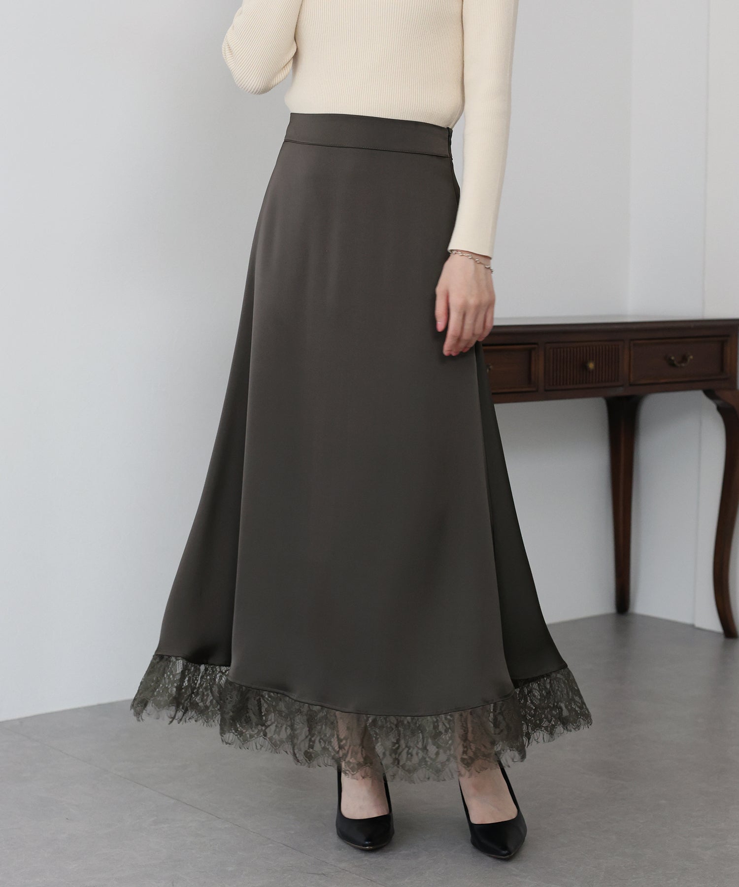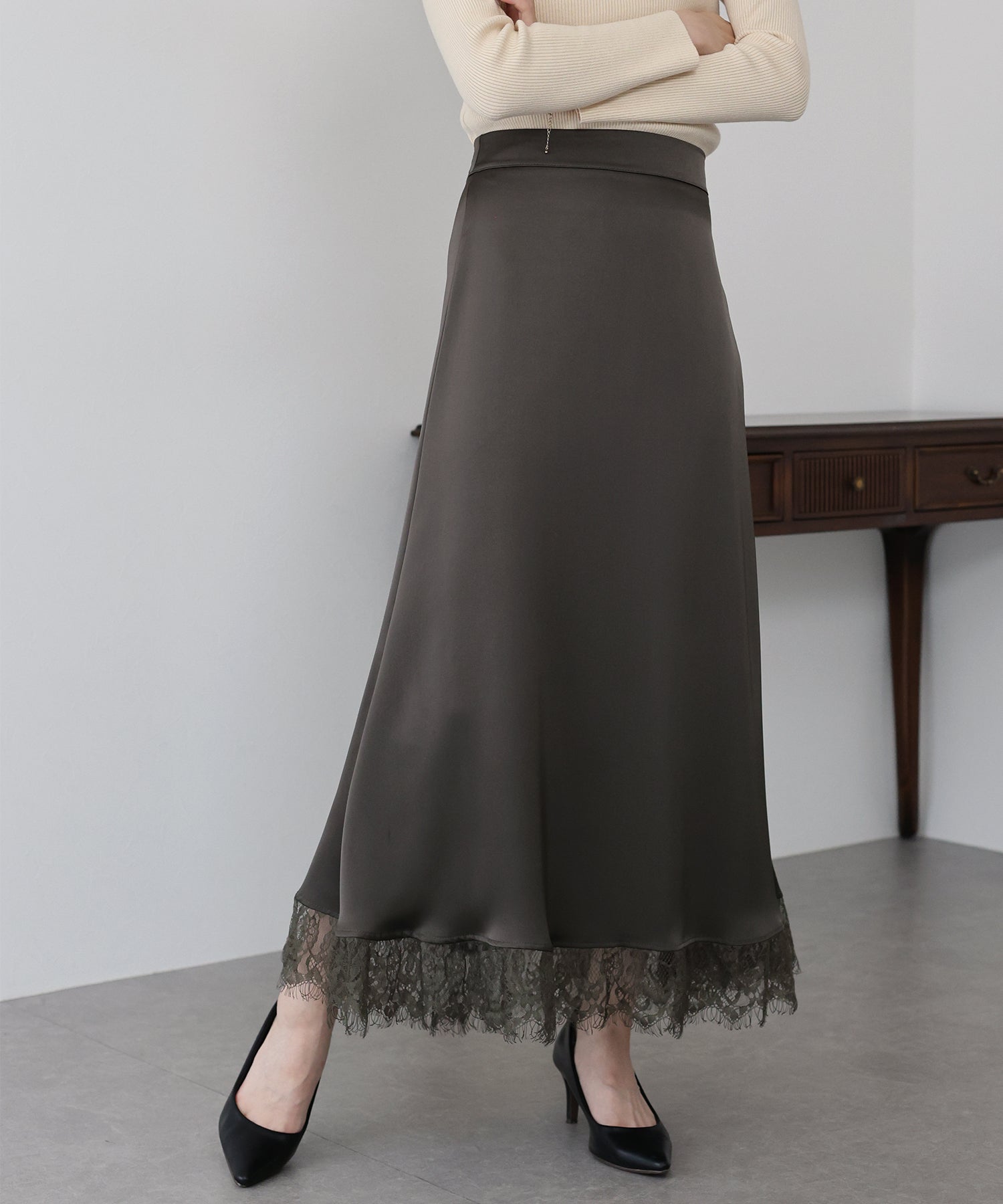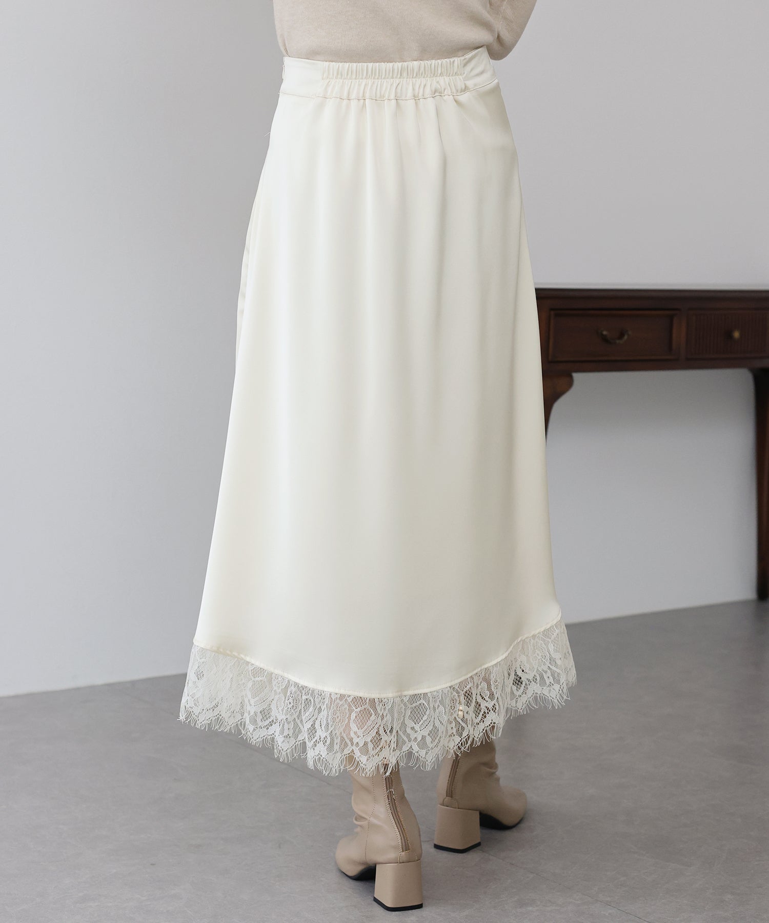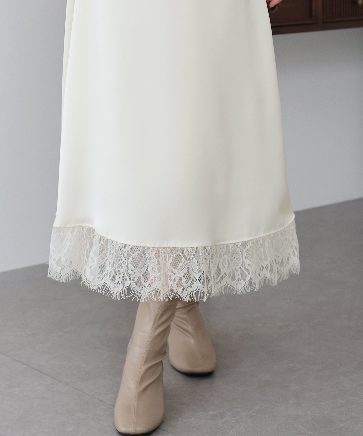 上品で華やかに仕上がる裾レース付きサテンスカート