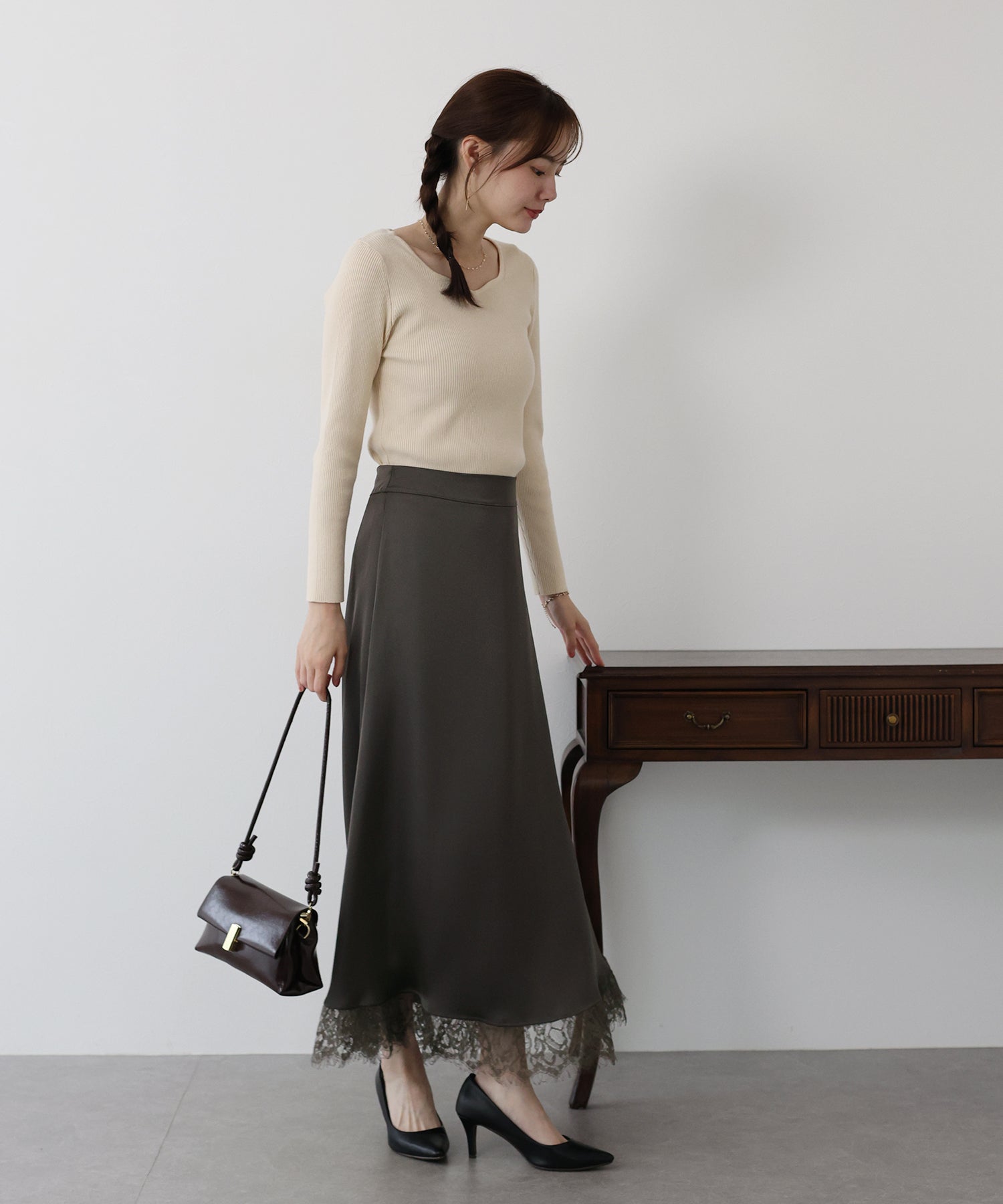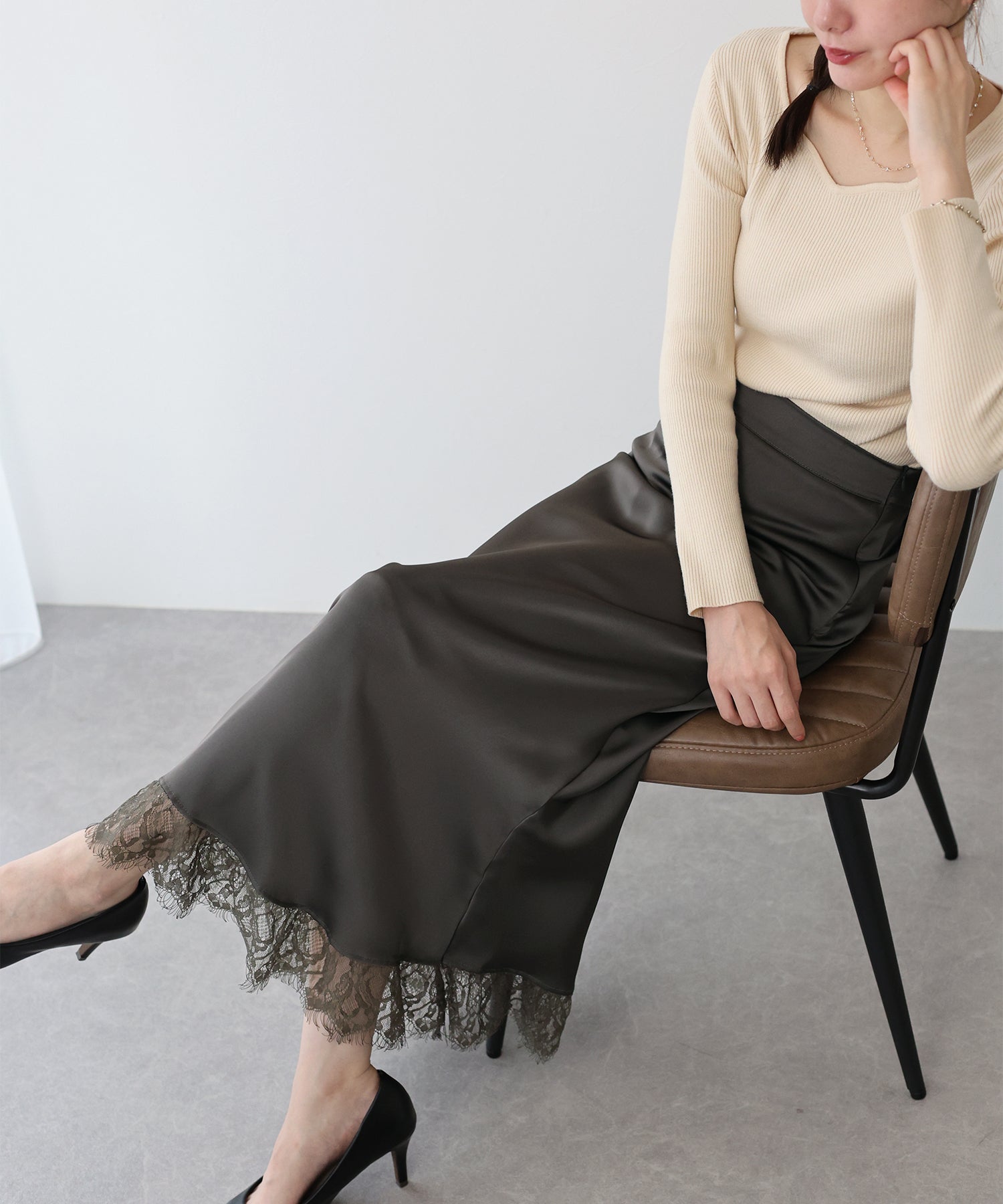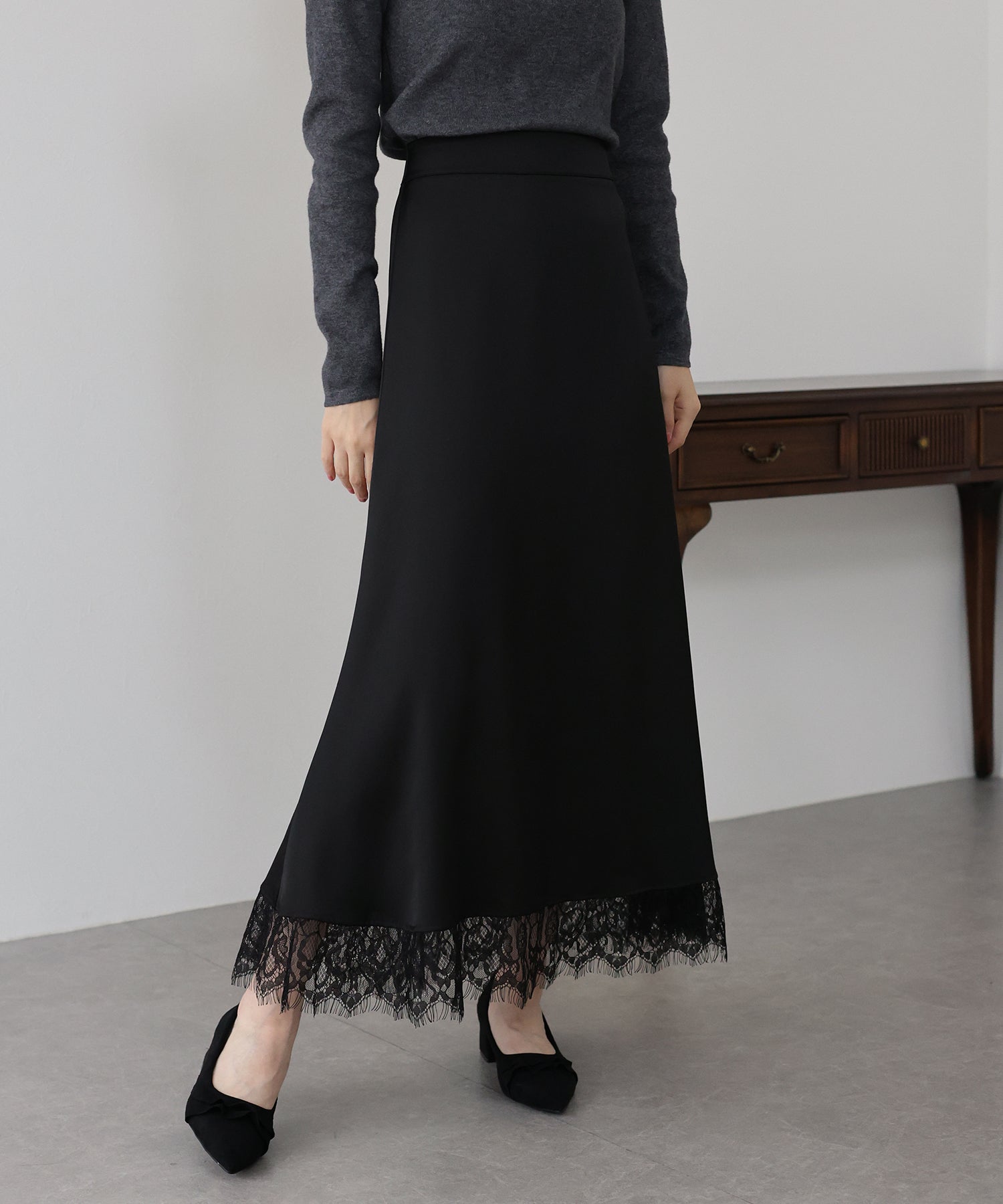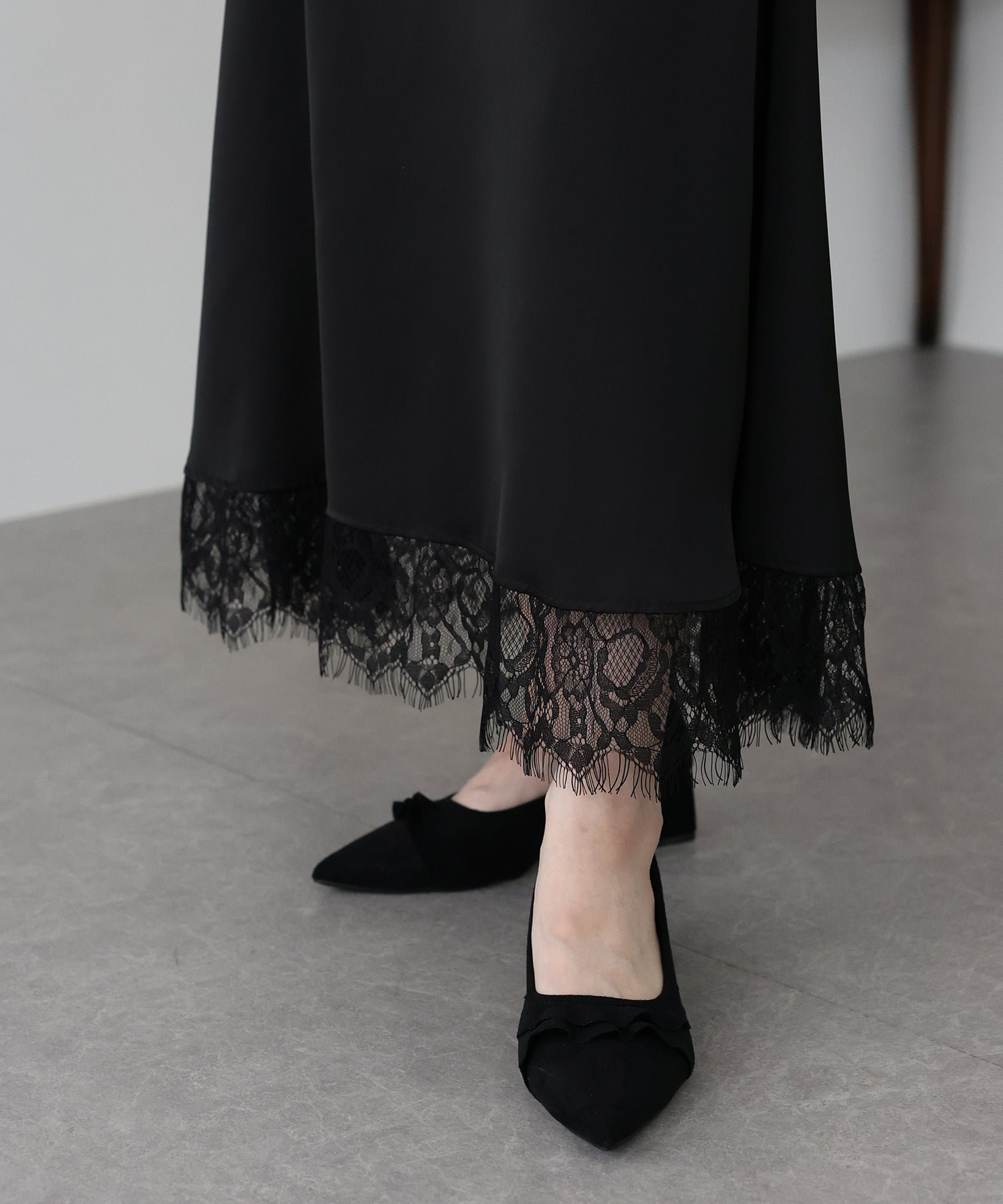 上品で華やかに仕上がる裾レース付きサテンスカート
