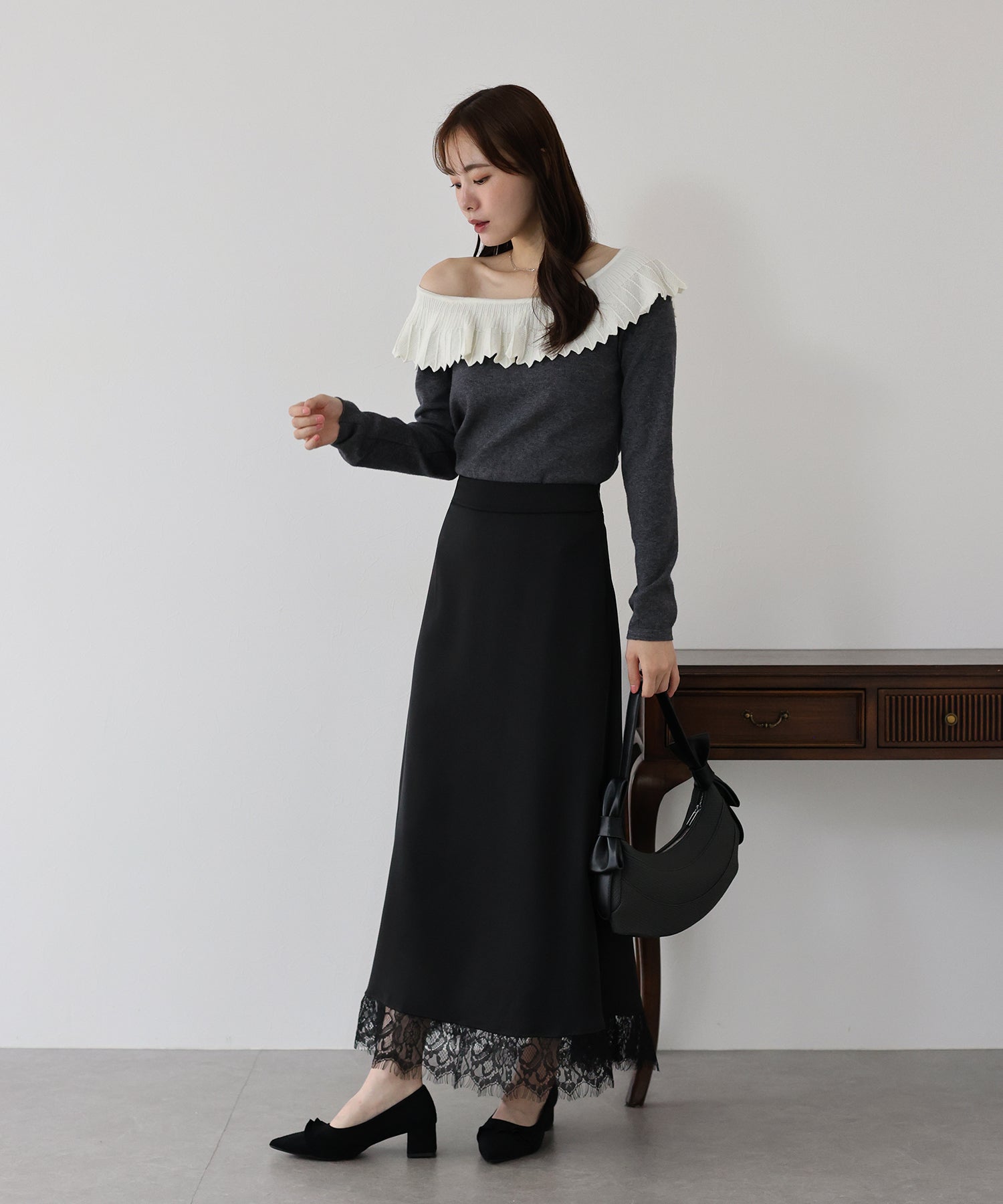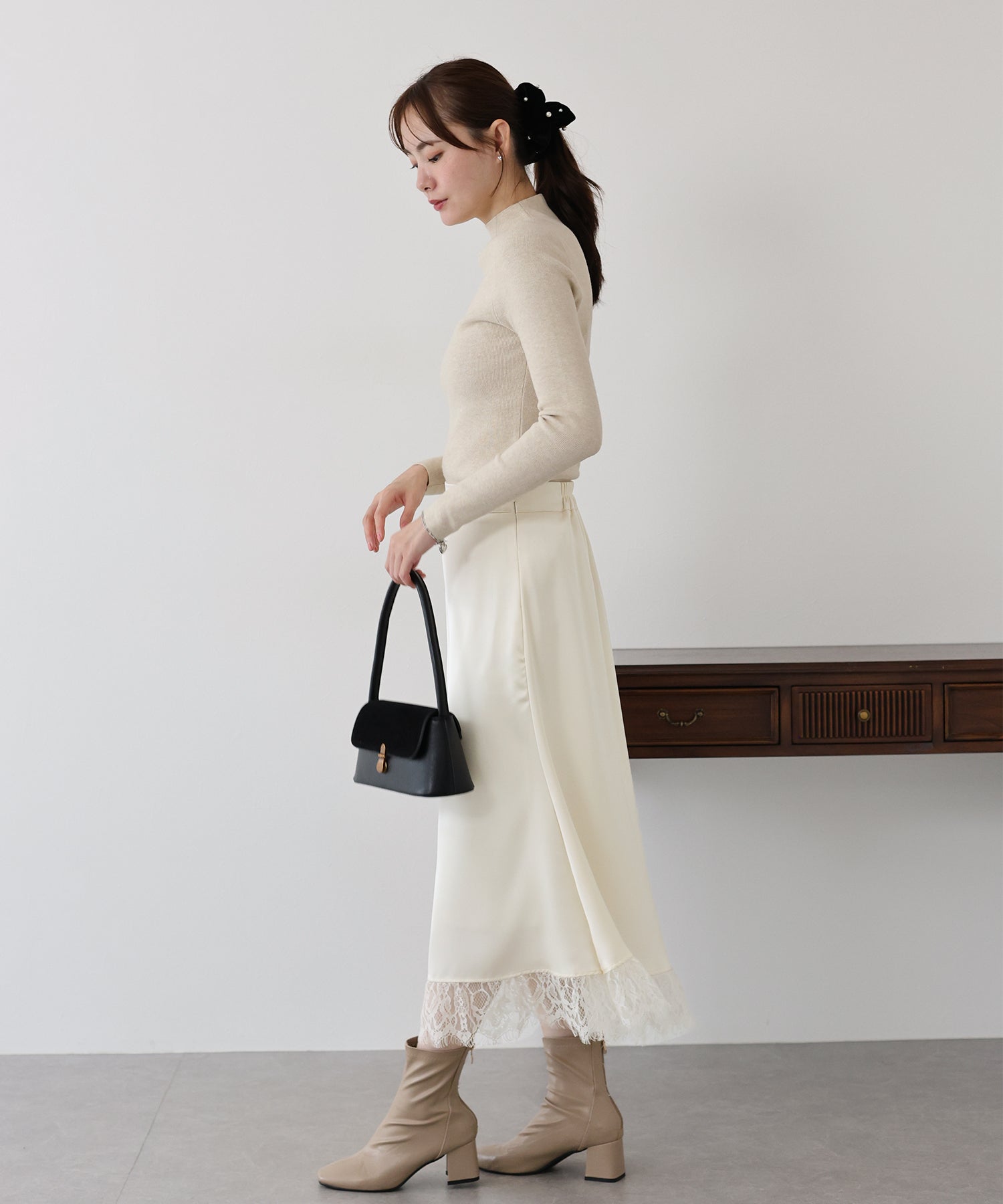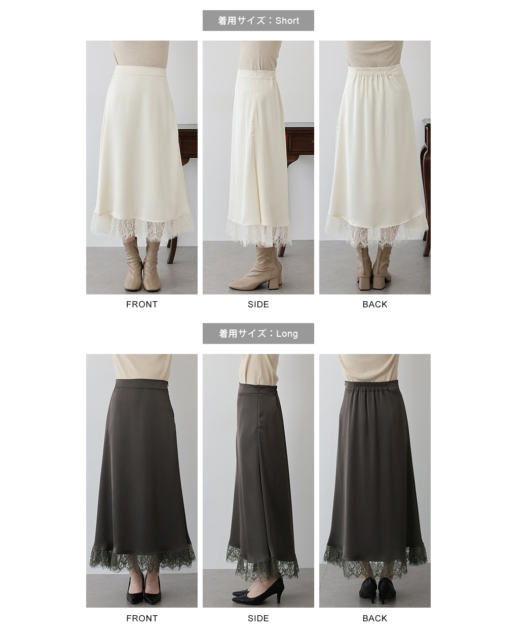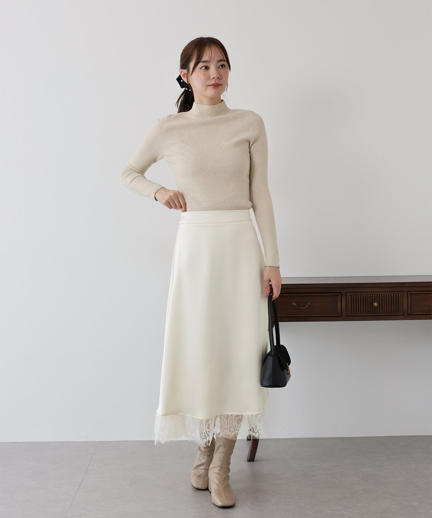 上品で華やかに仕上がる裾レース付きサテンスカート