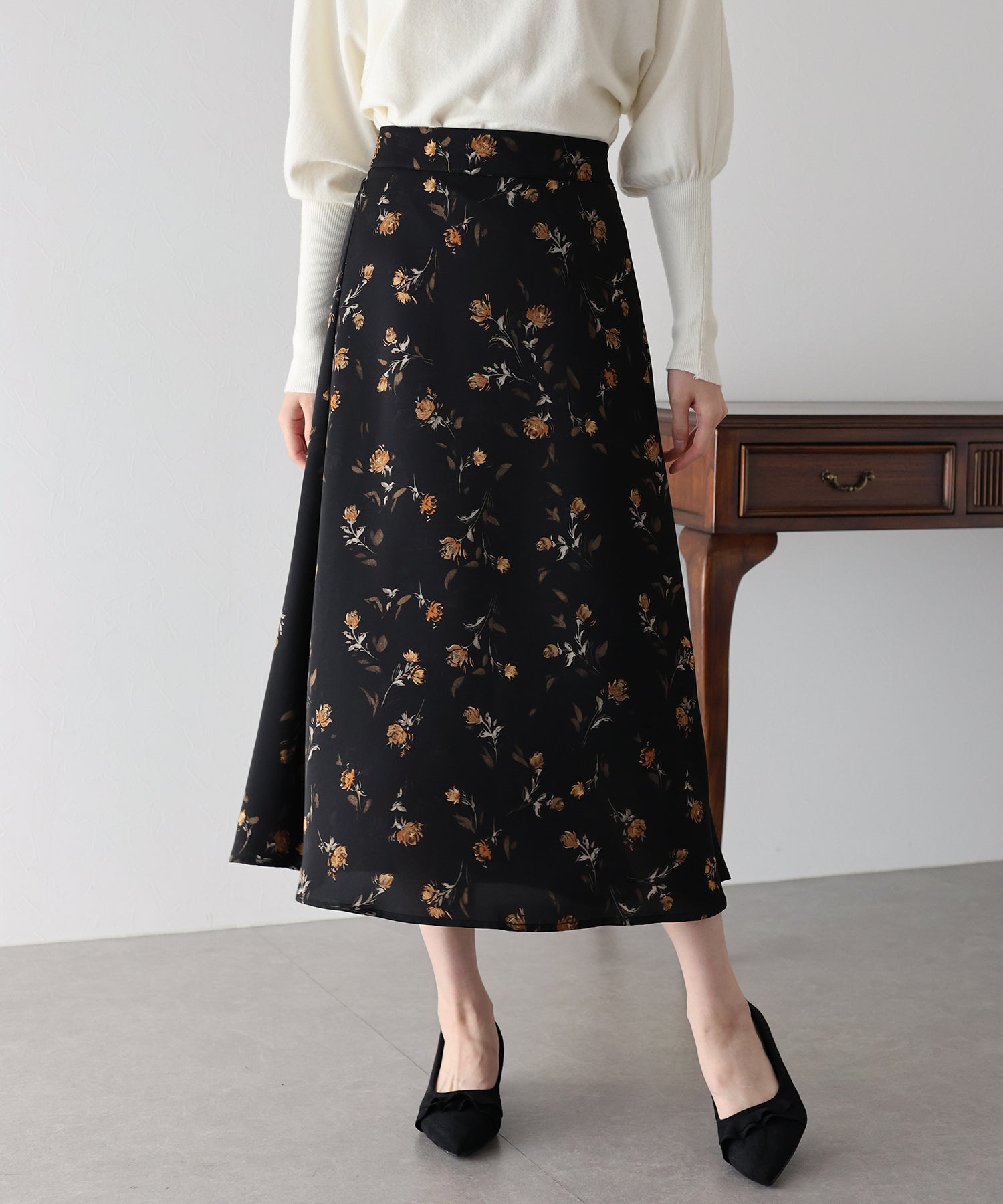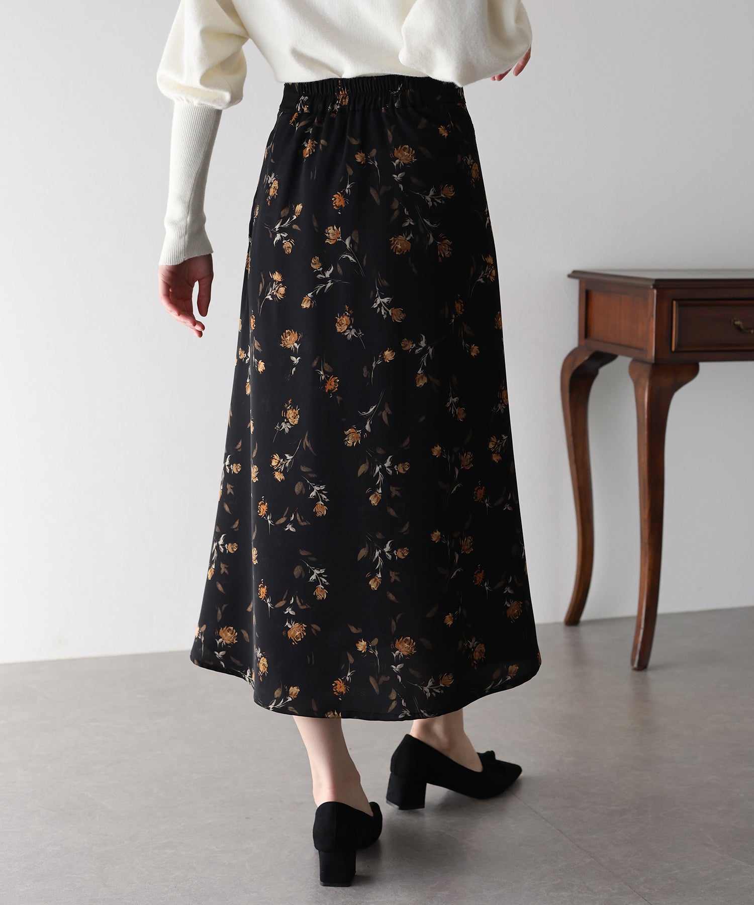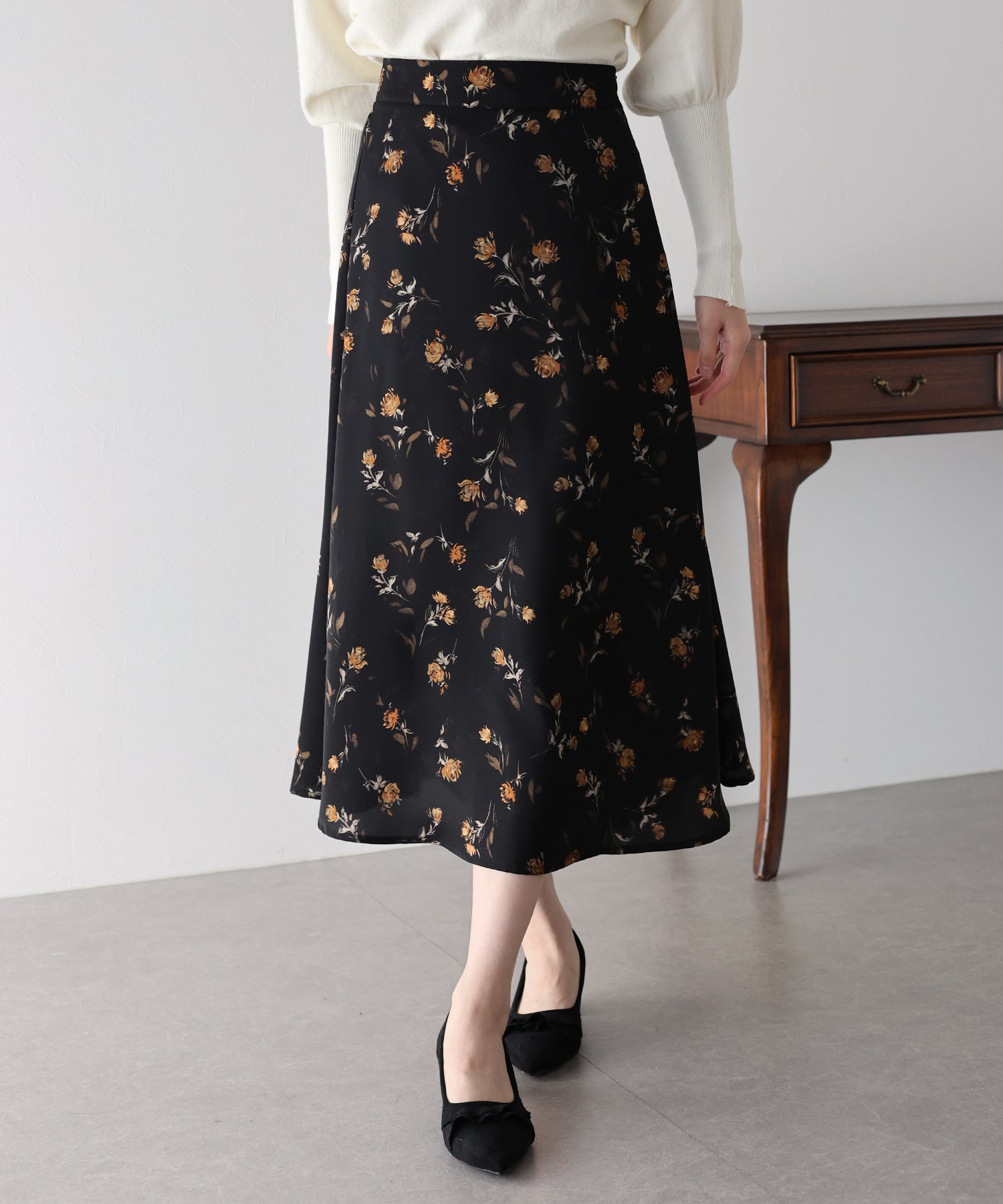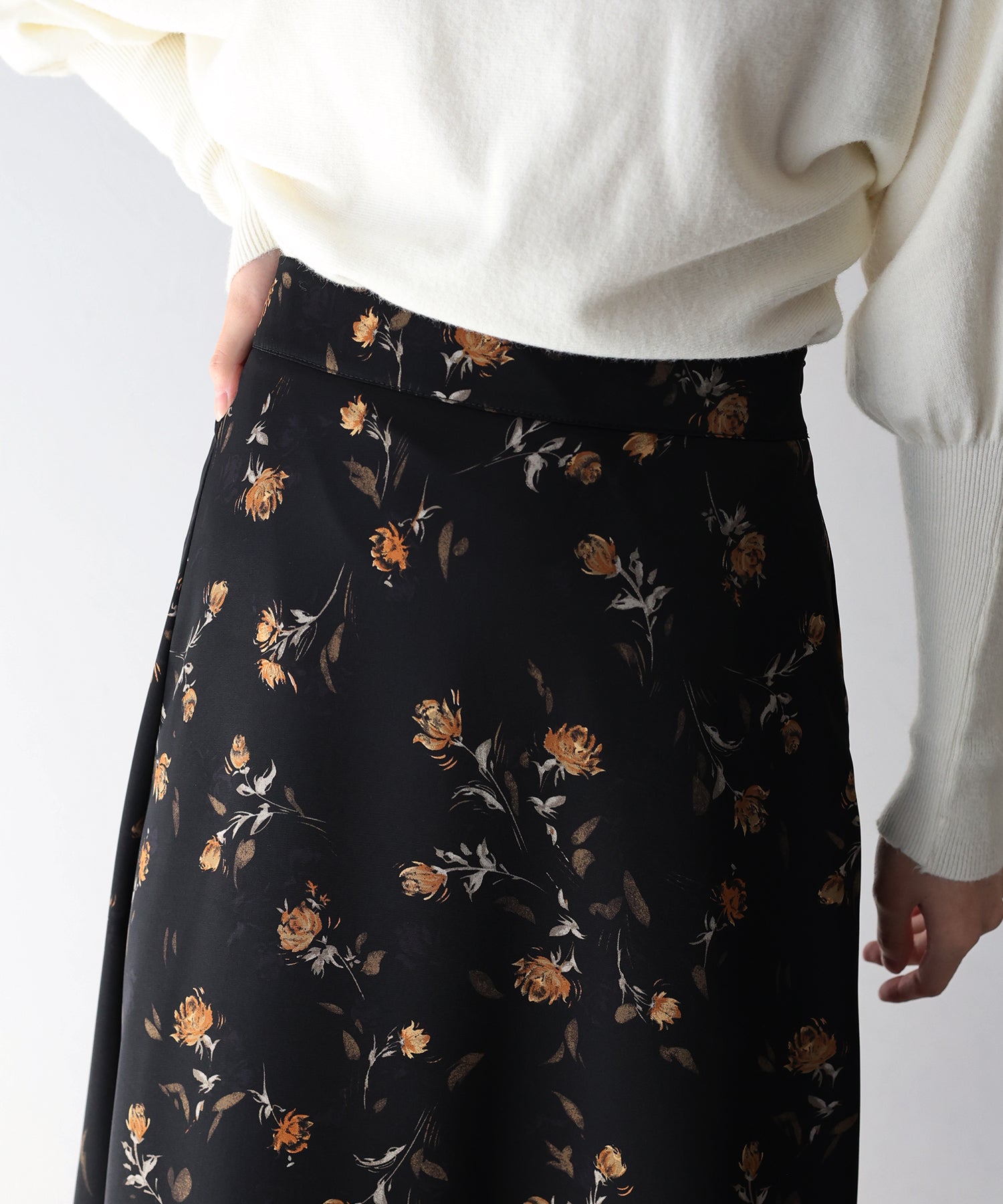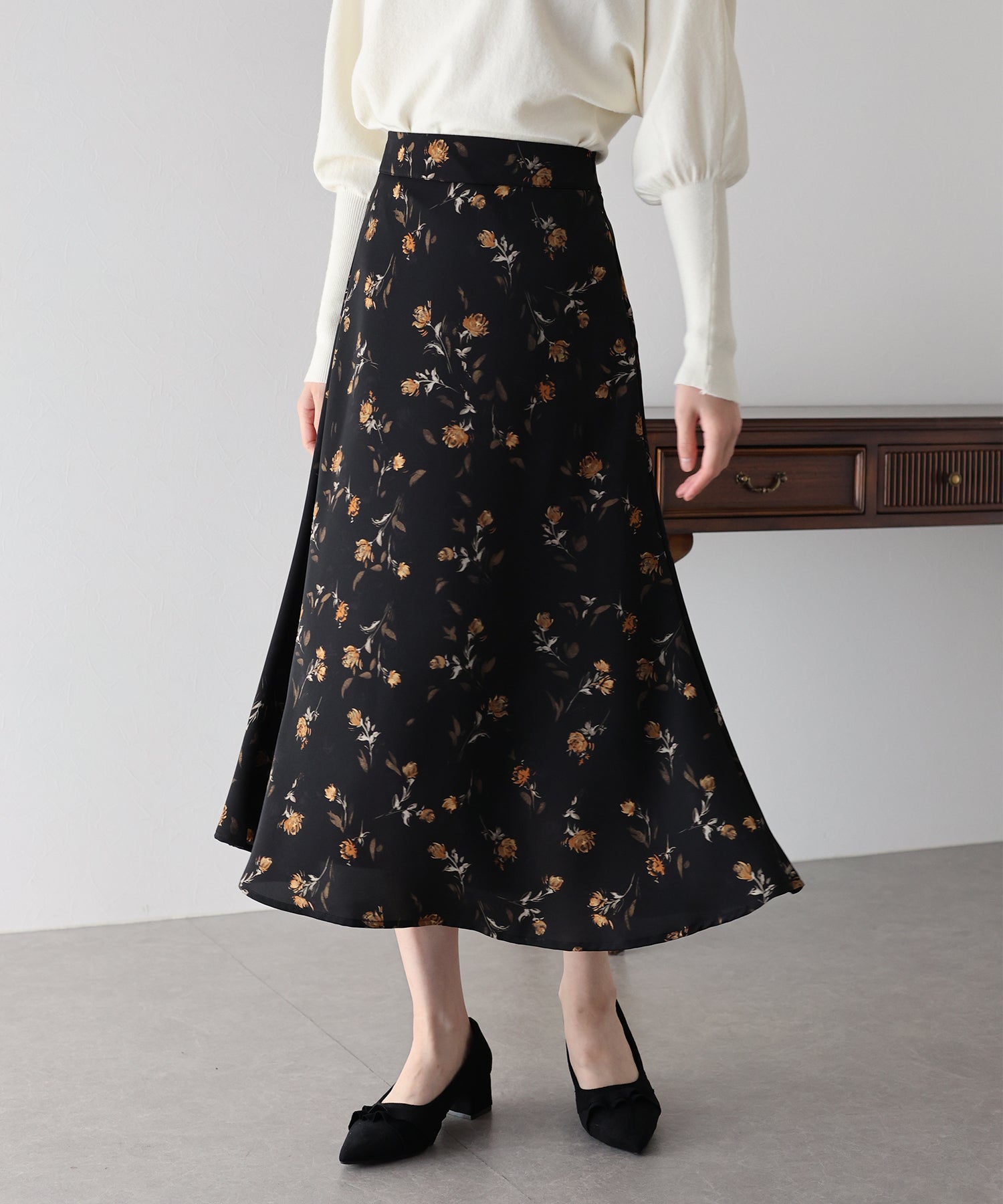 コーディネートを華やかに仕上げる花柄フレアーマーメイドスカート