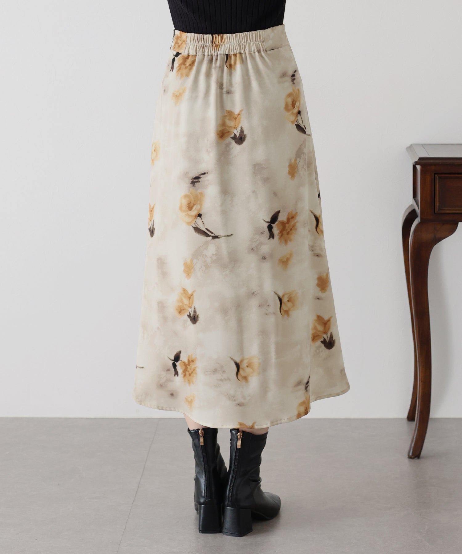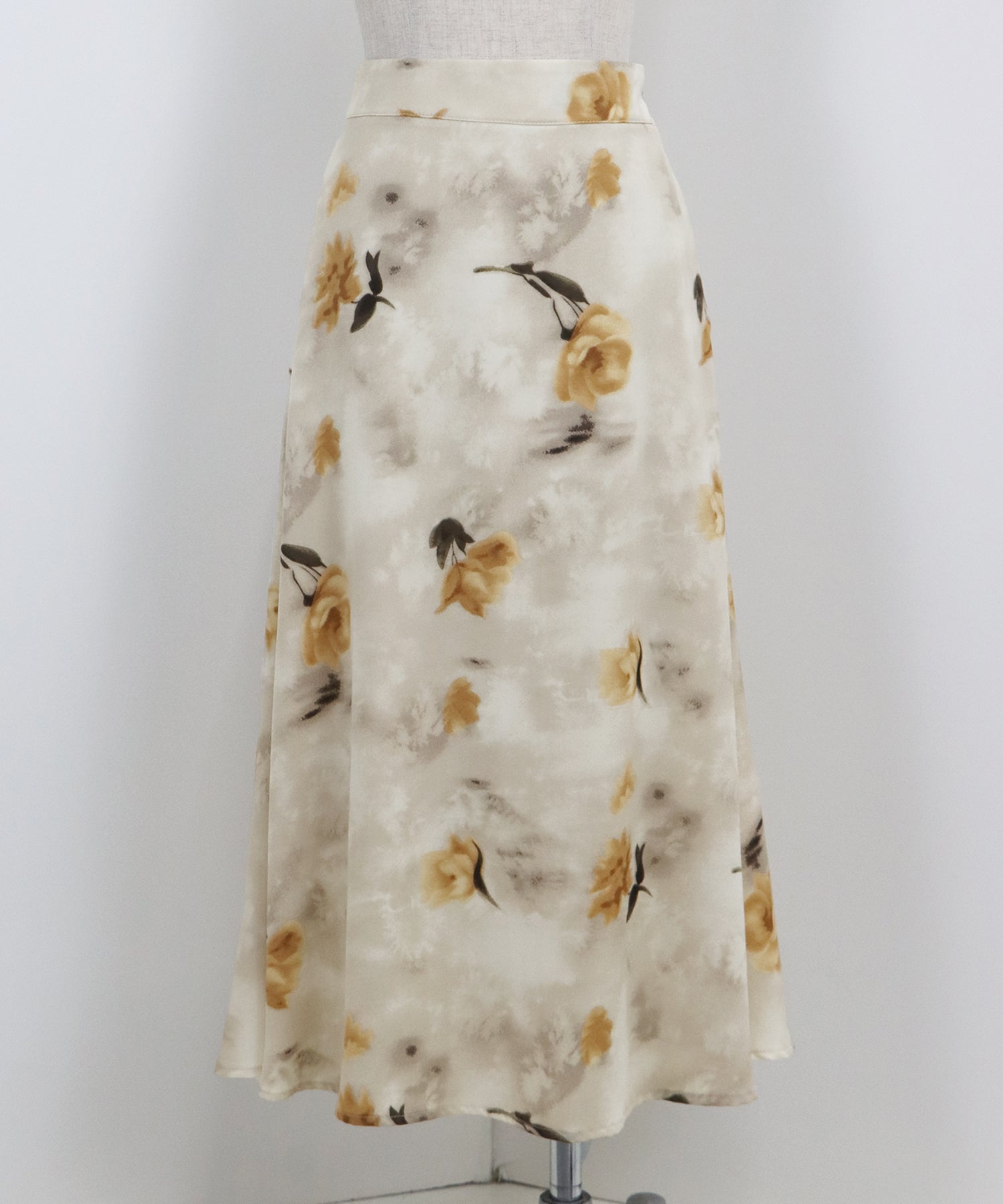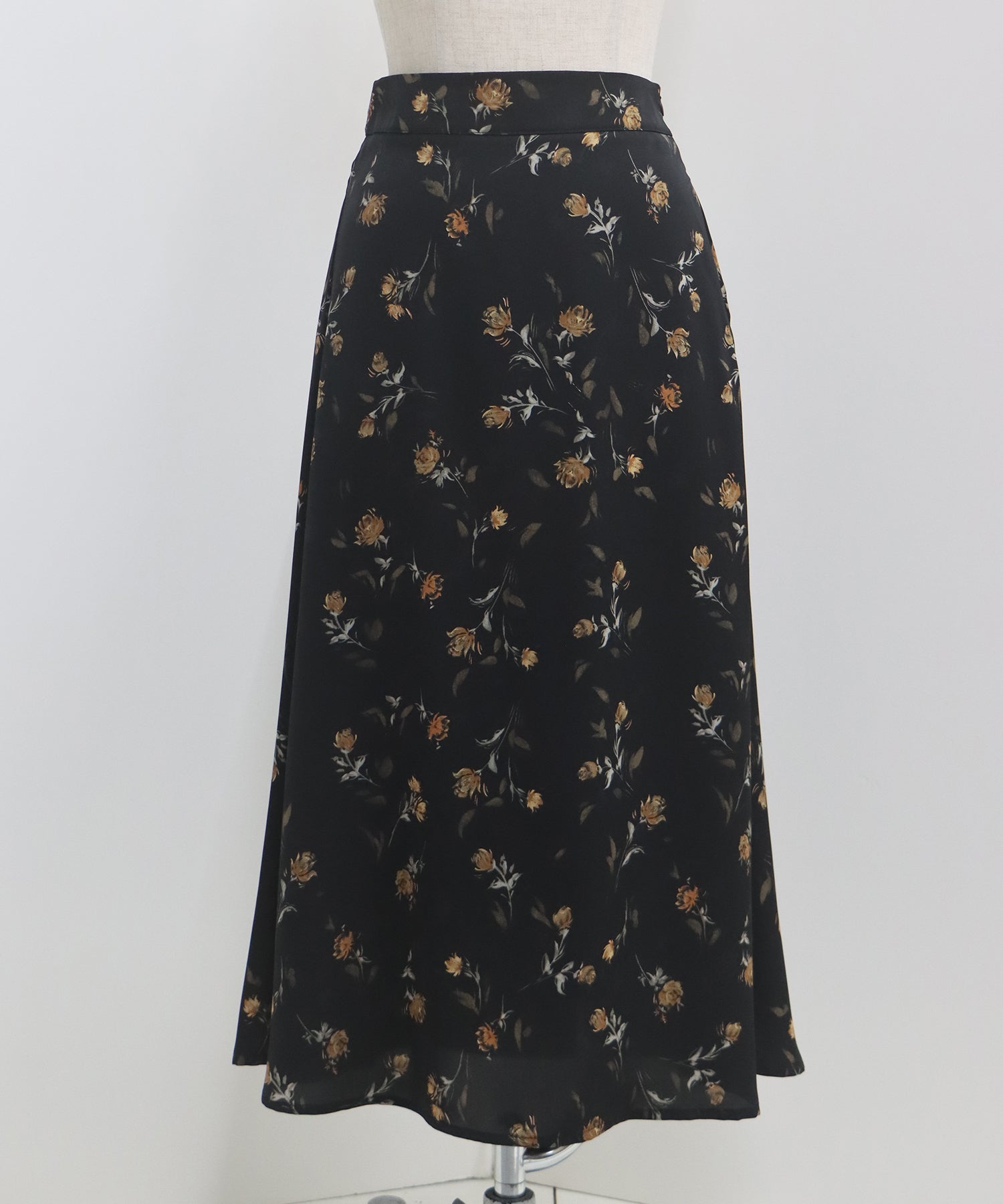 大人っぽいフラワープリントが魅力のサテンロングスカート。