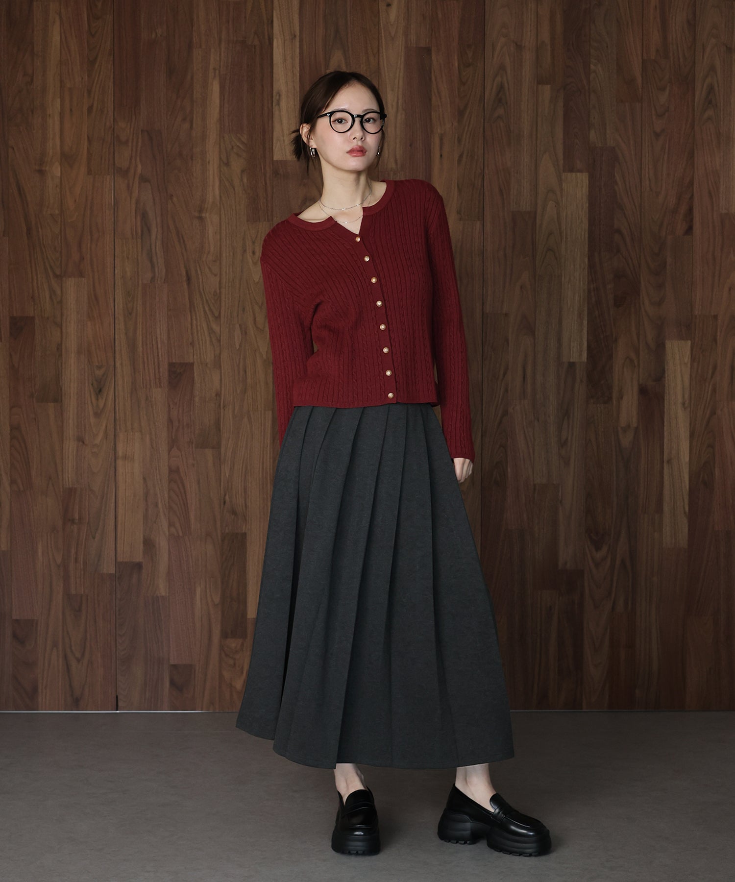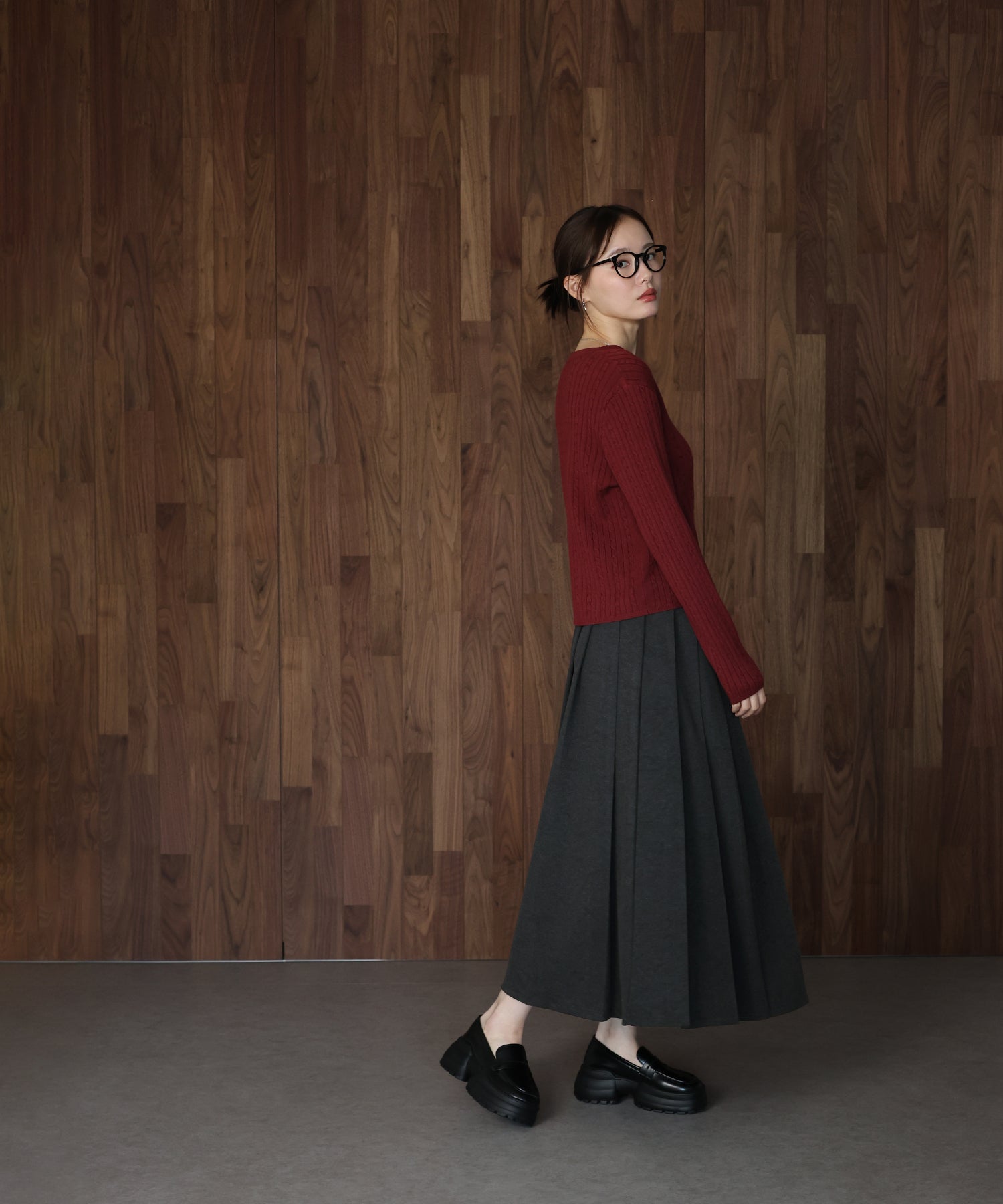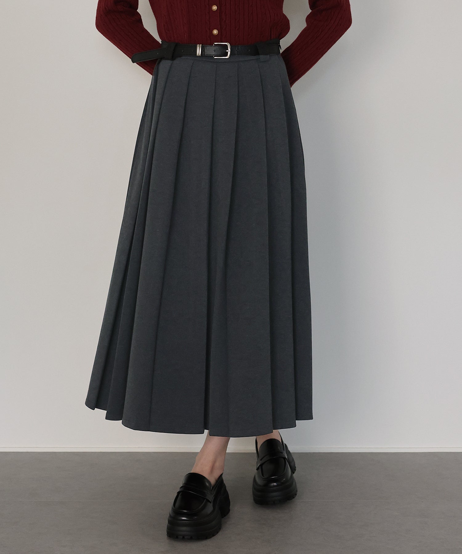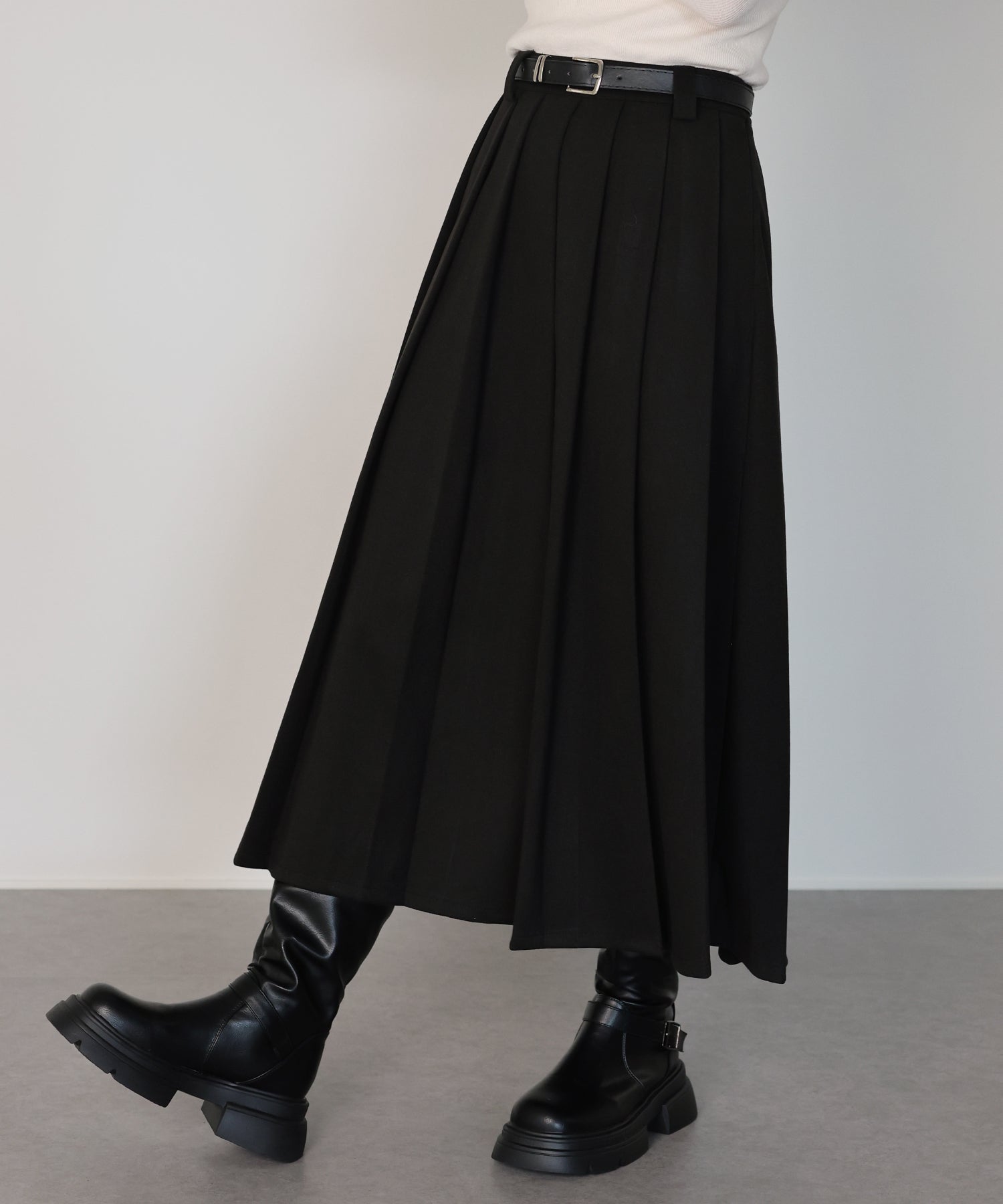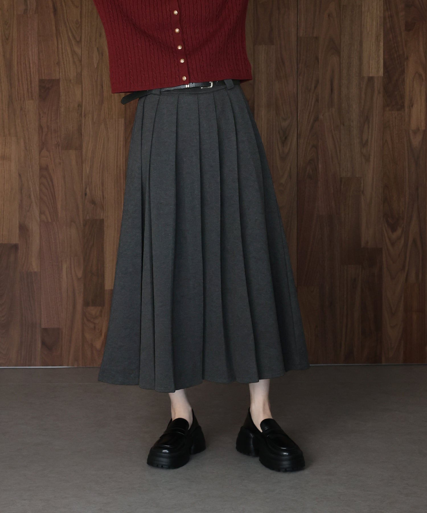 上品な落ち感とプリーツが映えるメルトンプリーツスカート ?POINT しなやかに揺れるプリーツと、メルトン特有の温かみのある風合いが魅力の1着。 滑らかで柔らかなラインを描きながらも、程よい厚みで秋冬らしい深みのあるシルエットを実現。 付属のベルトで、スタイルを引き締めつつモードな雰囲気をプラス。 合わせるだけで上品さと季節感が宿り、普段使いからきれいめなお出かけコーデまで幅広く活躍し、 これからの季節にぴったりの暖かさを感じられるスカートです◎