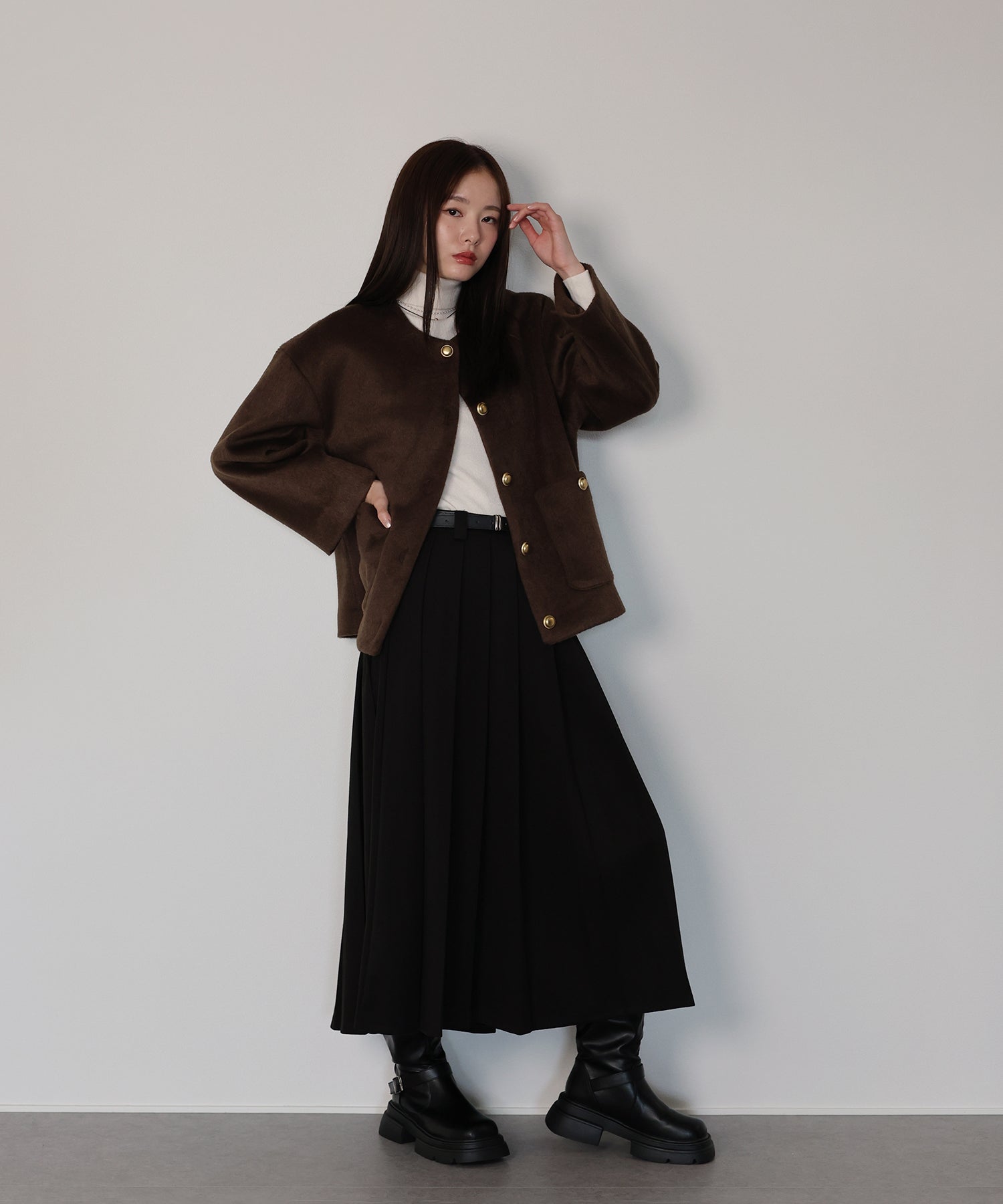 ?STYLING フィット感のあるトップスをインして、プリーツの縦ラインを強調したスタイルがおすすめ。 ニットやスウェットと合わせれば、抜け感のある大人カジュアルに。 シャツやジャケットとの組み合わせで、よりモードな雰囲気を楽しめます。 足元はブーツを合わせると季節感が引き立ち、スタイリングの完成度がぐっと上がります。