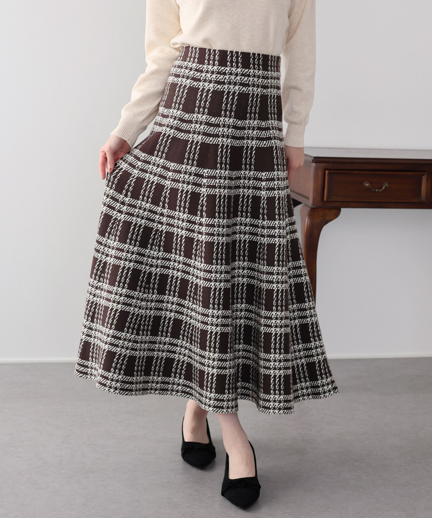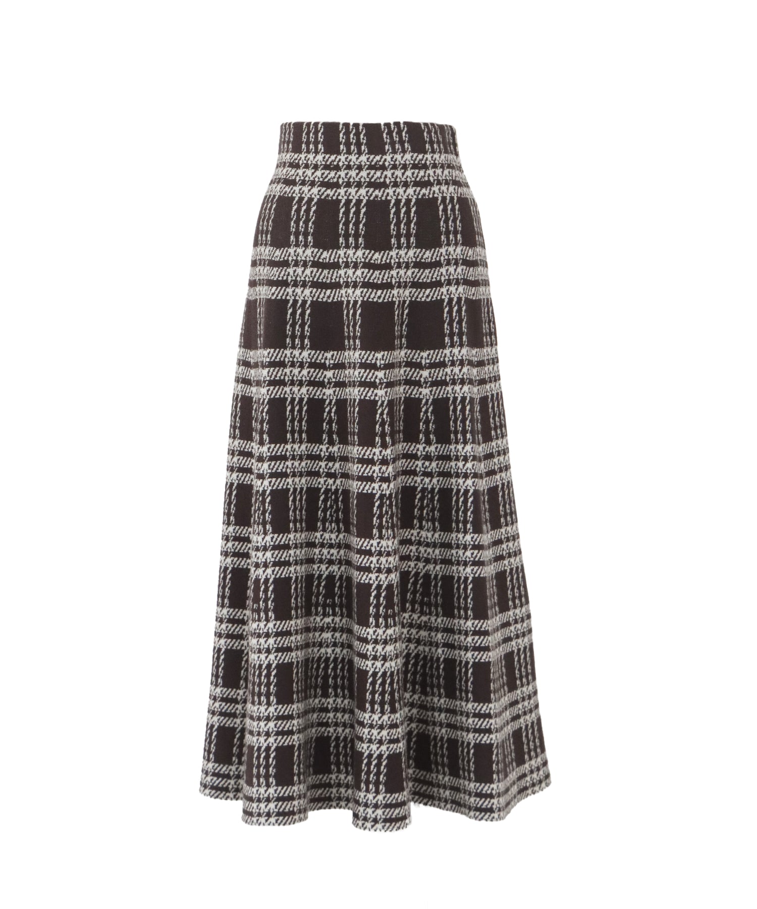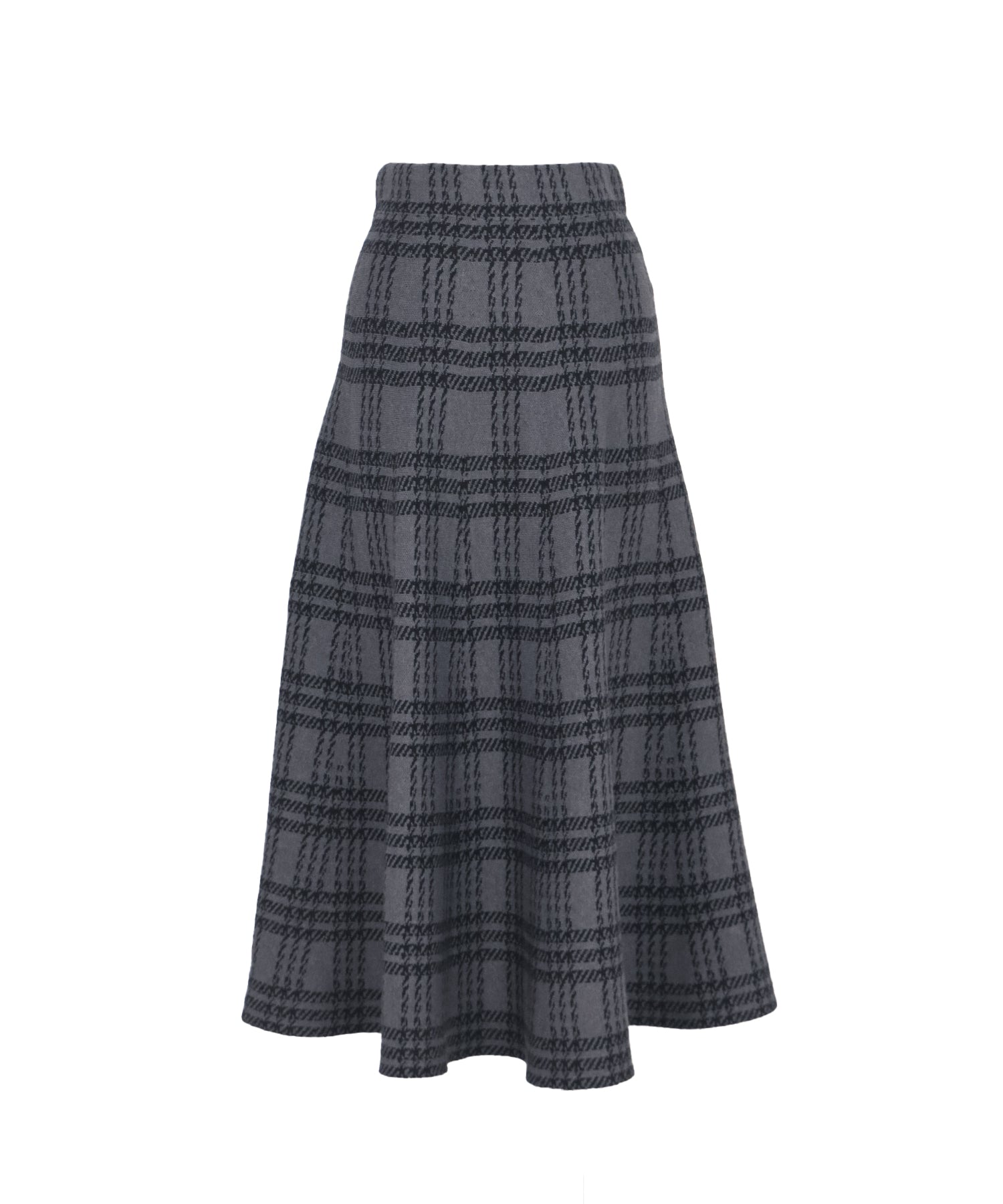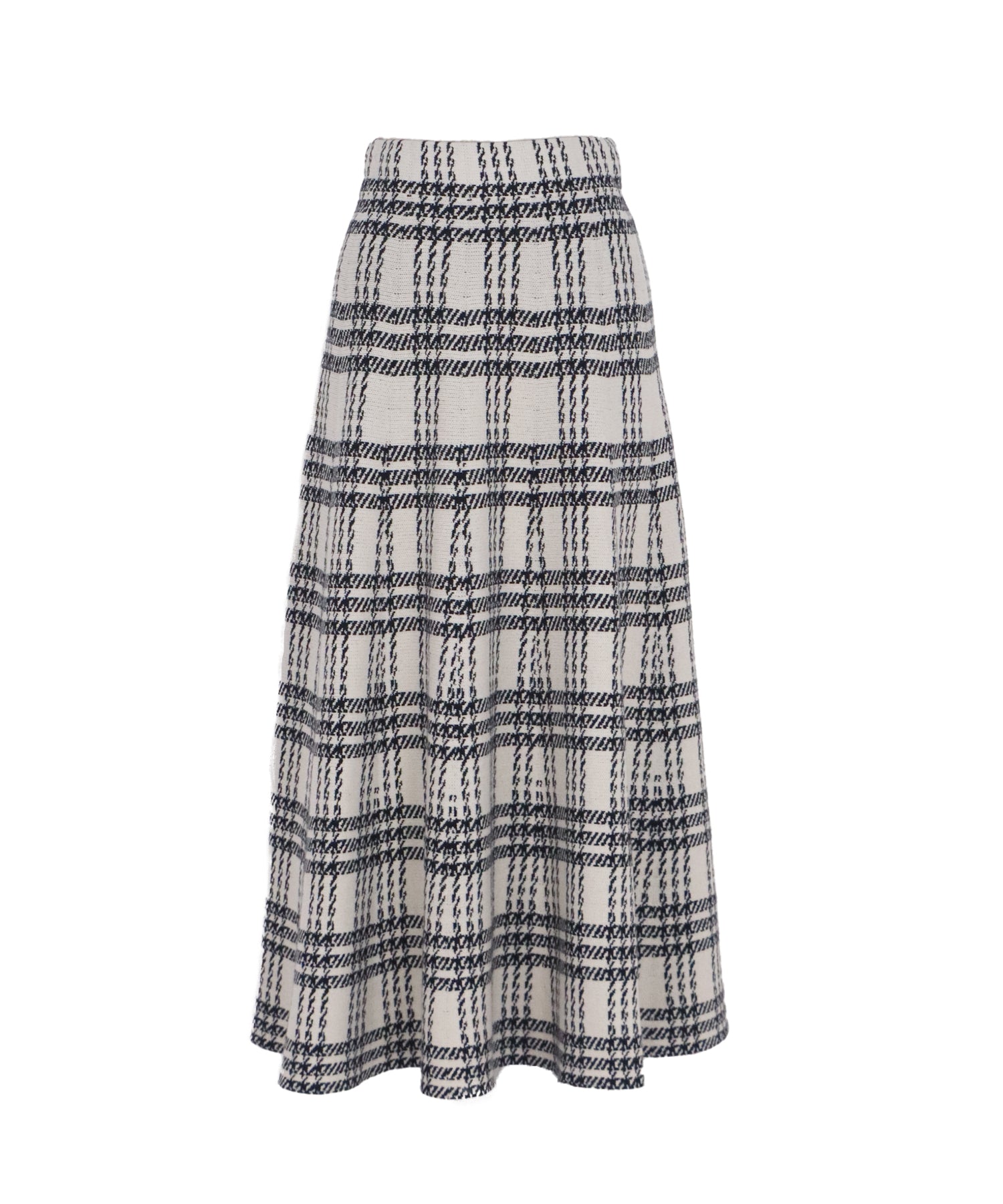 目を惹くチェック柄のニットジャガードスカート ?POINT フレアシルエットが上品な印象のフェミニンなニットスカート。 スタイル良く見えるように拘った、 裾に向かって広がって見えるような縦長のチェック柄を編み立てました。 ニット生地でウエストゴム入りなのでストレスフリーに着用でき、 厚みがある素材で、透けを気にせずに安心してお召しいただけます◎ シワが気になりづらいのも嬉しいポイントです。