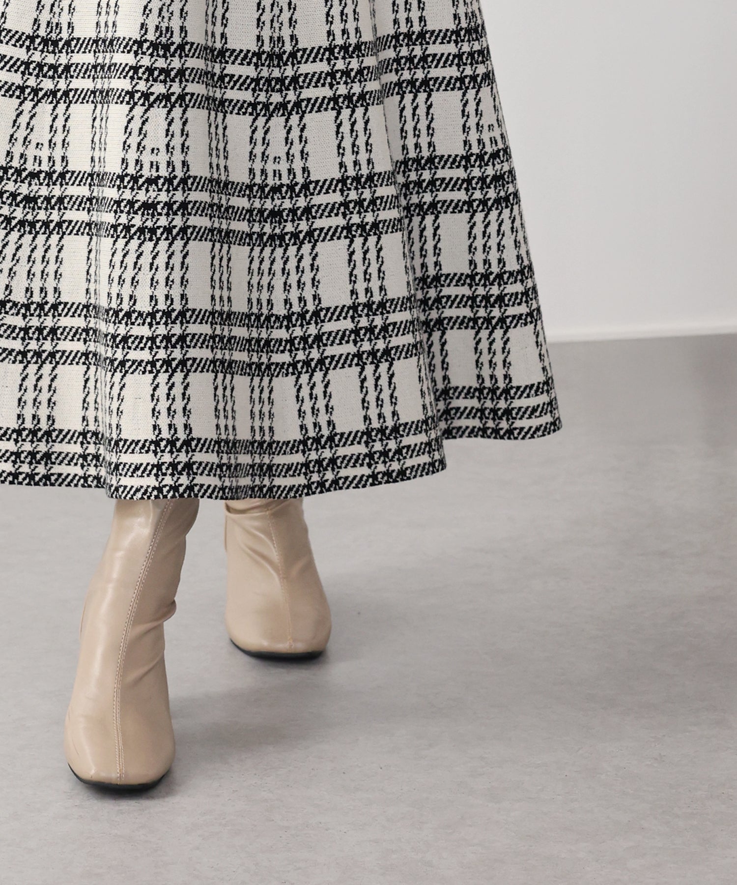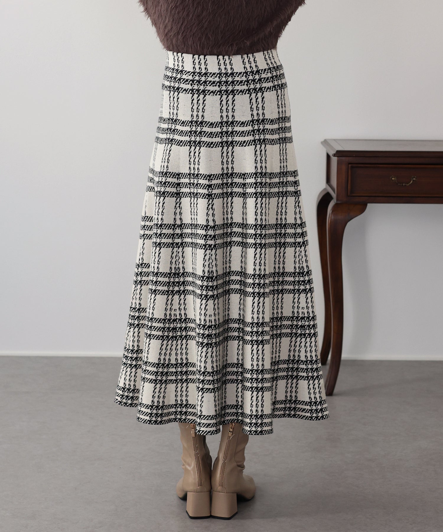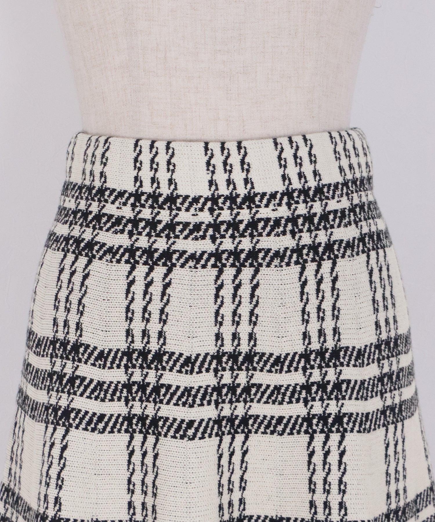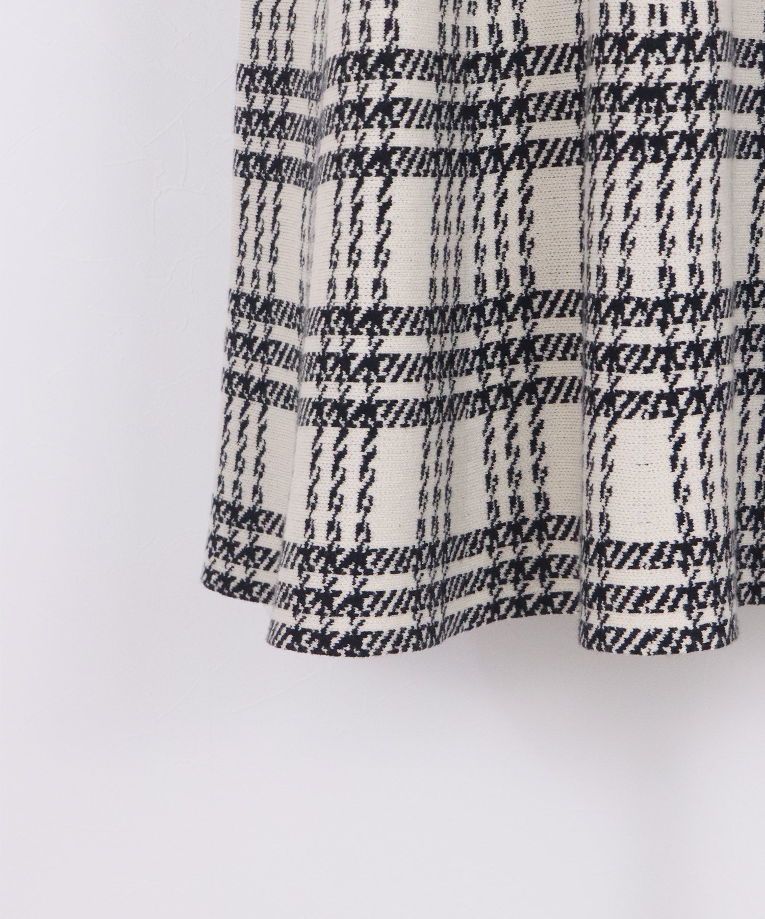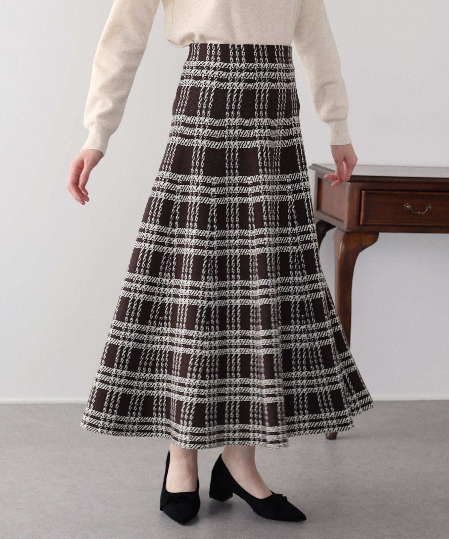 目を惹くチェック柄のニットジャガードスカート ?POINT フレアシルエットが上品な印象のフェミニンなニットスカート。 スタイル良く見えるように拘った、 裾に向かって広がって見えるような縦長のチェック柄を編み立てました。 ニット生地でウエストゴム入りなのでストレスフリーに着用でき、 厚みがある素材で、透けを気にせずに安心してお召しいただけます◎ シワが気になりづらいのも嬉しいポイントです。