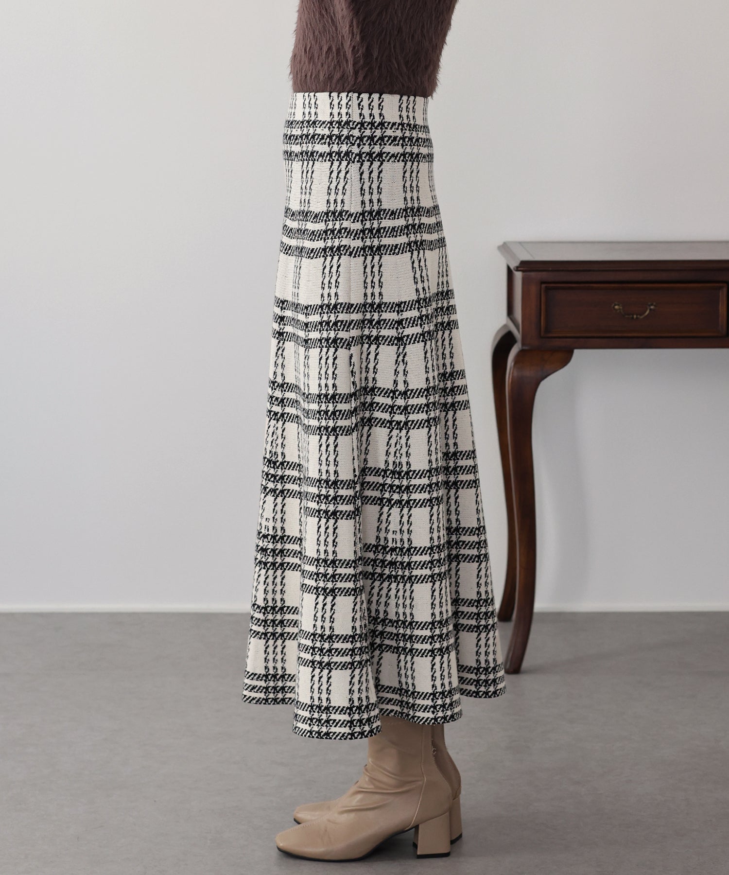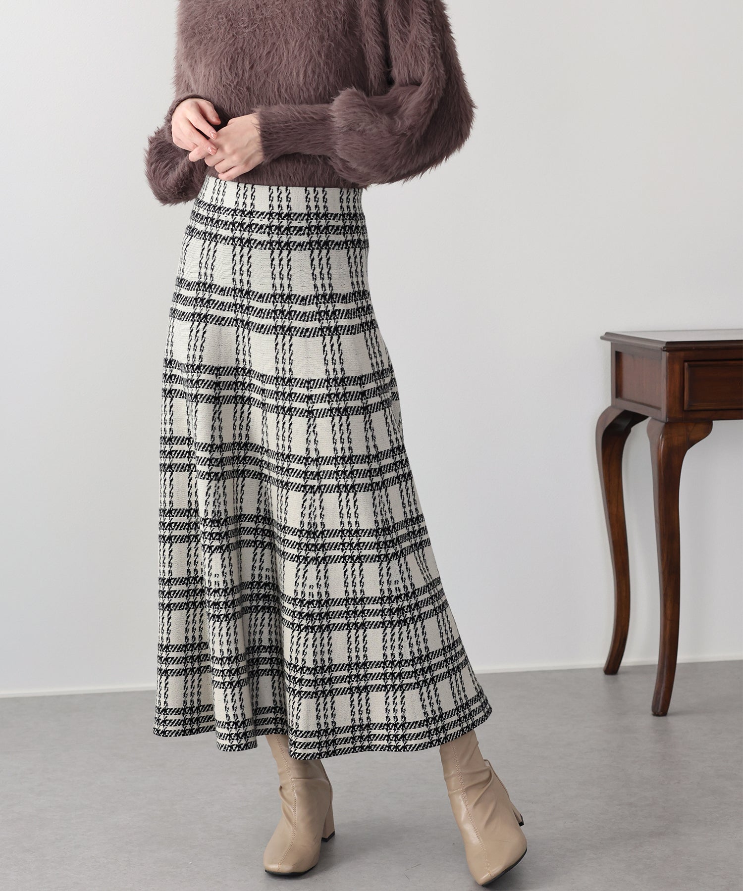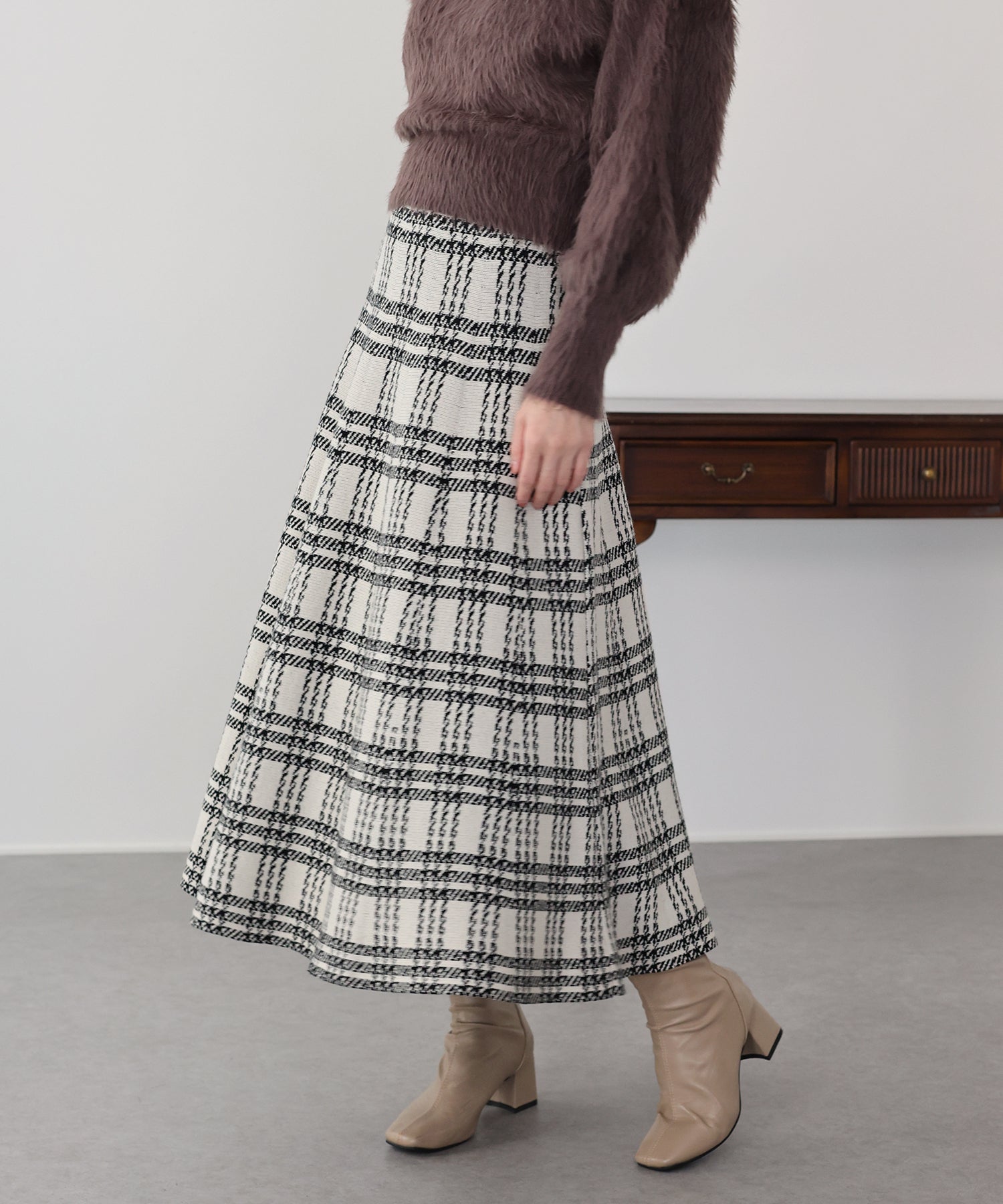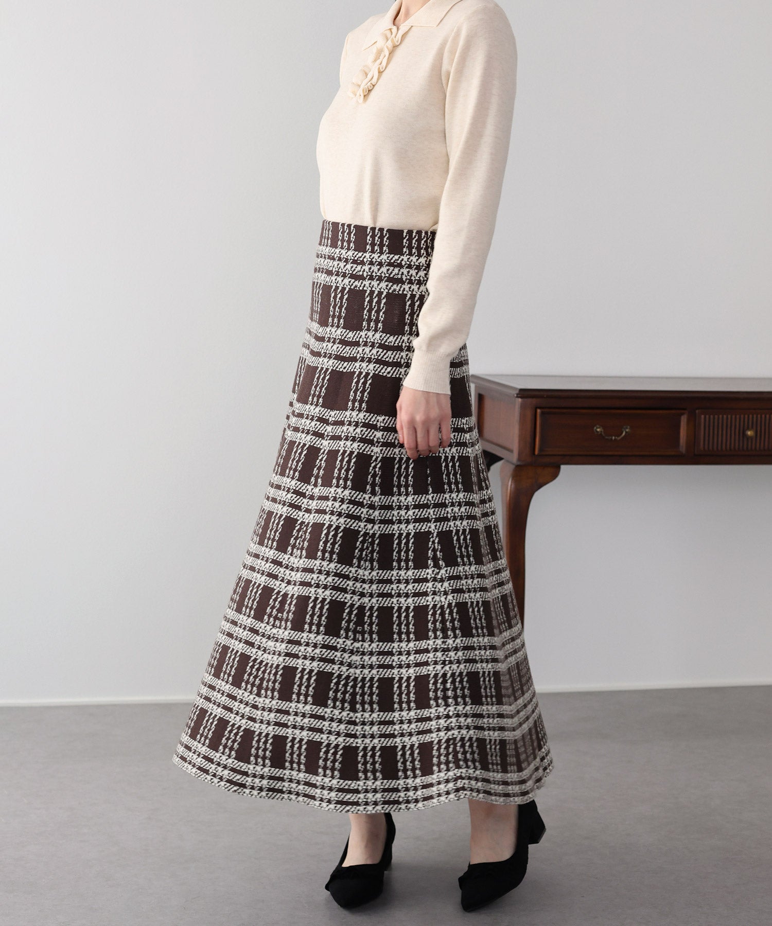 目を惹くチェック柄のニットジャガードスカート ?POINT フレアシルエットが上品な印象のフェミニンなニットスカート。 スタイル良く見えるように拘った、 裾に向かって広がって見えるような縦長のチェック柄を編み立てました。 ニット生地でウエストゴム入りなのでストレスフリーに着用でき、 厚みがある素材で、透けを気にせずに安心してお召しいただけます◎ シワが気になりづらいのも嬉しいポイントです。