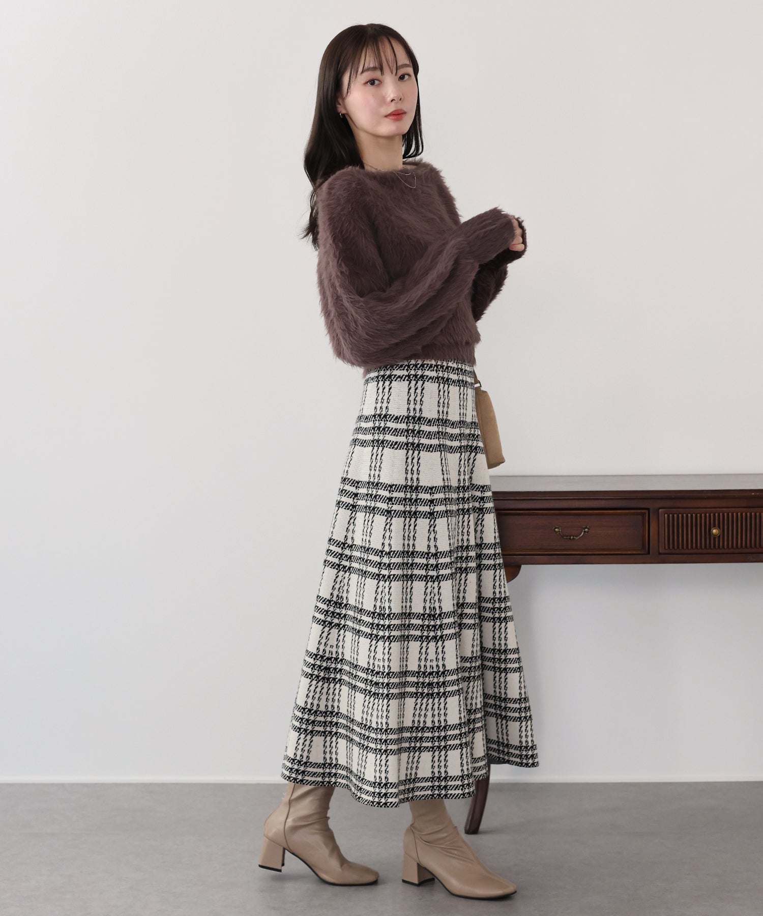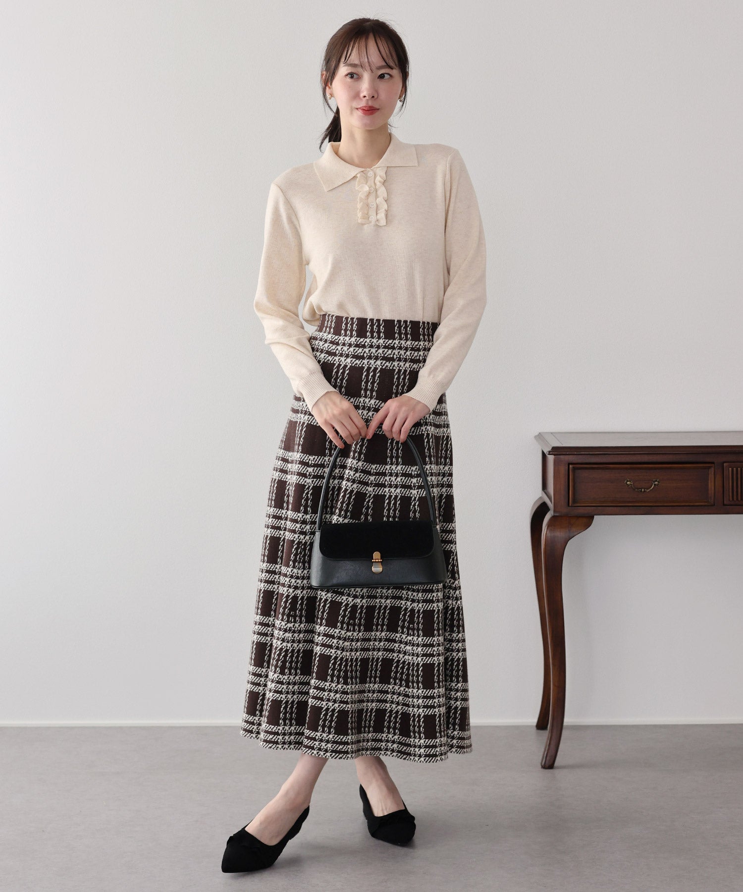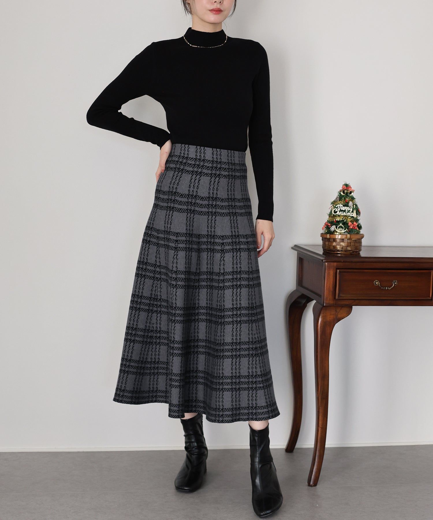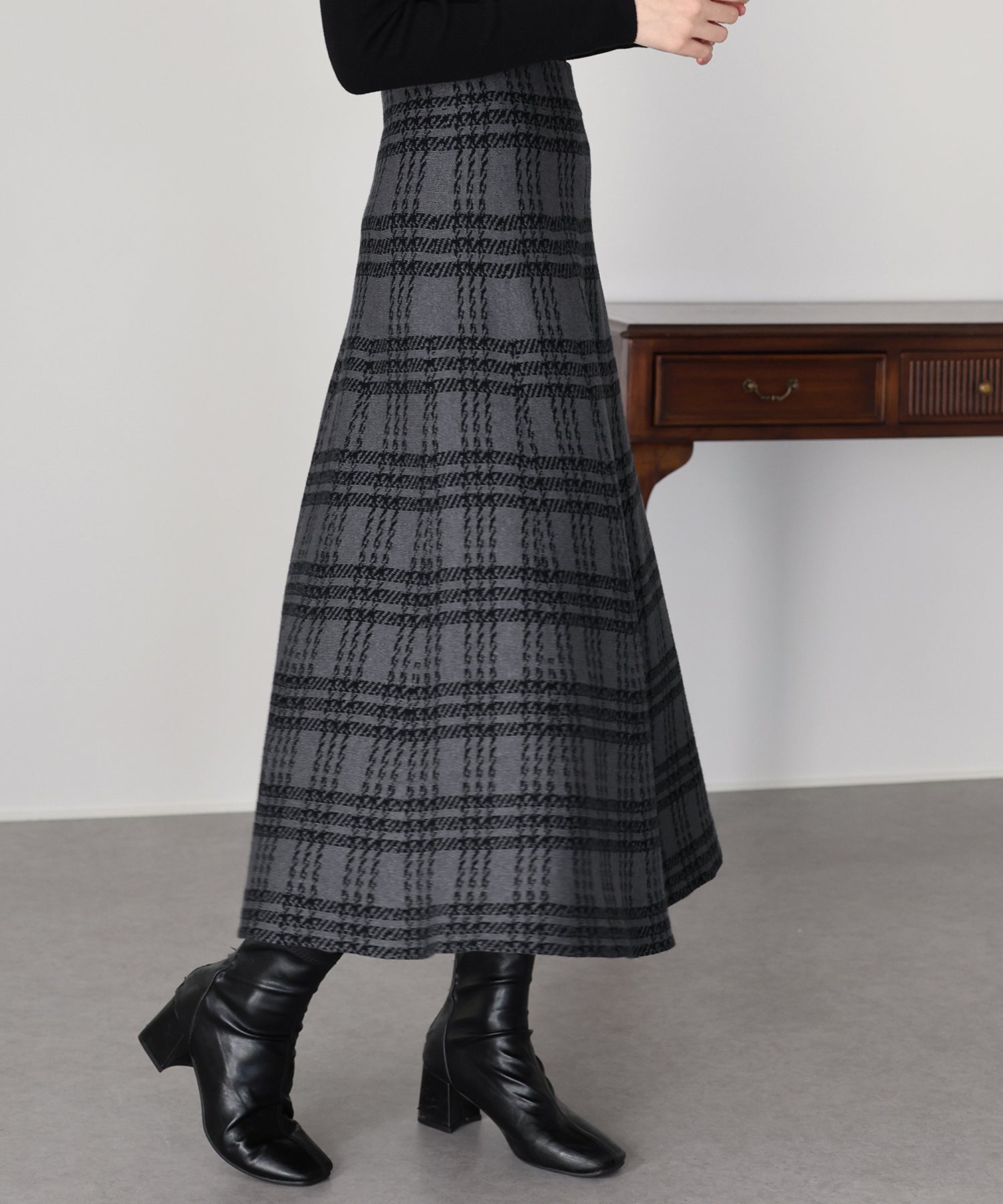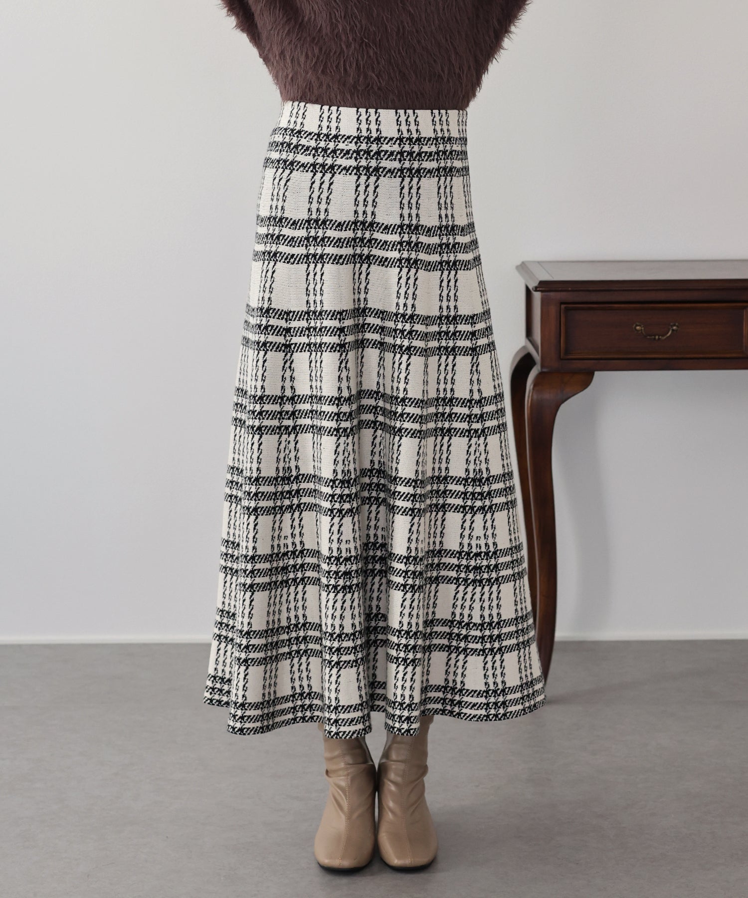 目を惹くチェック柄のニットジャガードスカート ?POINT フレアシルエットが上品な印象のフェミニンなニットスカート。 スタイル良く見えるように拘った、 裾に向かって広がって見えるような縦長のチェック柄を編み立てました。 ニット生地でウエストゴム入りなのでストレスフリーに着用でき、 厚みがある素材で、透けを気にせずに安心してお召しいただけます◎ シワが気になりづらいのも嬉しいポイントです。