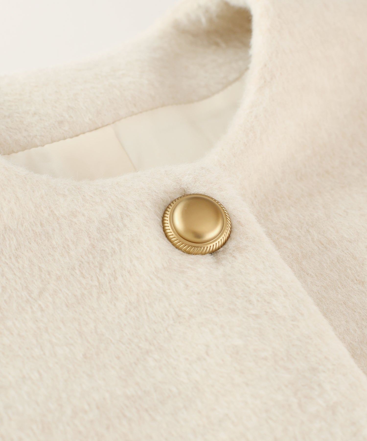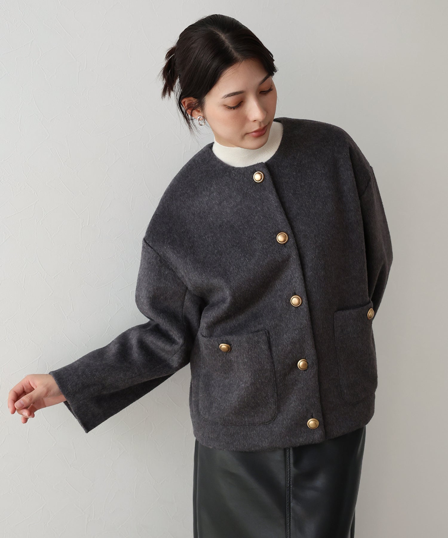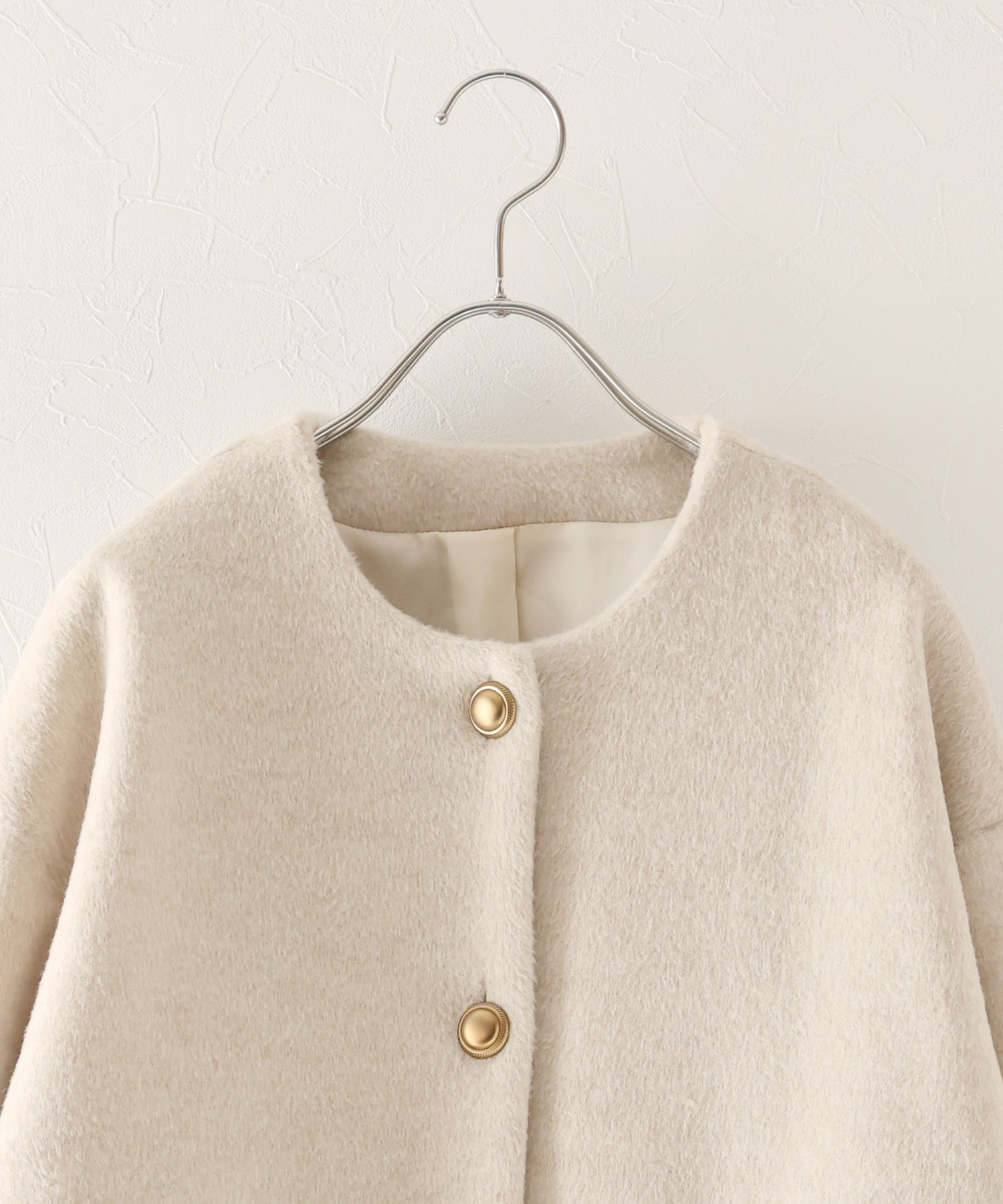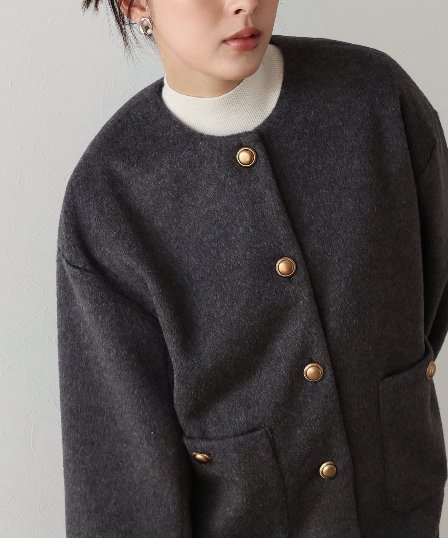 シーズンライクなノーカラーコート ?POINT どんなアイテムとも合わせやすいシンプルなデザインのノーカラーコート。 上品にもカジュアルにも似合うデザインで幅広い着こなしにマッチします。 金ボタンで大人の女性らしいポイントをプラス。 ウール混で温かく、ゆとりのある身頃なので自然に体型をカバーしてくれます。 クローゼットに一着は忍ばせておきたい、様々なシーンで活躍すること間違いなしのアイテムです。