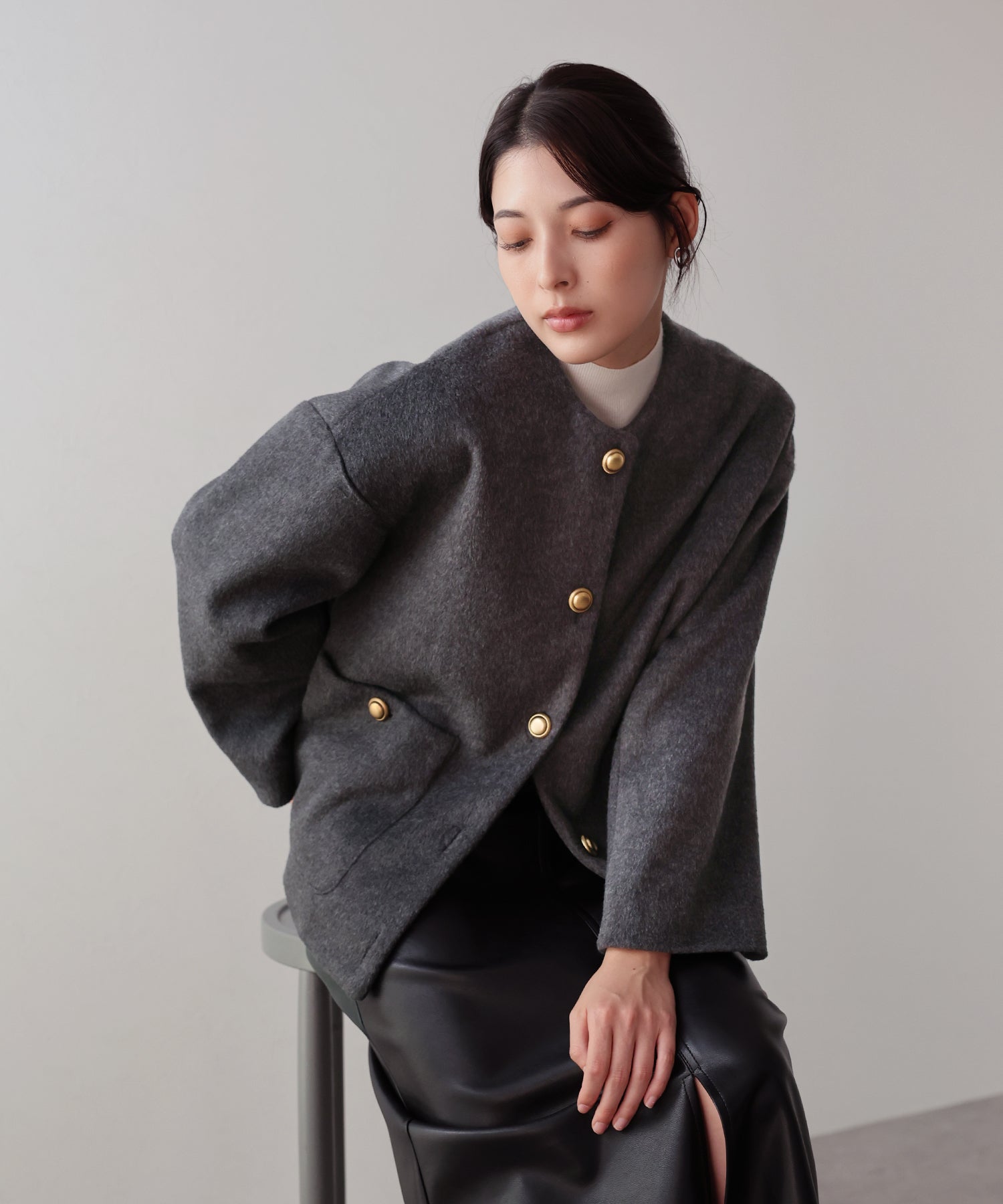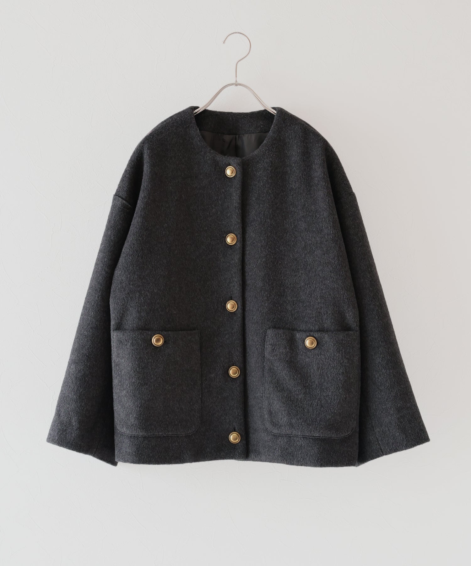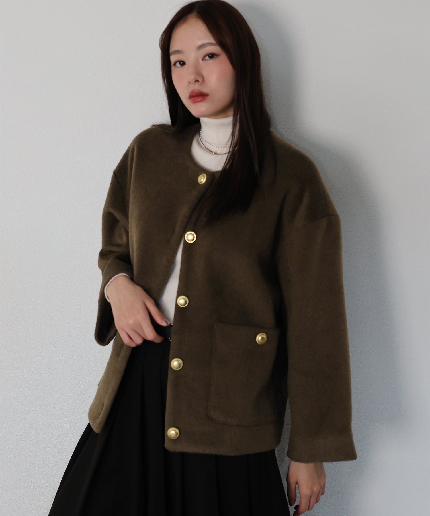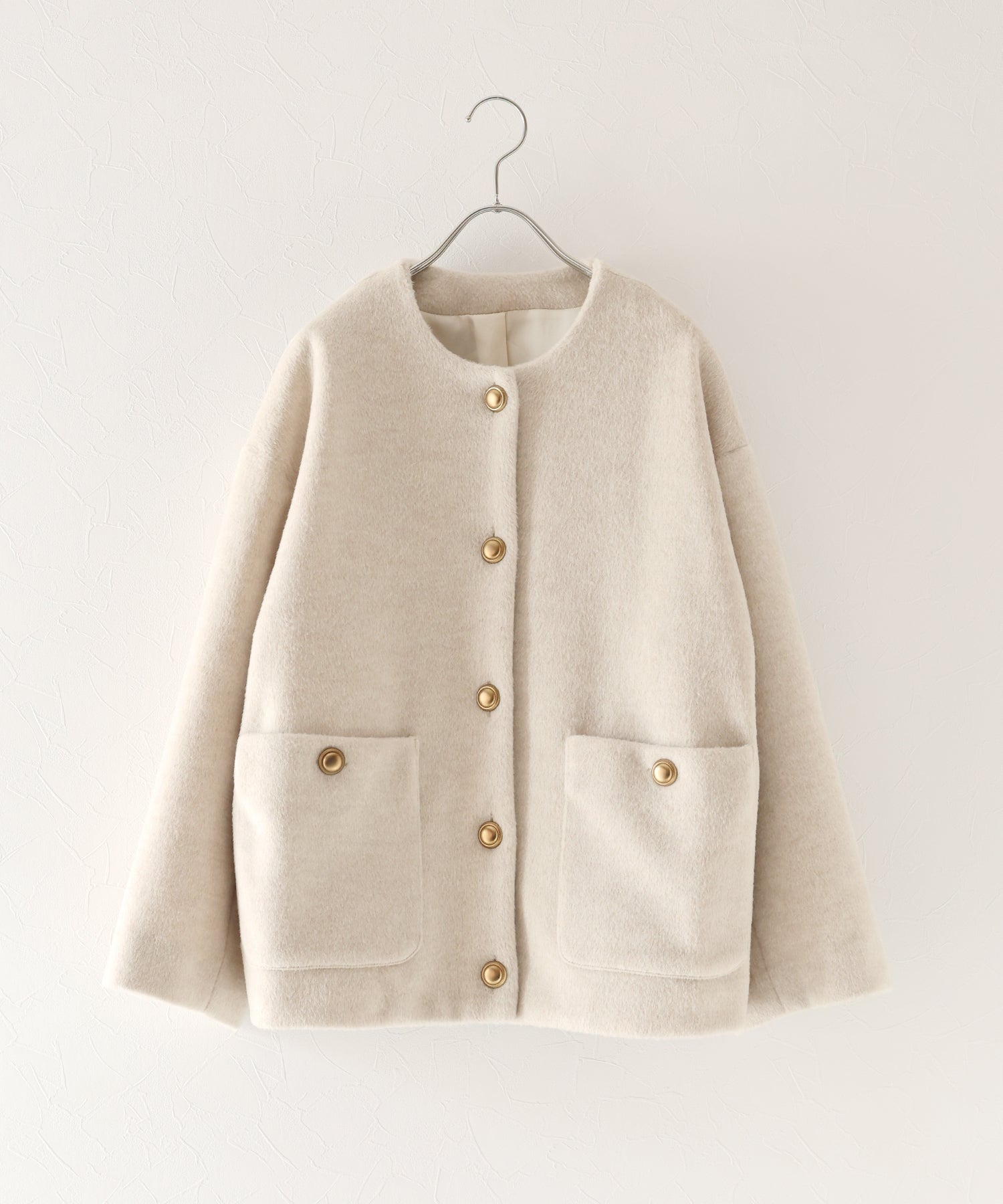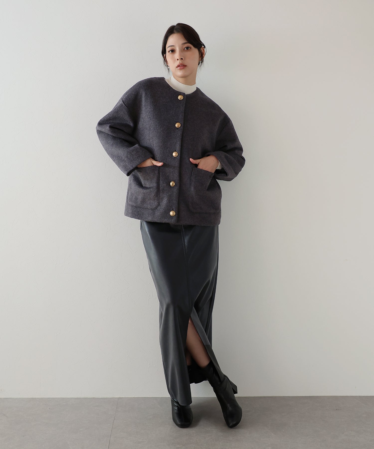シーズンライクなノーカラーコート ?POINT どんなアイテムとも合わせやすいシンプルなデザインのノーカラーコート。 上品にもカジュアルにも似合うデザインで幅広い着こなしにマッチします。 金ボタンで大人の女性らしいポイントをプラス。 ウール混で温かく、ゆとりのある身頃なので自然に体型をカバーしてくれます。 クローゼットに一着は忍ばせておきたい、様々なシーンで活躍すること間違いなしのアイテムです。