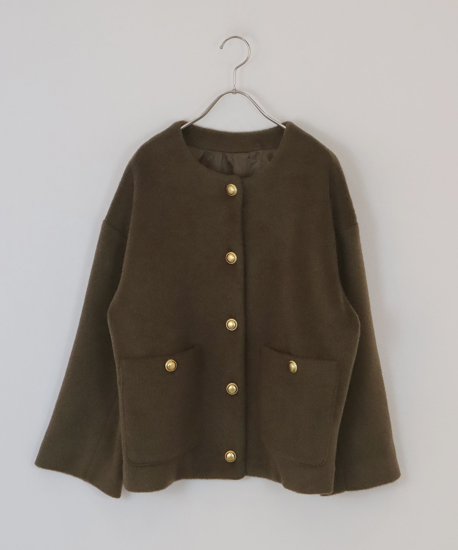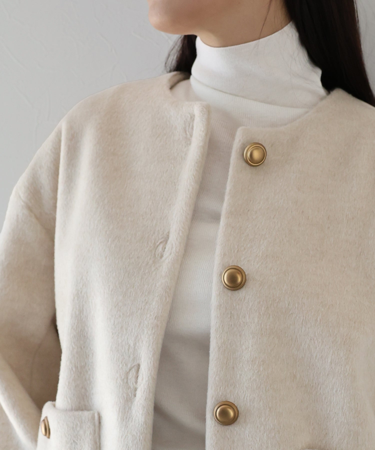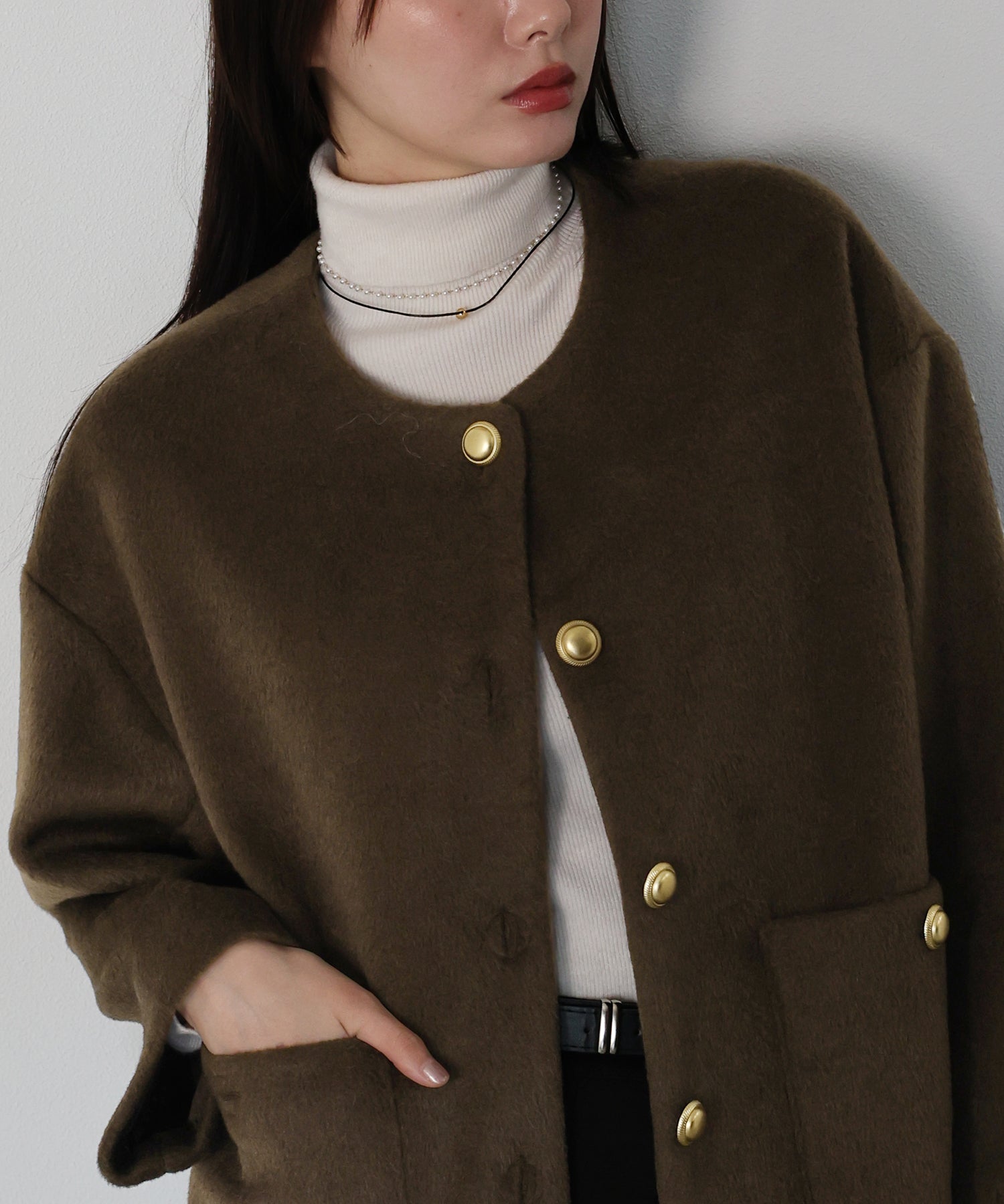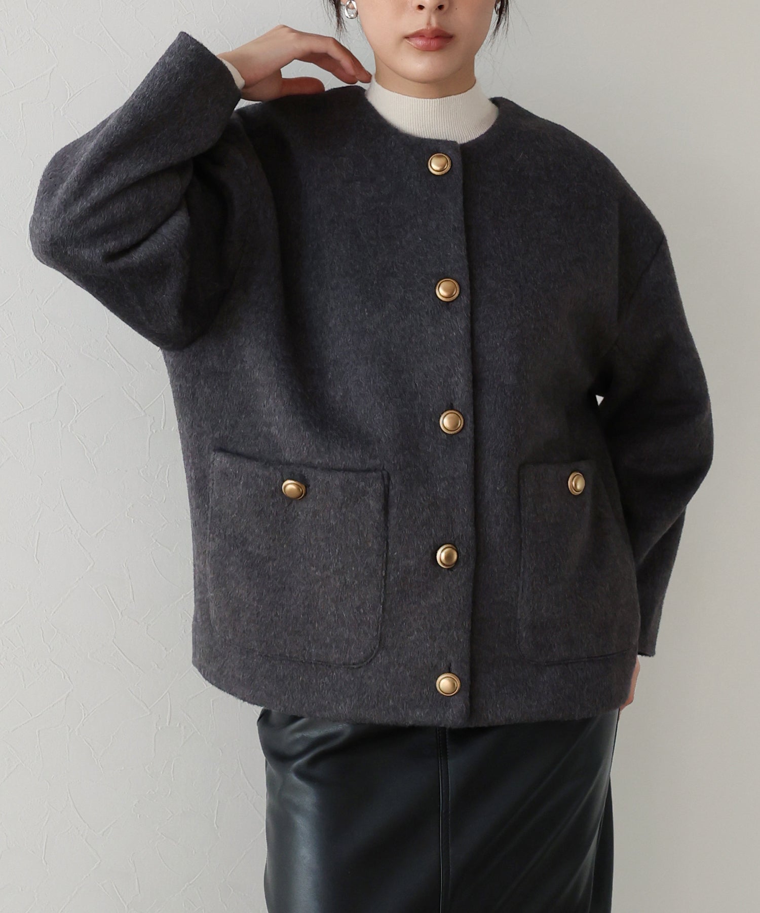 シーズンライクなノーカラーコート ?POINT どんなアイテムとも合わせやすいシンプルなデザインのノーカラーコート。 上品にもカジュアルにも似合うデザインで幅広い着こなしにマッチします。 金ボタンで大人の女性らしいポイントをプラス。 ウール混で温かく、ゆとりのある身頃なので自然に体型をカバーしてくれます。 クローゼットに一着は忍ばせておきたい、様々なシーンで活躍すること間違いなしのアイテムです。