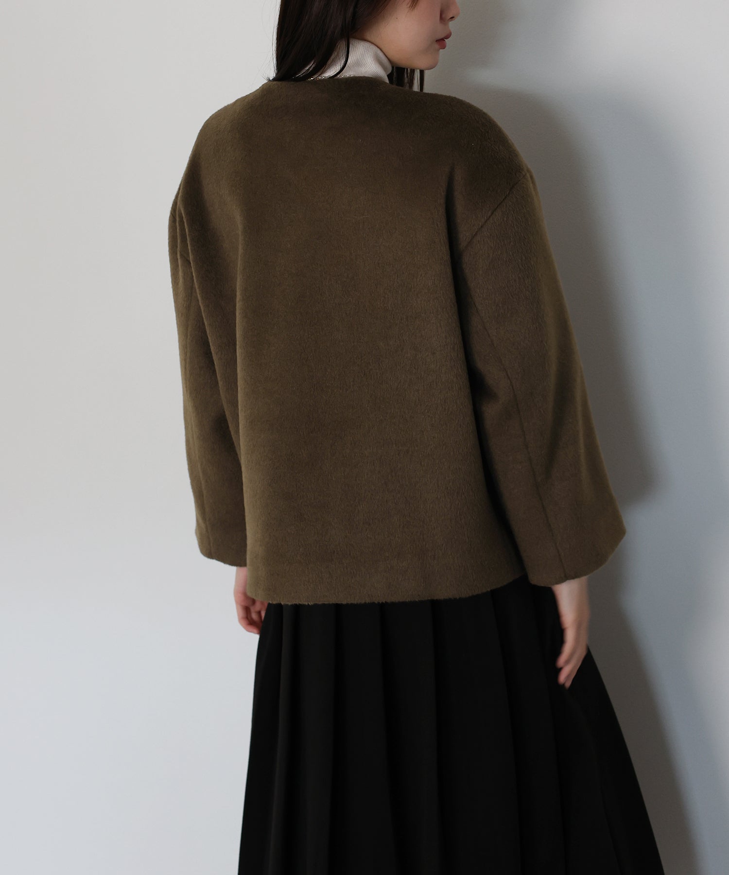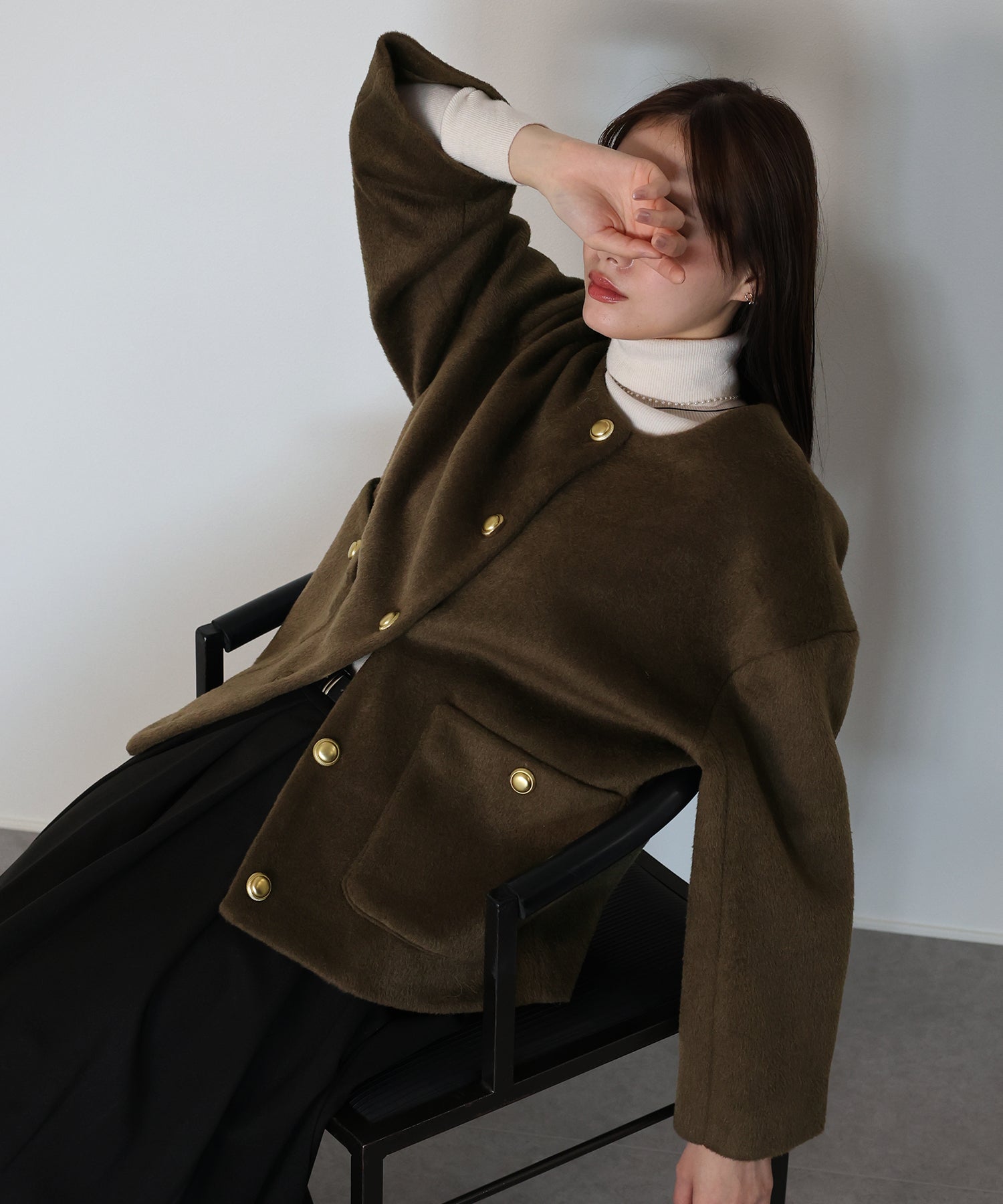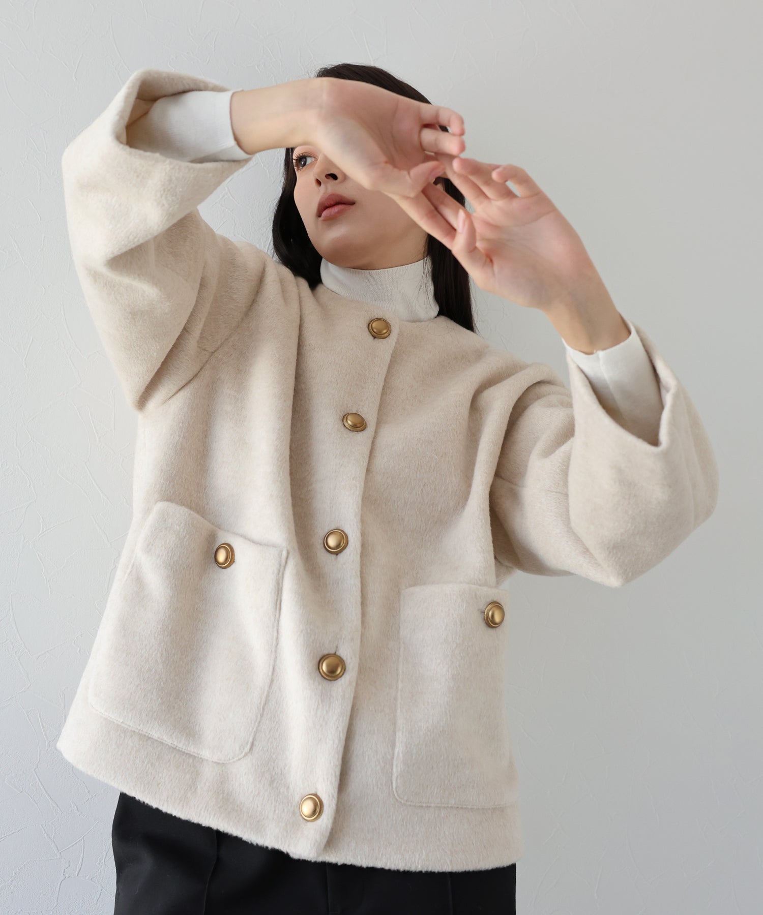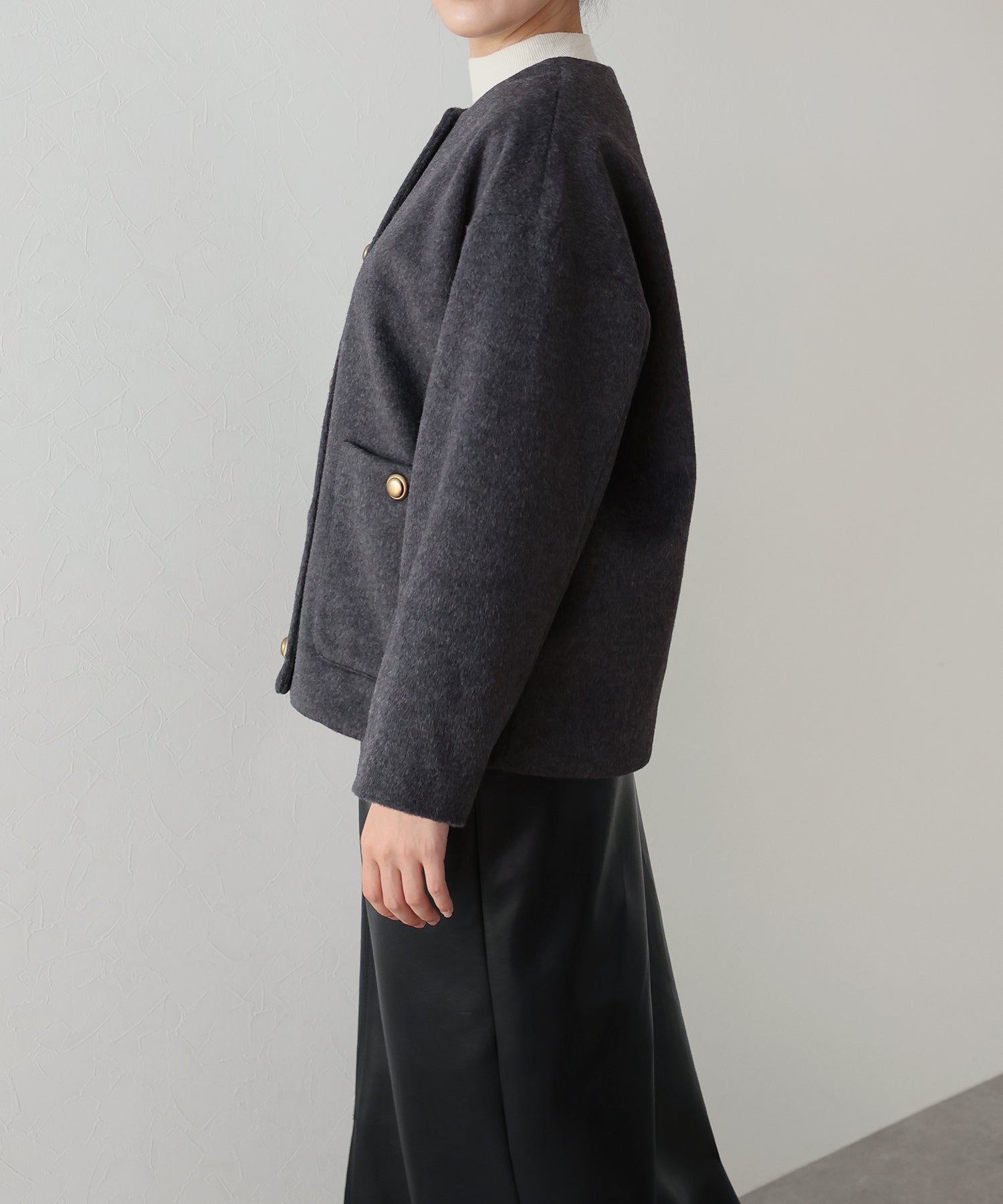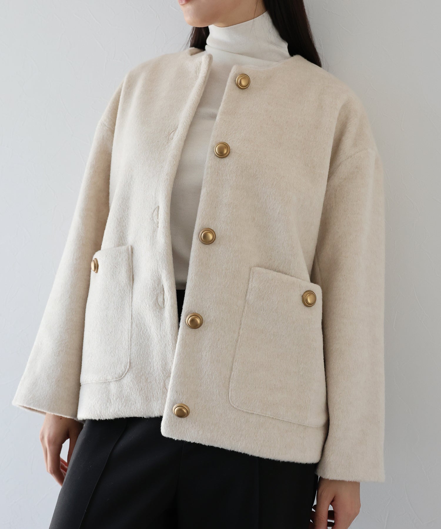 シーズンライクなノーカラーコート ?POINT どんなアイテムとも合わせやすいシンプルなデザインのノーカラーコート。 上品にもカジュアルにも似合うデザインで幅広い着こなしにマッチします。 金ボタンで大人の女性らしいポイントをプラス。 ウール混で温かく、ゆとりのある身頃なので自然に体型をカバーしてくれます。 クローゼットに一着は忍ばせておきたい、様々なシーンで活躍すること間違いなしのアイテムです。