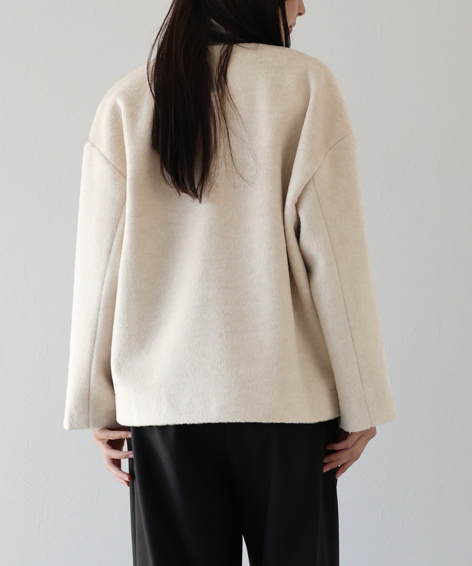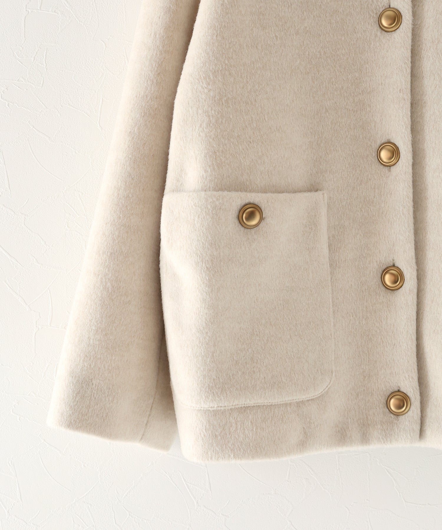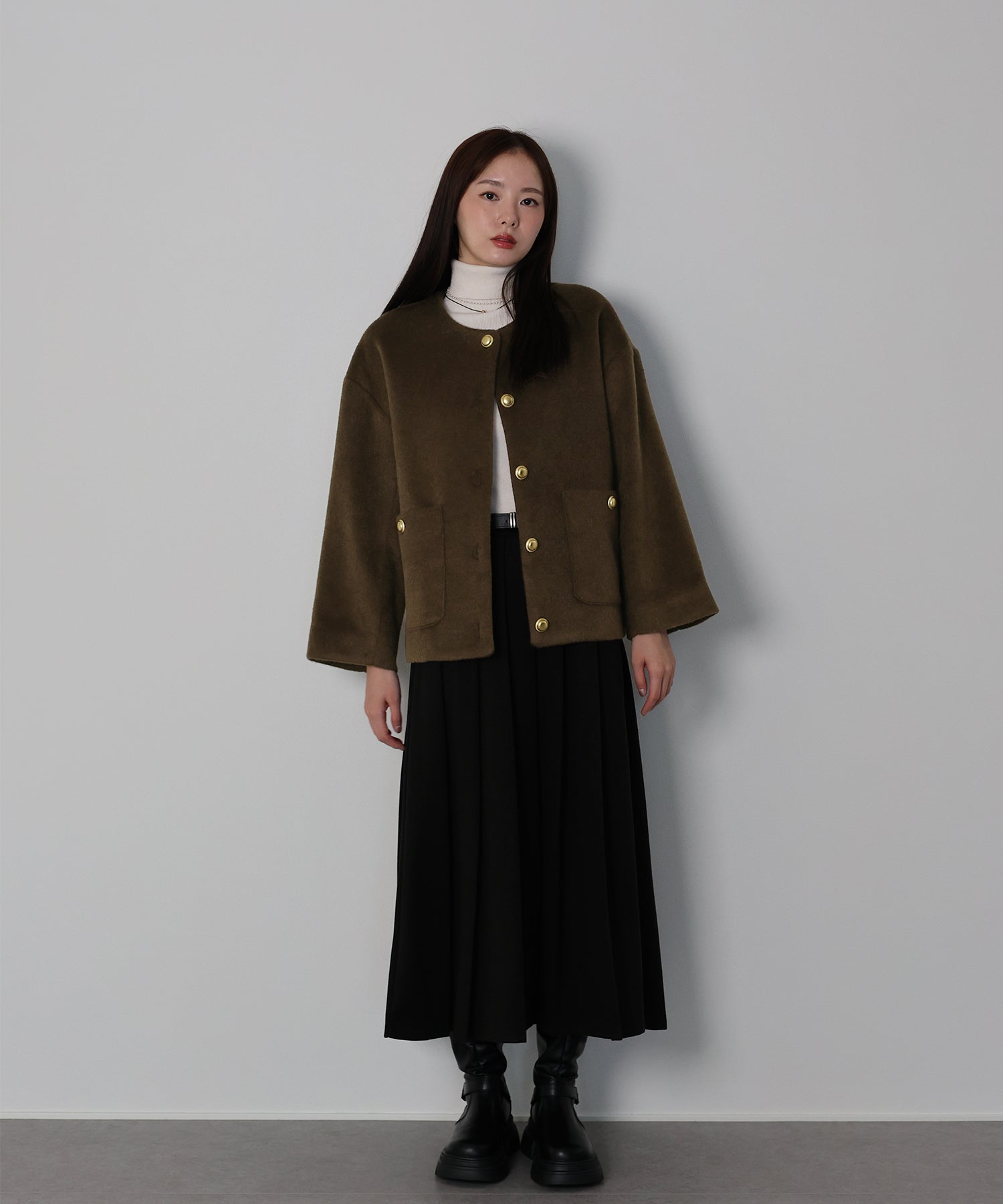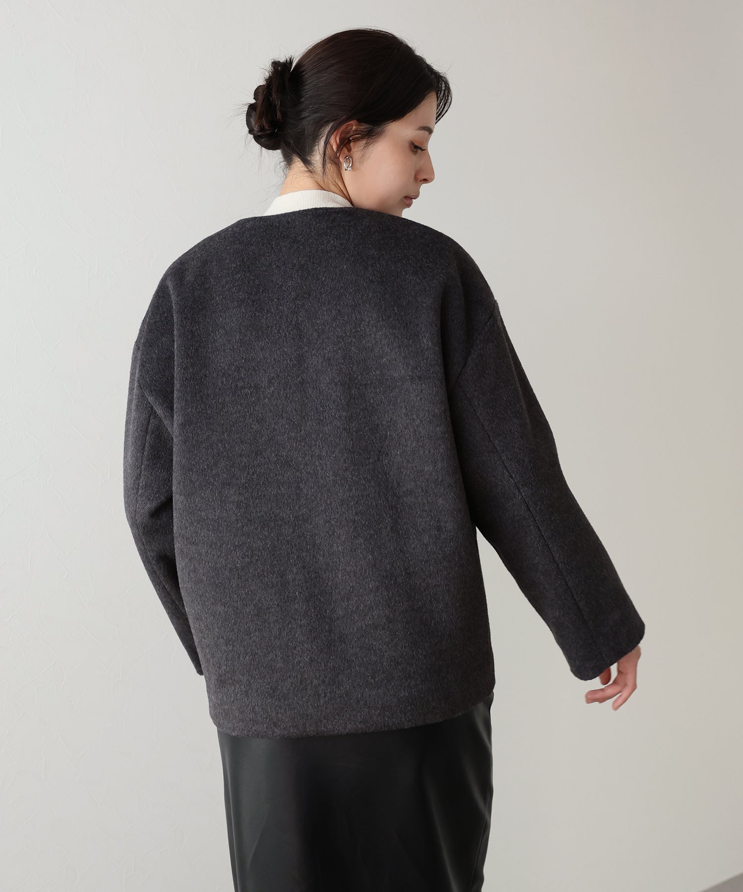 シーズンライクなノーカラーコート ?POINT どんなアイテムとも合わせやすいシンプルなデザインのノーカラーコート。 上品にもカジュアルにも似合うデザインで幅広い着こなしにマッチします。 金ボタンで大人の女性らしいポイントをプラス。 ウール混で温かく、ゆとりのある身頃なので自然に体型をカバーしてくれます。 クローゼットに一着は忍ばせておきたい、様々なシーンで活躍すること間違いなしのアイテムです。