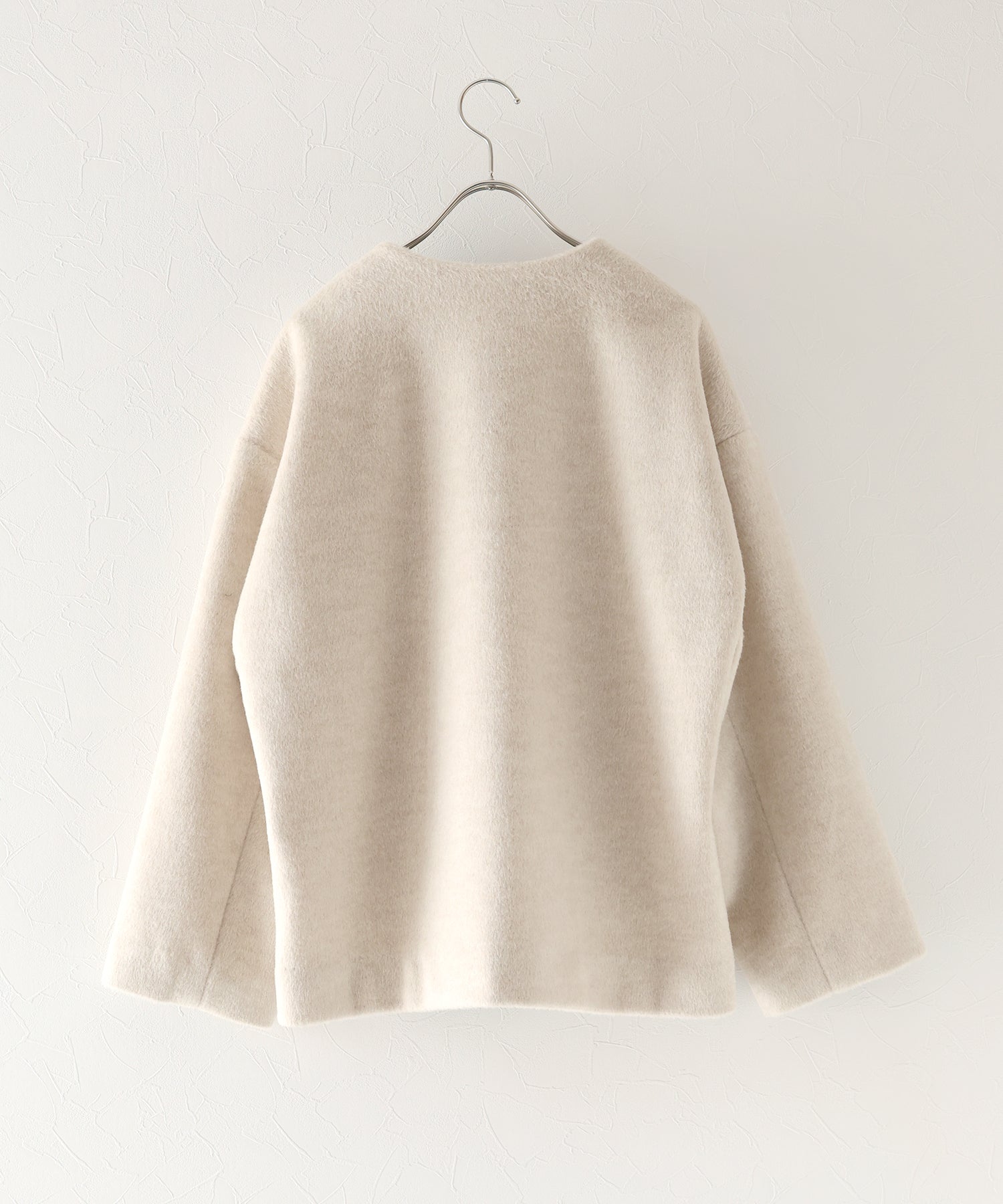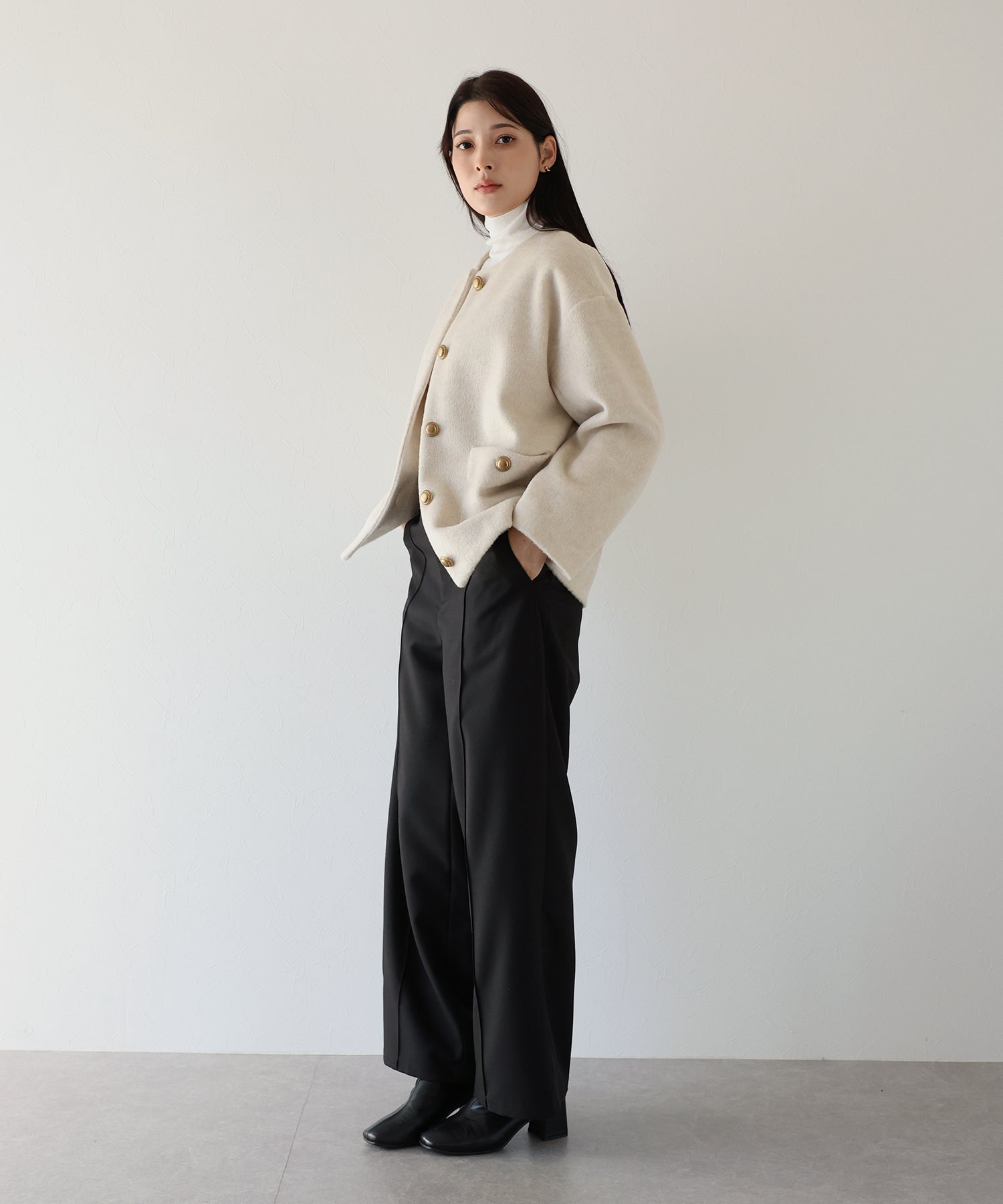 ?STYLING いつものカジュアルなデニムに羽織るだけでおしゃれさがぐっと上がり、 フェミニンなスカートなどのきれいめコーデにもさっと羽織るだけでモードで品あふれる一着。 シャツやボウタイブラウスと綺麗めなスラックスで、入学式や卒園式のオケージョン、セレモニーシーンの服装にも◎