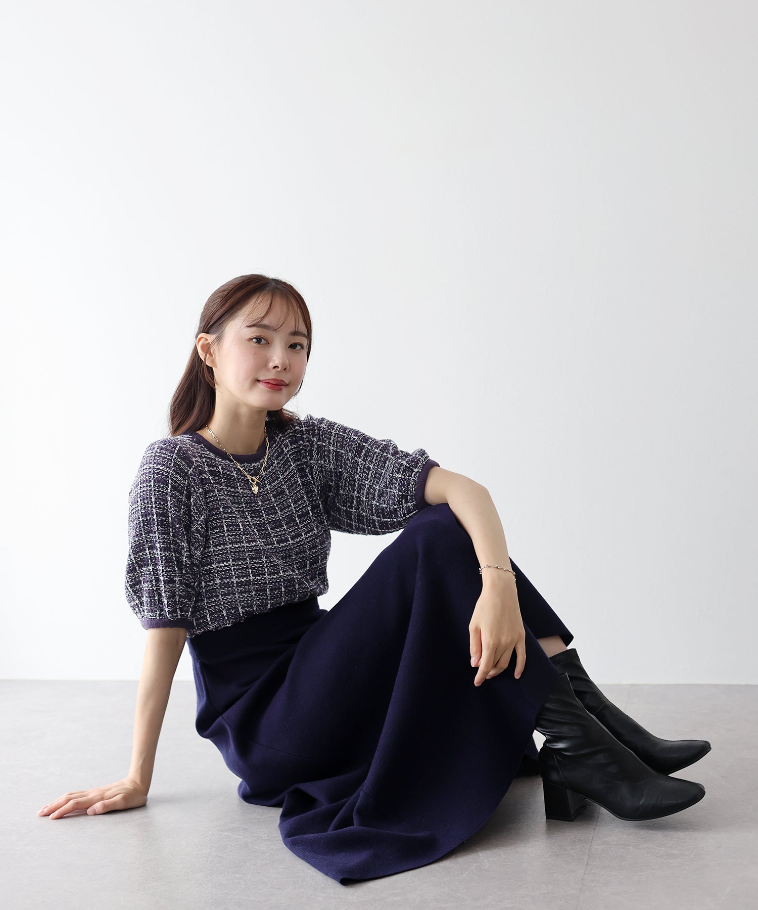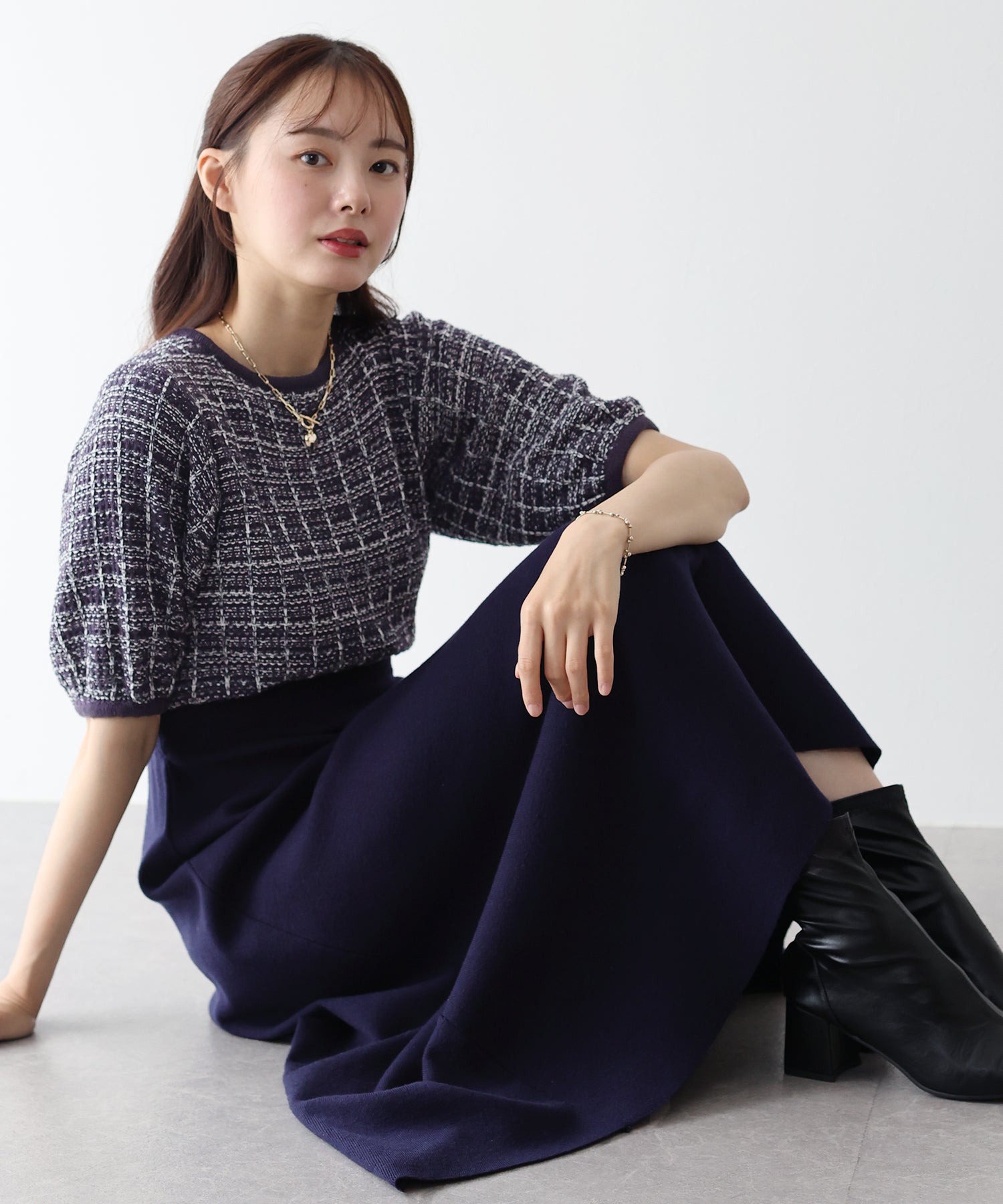 ?STYLING スタイリングの主役になってくれること間違いなしのアイテム。 普段使いはもちろんですが、ラメ混のツイード風ニットで上品なムードで 着こなせるのでちょっとしたお呼ばれスタイルにもお使いいただけます! ヒールサンダルやパンプスを合わせるときれいめなコーデに◎