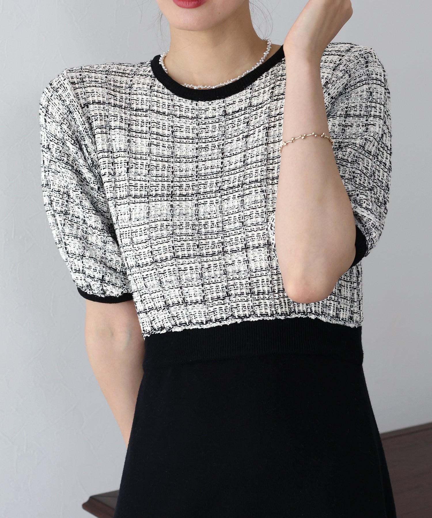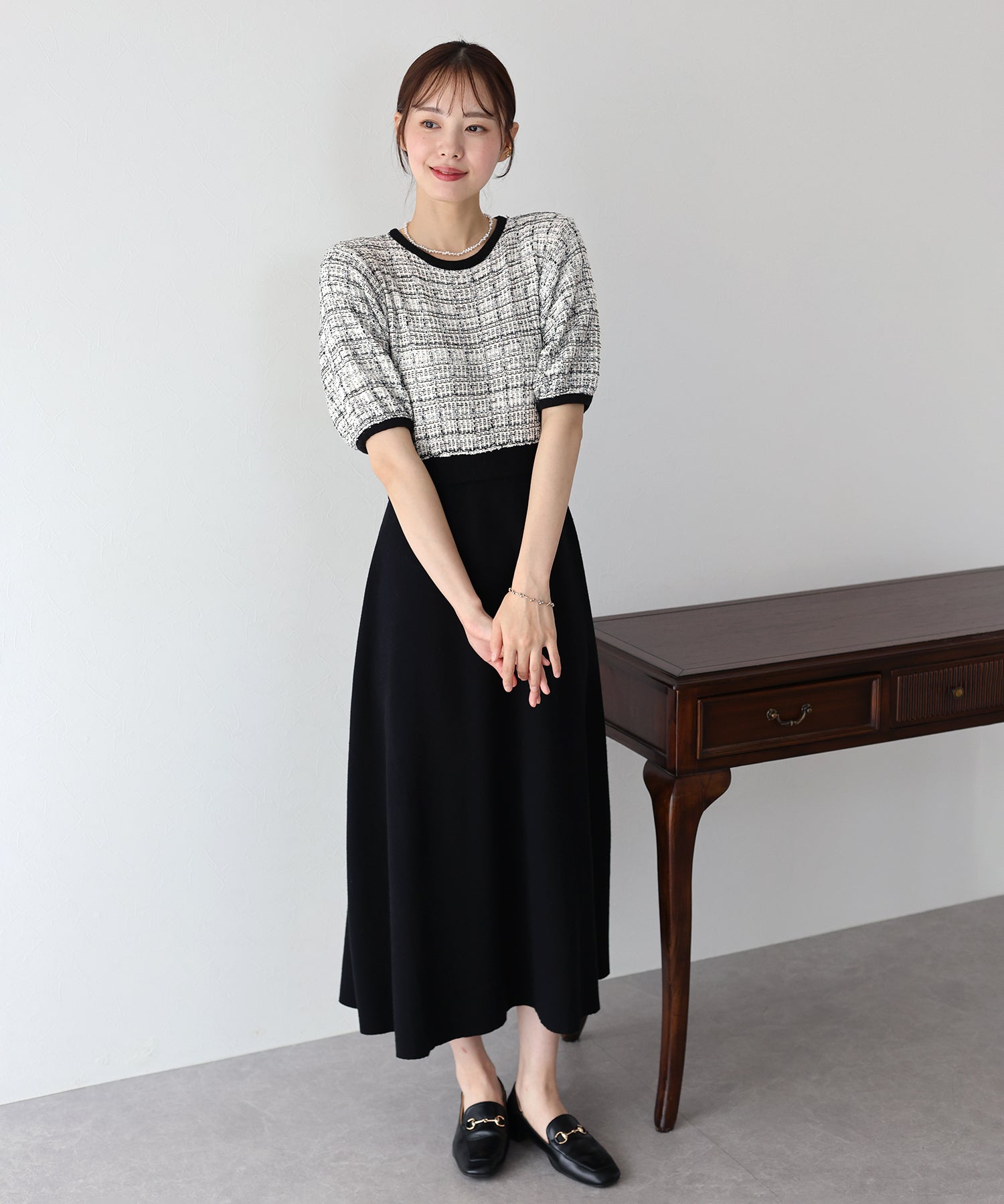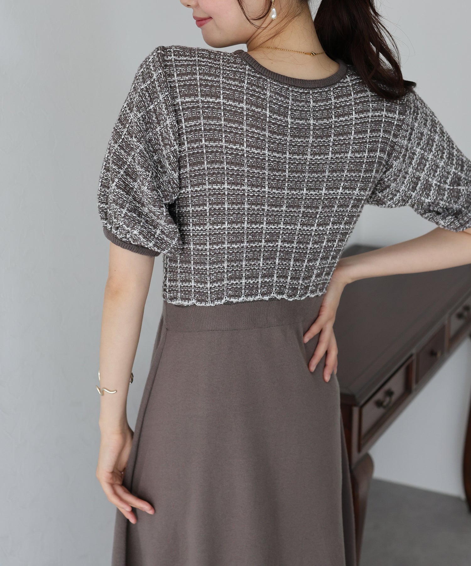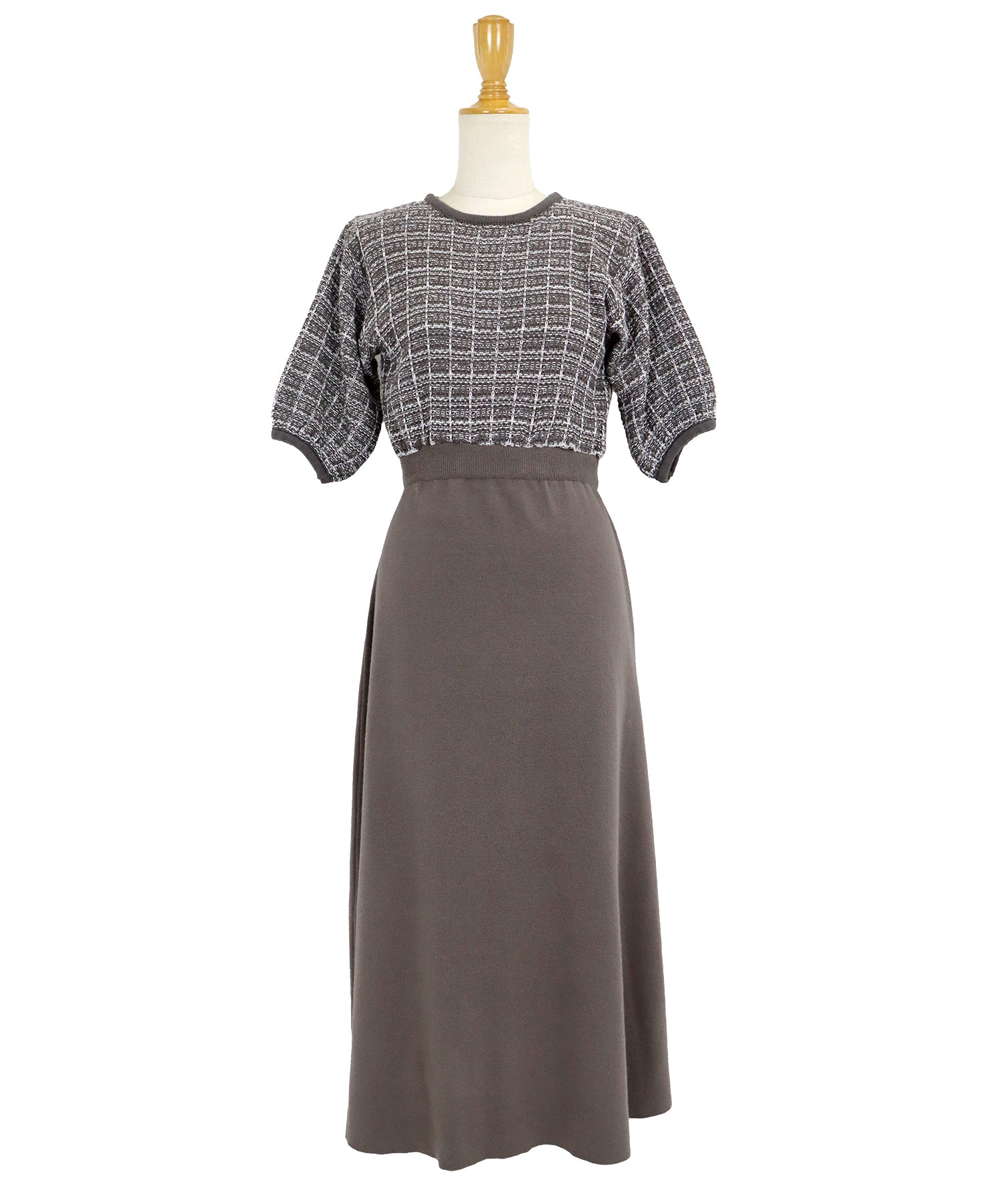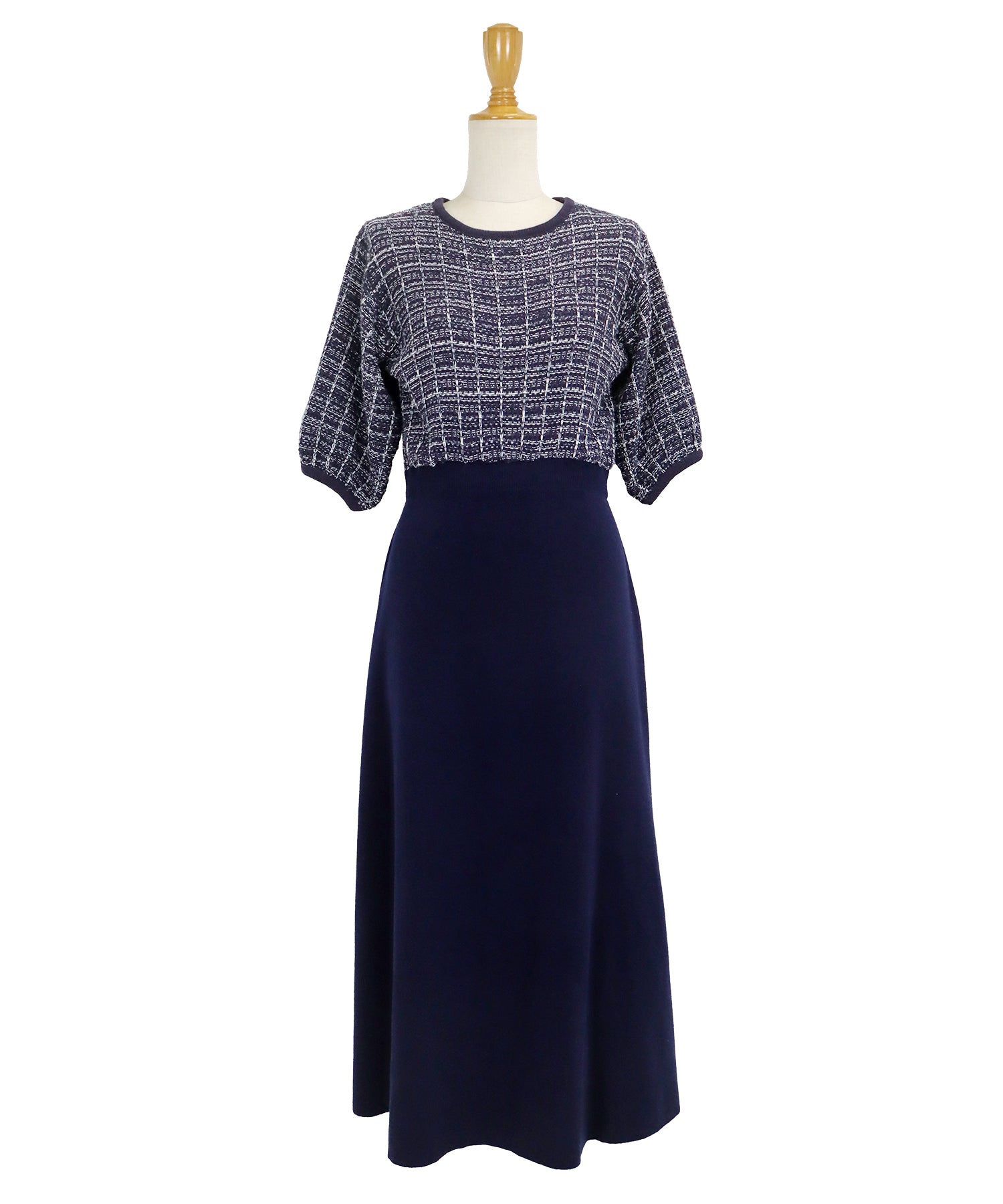 | 生地 | 身頃部分 ツイード風ニット素材 スカート部分 滑らかなニット素材 |