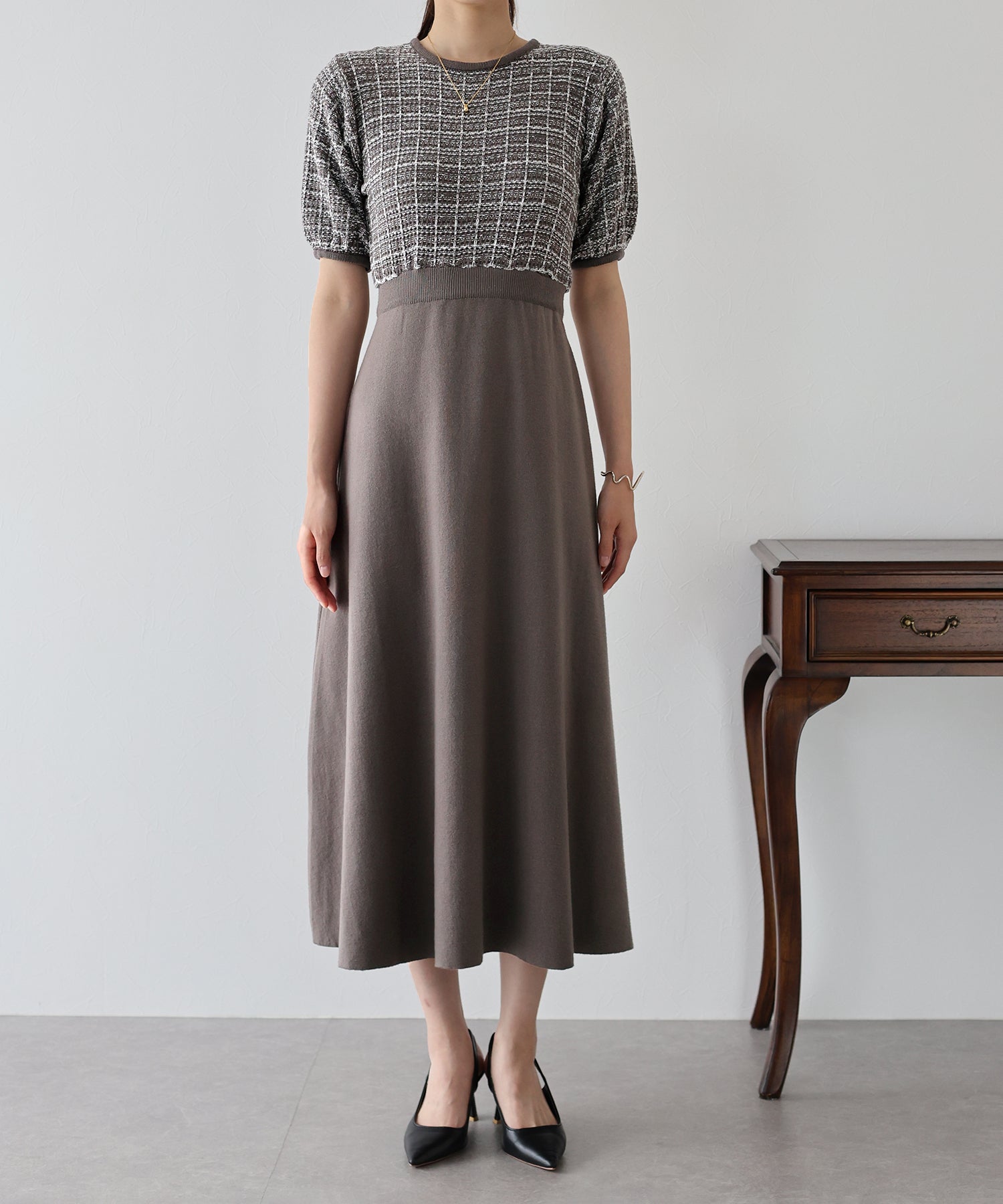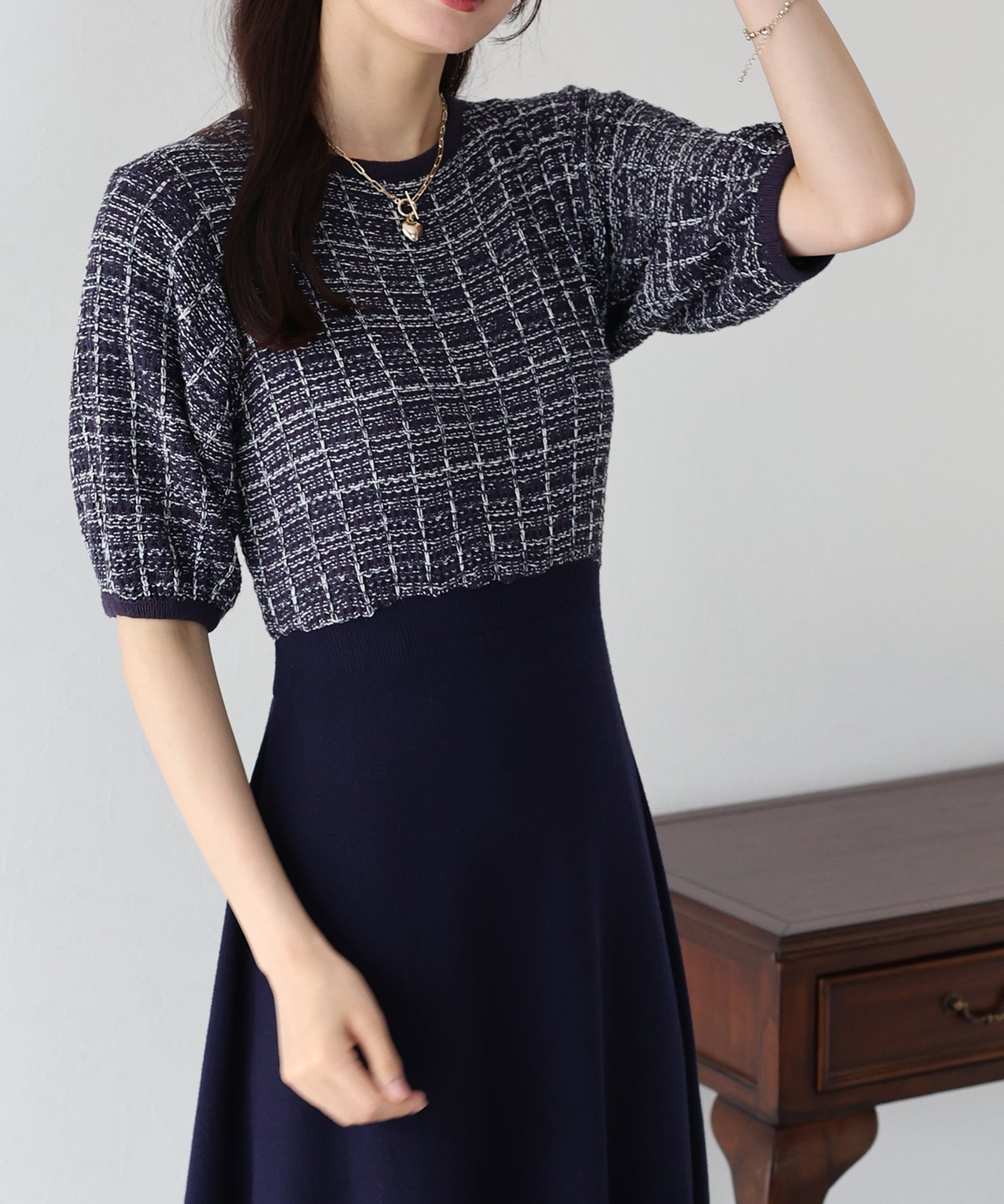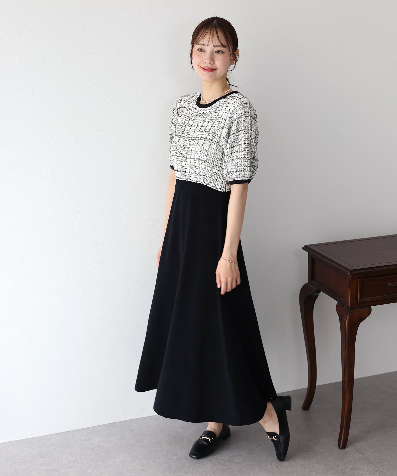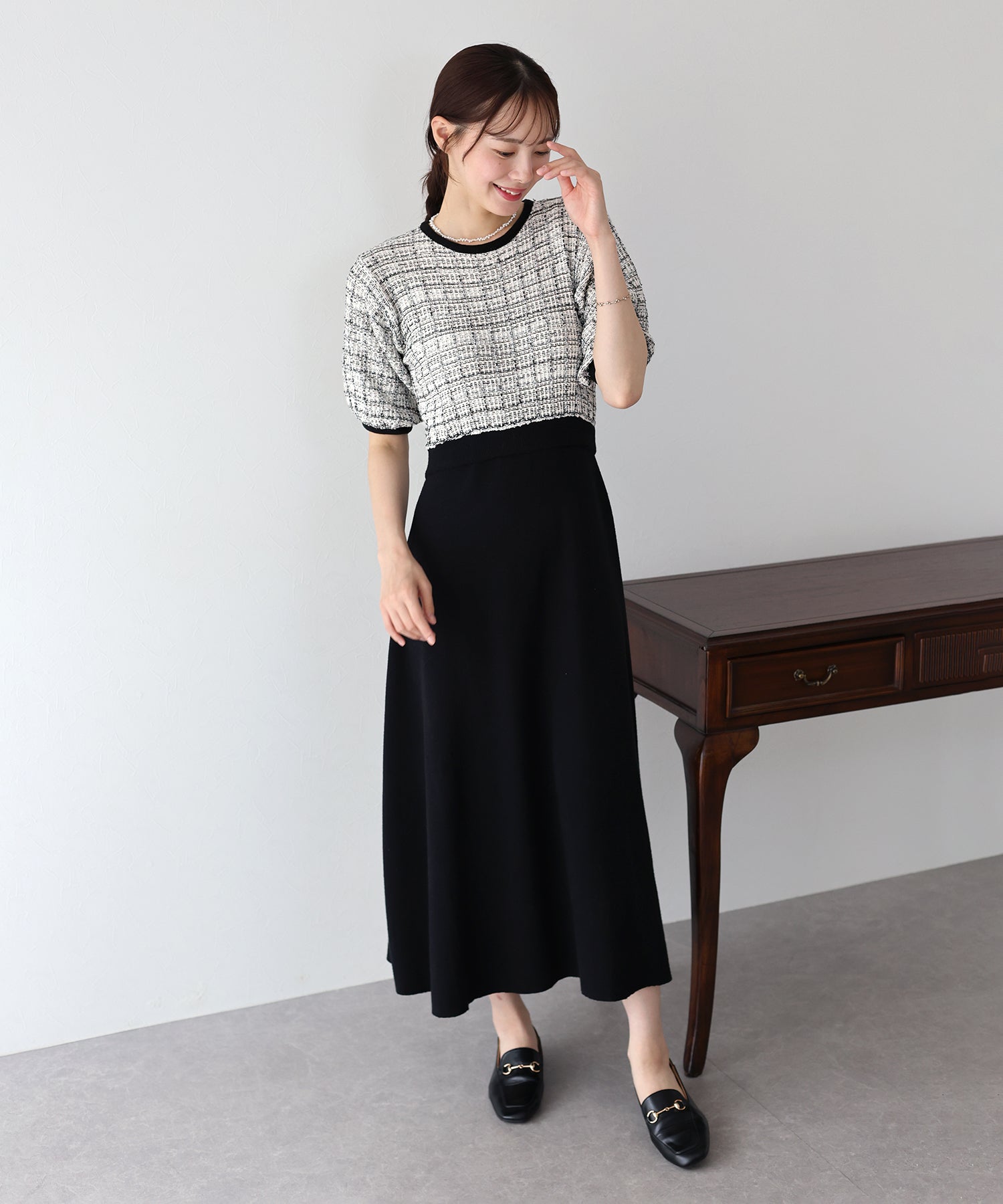 | 生地 | 身頃部分 ツイード風ニット素材 スカート部分 滑らかなニット素材 |