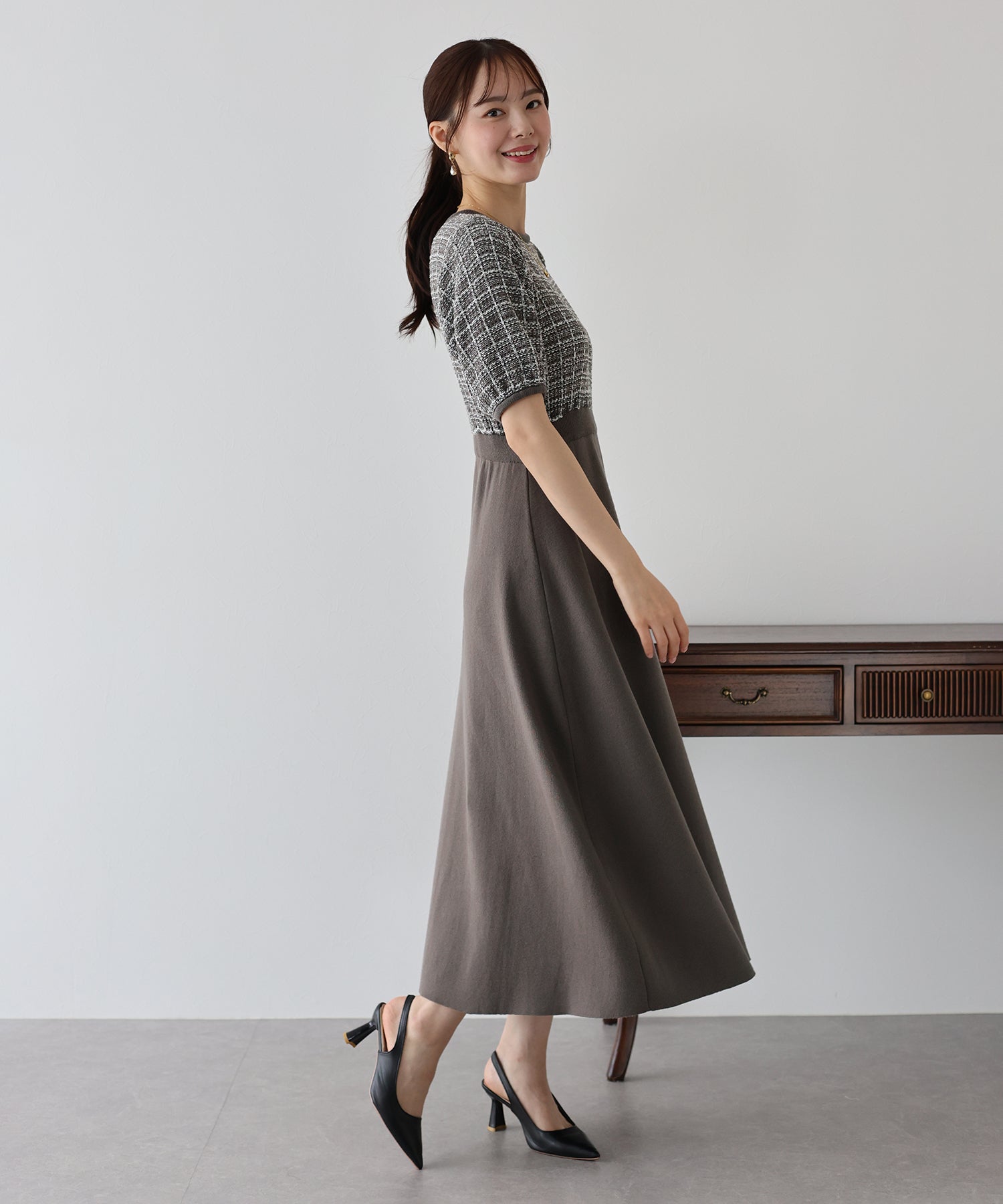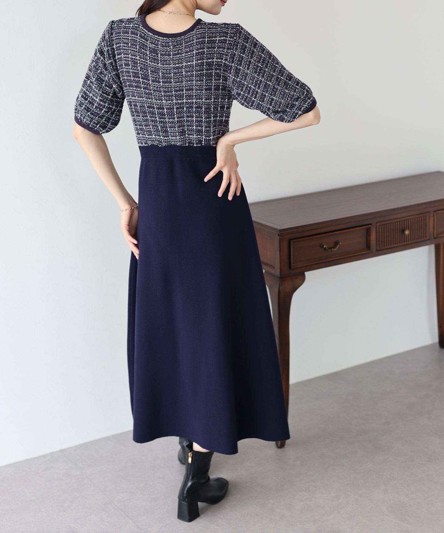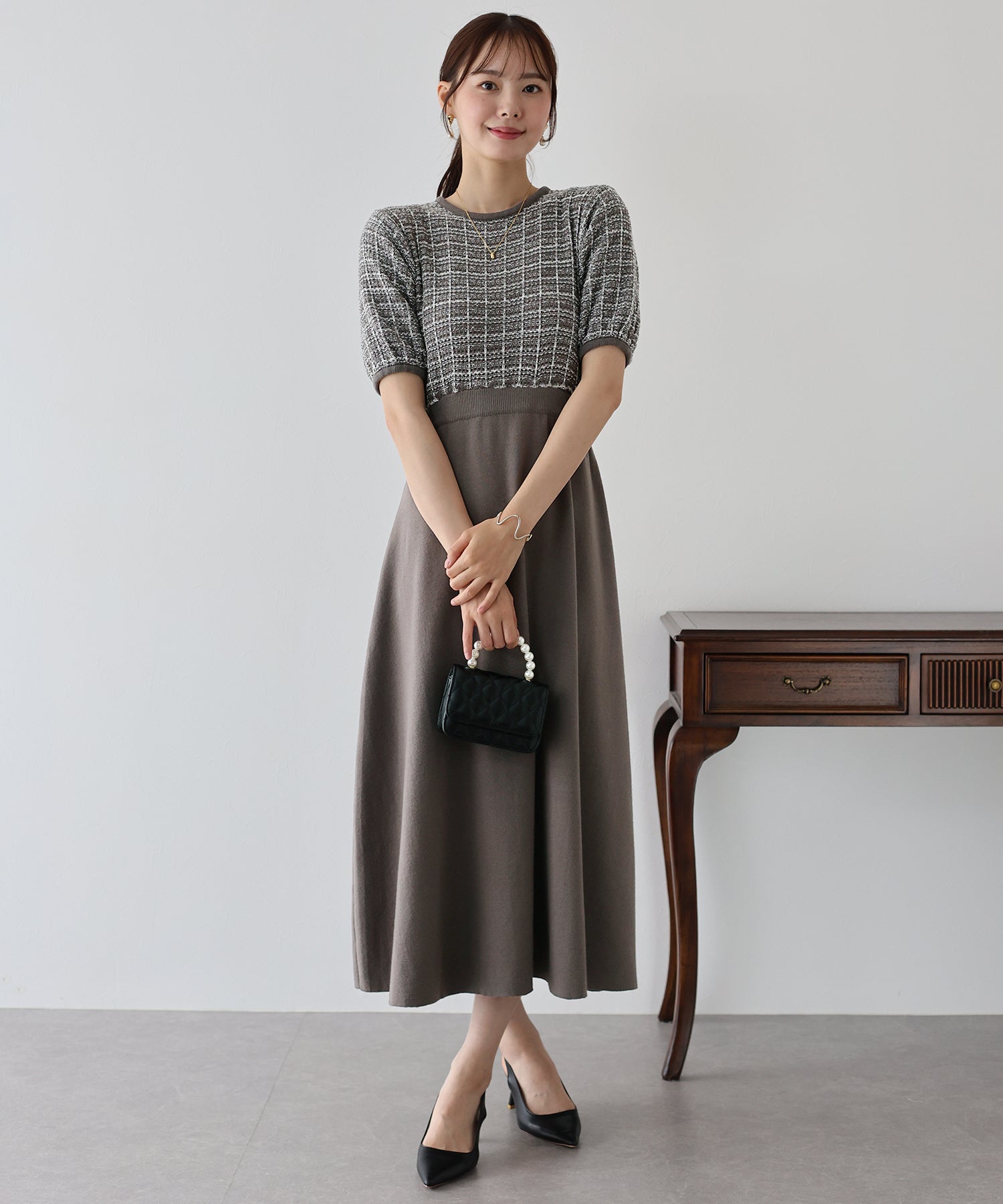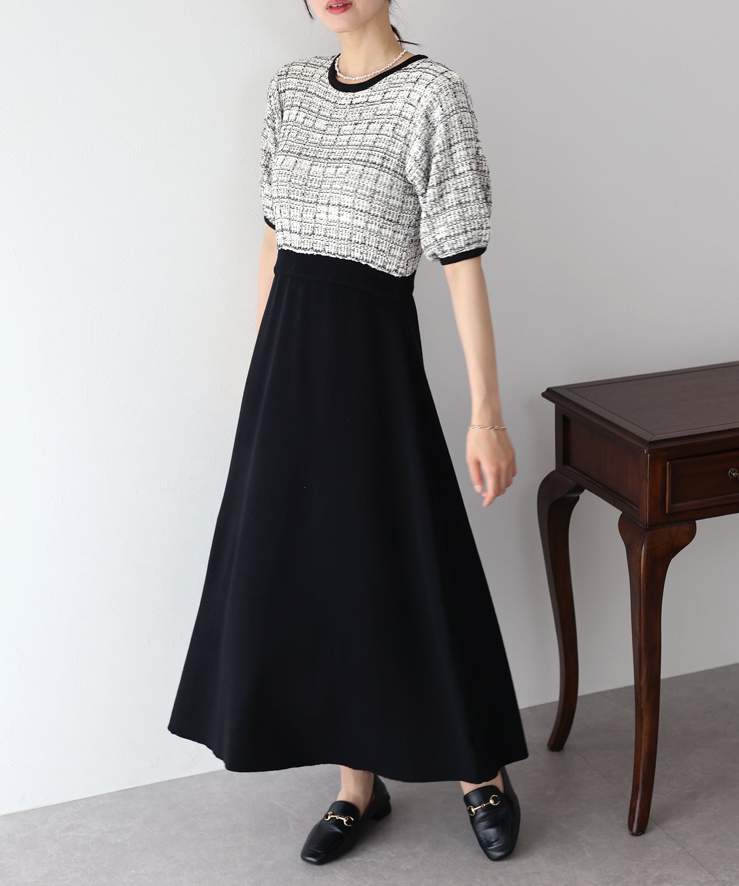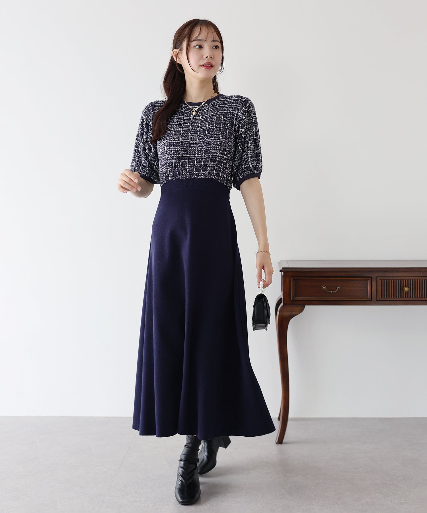 | 生地 | 身頃部分 ツイード風ニット素材 スカート部分 滑らかなニット素材 |