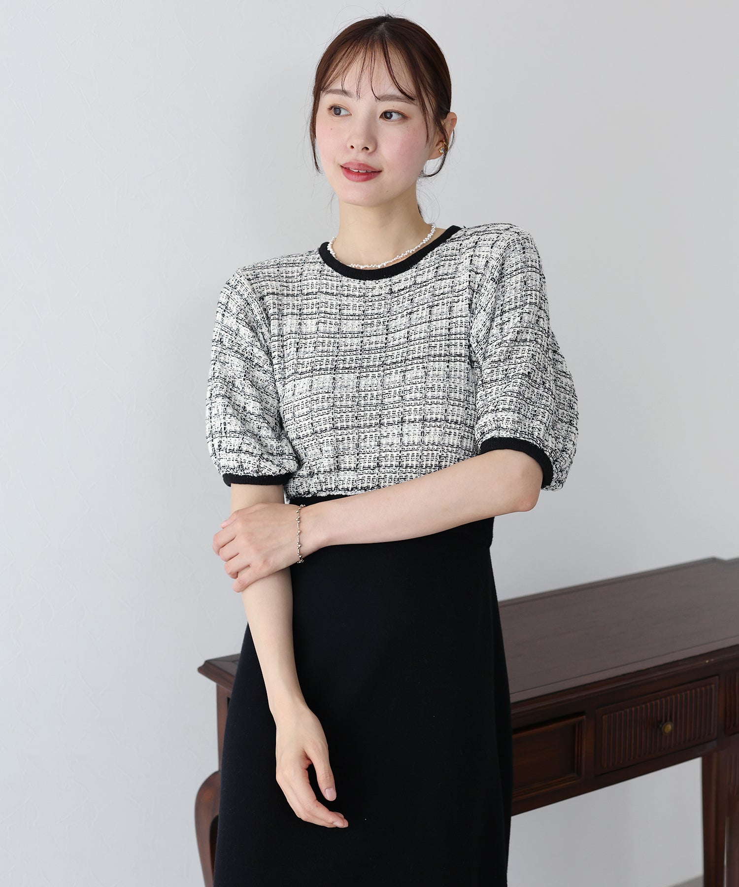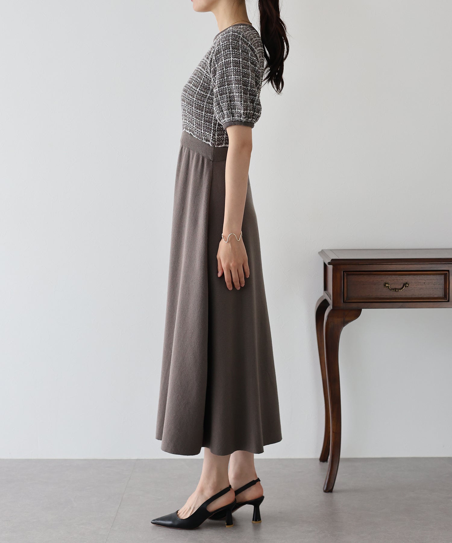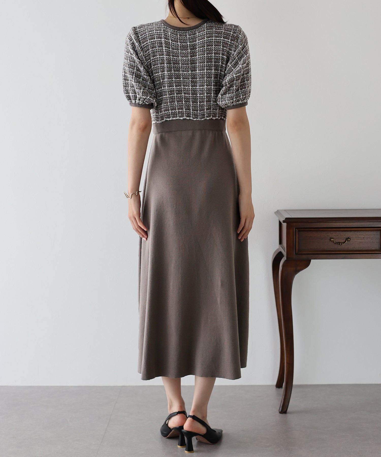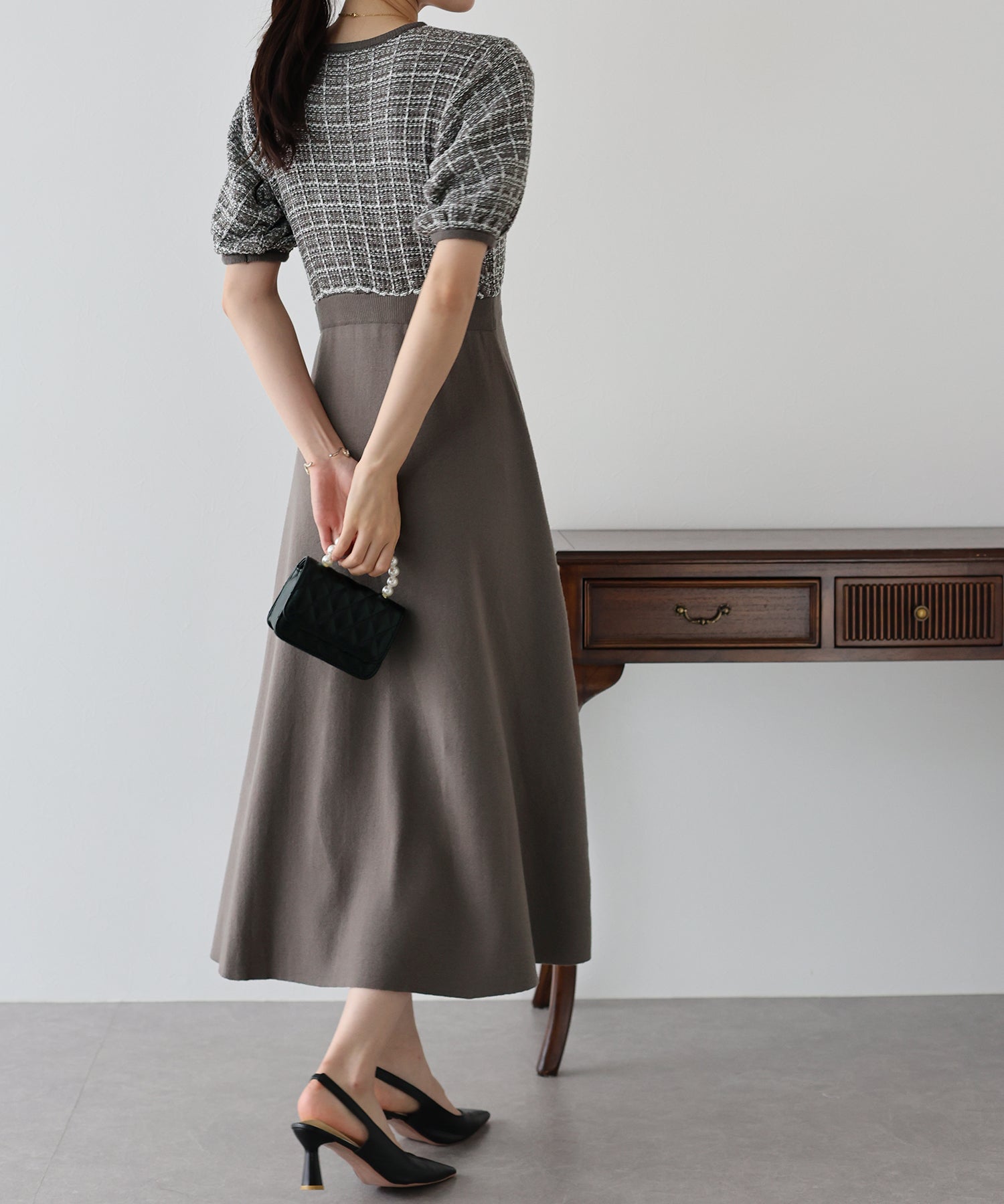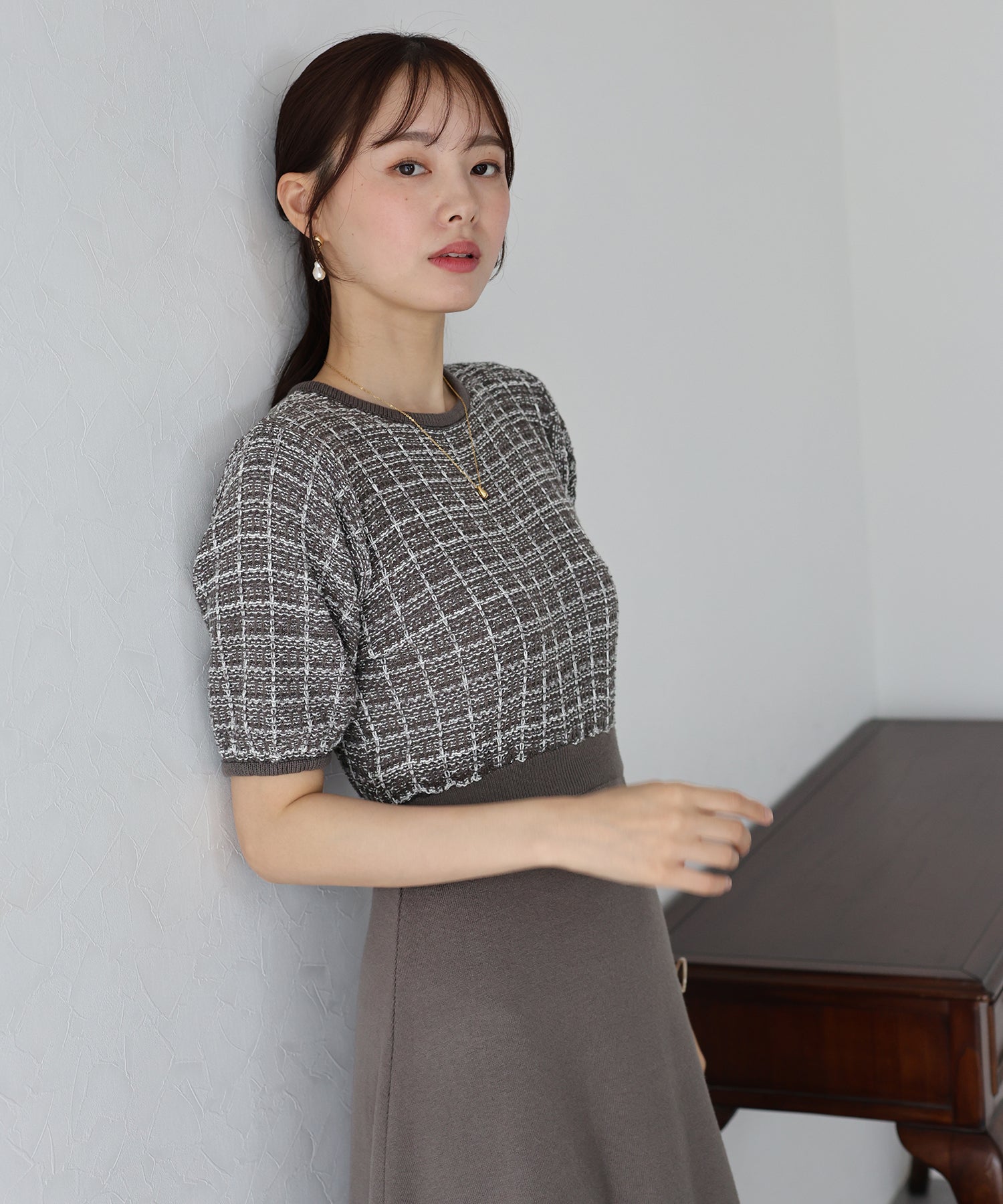 | 生地 | 身頃部分 ツイード風ニット素材 スカート部分 滑らかなニット素材 |