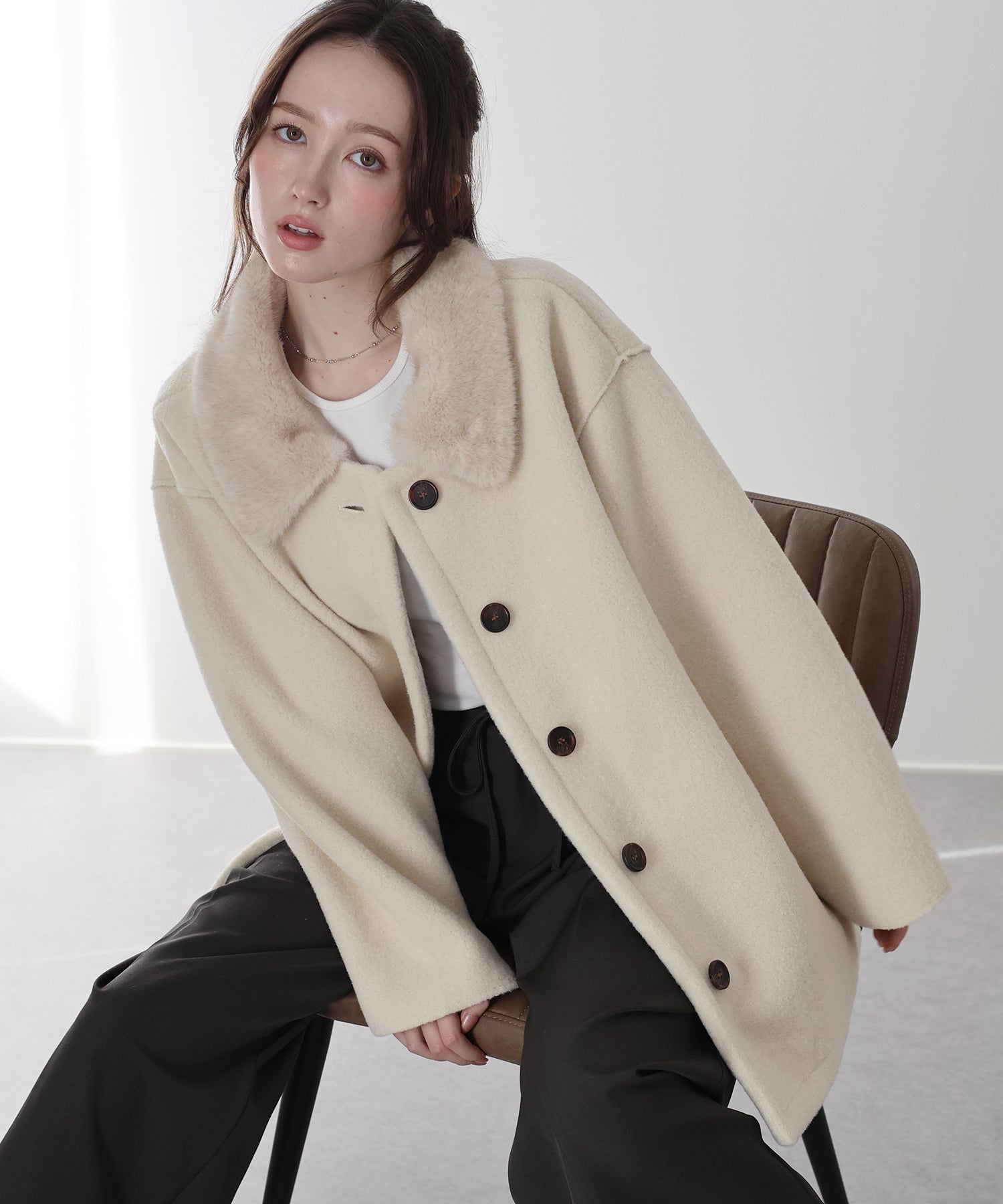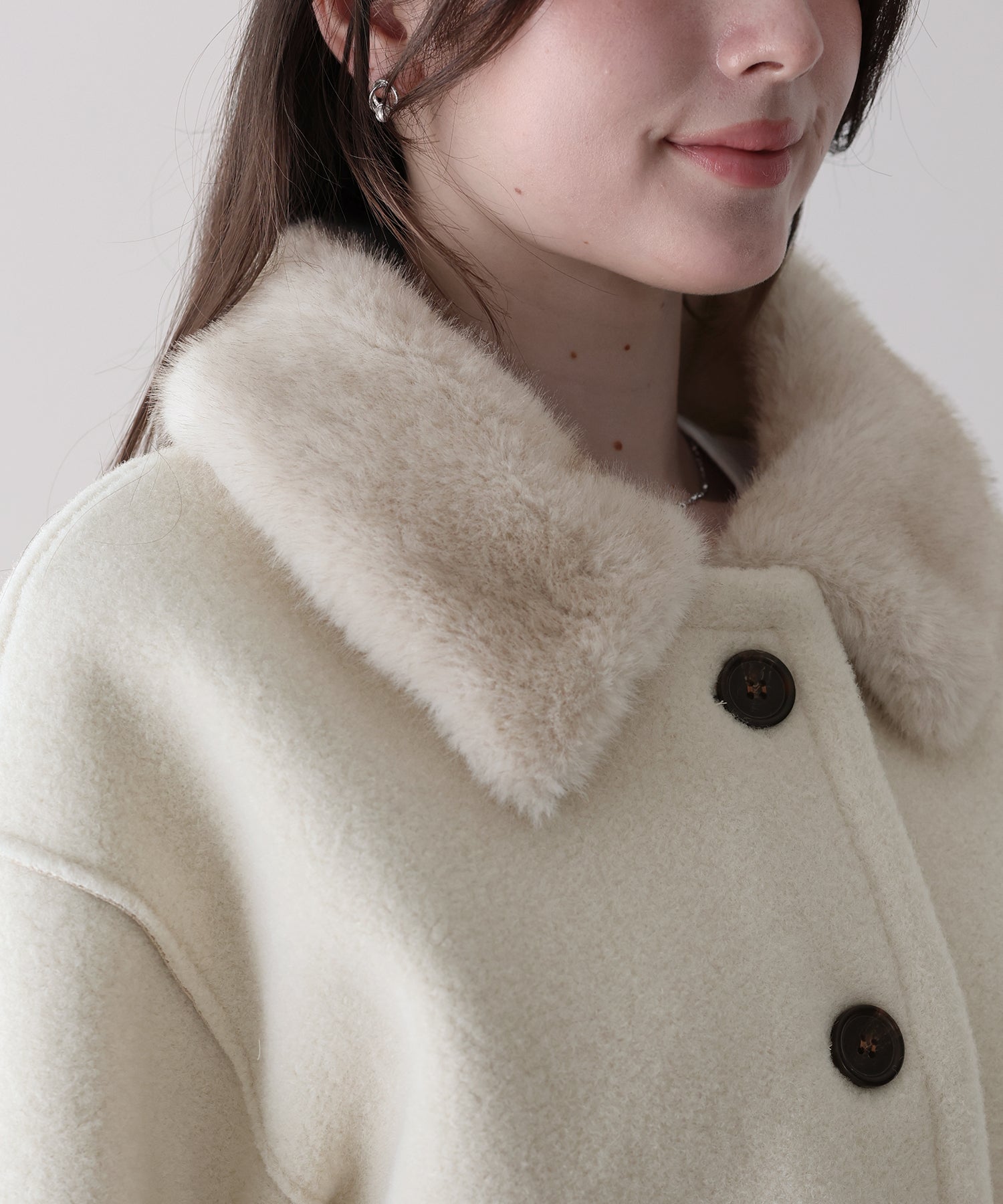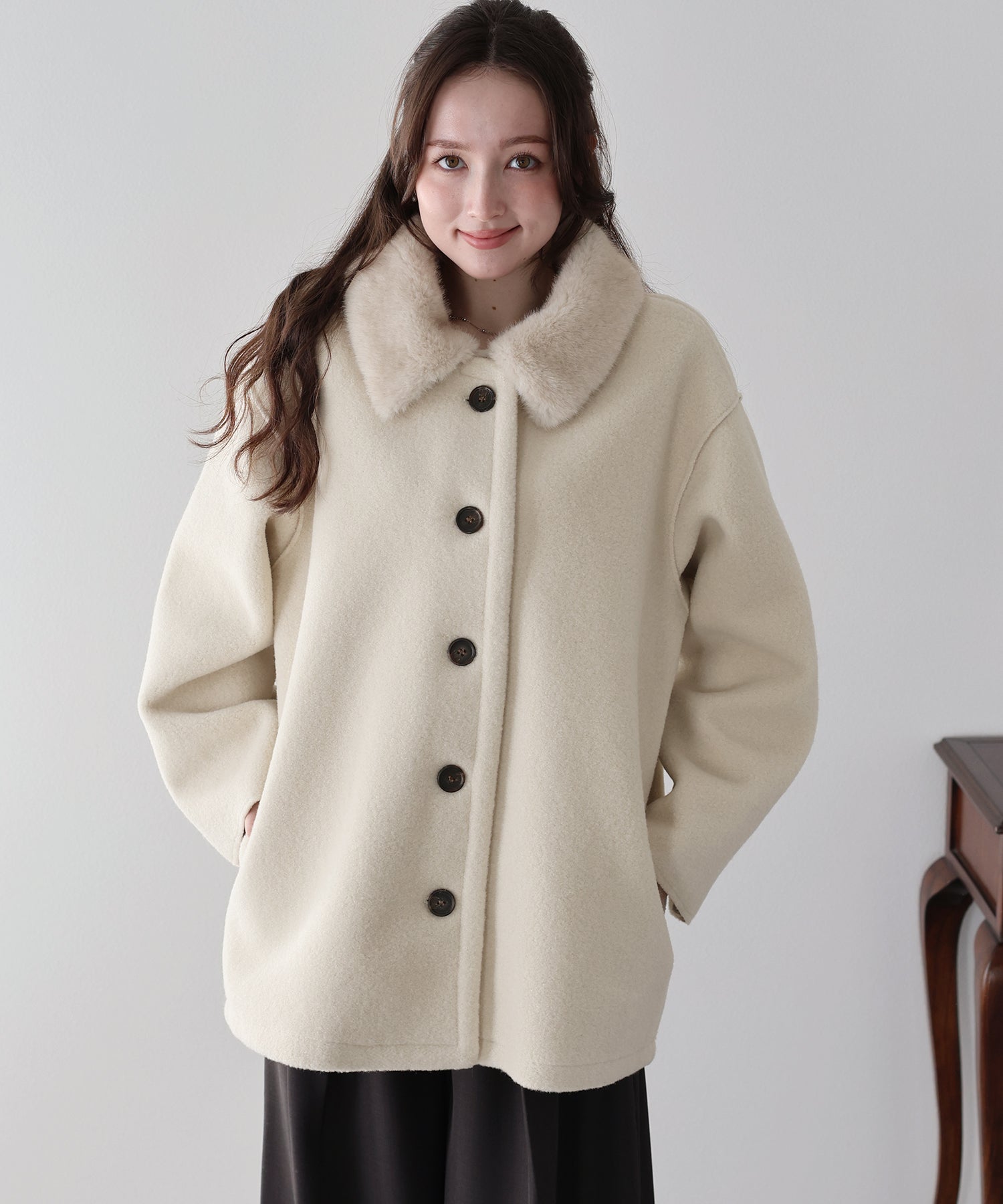 ふんわりフェミニンに着られるファー襟ボアコート ?POINT 甘めにもカジュアルにも取り入れやすい、万能ボアコート。 ふんわりとした質感のボアに、リッチな雰囲気を添えるファー襟が存在感をプラスします。 短すぎず長すぎない、スタイルがよく見える絶妙な丈感で、どんなボトムともバランスよく着こなせる1枚。 上品な印象を引き立てるマーブルボタンも、コーデのアクセントに。