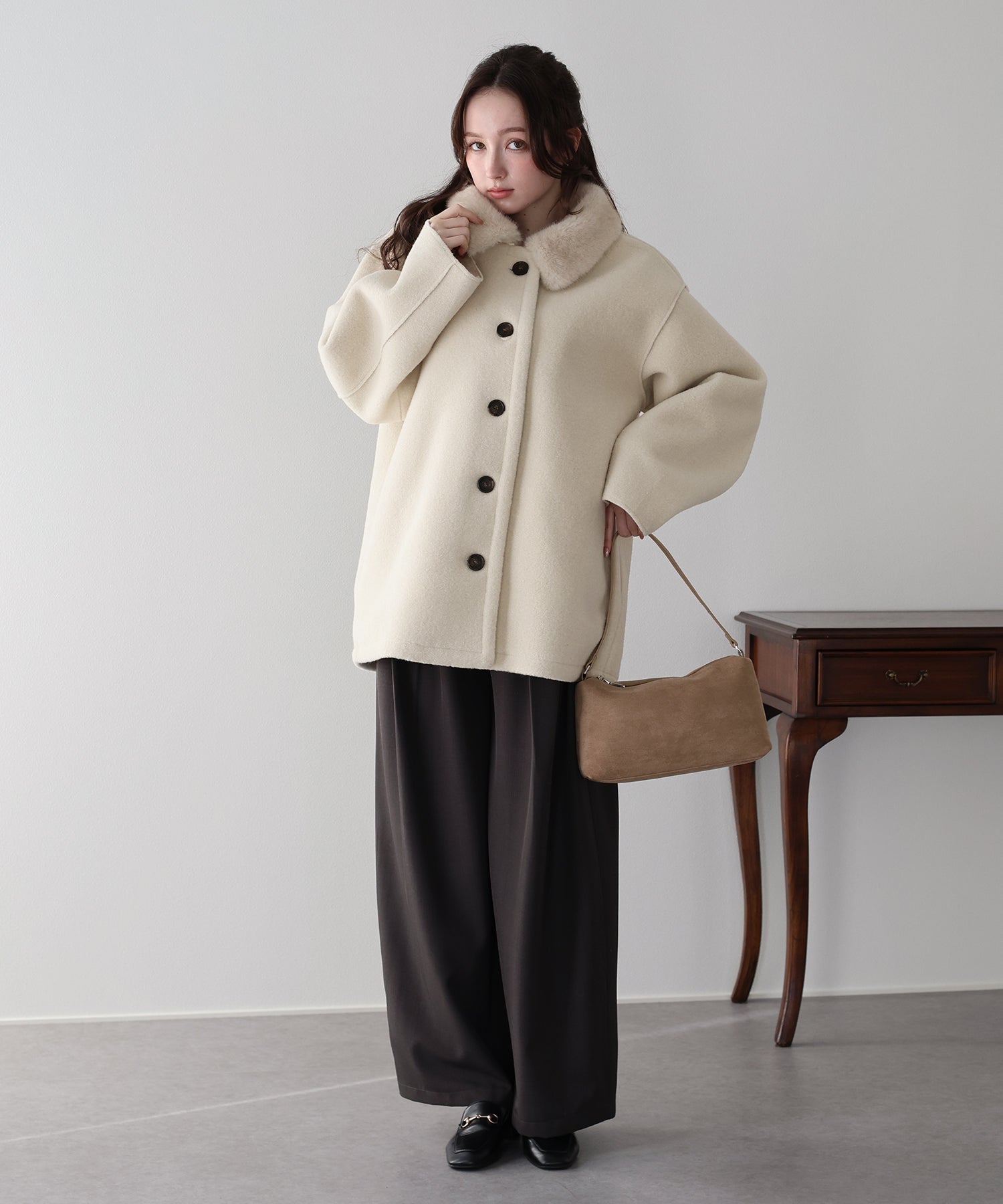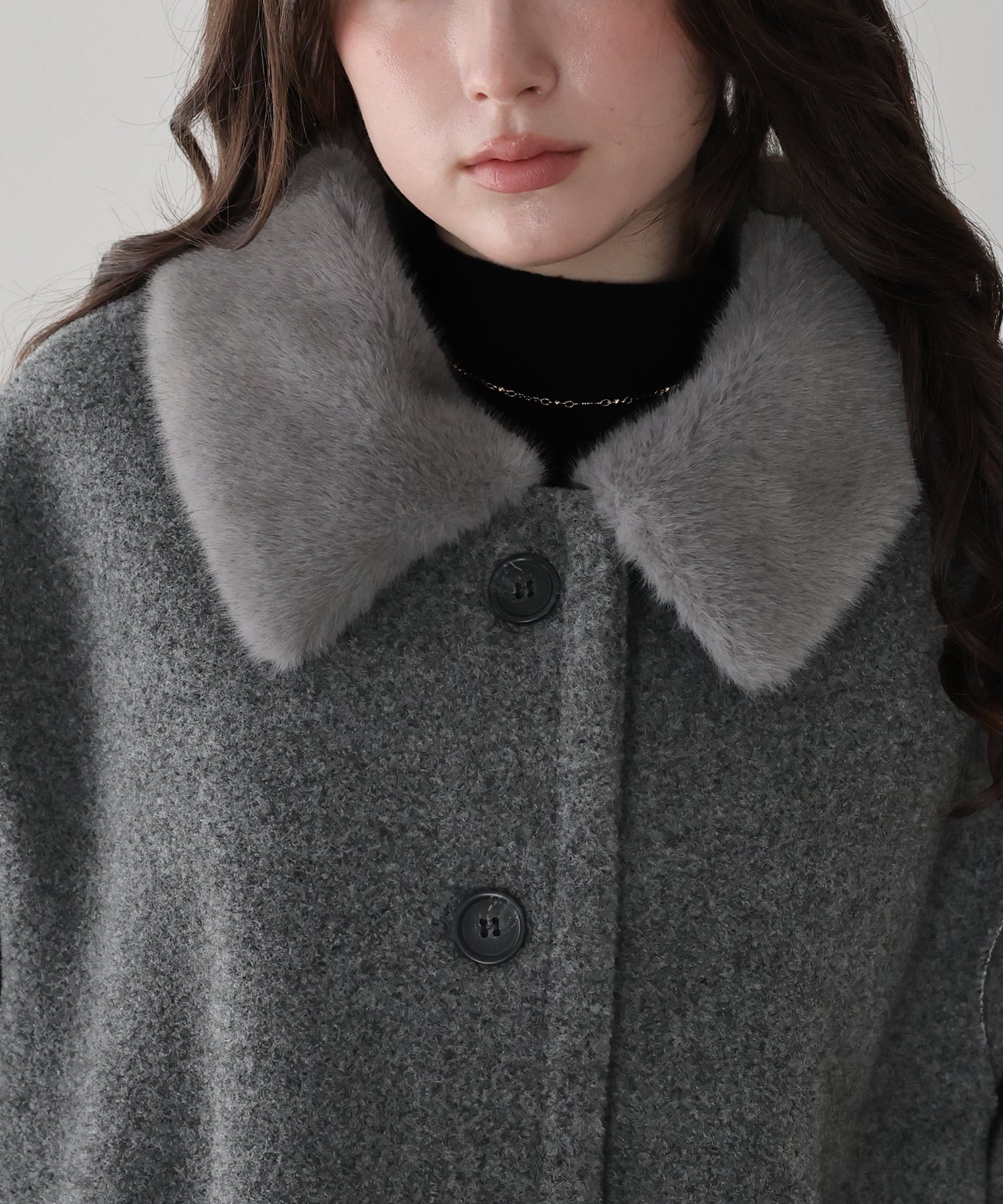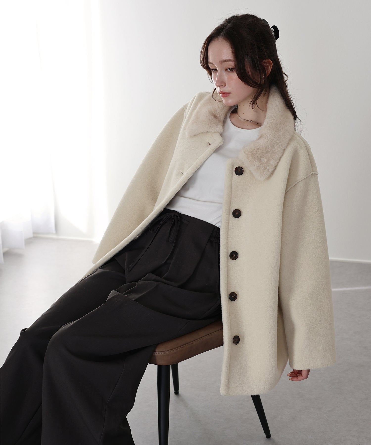 ふんわりフェミニンに着られるファー襟ボアコート ?POINT 甘めにもカジュアルにも取り入れやすい、万能ボアコート。 ふんわりとした質感のボアに、リッチな雰囲気を添えるファー襟が存在感をプラスします。 短すぎず長すぎない、スタイルがよく見える絶妙な丈感で、どんなボトムともバランスよく着こなせる1枚。 上品な印象を引き立てるマーブルボタンも、コーデのアクセントに。
