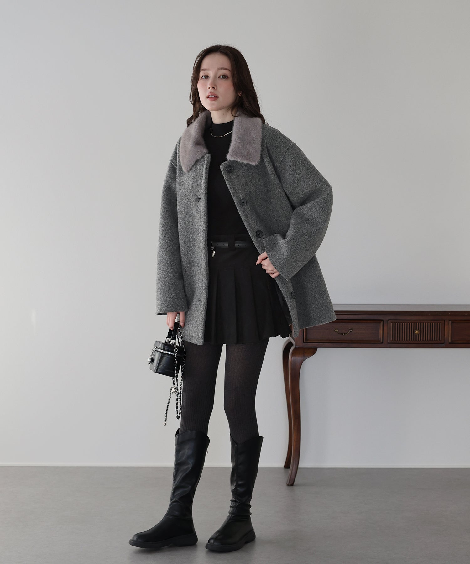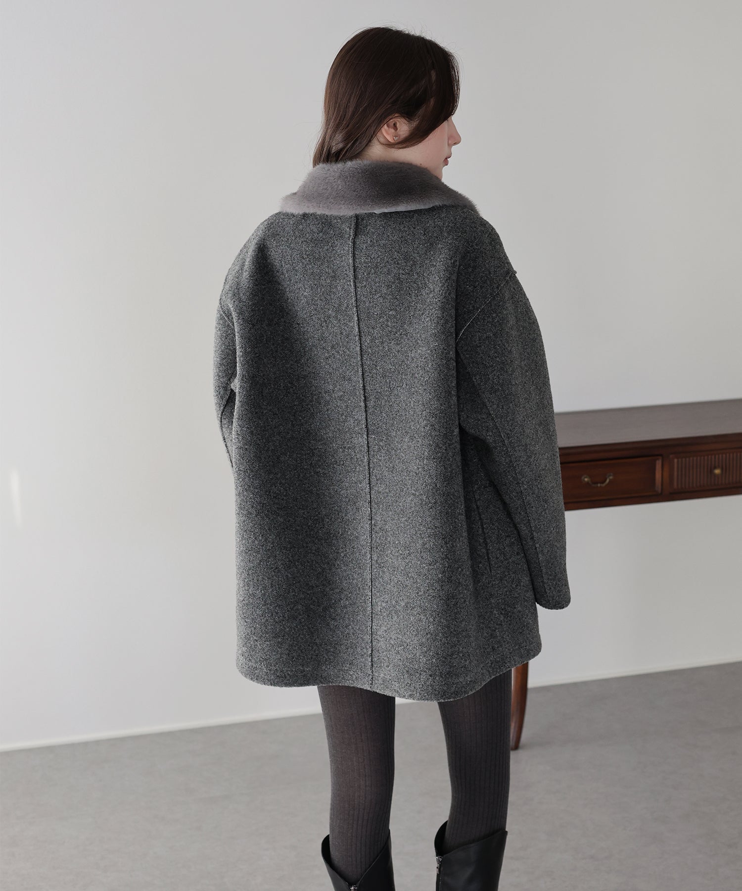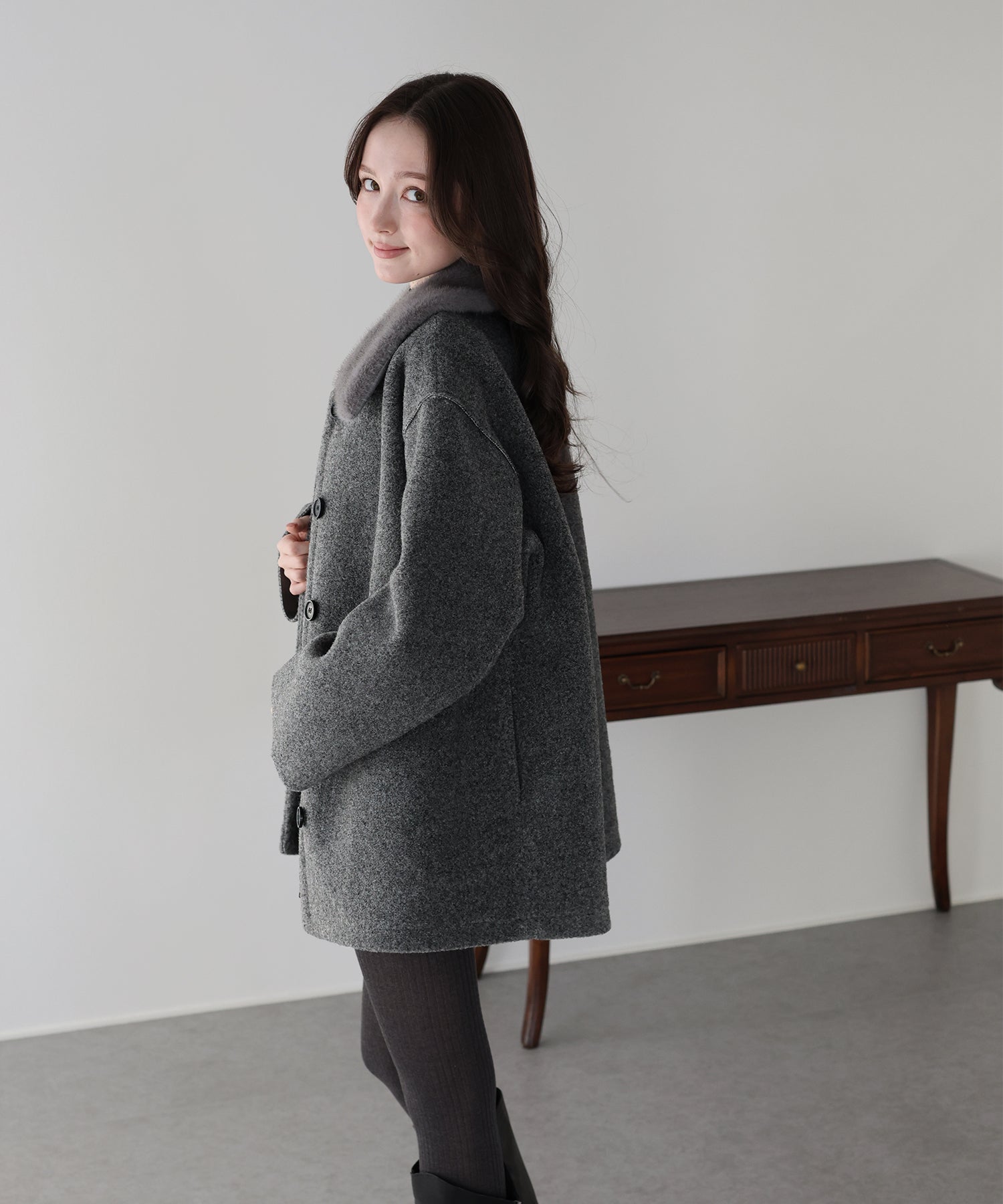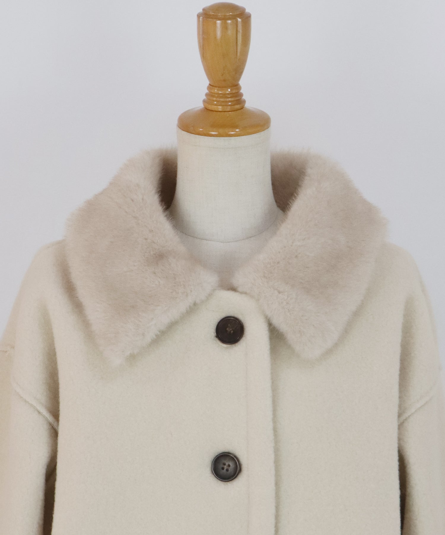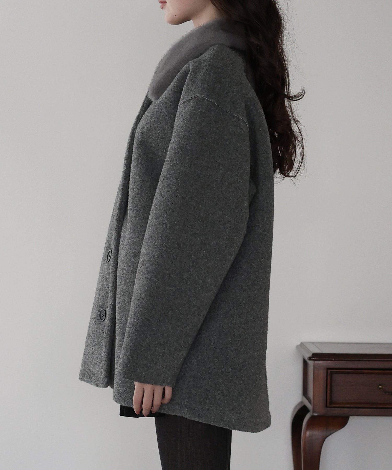 ?DETAIL ファー襟 マーブルボタン サイドポケット有り ハーフ丈