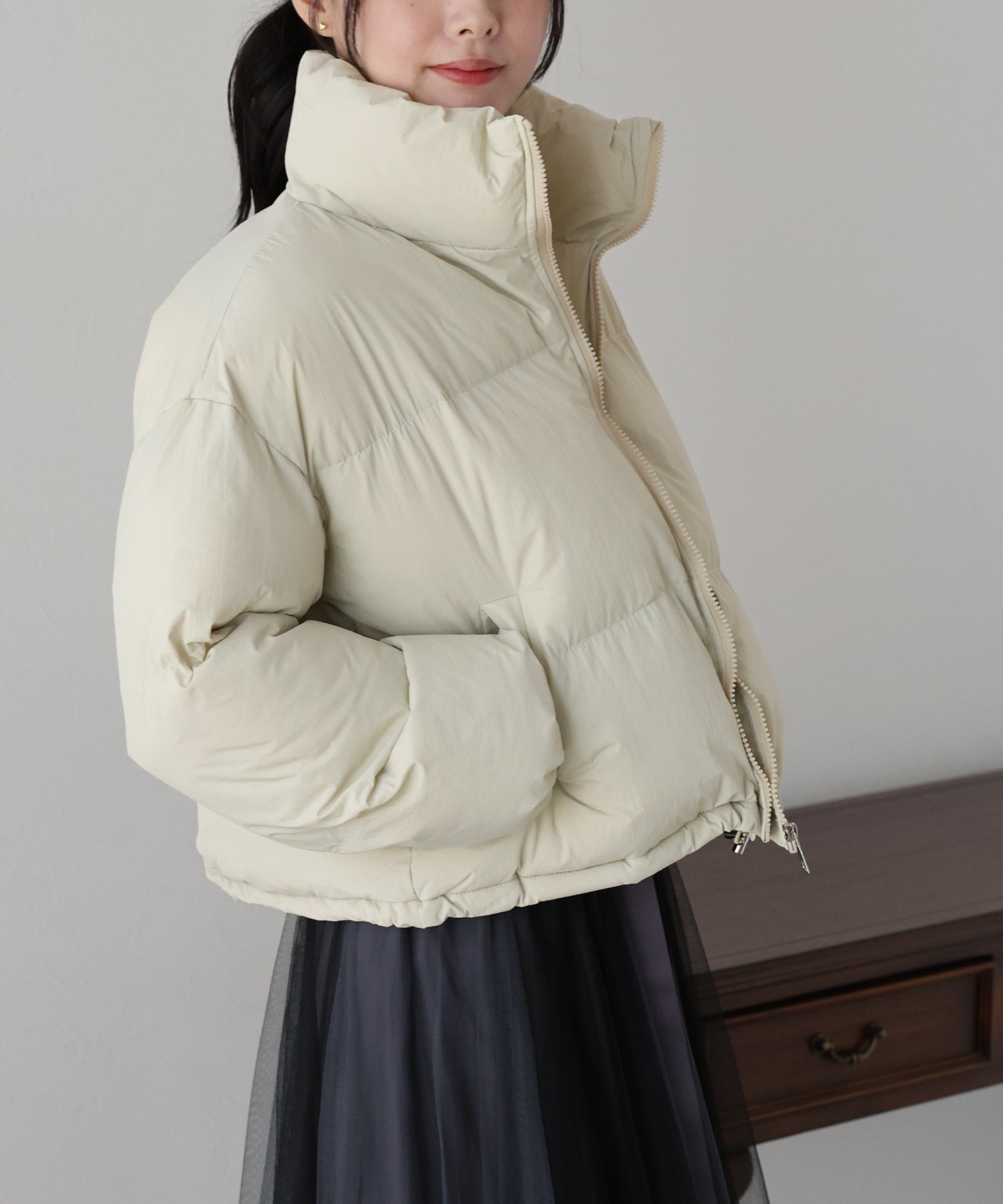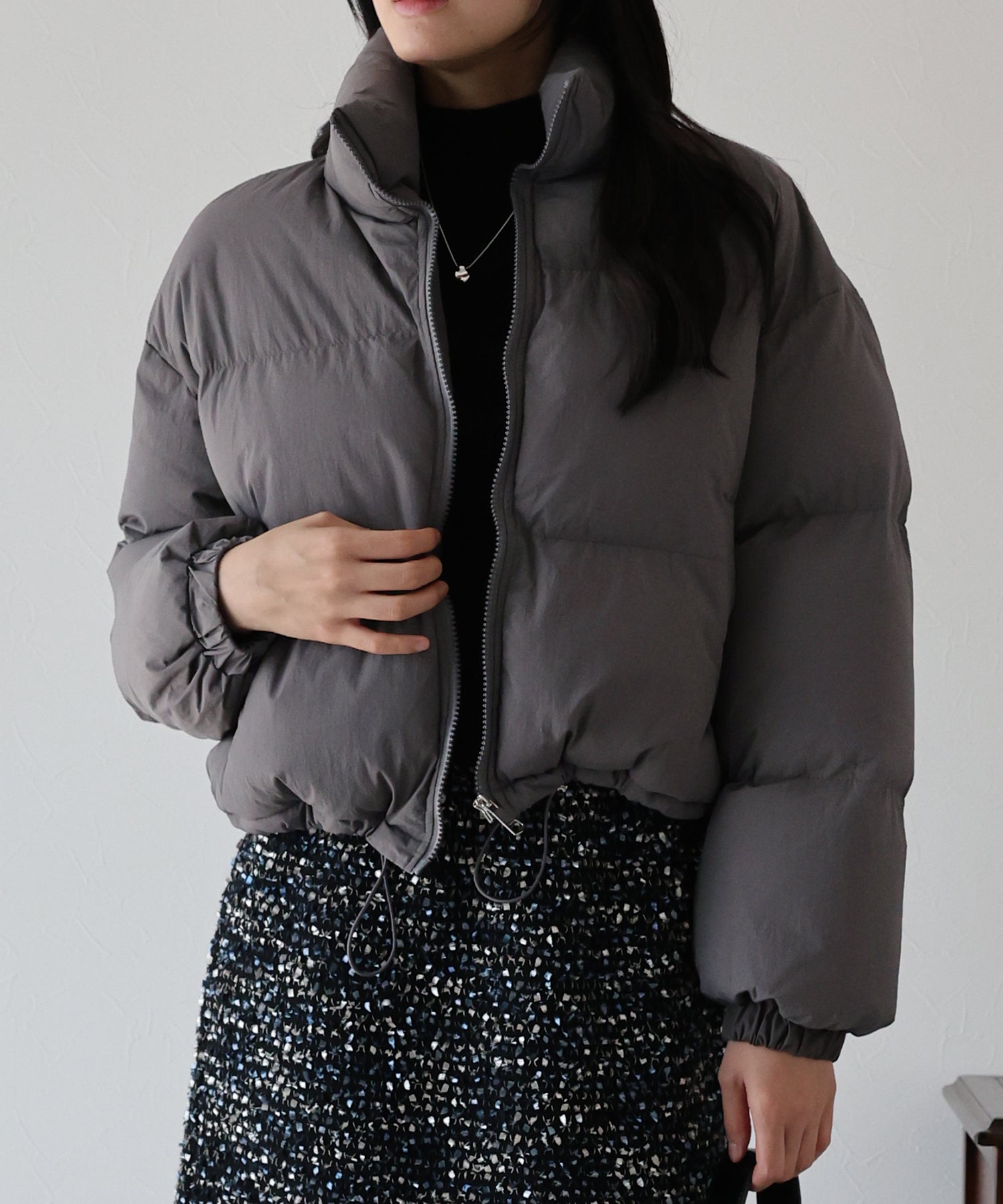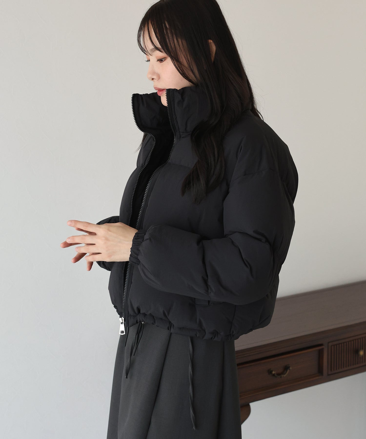 絞ることで冷気が入ることを抑え、シルエットの変化も楽しめる仕様となっております。