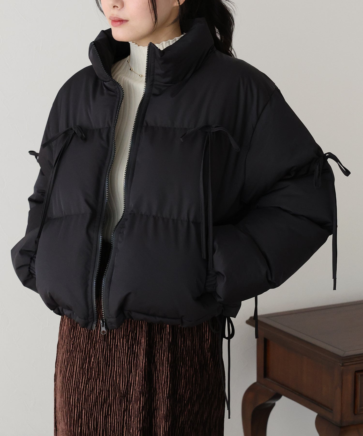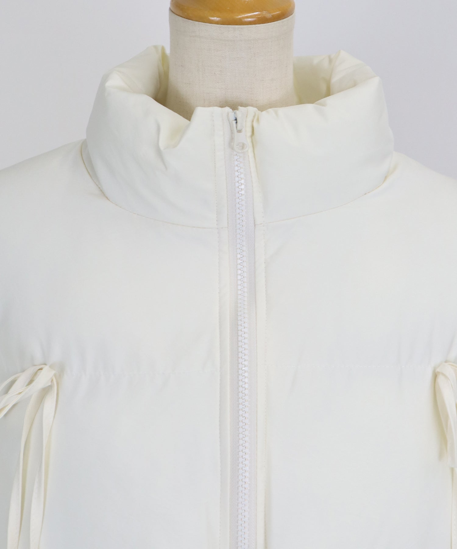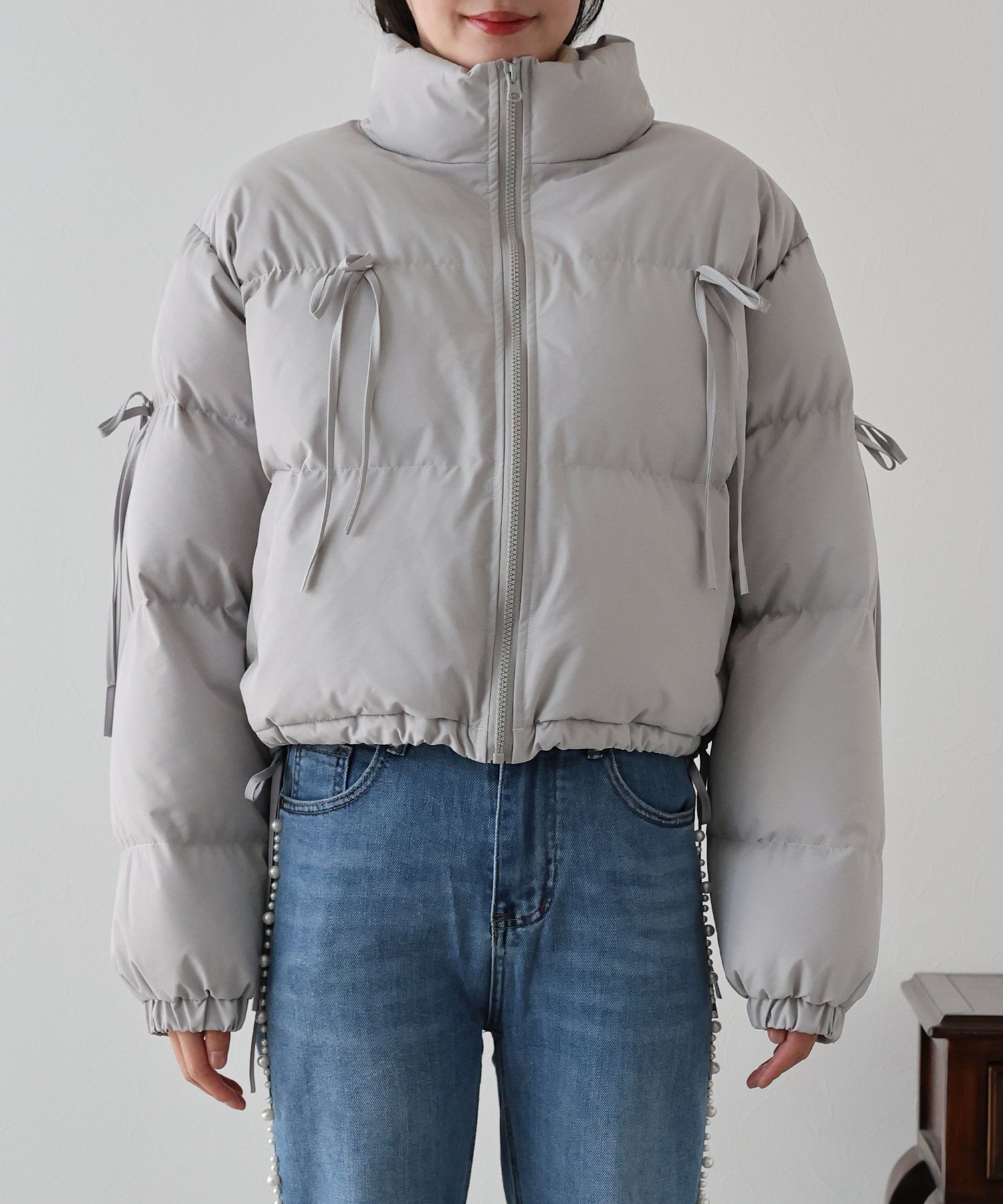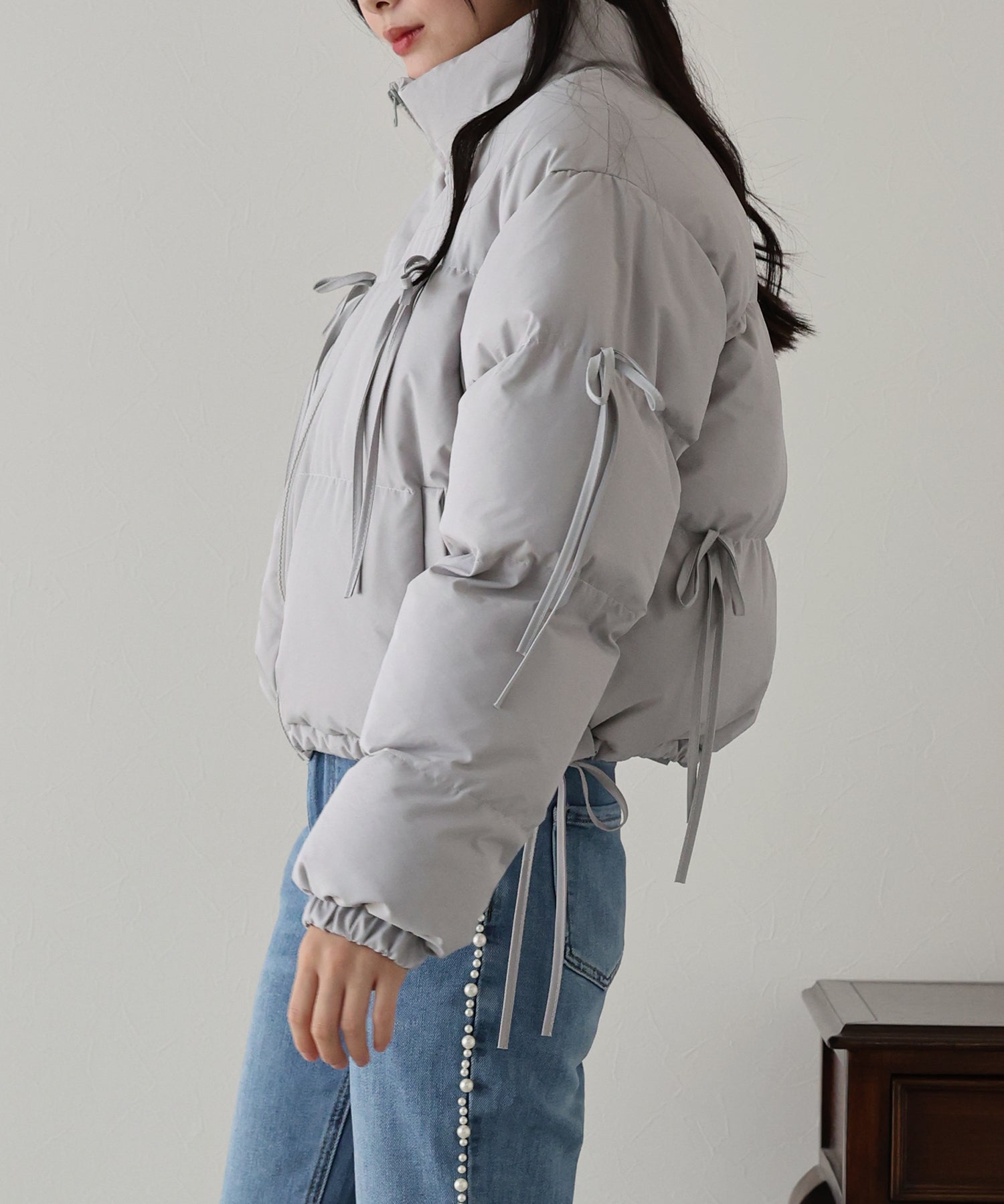ベーシックなダウンジャケットにリボンを全体的にあしらい、フェミニンさをプラスしました。