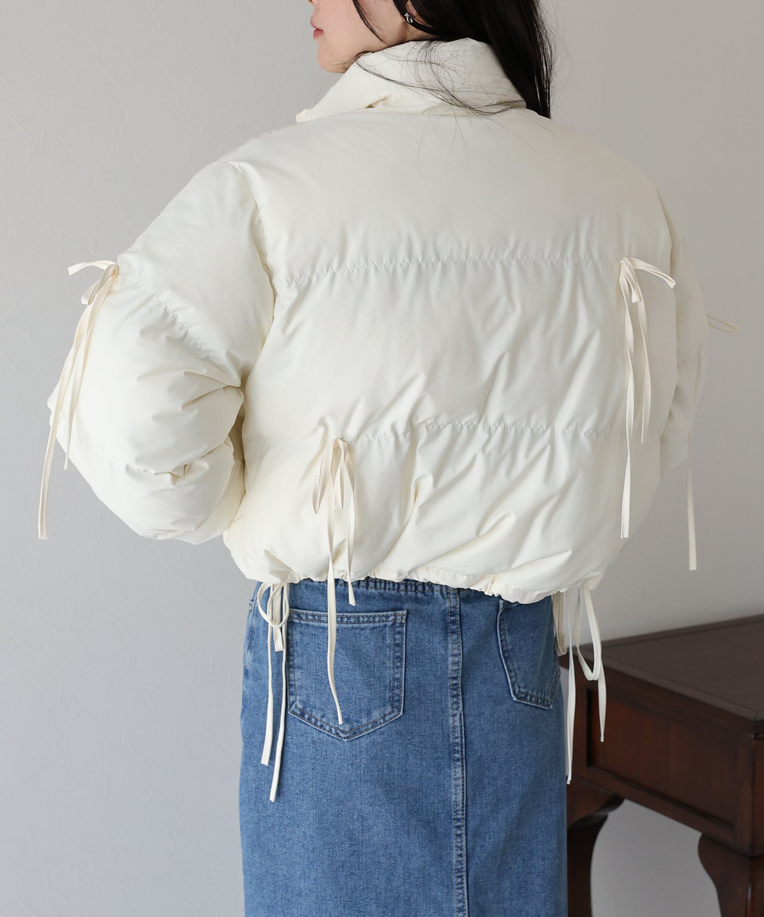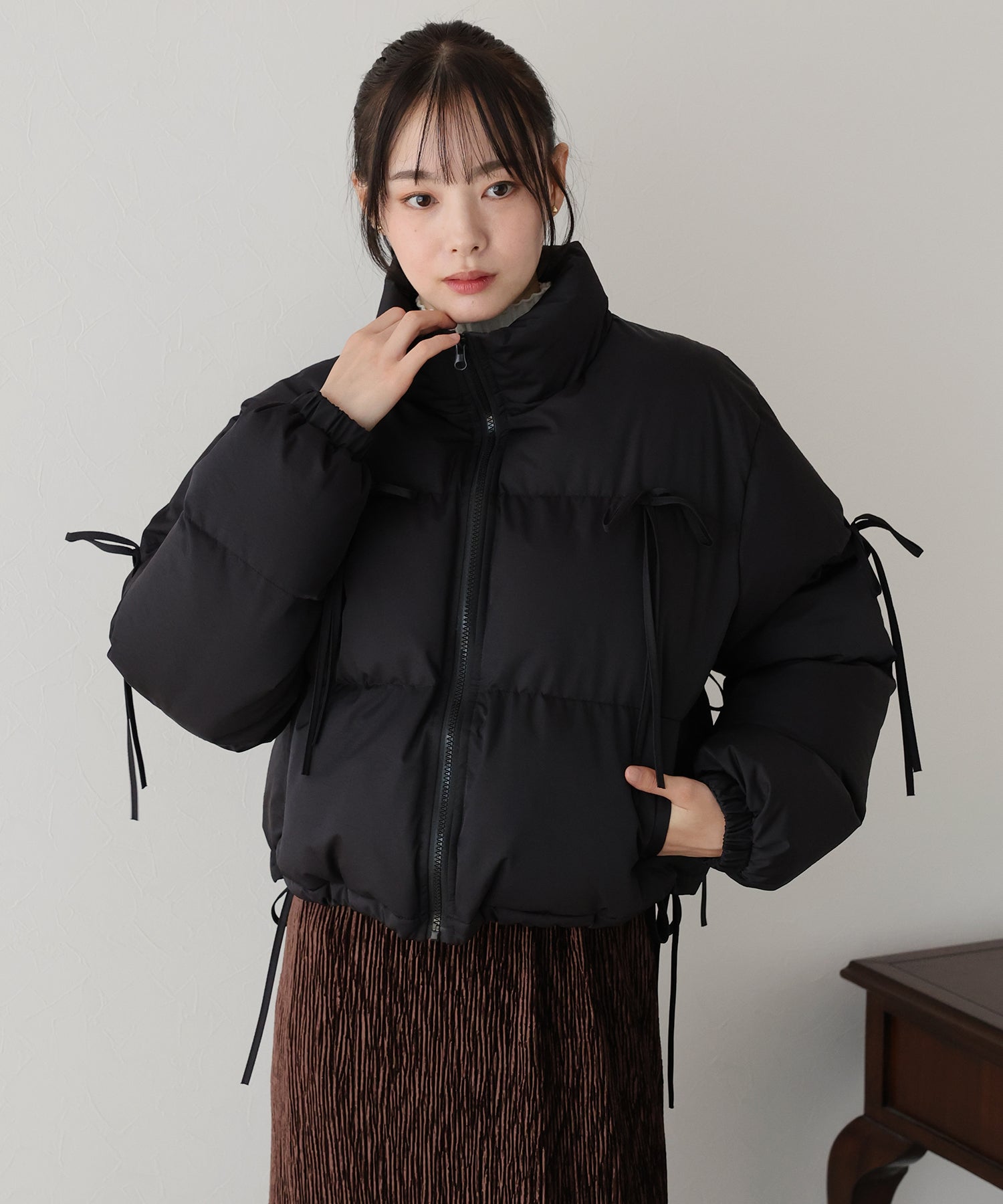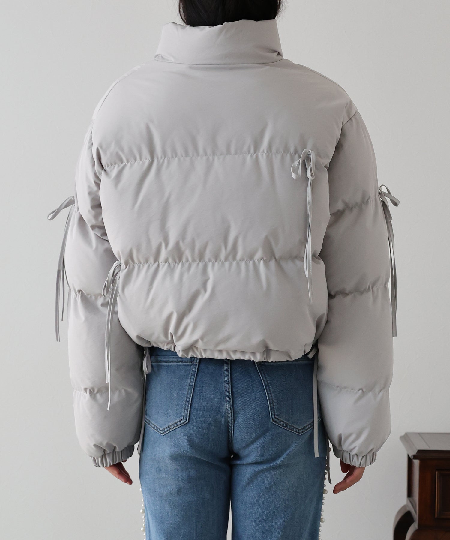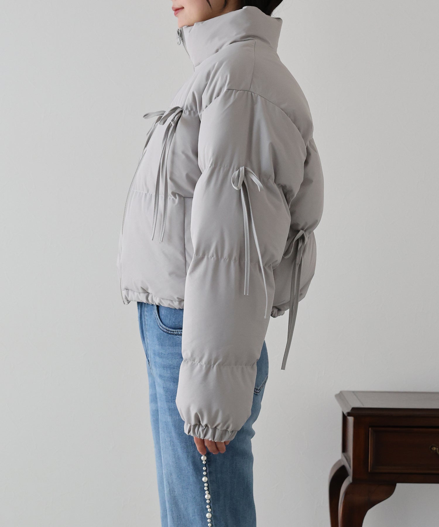 ベーシックなダウンジャケットにリボンを全体的にあしらい、フェミニンさをプラスしました。