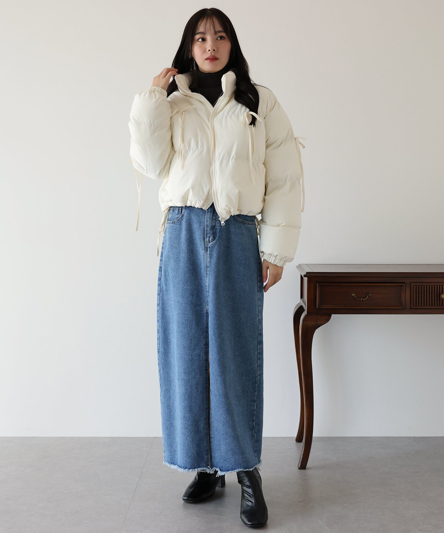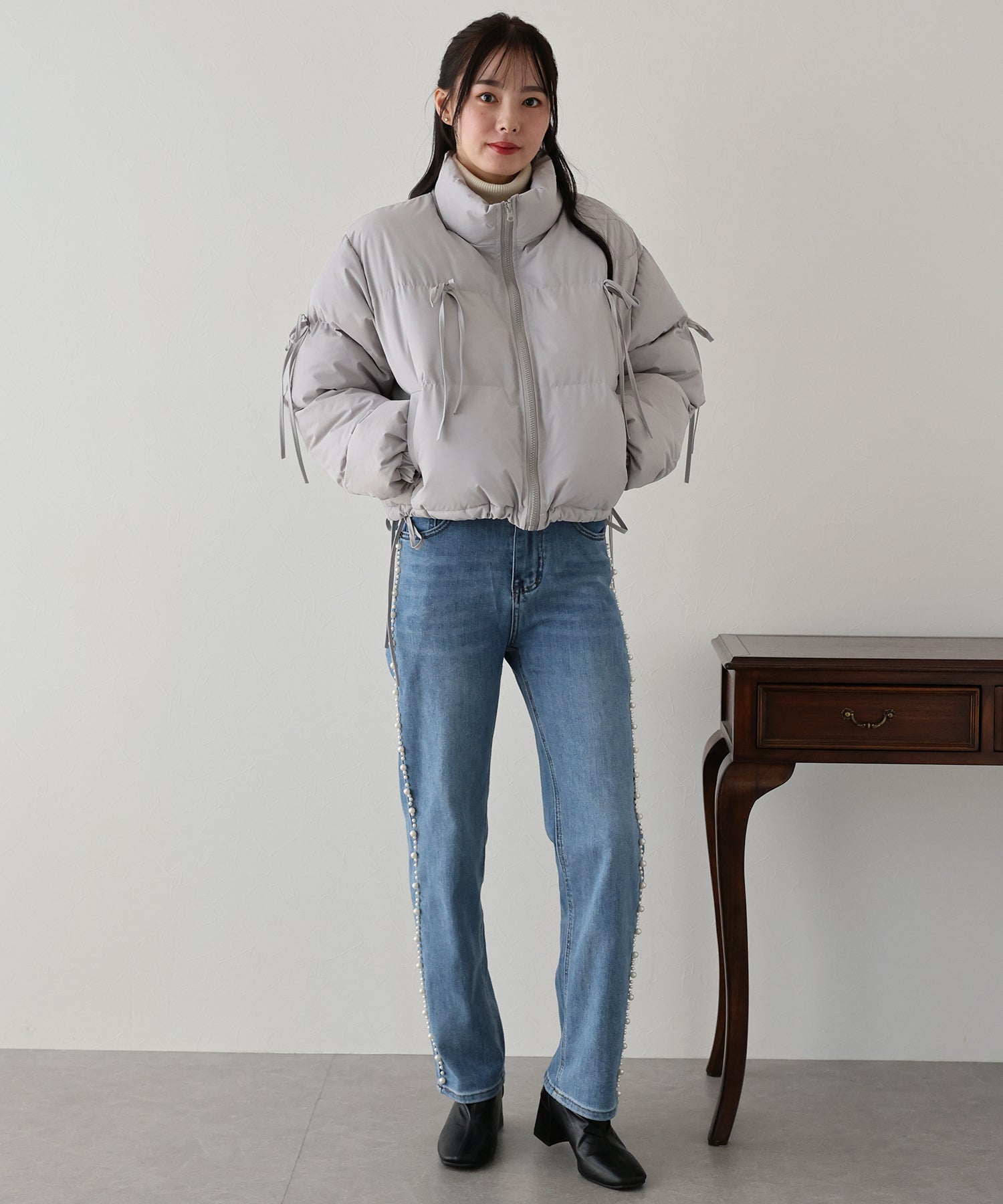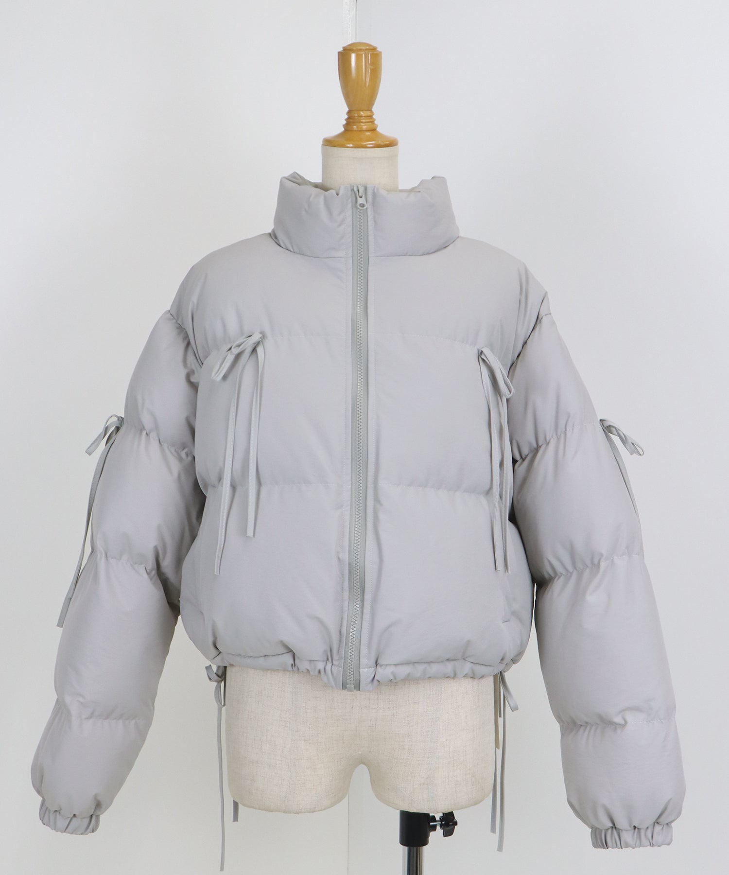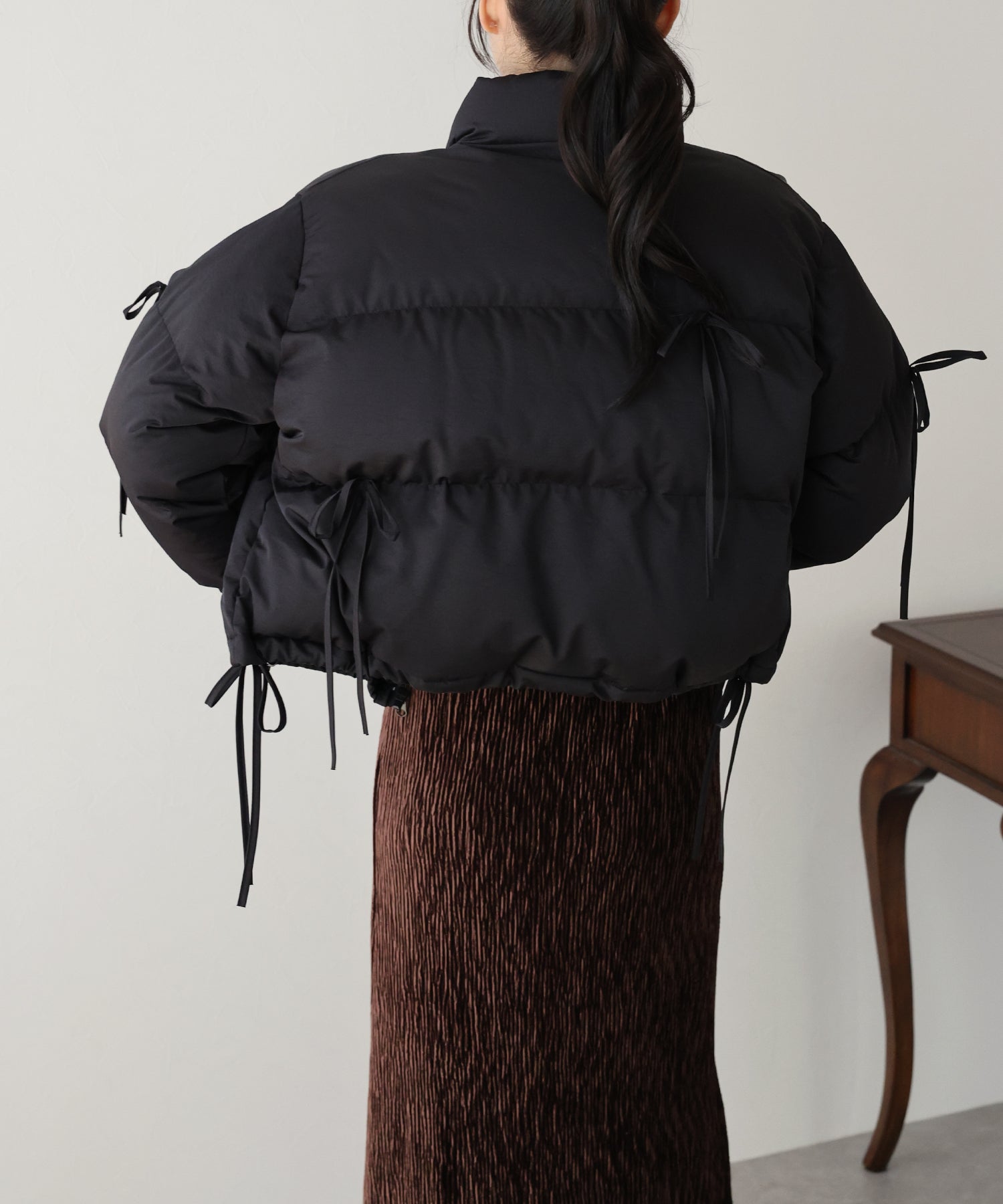 ベーシックなダウンジャケットにリボンを全体的にあしらい、フェミニンさをプラスしました。