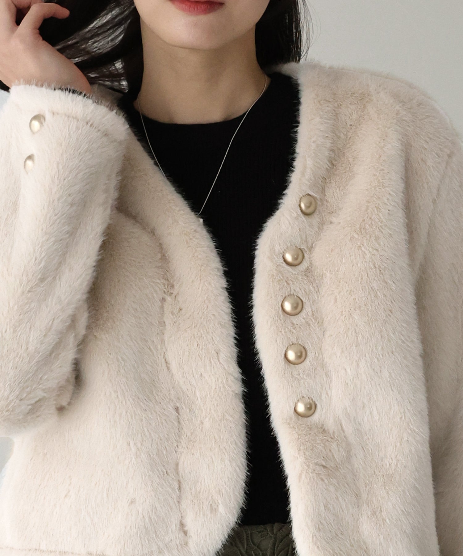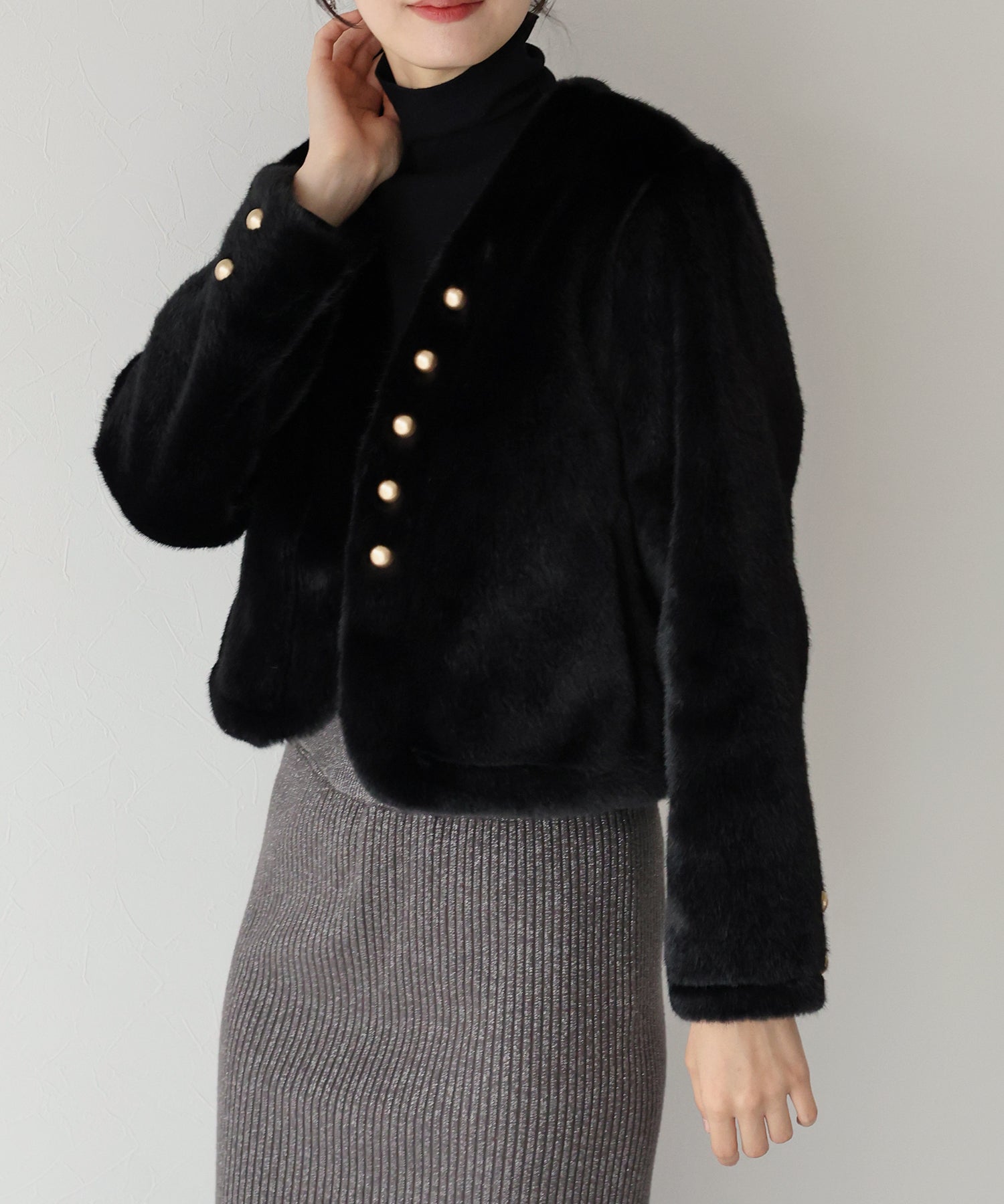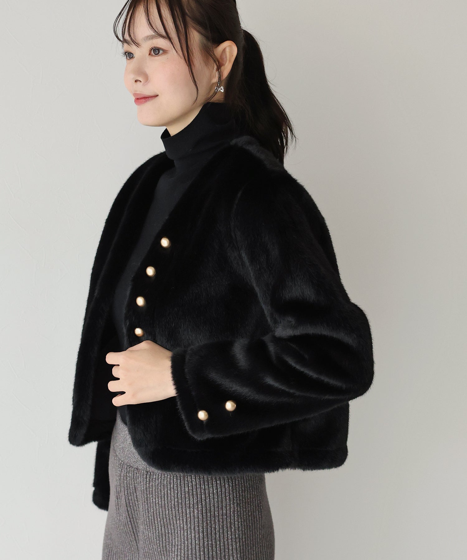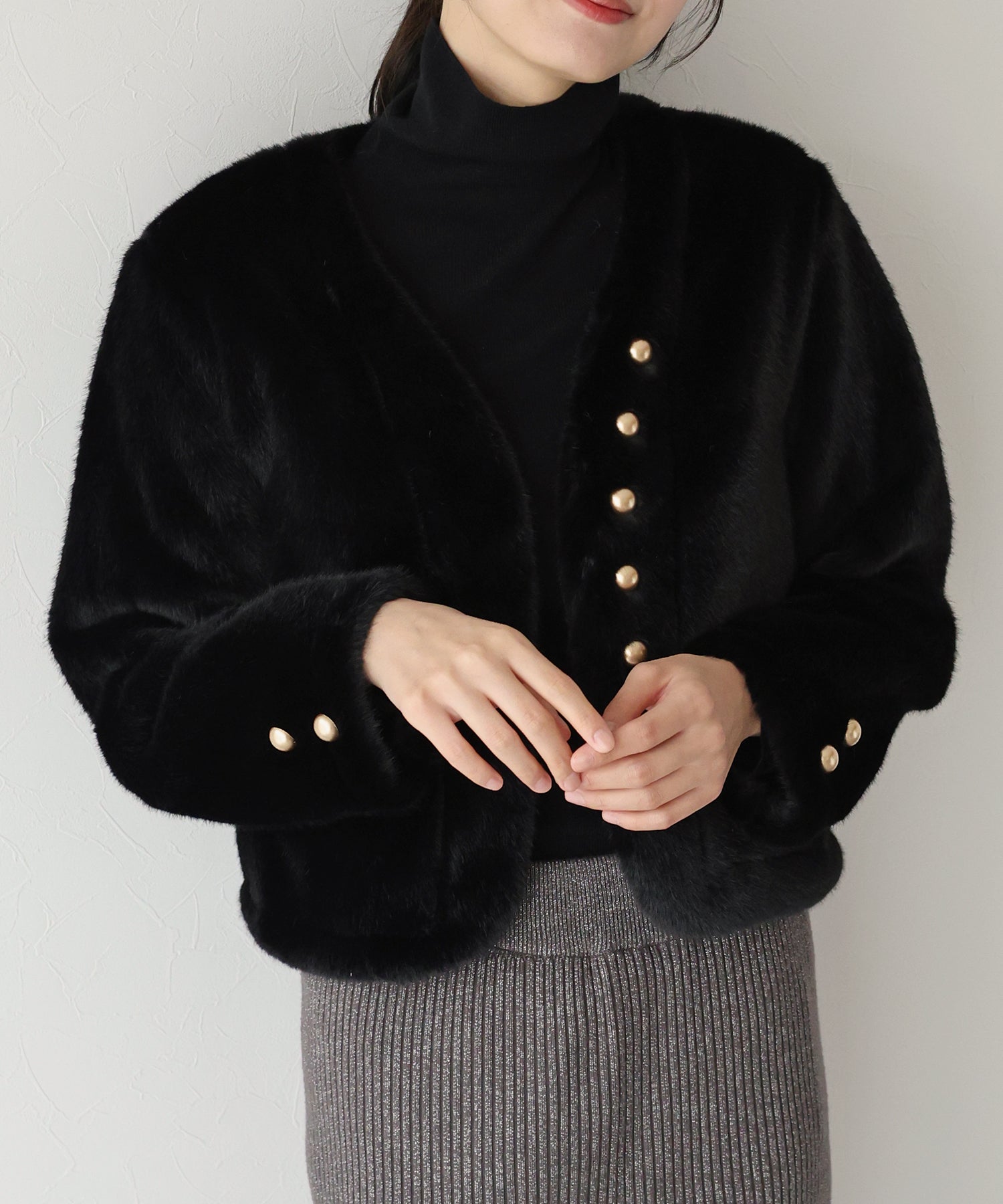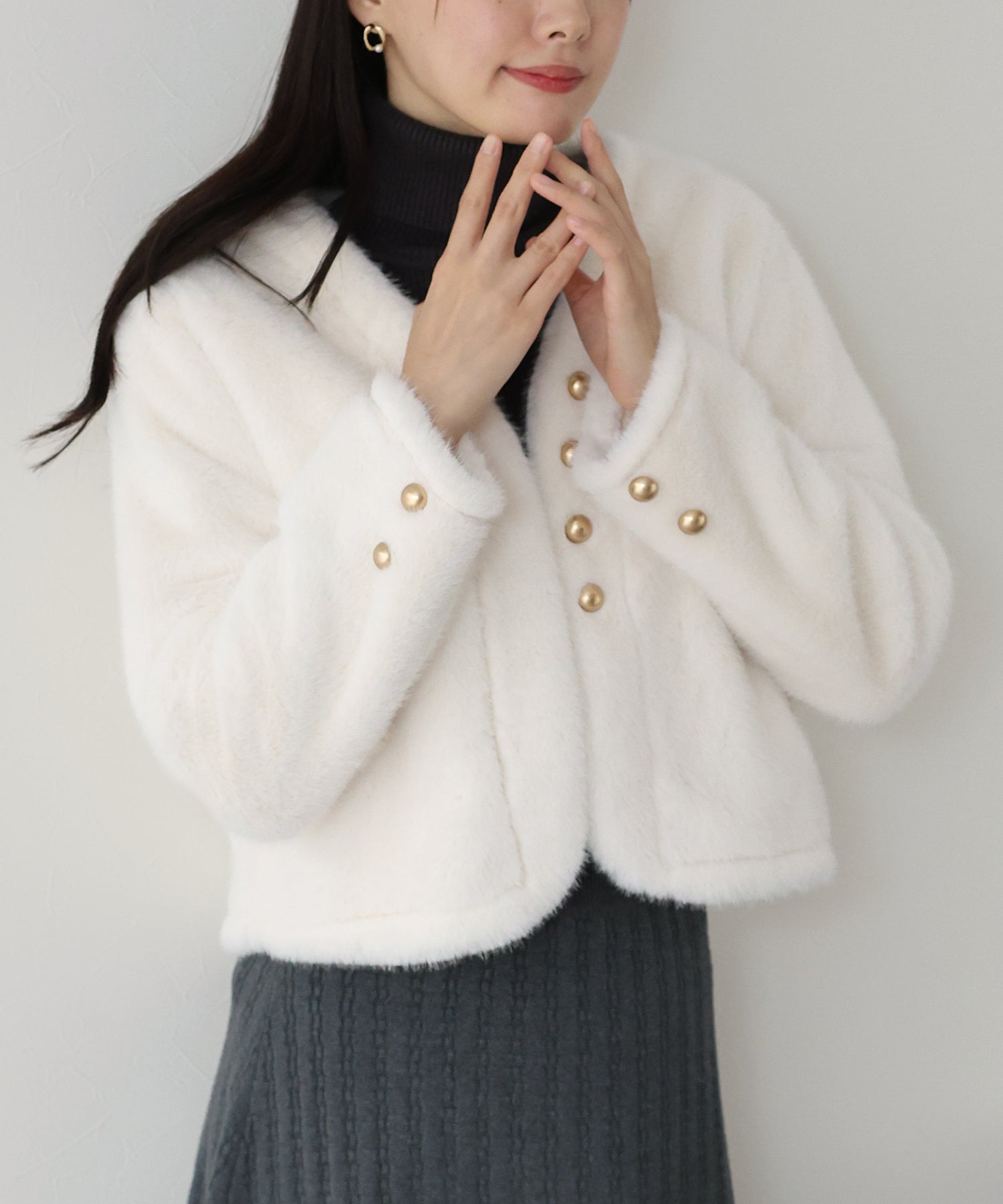 冬のパーティーシーンで活躍する、ふわふわのファーに金ボタンデザインのフェイクファーコート。