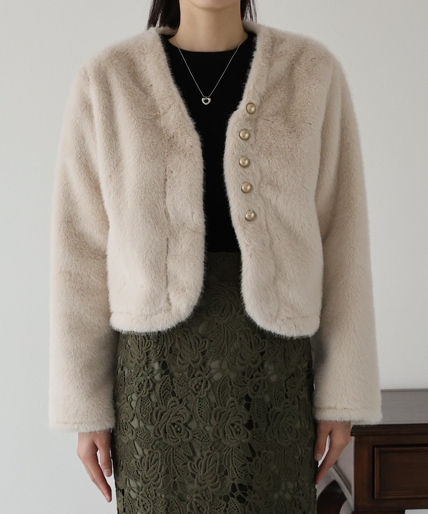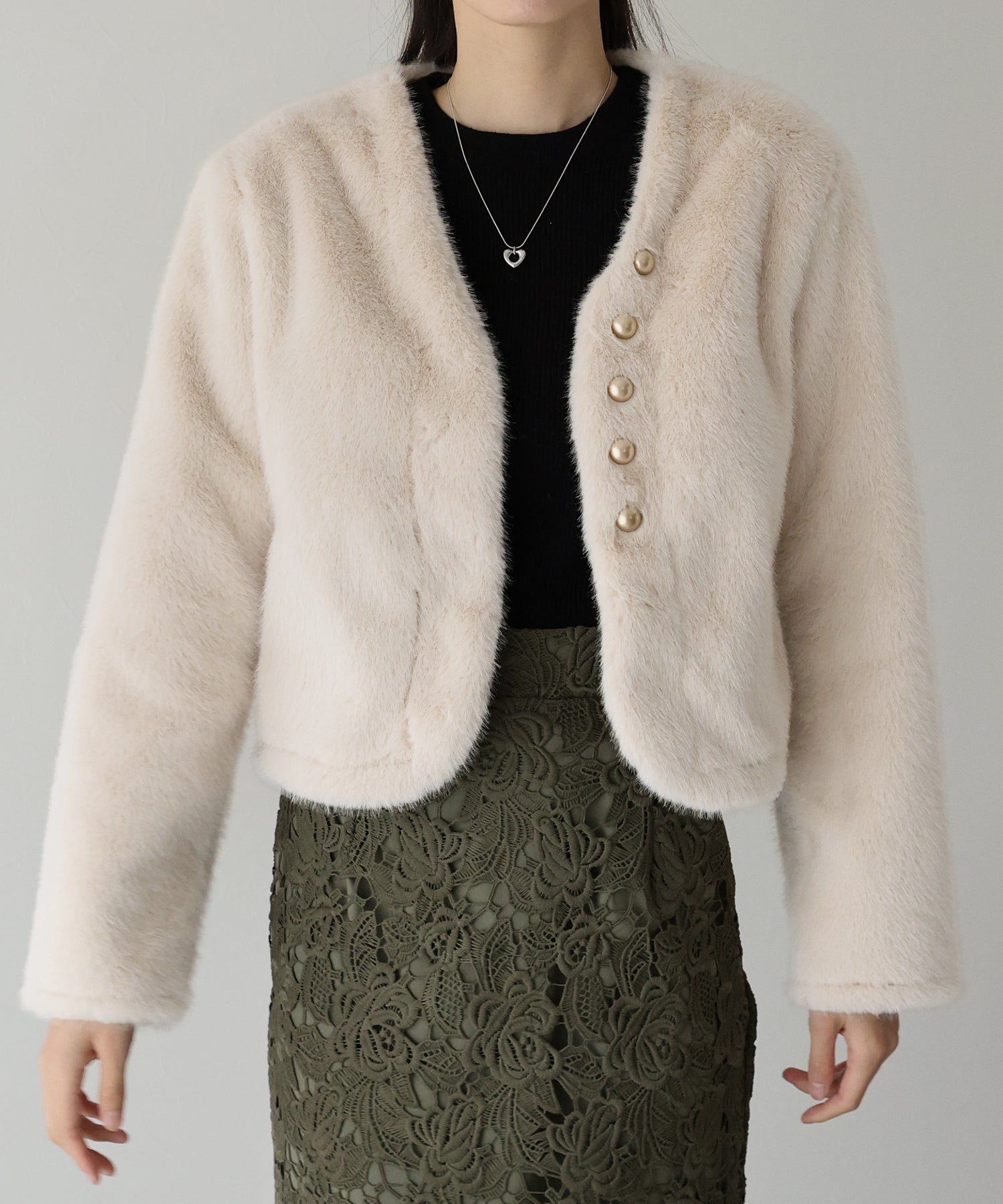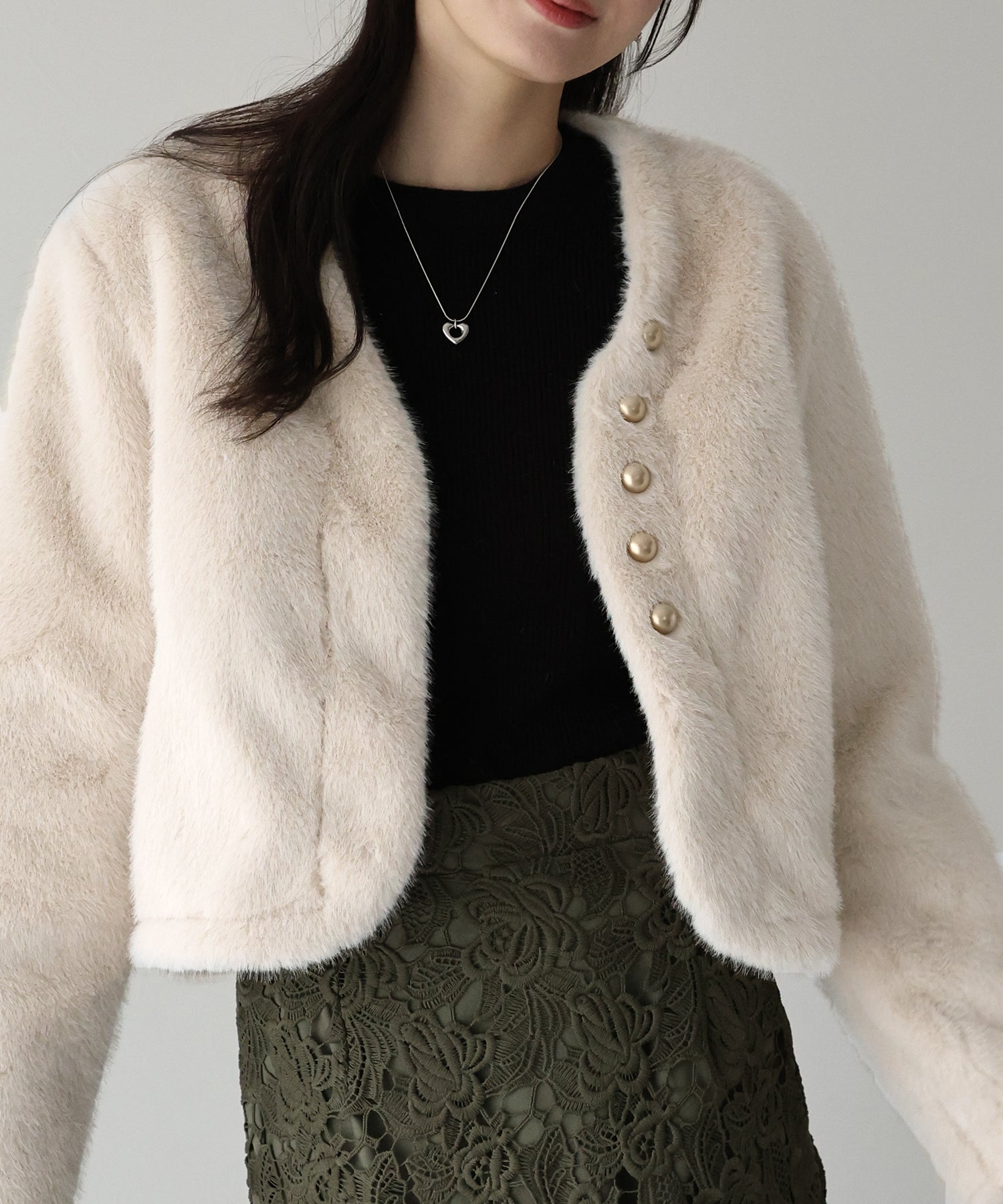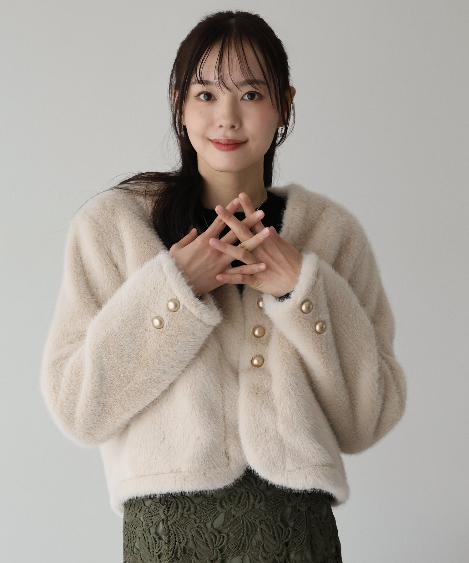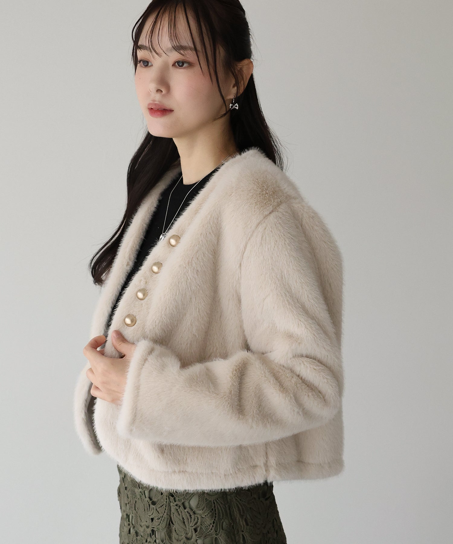 冬のパーティーシーンで活躍する、ふわふわのファーに金ボタンデザインのフェイクファーコート。
