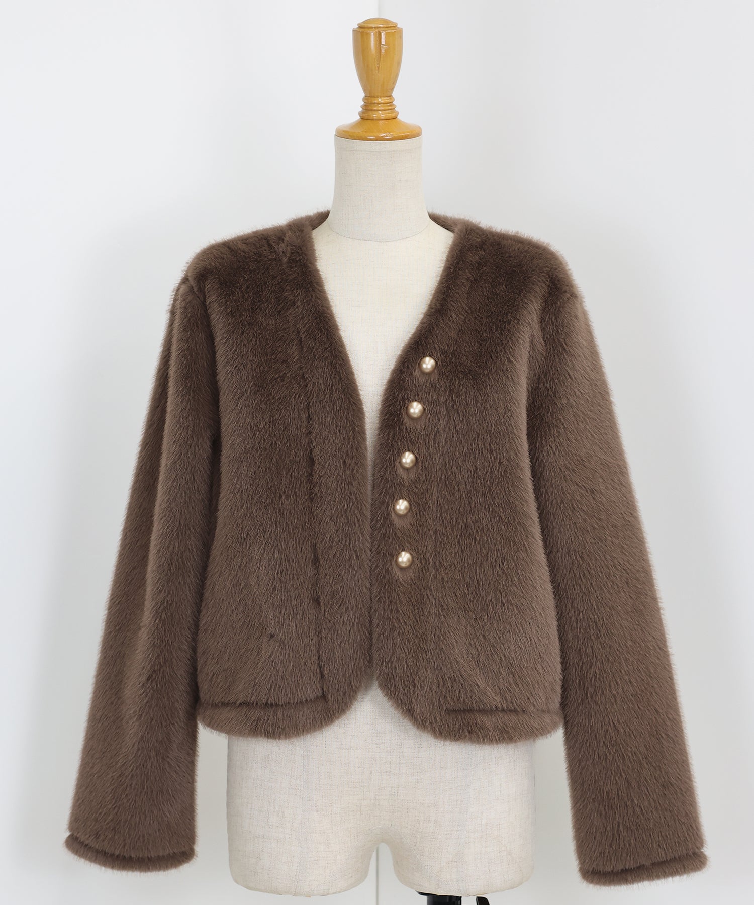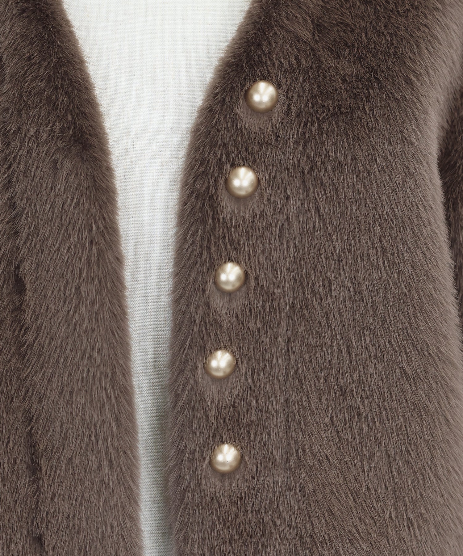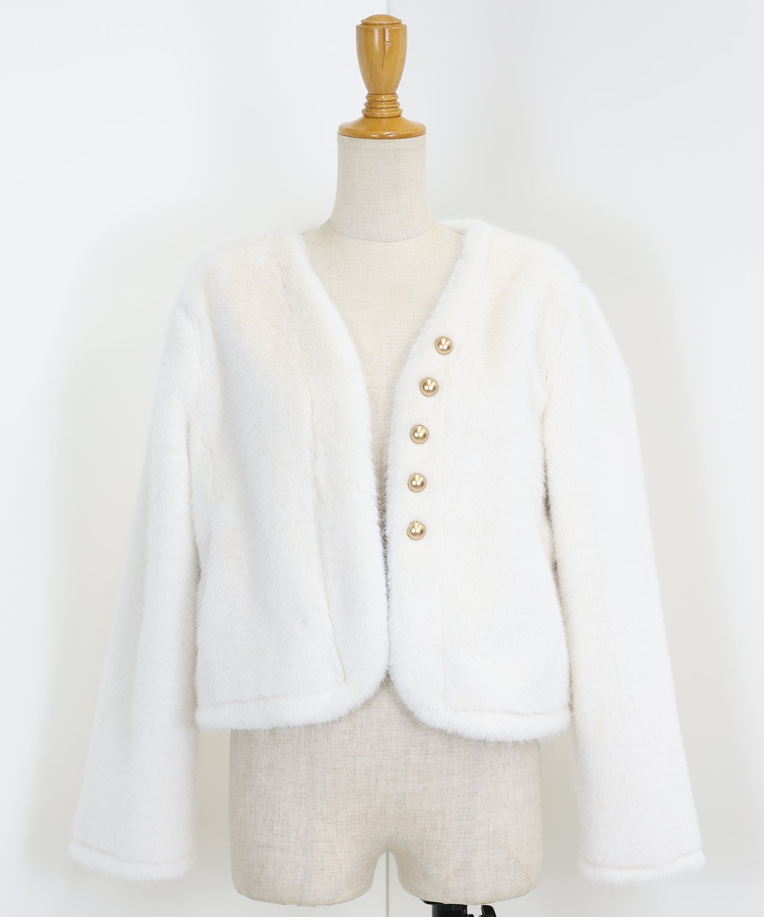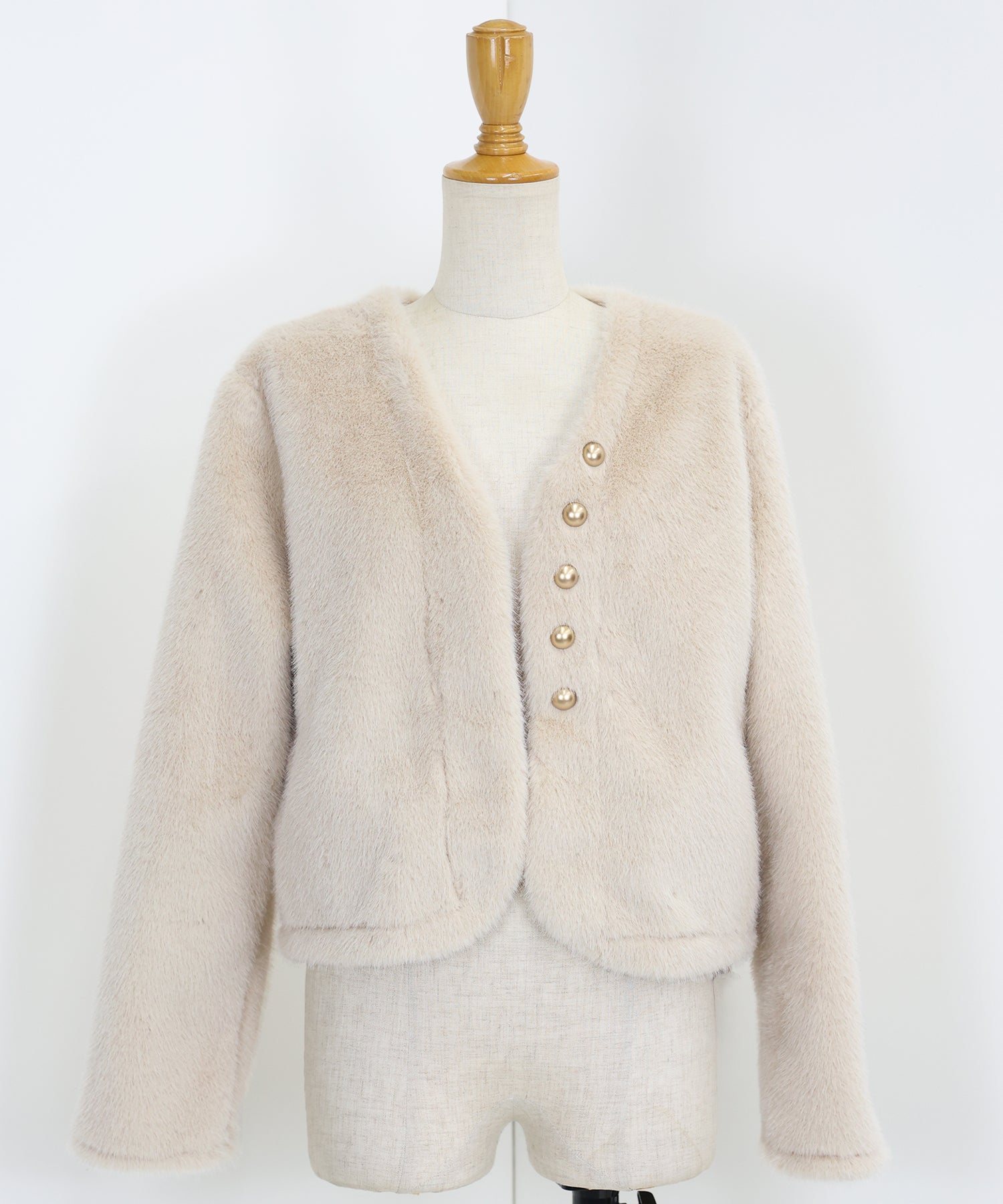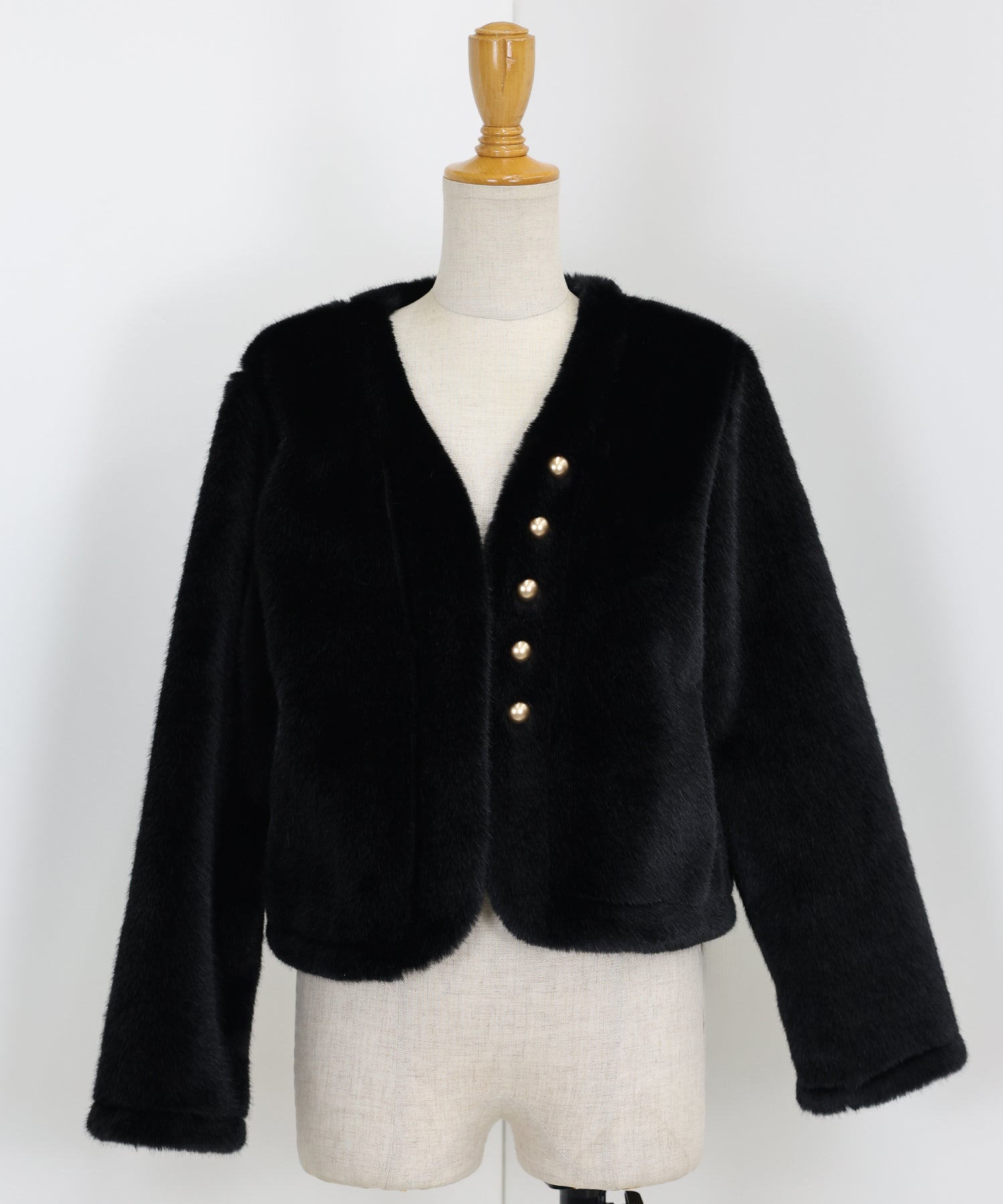 冬のパーティーシーンで活躍する、ふわふわのファーに金ボタンデザインのフェイクファーコート。