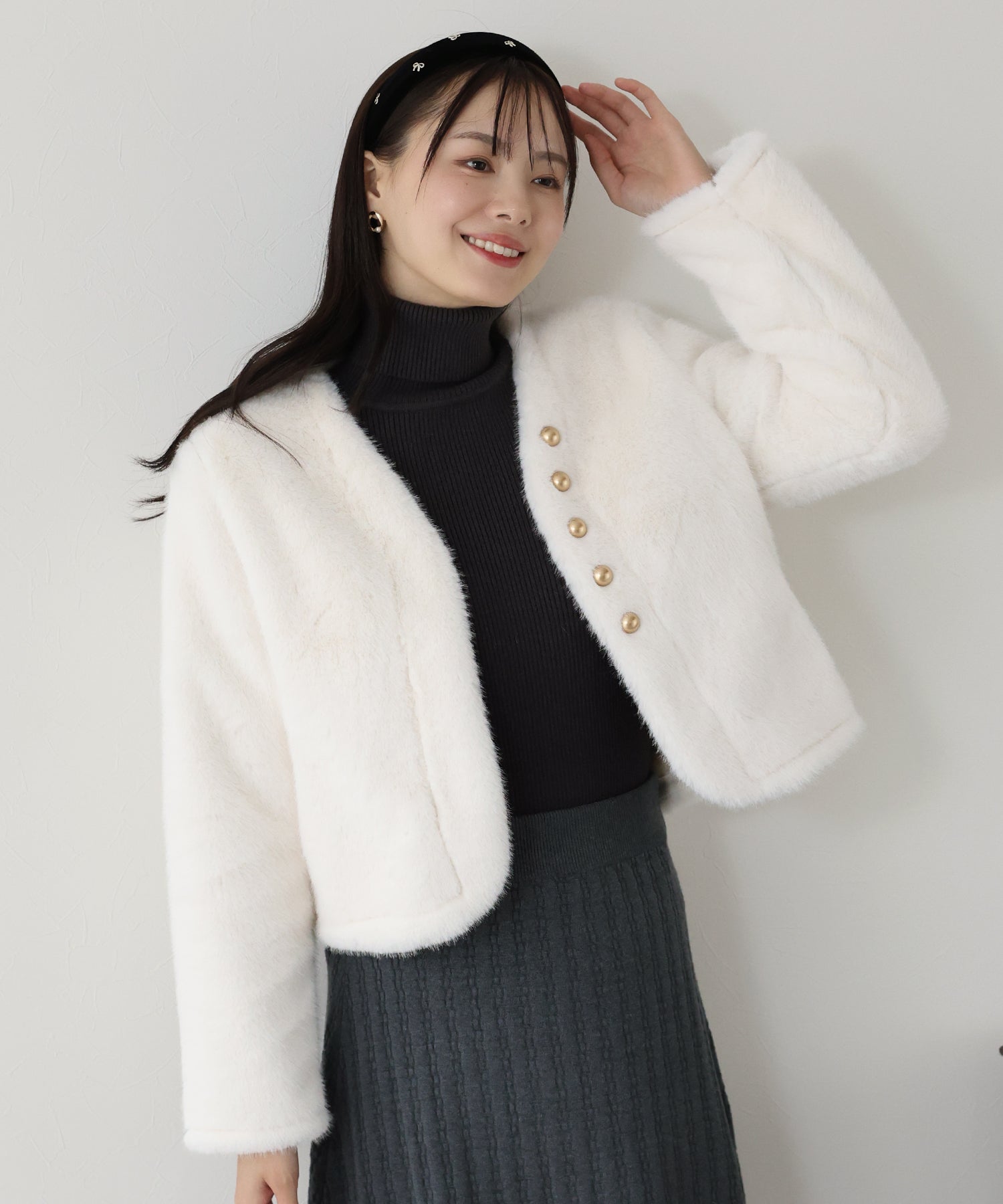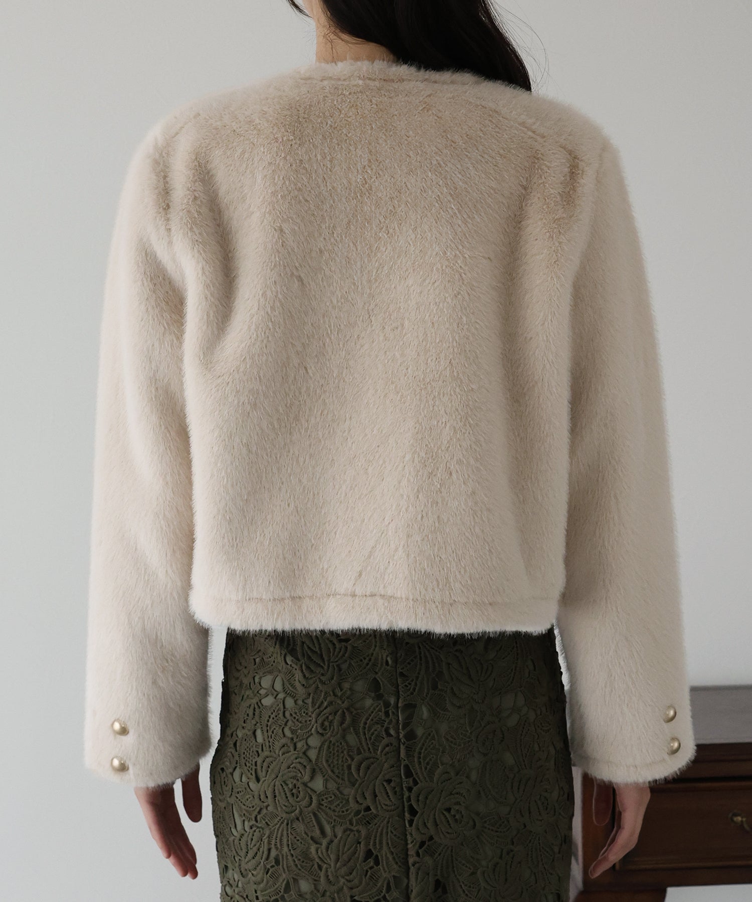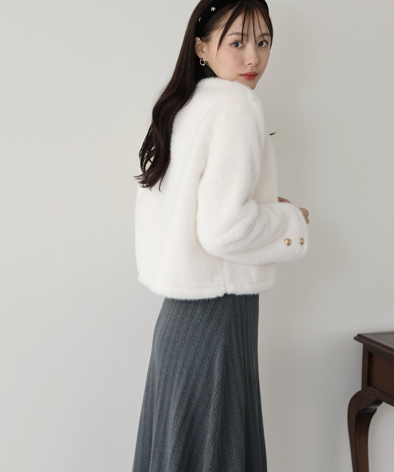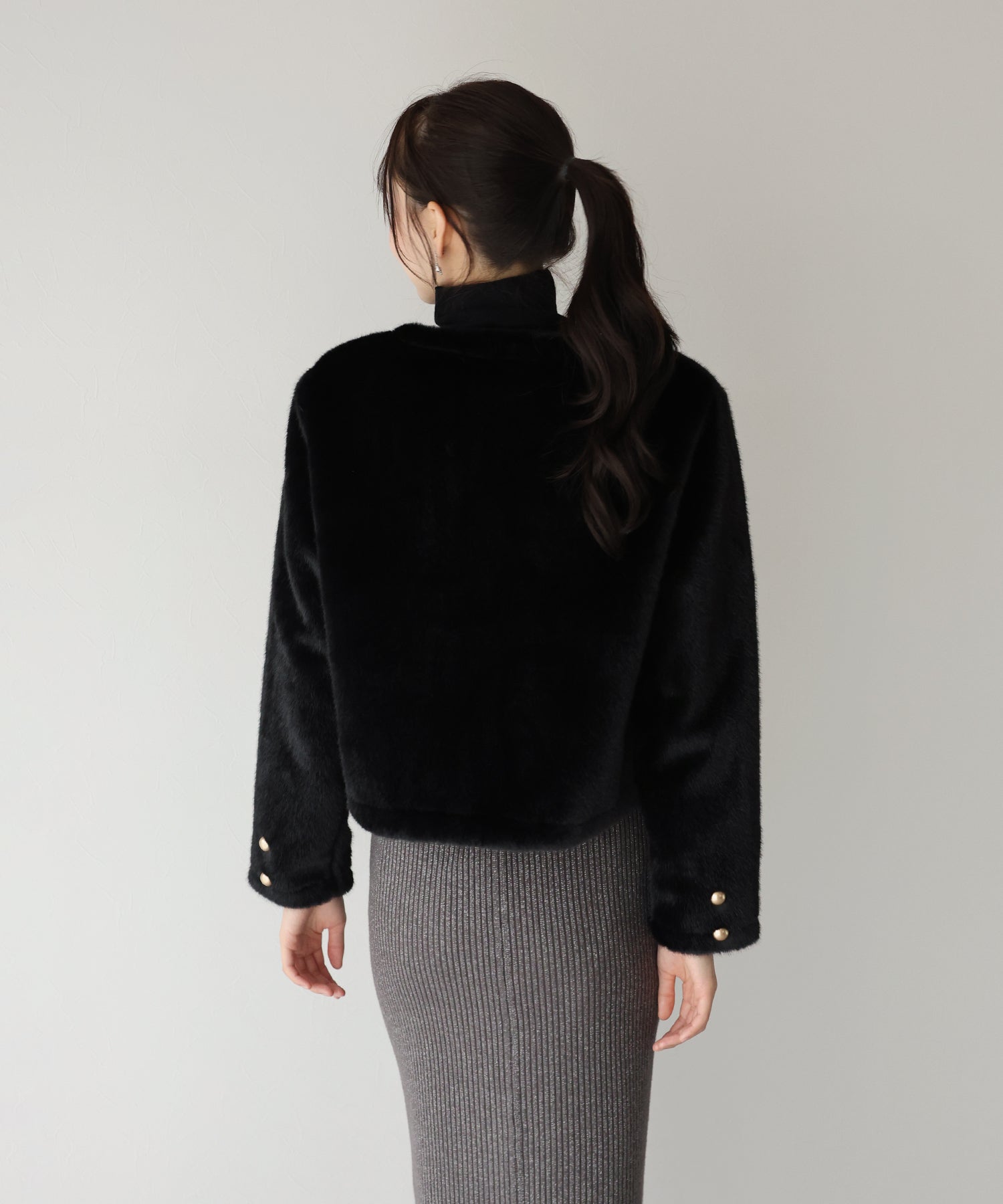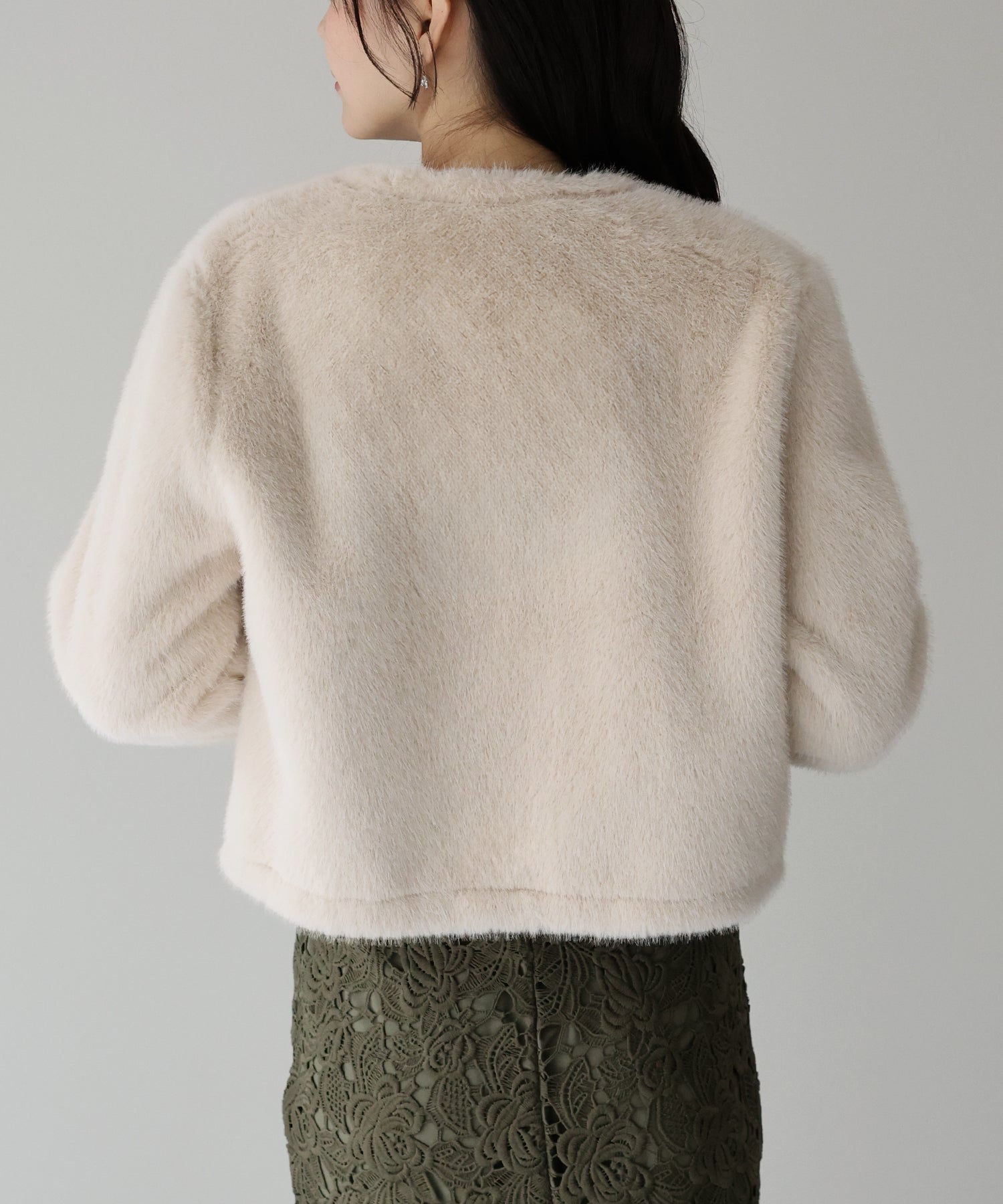 毛足が長すぎないファーと短めの丈感ですっきりとバランスの取りやすいサイズ感に仕上げています。