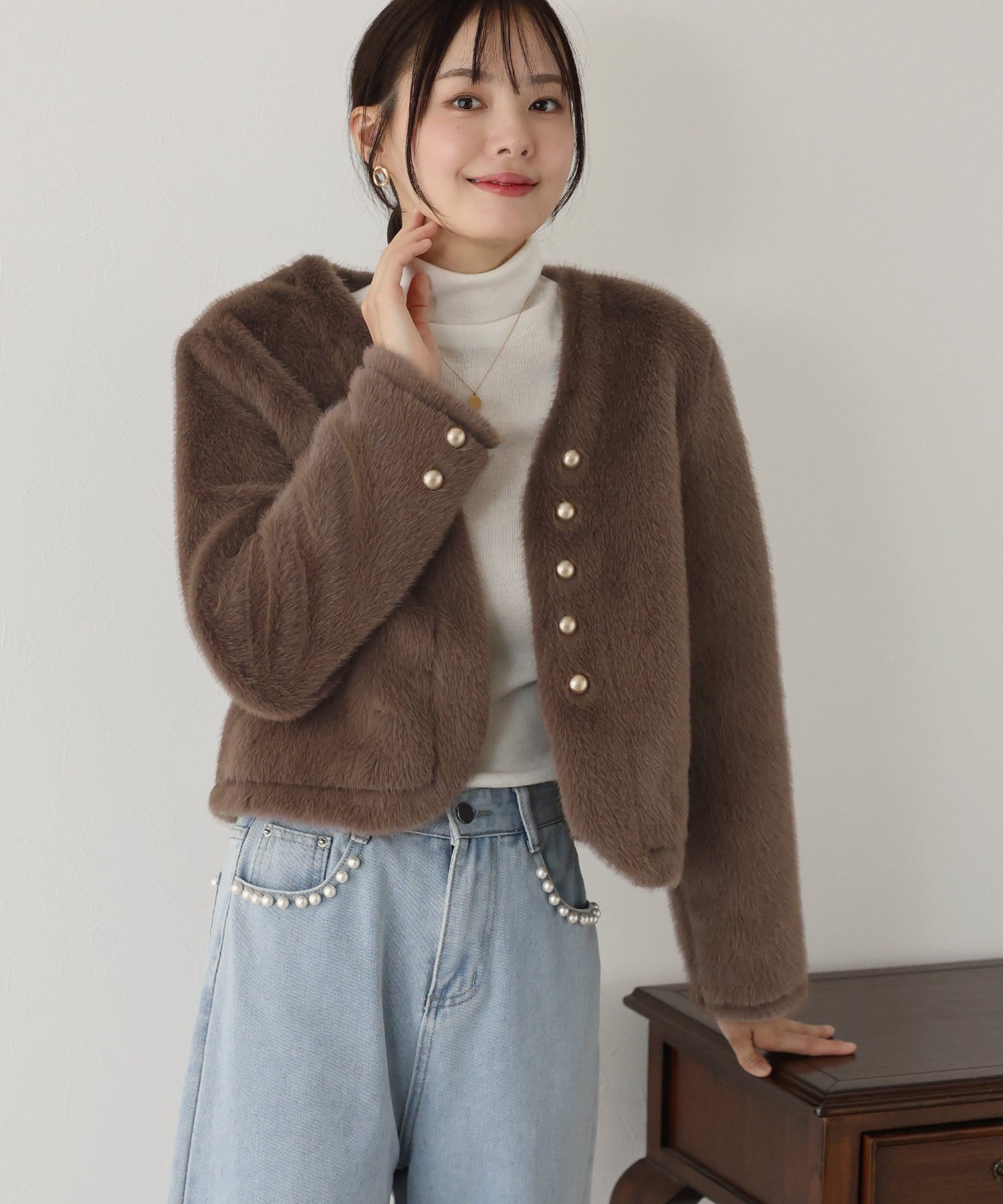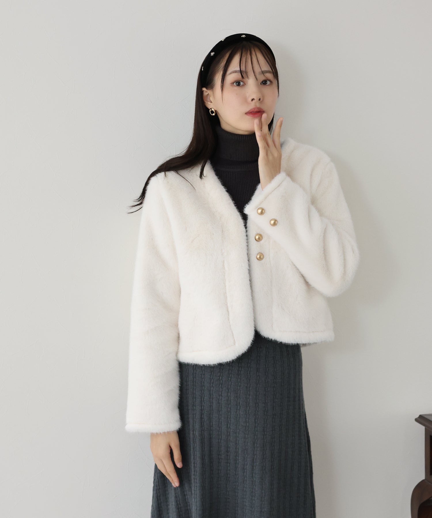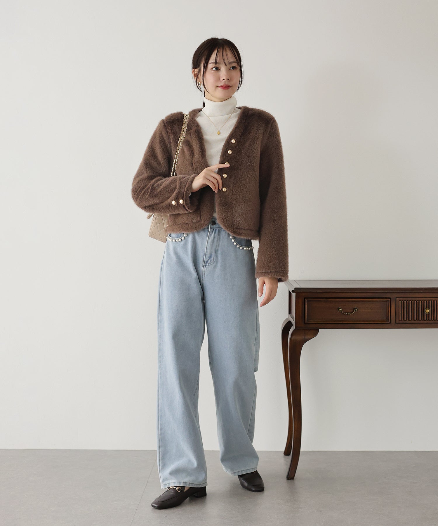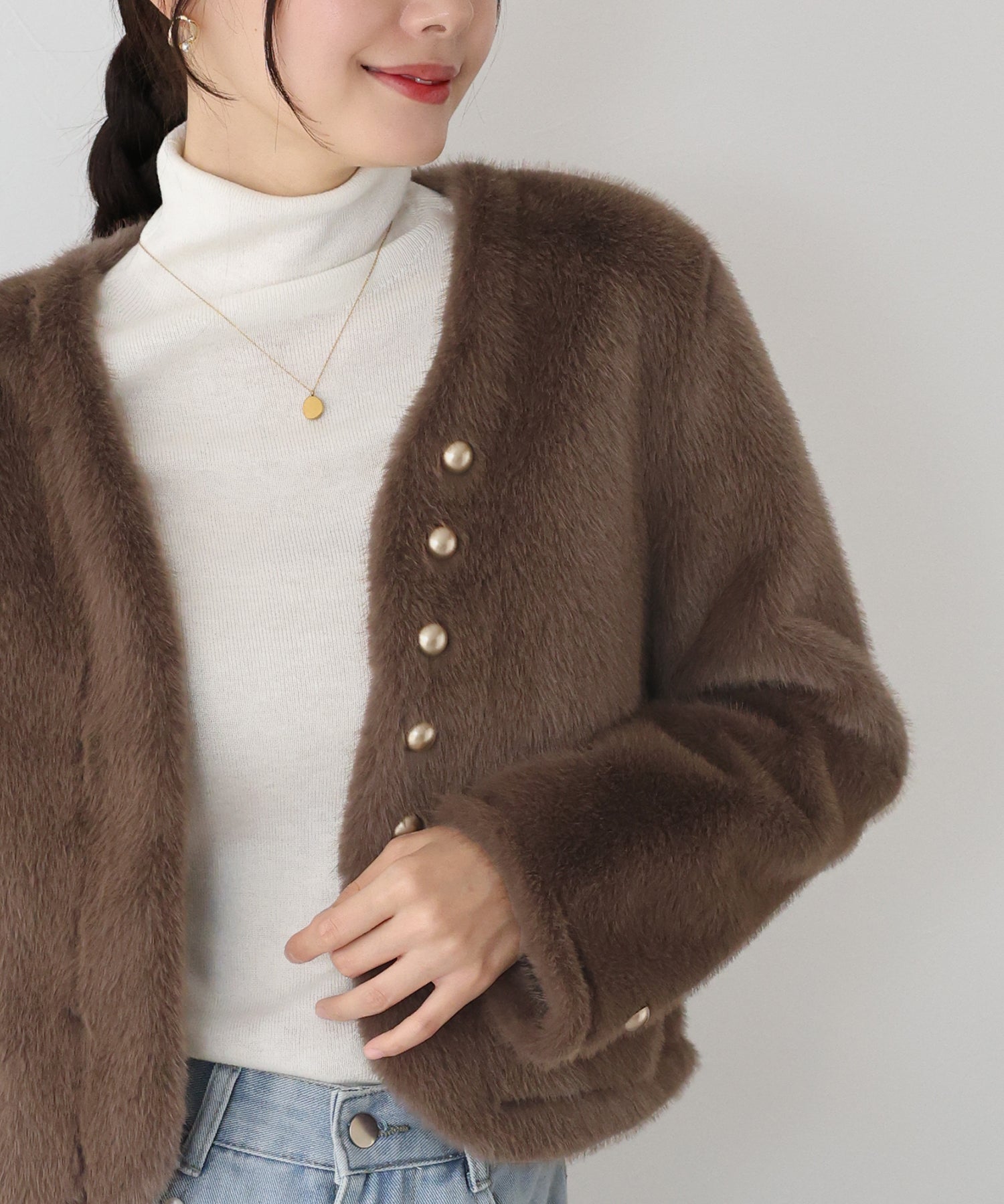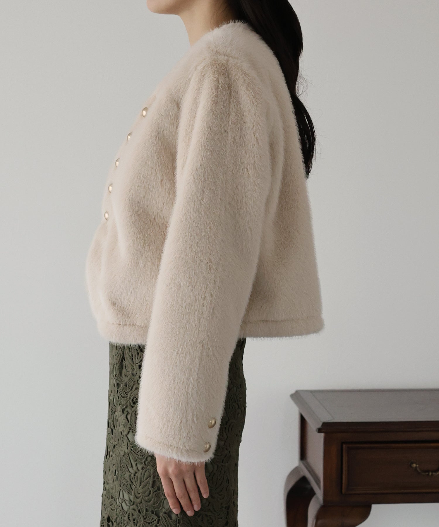毛足が長すぎないファーと短めの丈感ですっきりとバランスの取りやすいサイズ感に仕上げています。