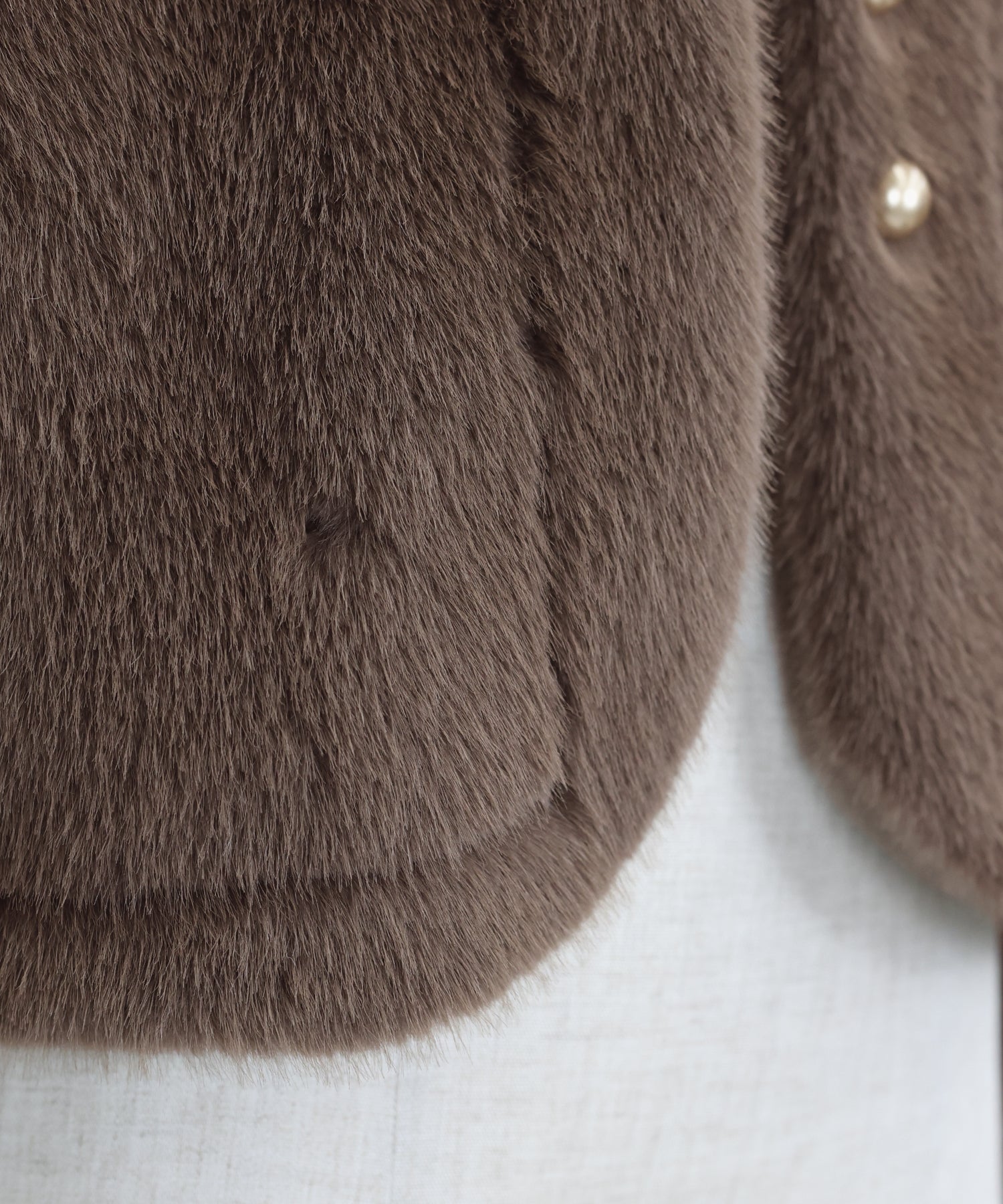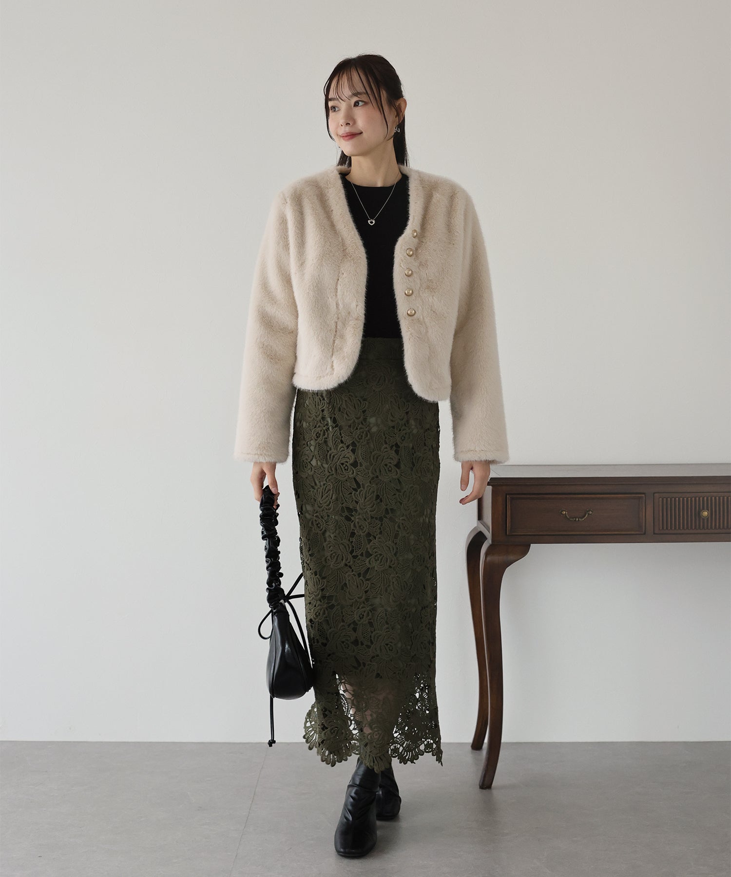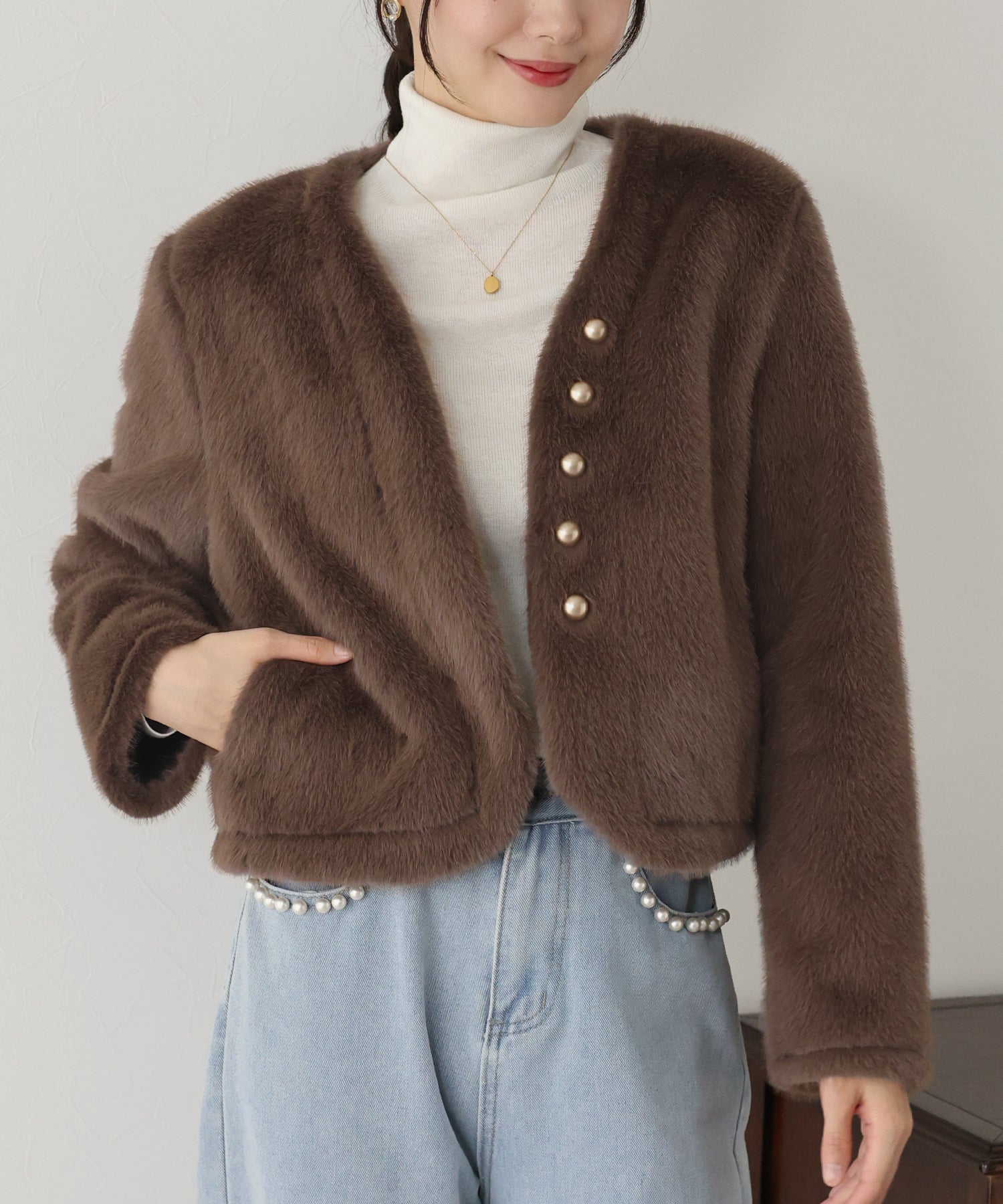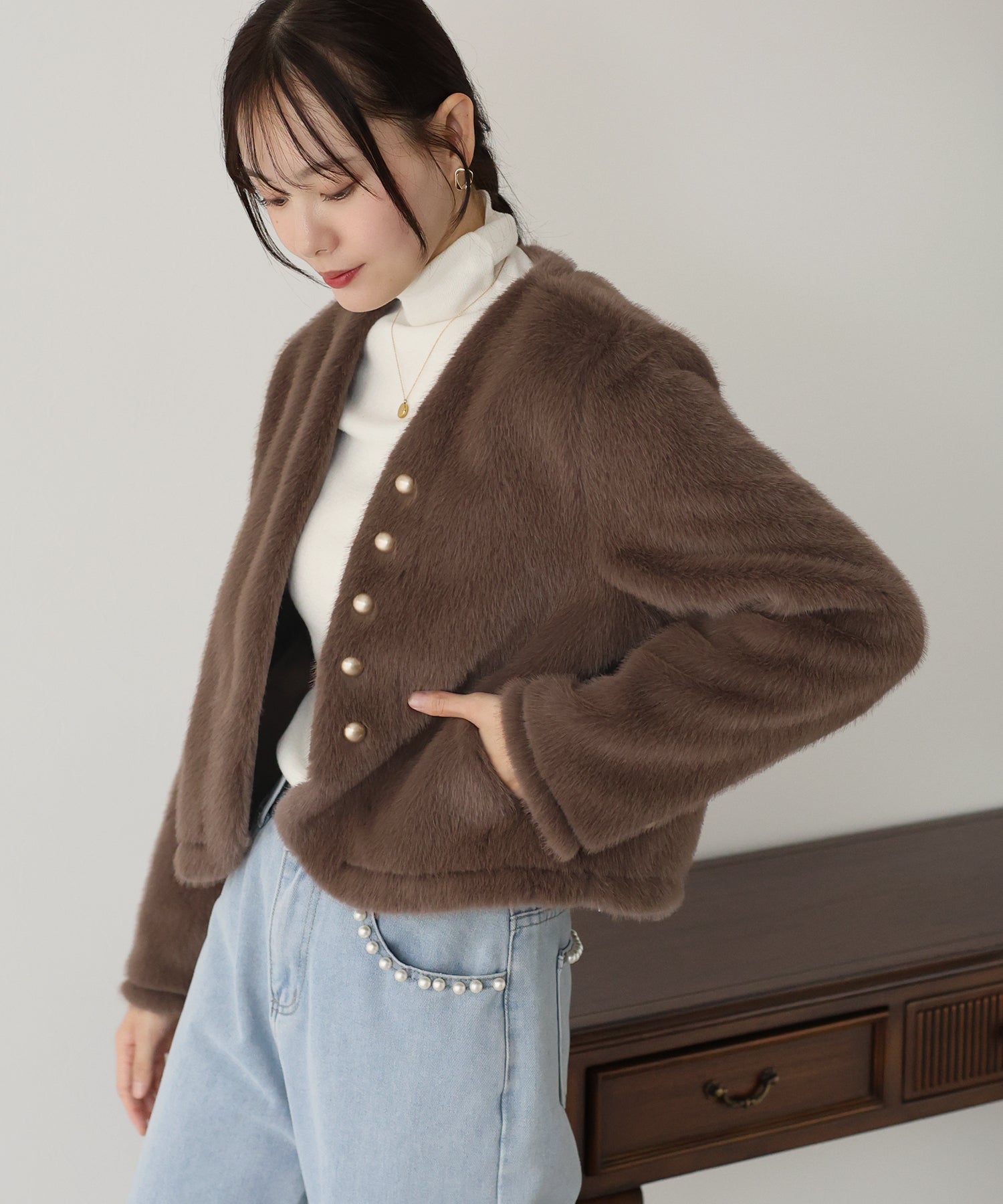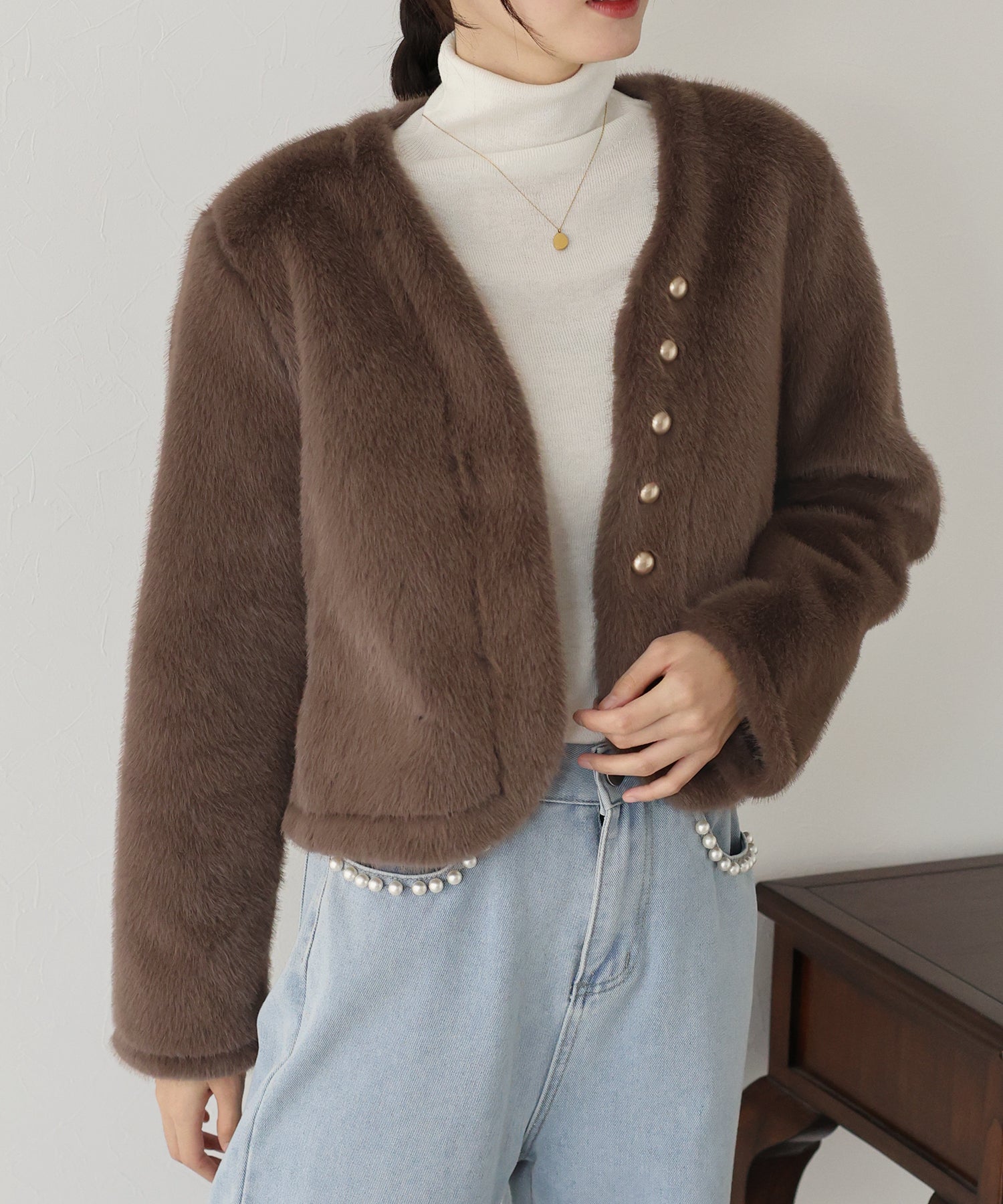 毛足が長すぎないファーと短めの丈感ですっきりとバランスの取りやすいサイズ感に仕上げています。