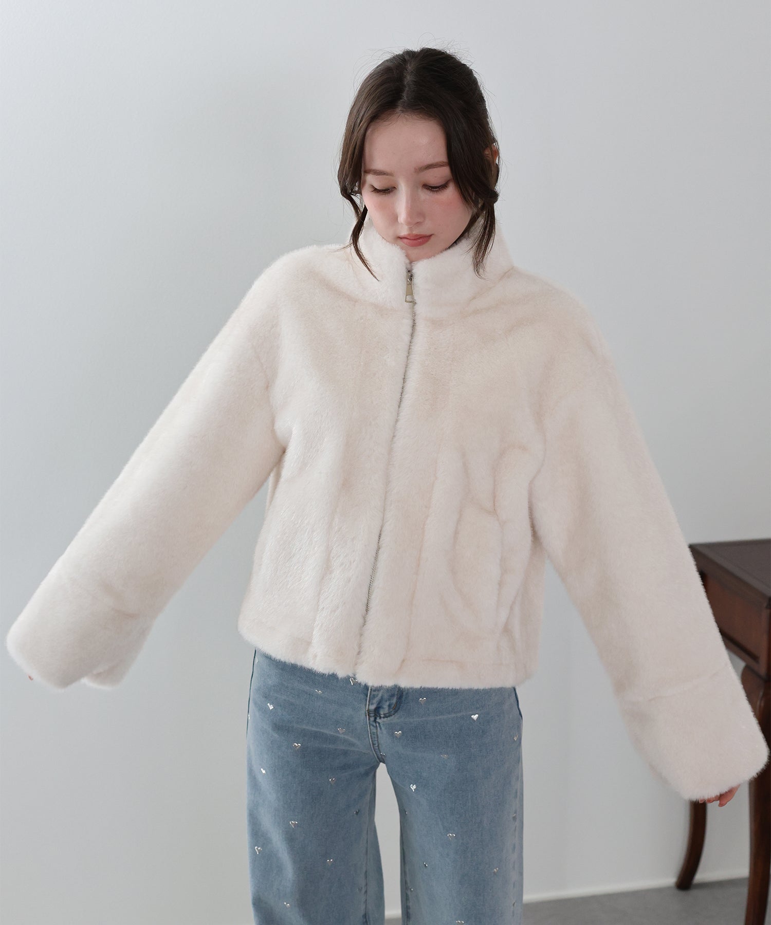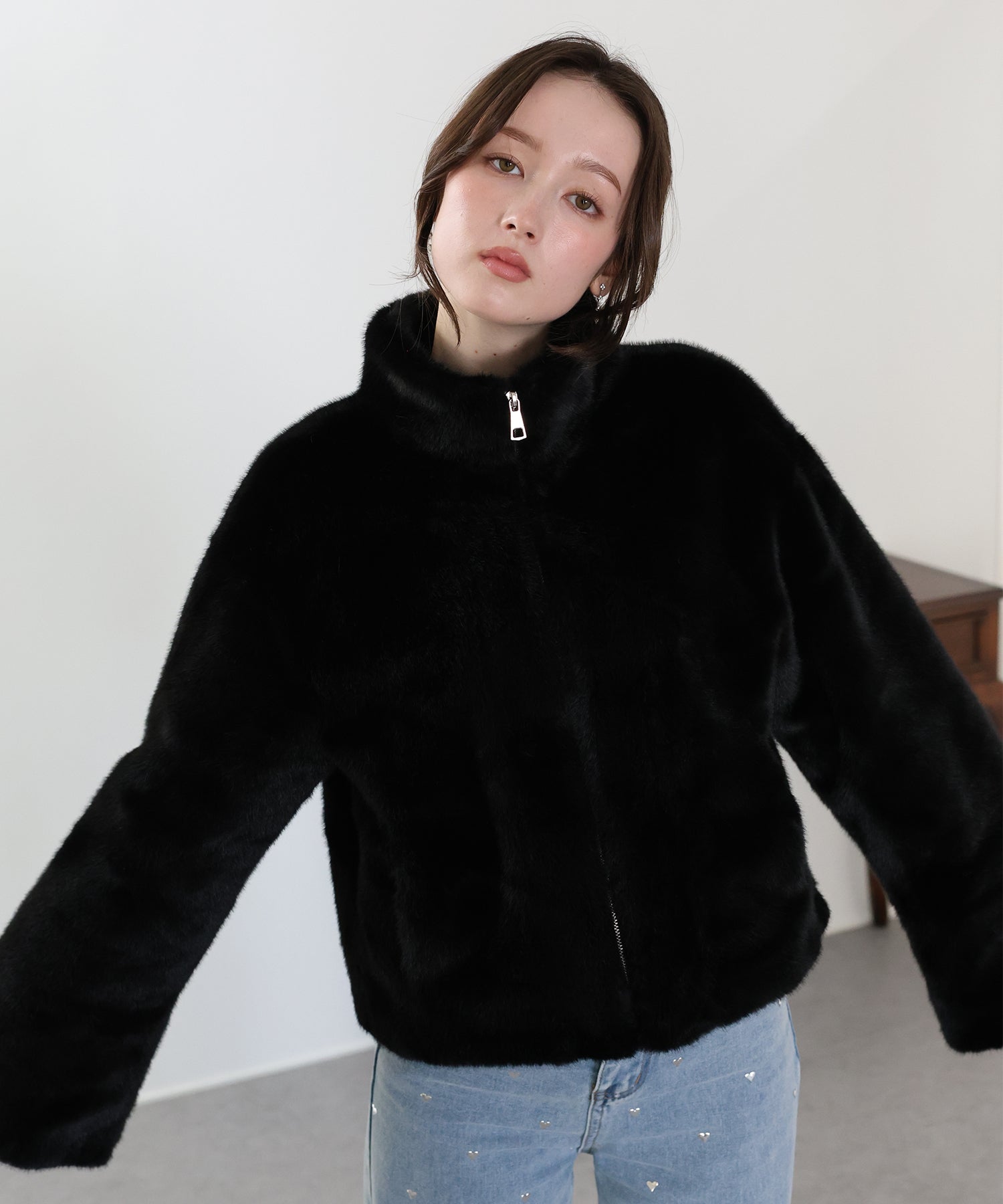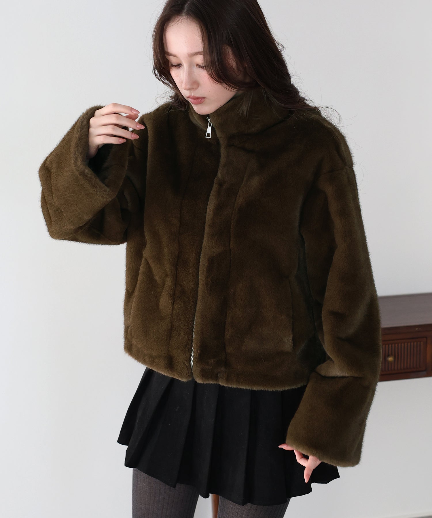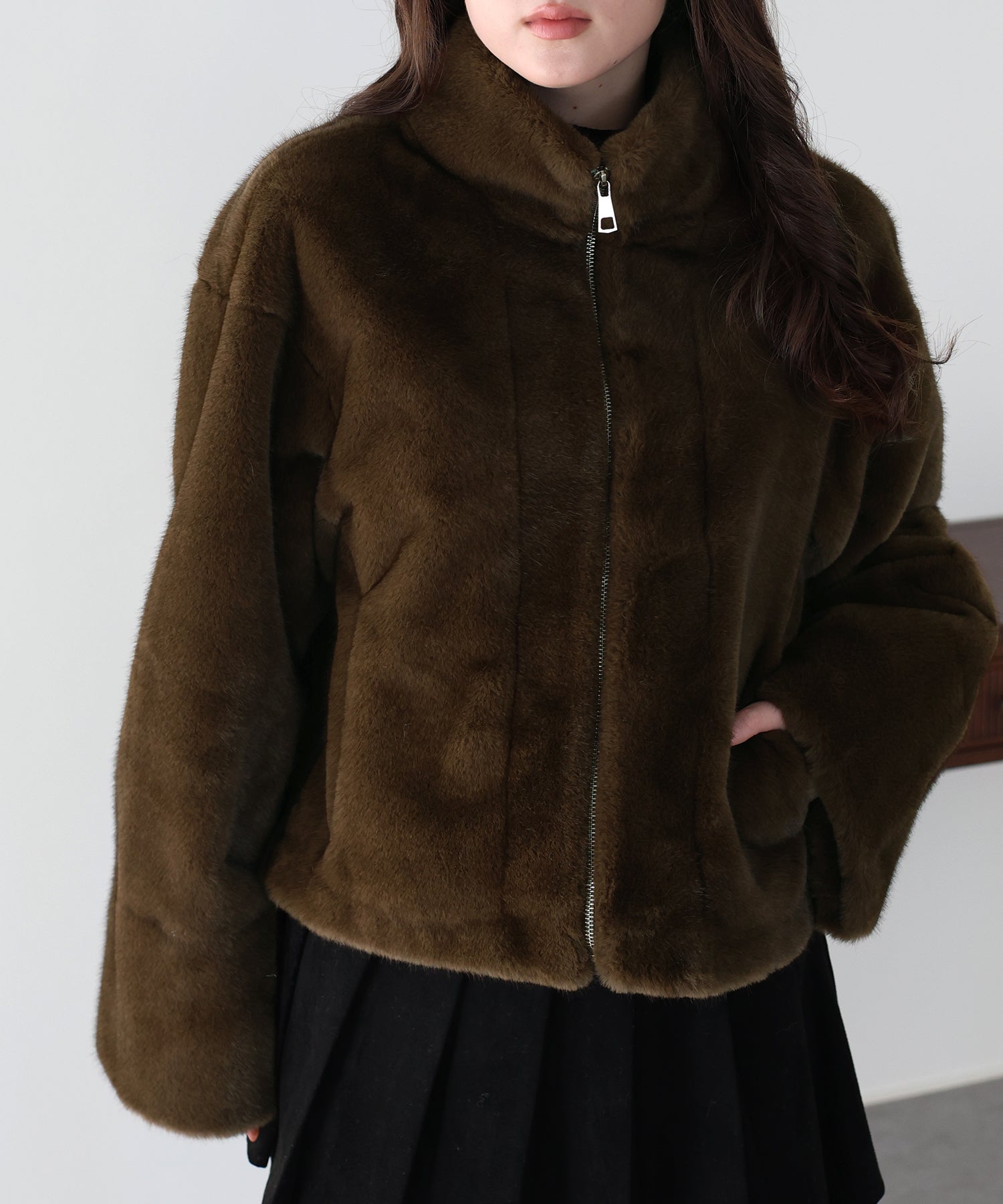 カジュアルガーリーな秋冬に映えるファーコート ?POINT ふわふわのフェイクファーが華やかなファーブルゾン。 上品にもカジュアルにも似合うデザインで幅広い着こなしにマッチします。 フロントはジップアップでカジュアルな印象をプラスし、着脱が容易にできる仕様に。 ハイネックで首元も暖かく、ジップを少し開けて抜け感のある着こなしも◎ シーズンライクなファーが華やかで高見えし、暖かく包んでくれる一着です。