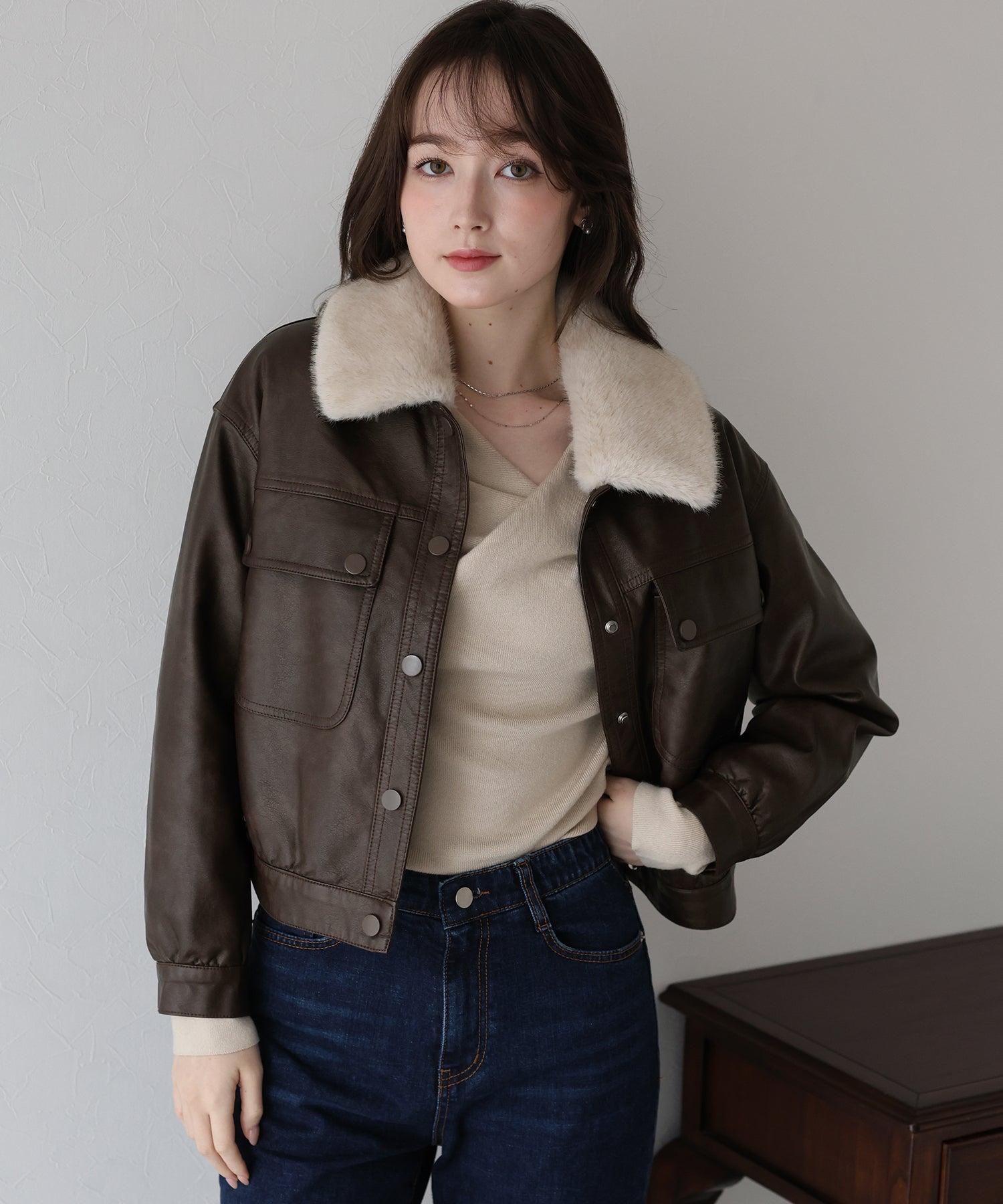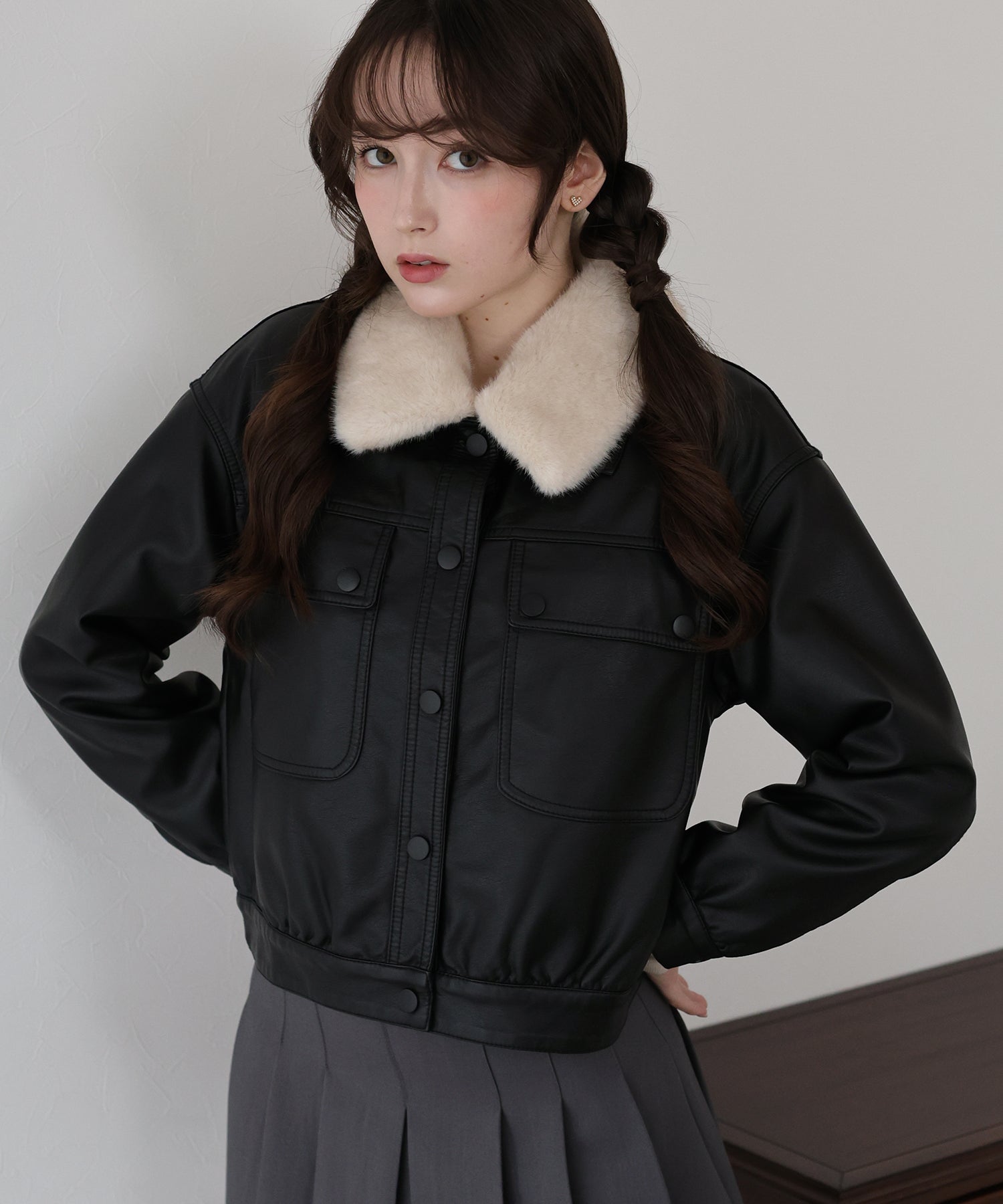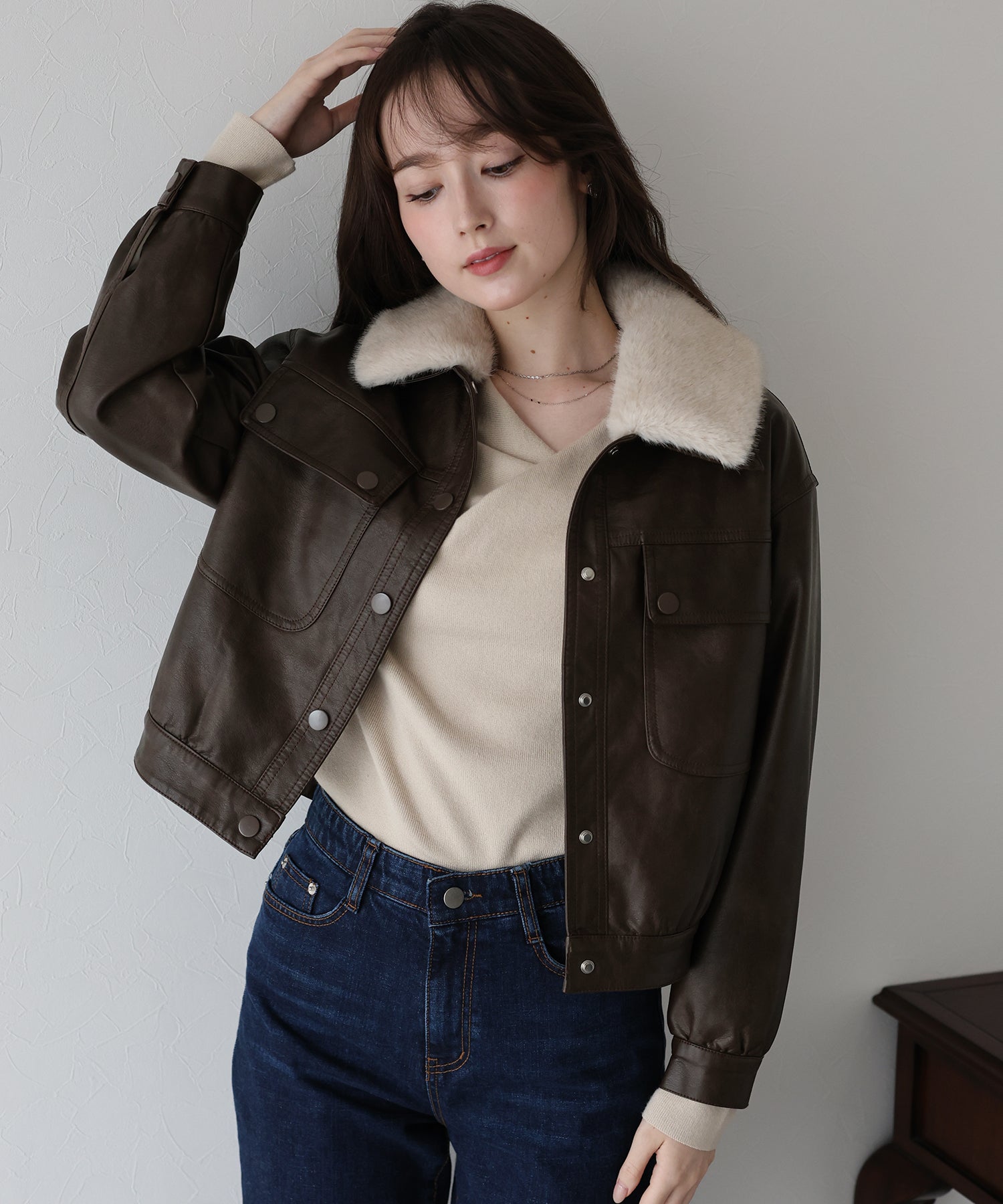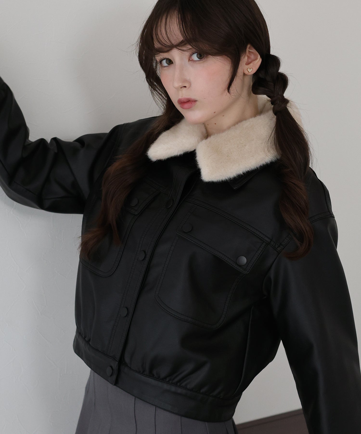 襟元のふわふわファーがシーズンムード高まる2WAYレザージャケット ?POINT 甘めにもカジュアルにも着回せる、ショート丈レザーブルゾン。 ファー襟がフェミニンなポイントをプラスします。 ティペットは取り外し可能なので気分やコーデに合わせられる2WAY仕様! 裏地はファー、袖裏は中綿キルティングになっているので風を通しにくく保温性もあり コンパクトな見た目よりも暖かく着用できます◎ 一枚羽織るだけで暖かく、寒い季節に重宝するアウターです。