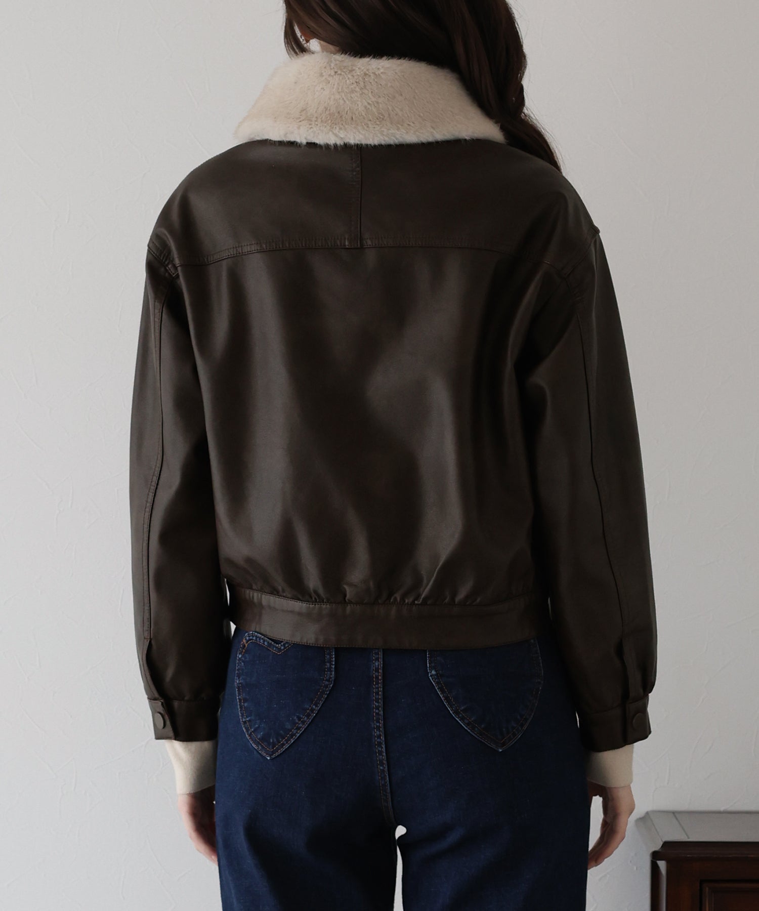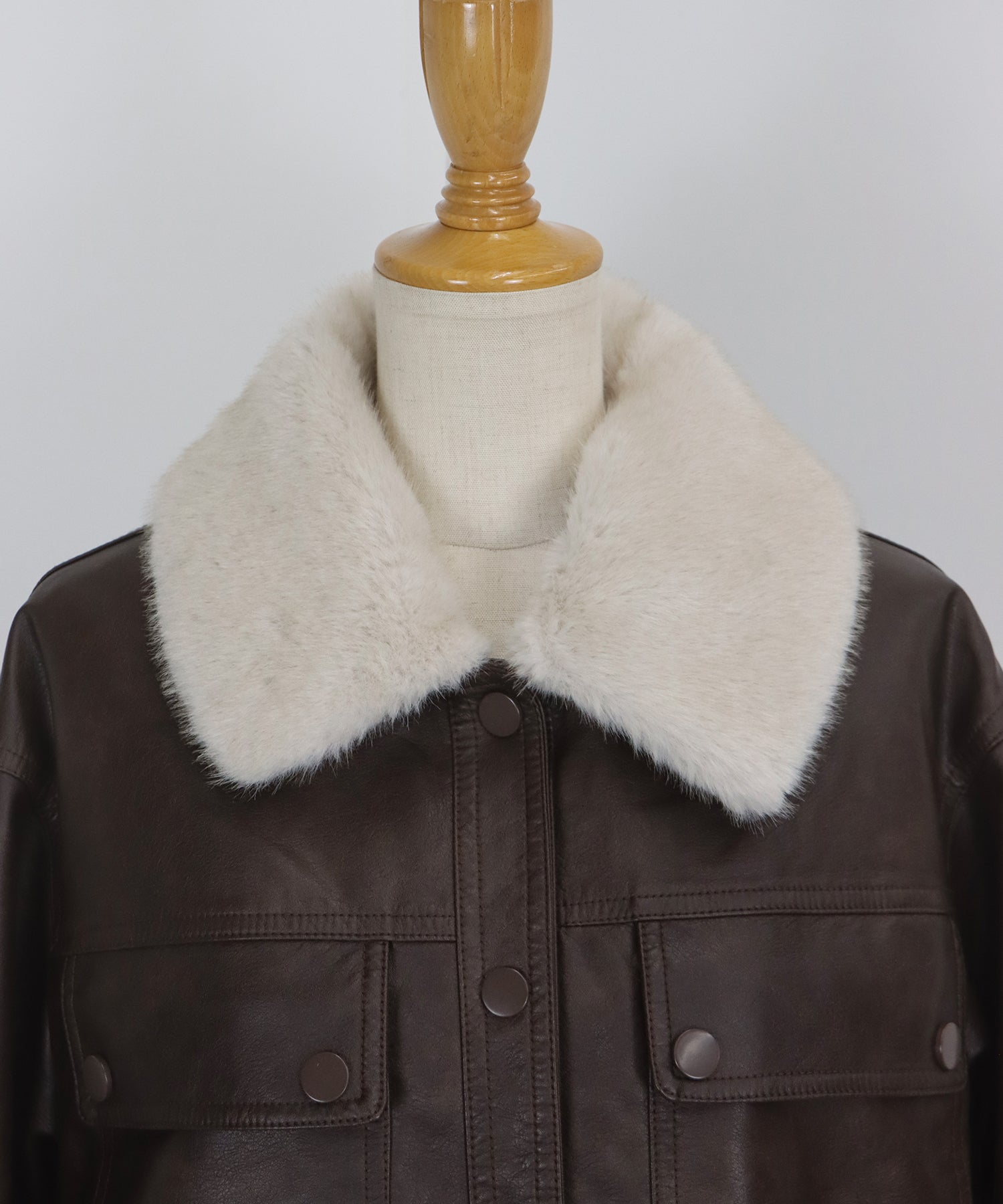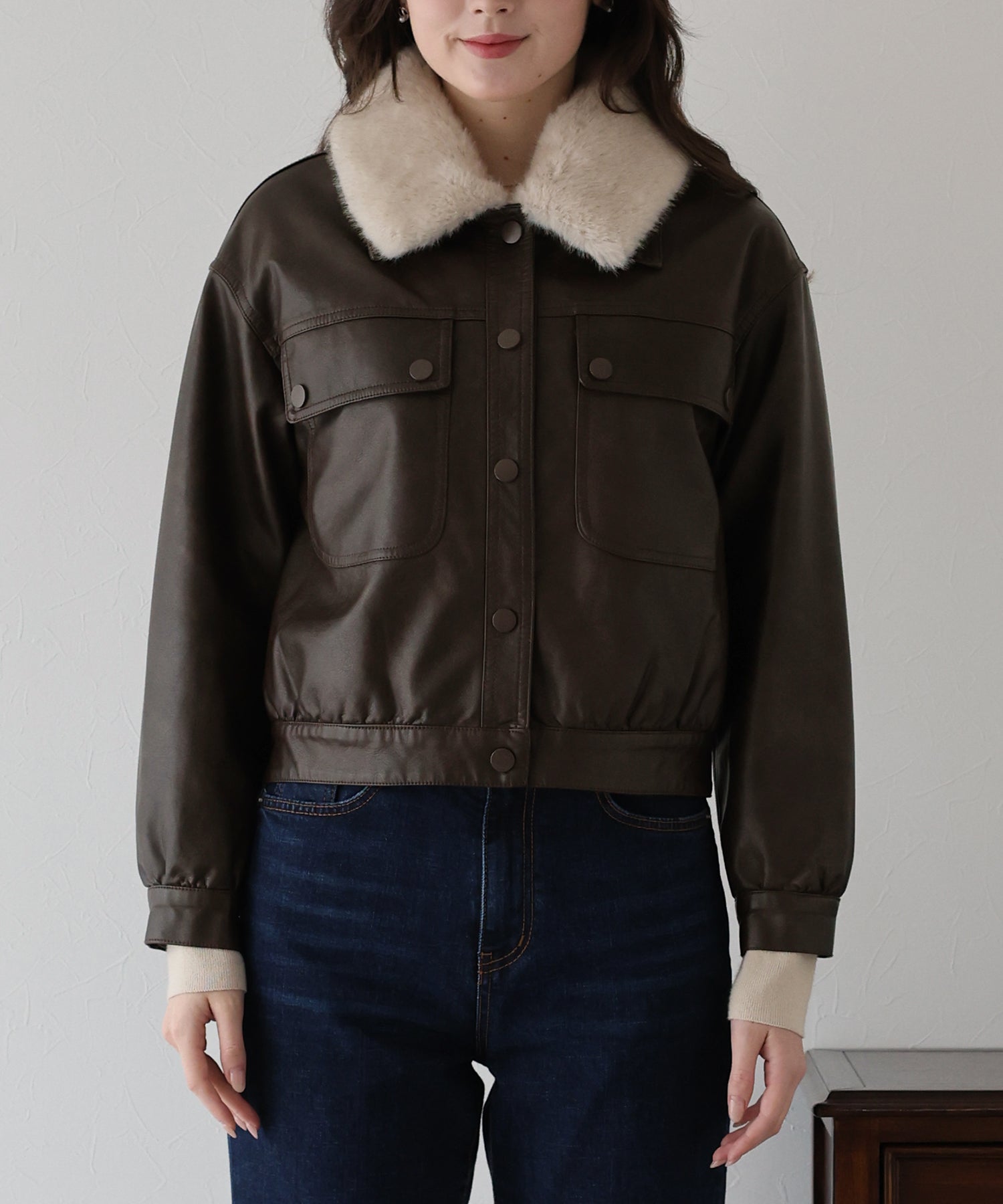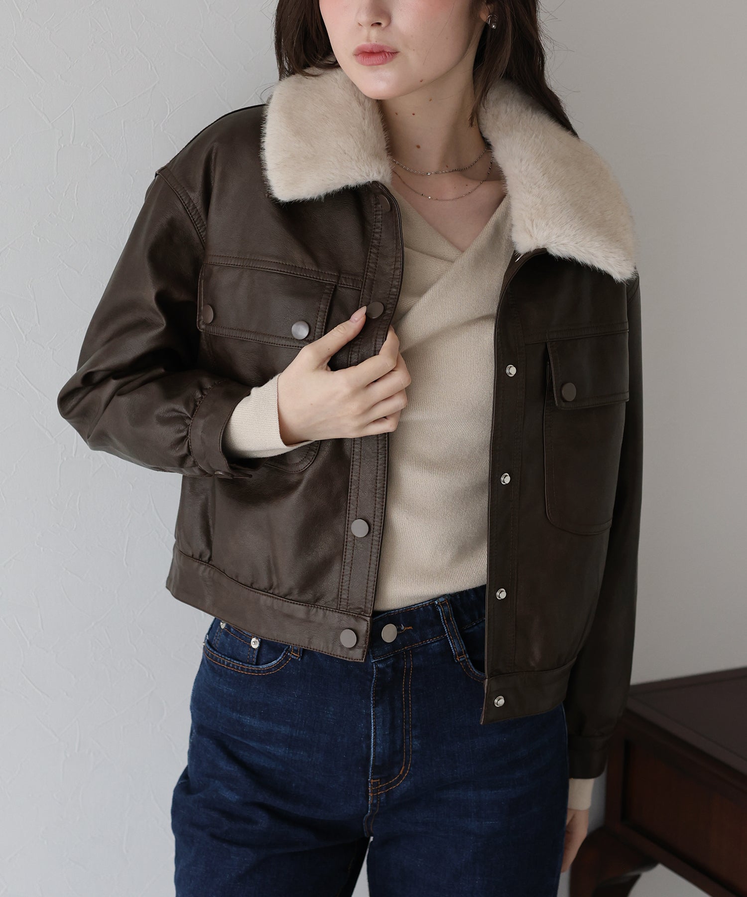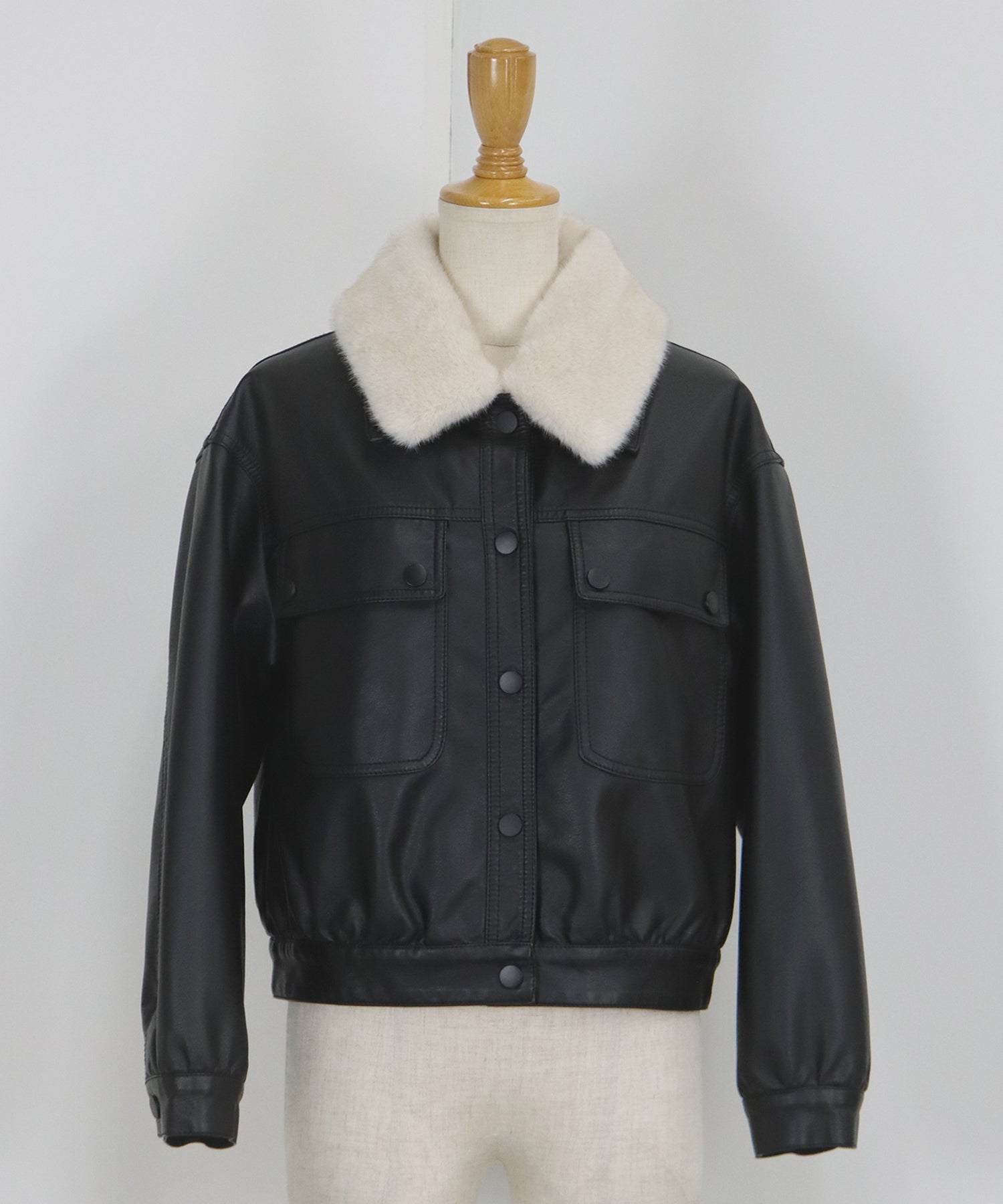 襟元のふわふわファーがシーズンムード高まる2WAYレザージャケット ?POINT 甘めにもカジュアルにも着回せる、ショート丈レザーブルゾン。 ファー襟がフェミニンなポイントをプラスします。 ティペットは取り外し可能なので気分やコーデに合わせられる2WAY仕様! 裏地はファー、袖裏は中綿キルティングになっているので風を通しにくく保温性もあり コンパクトな見た目よりも暖かく着用できます◎ 一枚羽織るだけで暖かく、寒い季節に重宝するアウターです。